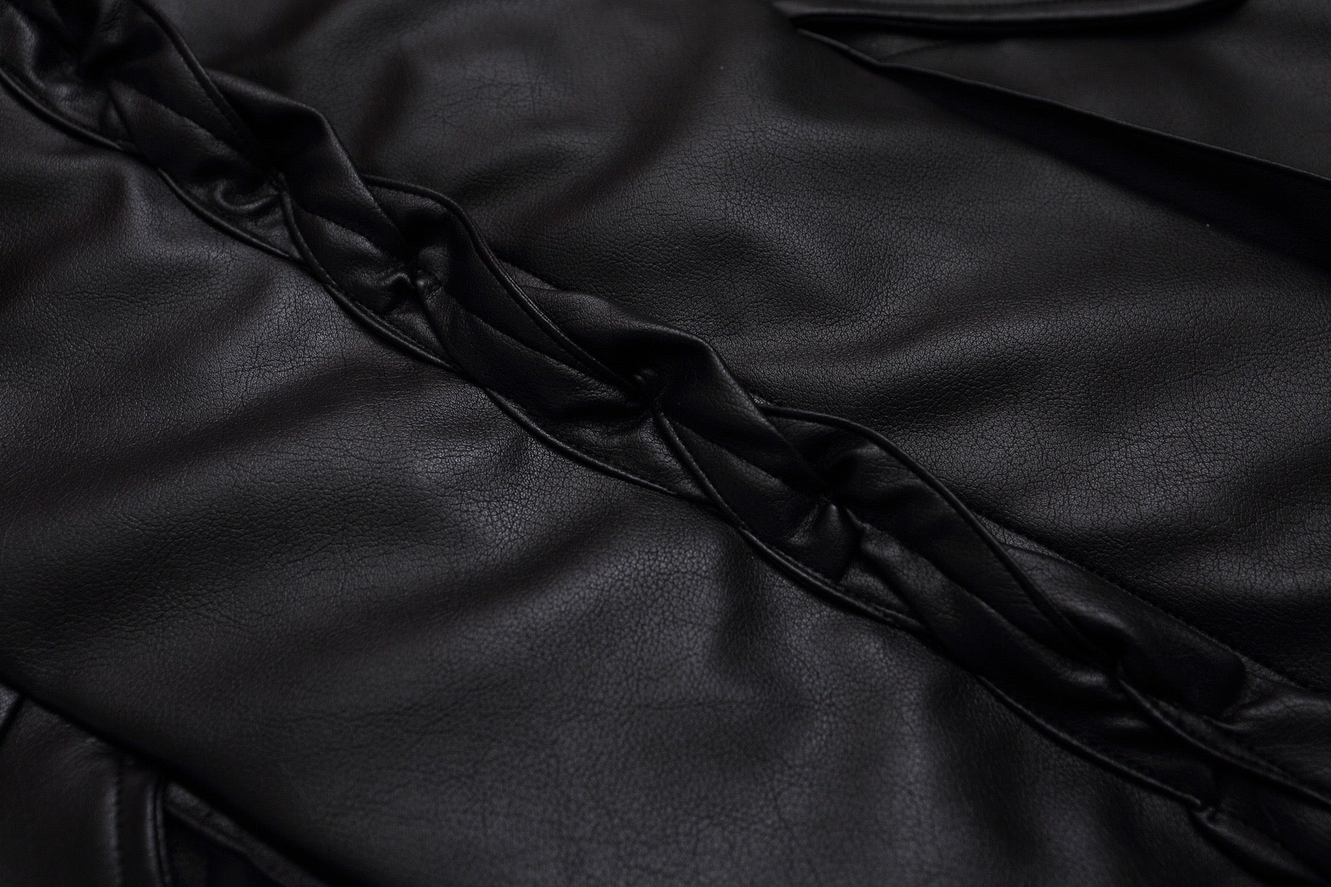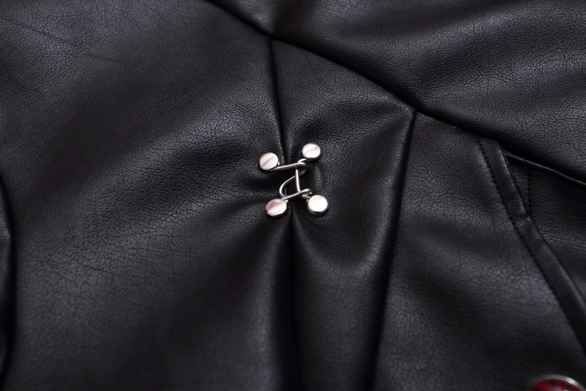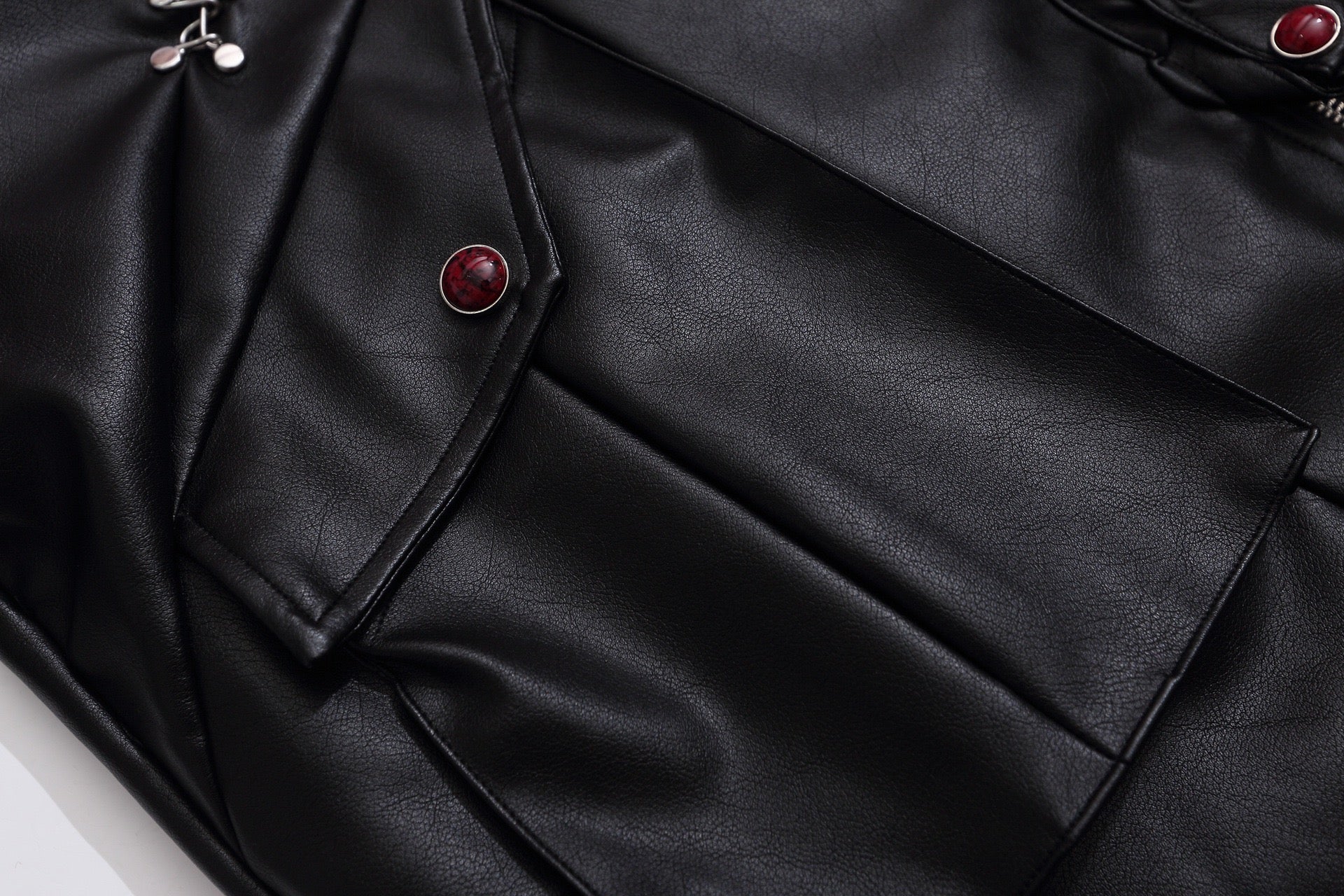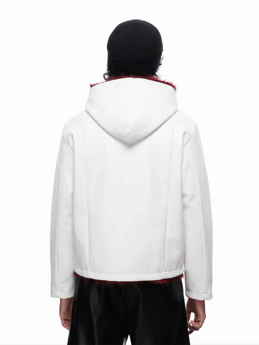 The Omirad Contrast Fur PU Jacket features a smooth faux-leather shell paired with a deep red faux-fur hood and hem for a bold winter look. Structured paneling, metal cross rivets, and oversized utility pockets add a sharp streetwear edge while keeping the fit warm and functional.