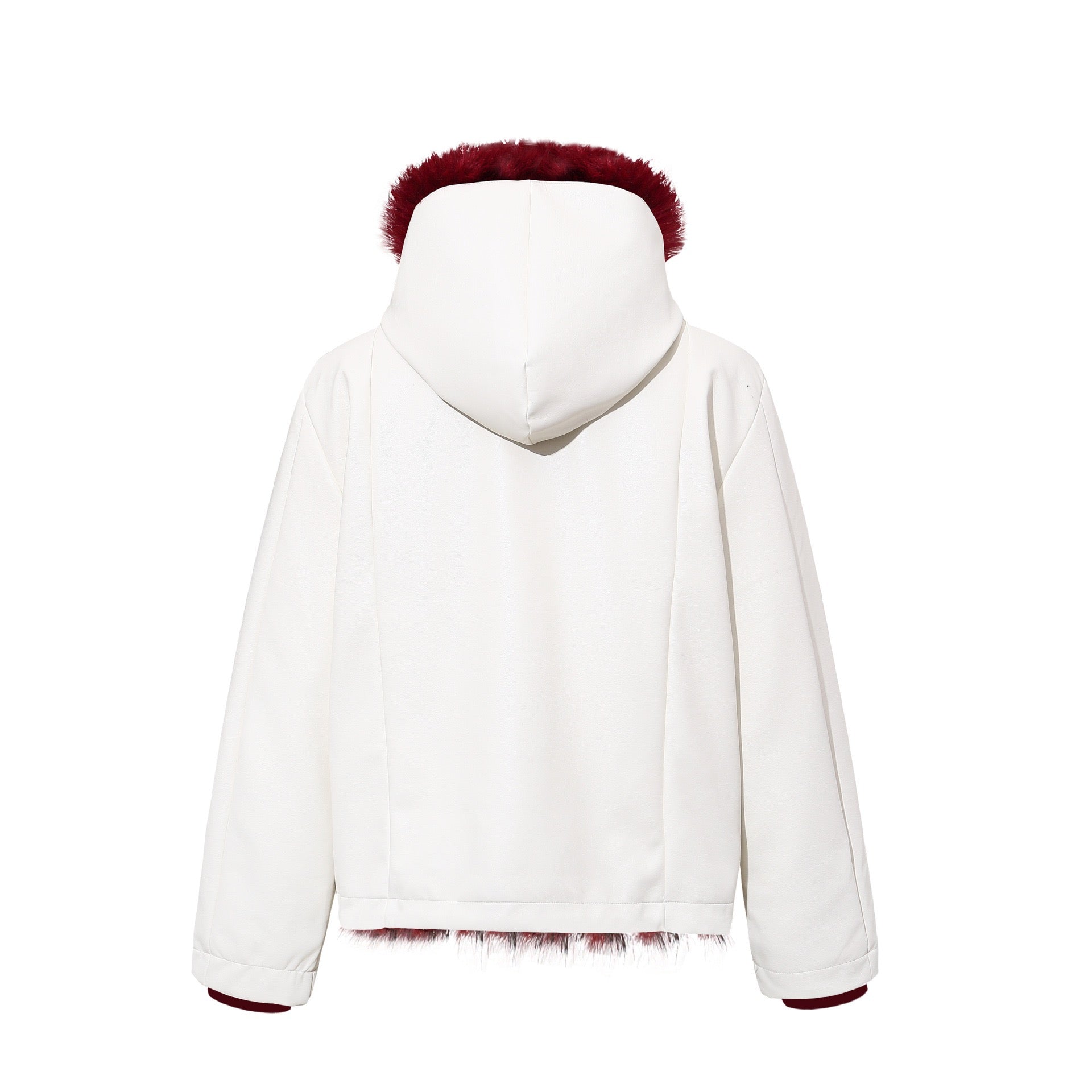 Clothing details: Contrast faux-fur hood & hem, metal cross rivets, utility flap pockets, structured PU paneling, full zip closure.