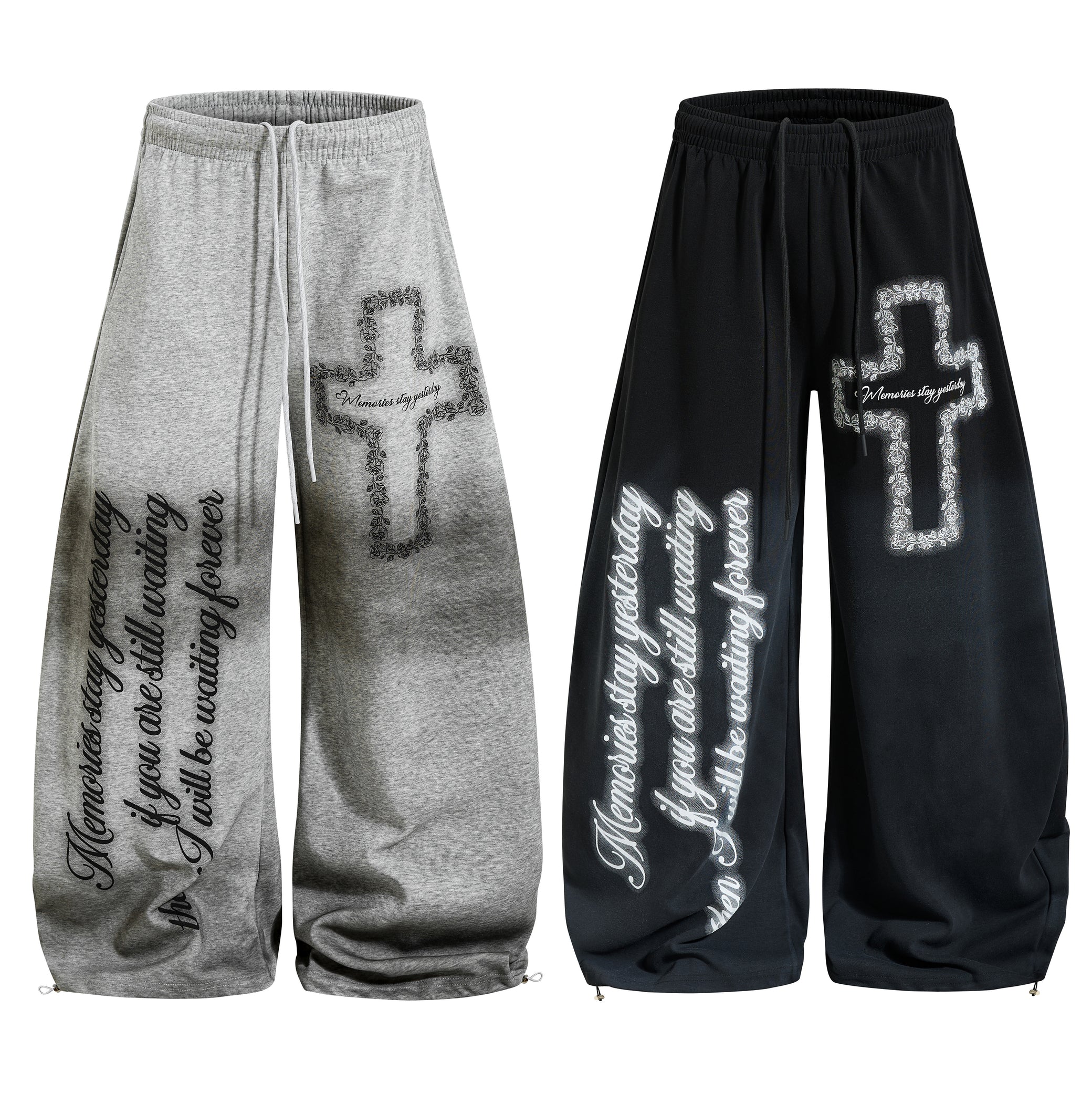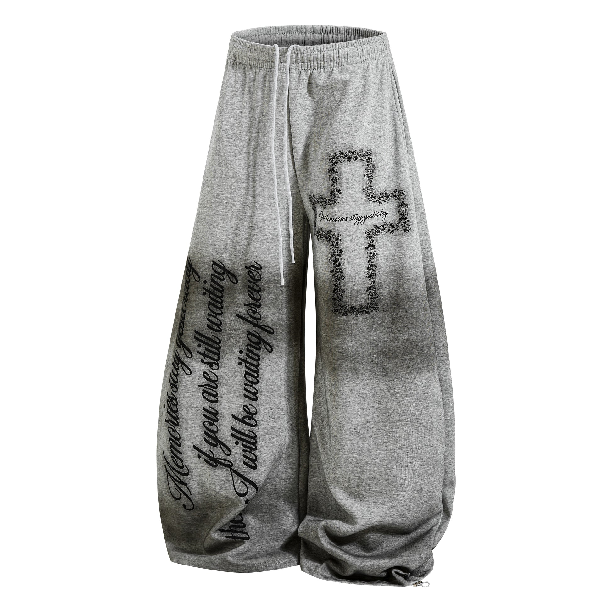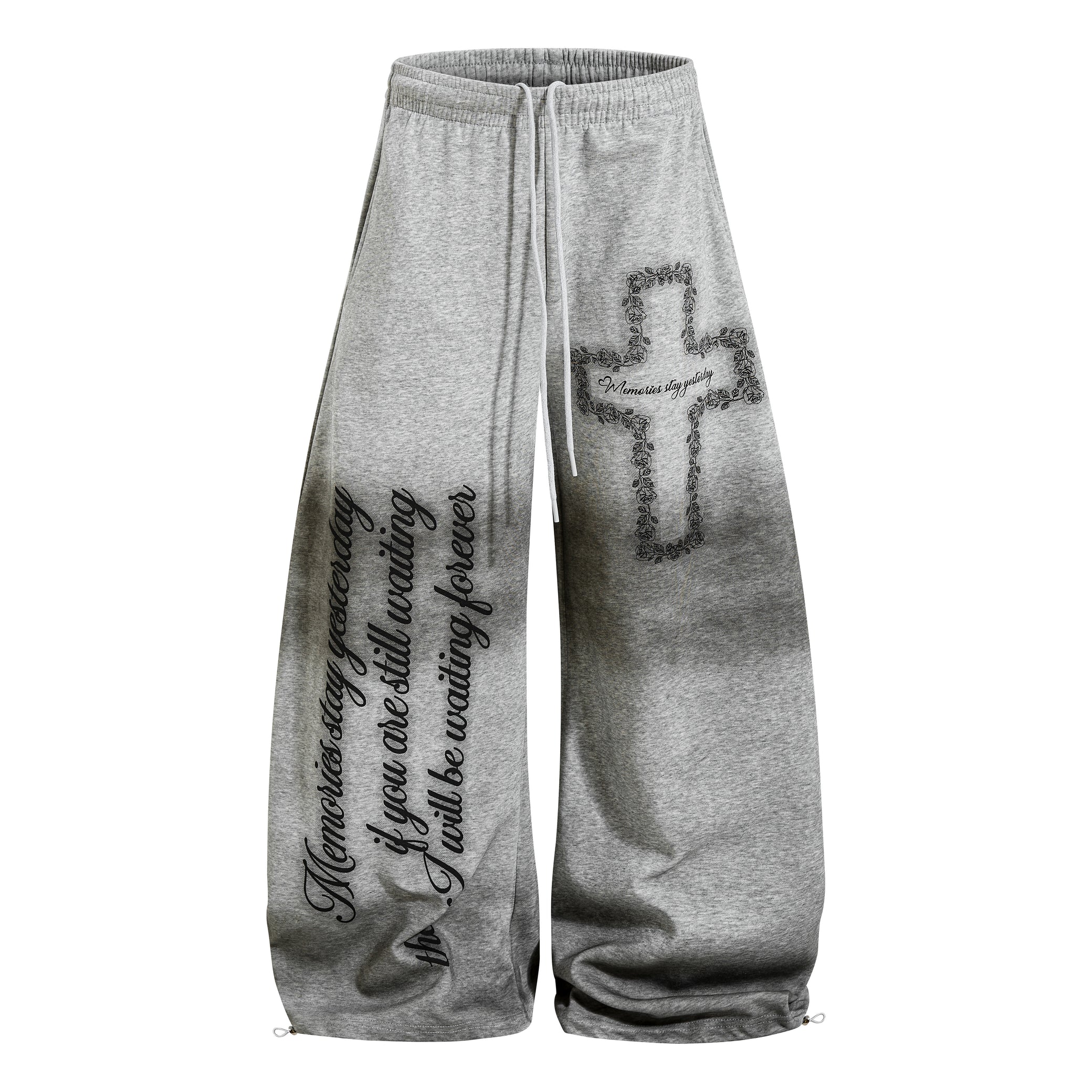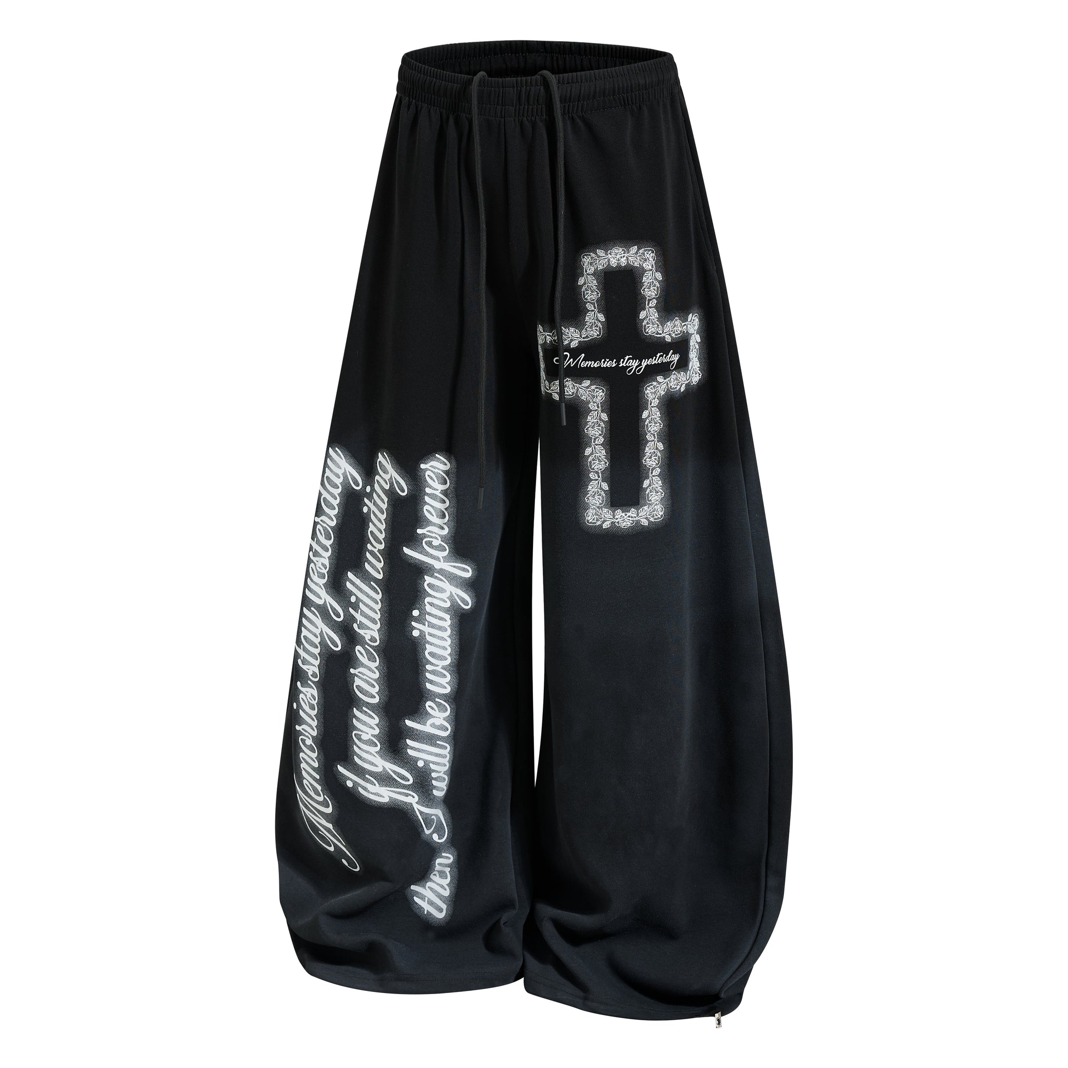 Clothing details: Elastic waistband, adjustable drawstring, wide-leg silhouette, cross graphic print, oversized script lettering, relaxed streetwear fit