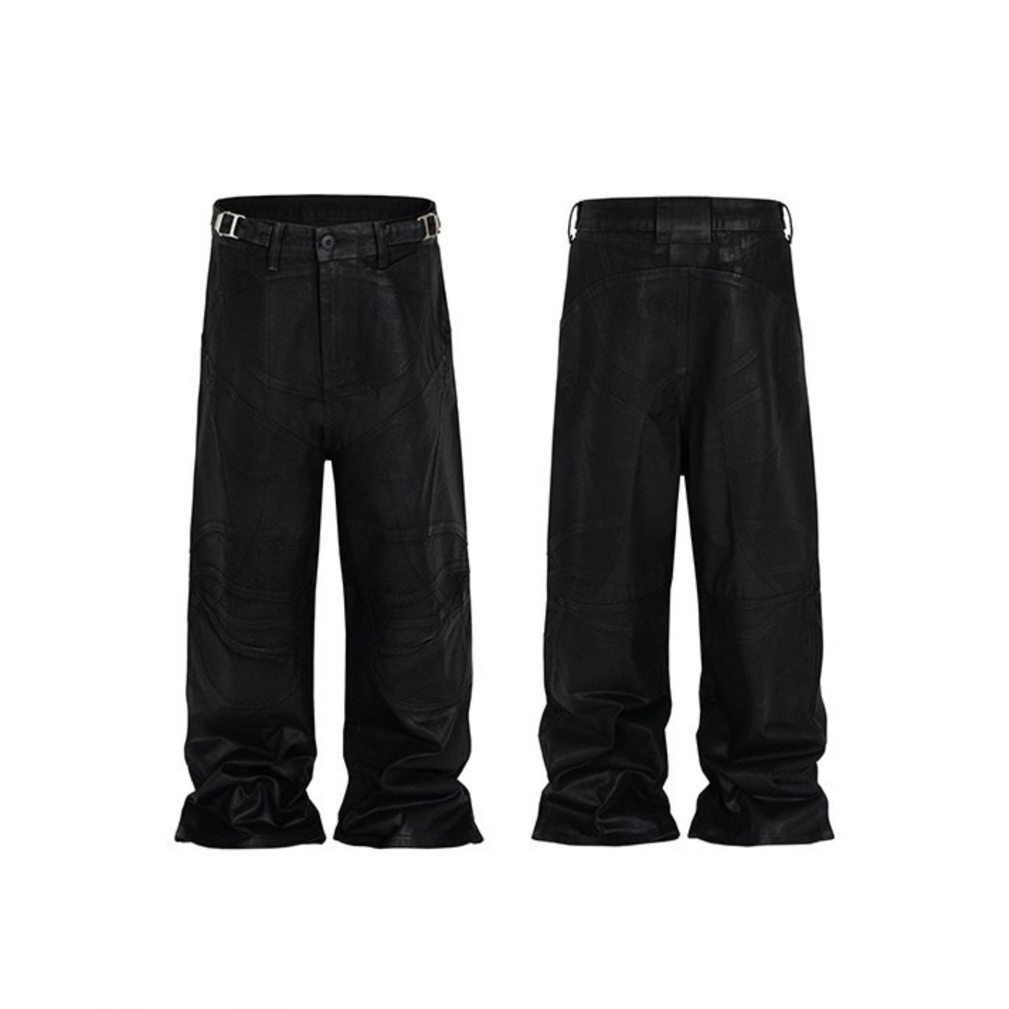 Clothing details: Curved stitched panels, leather-textured coating, metal waist adjusters, stacked wide-leg fit, structured silhouette