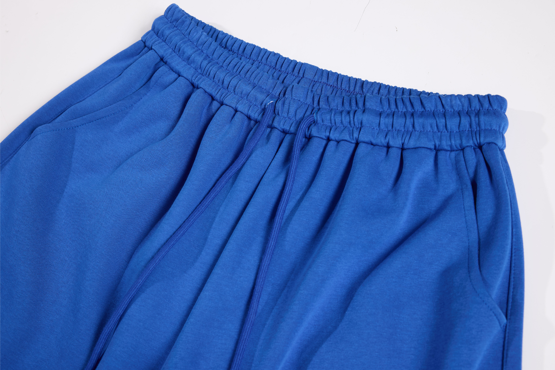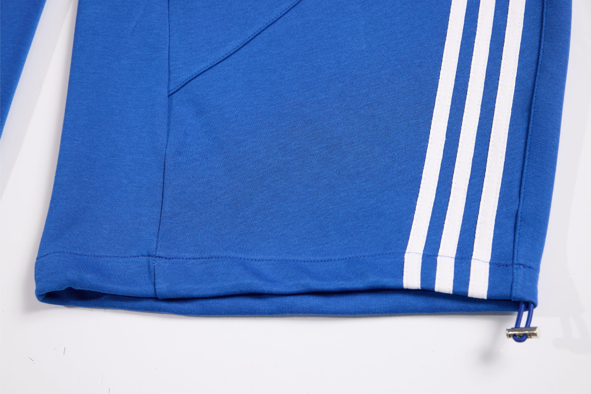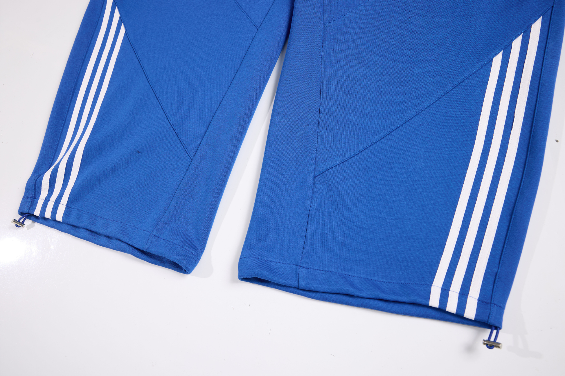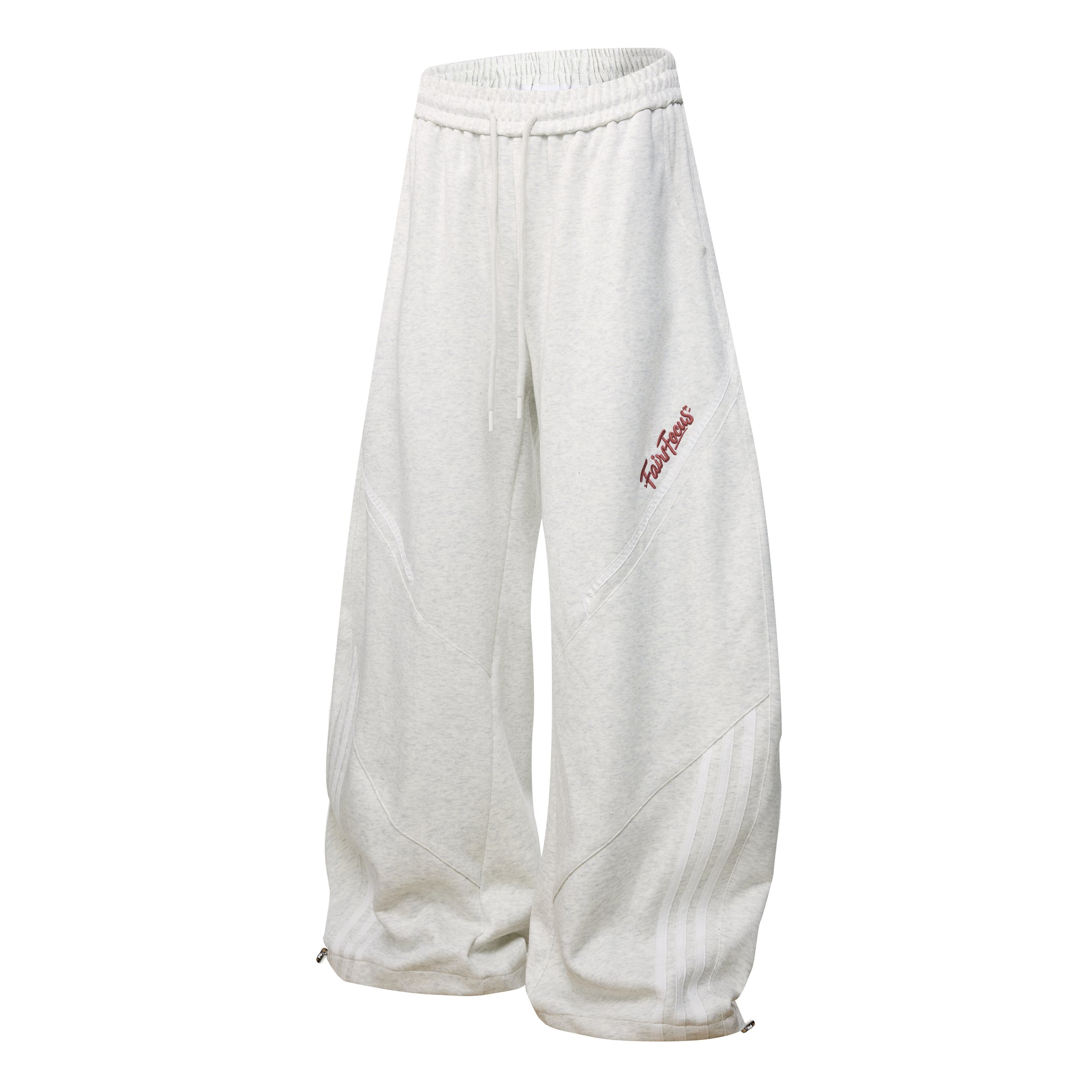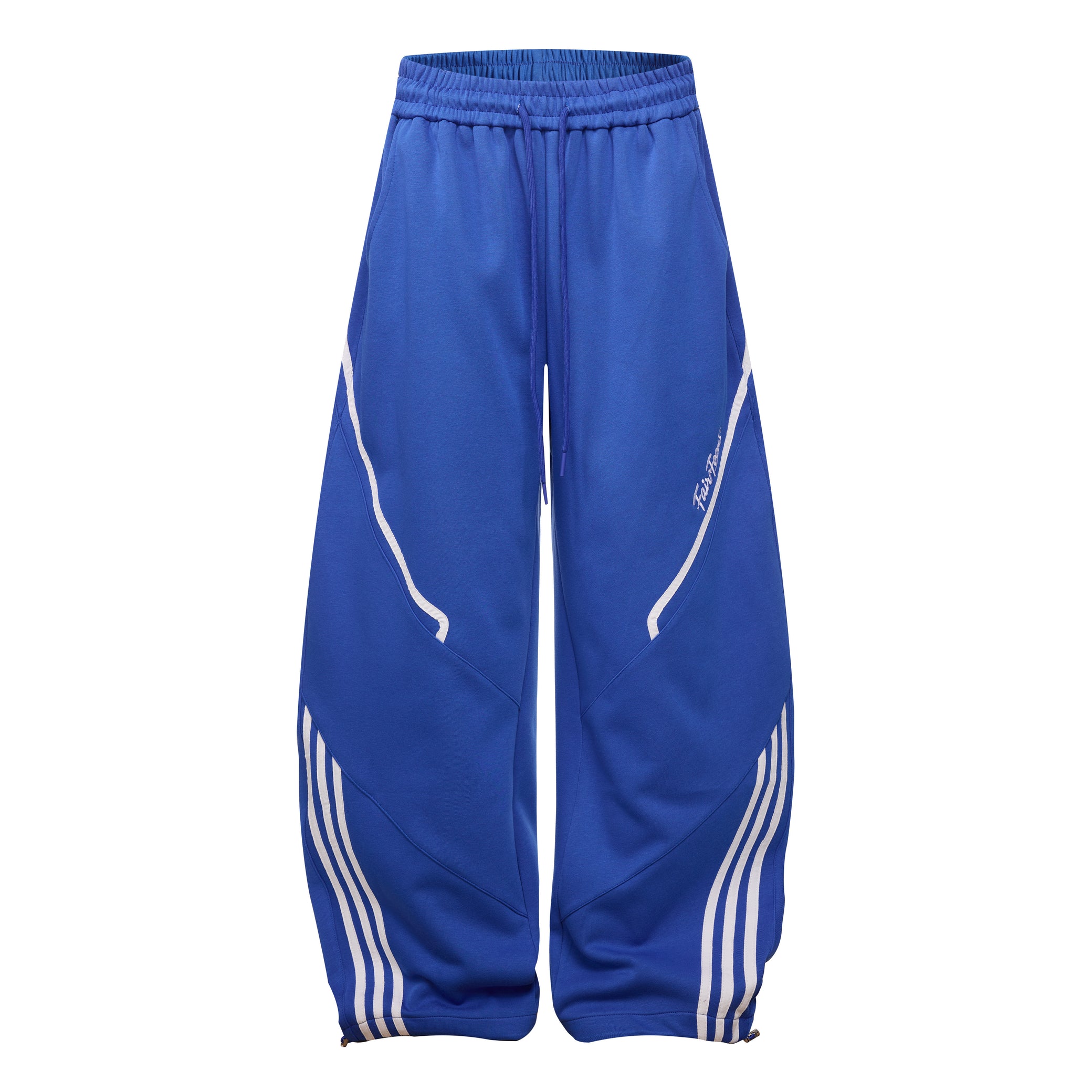 Clothing details: Curved-panel construction, triple-stripe detail, embroidered logo, drawstring waist, wide stacked fit.