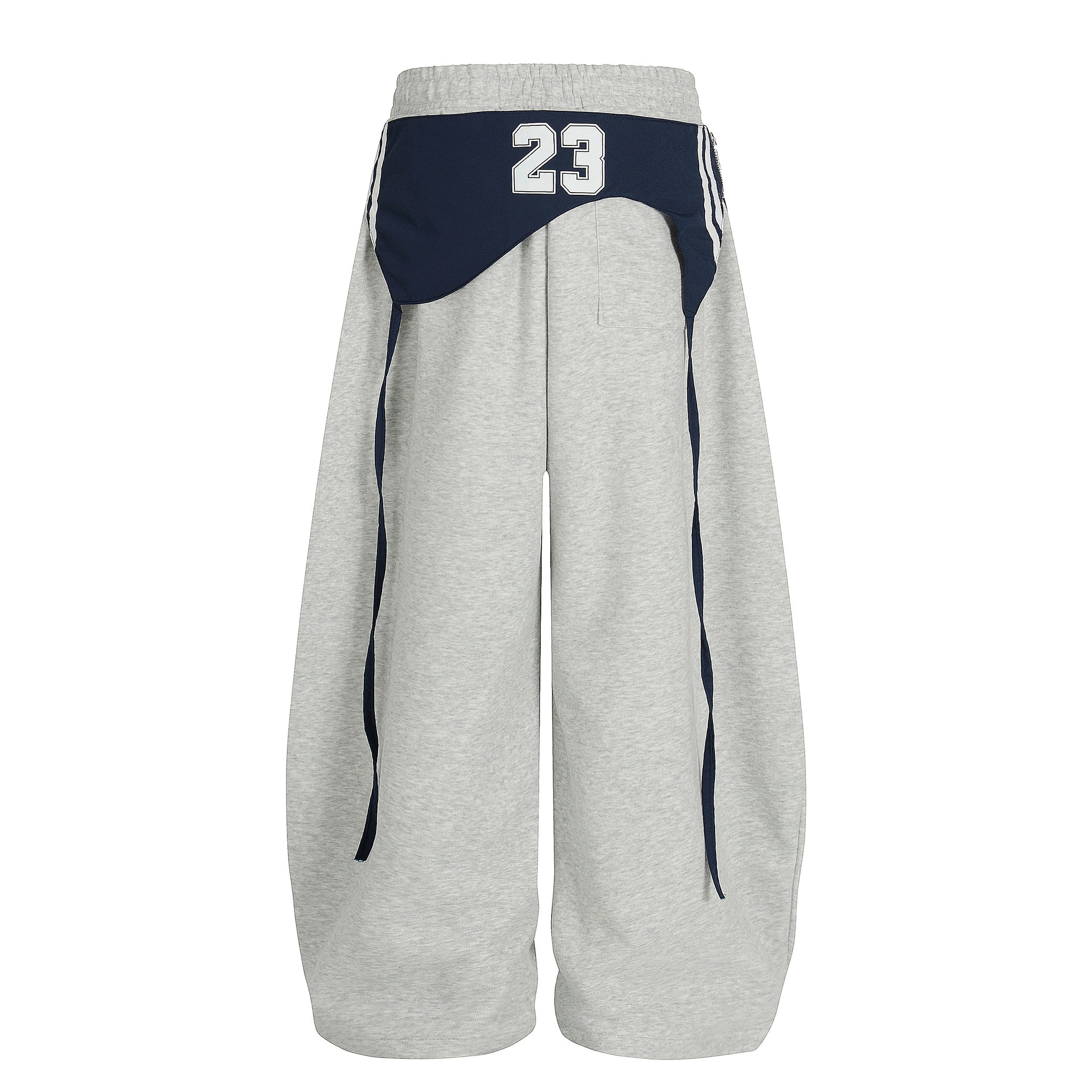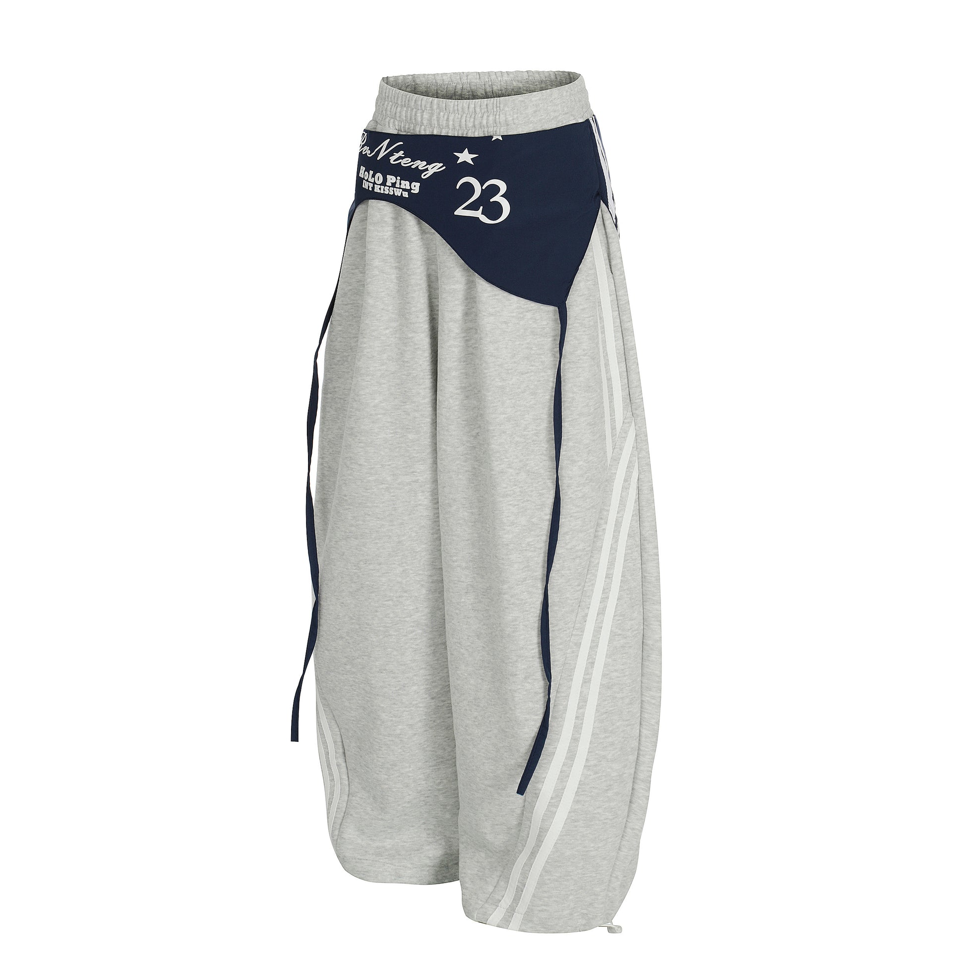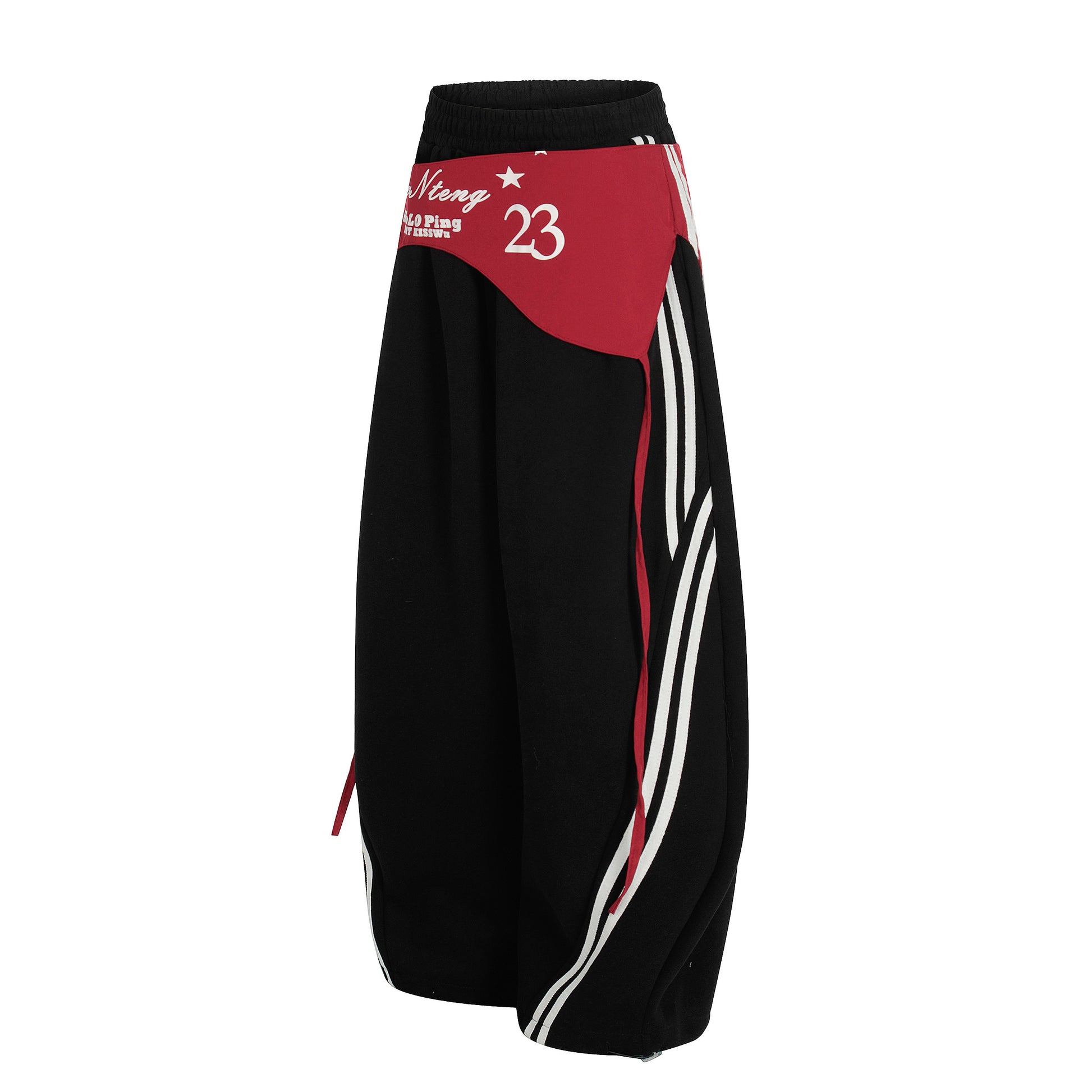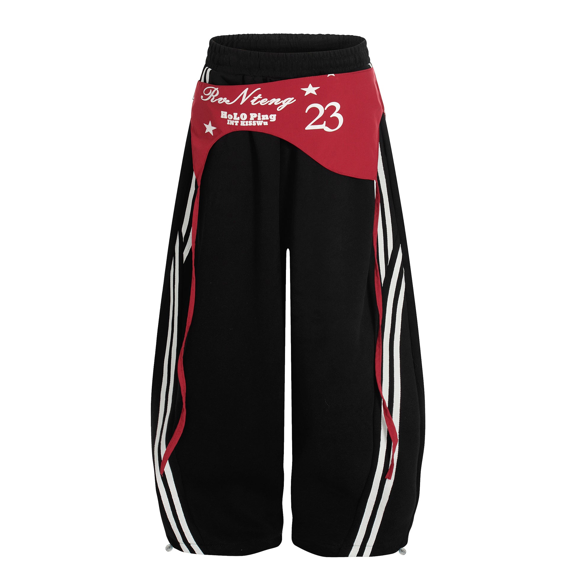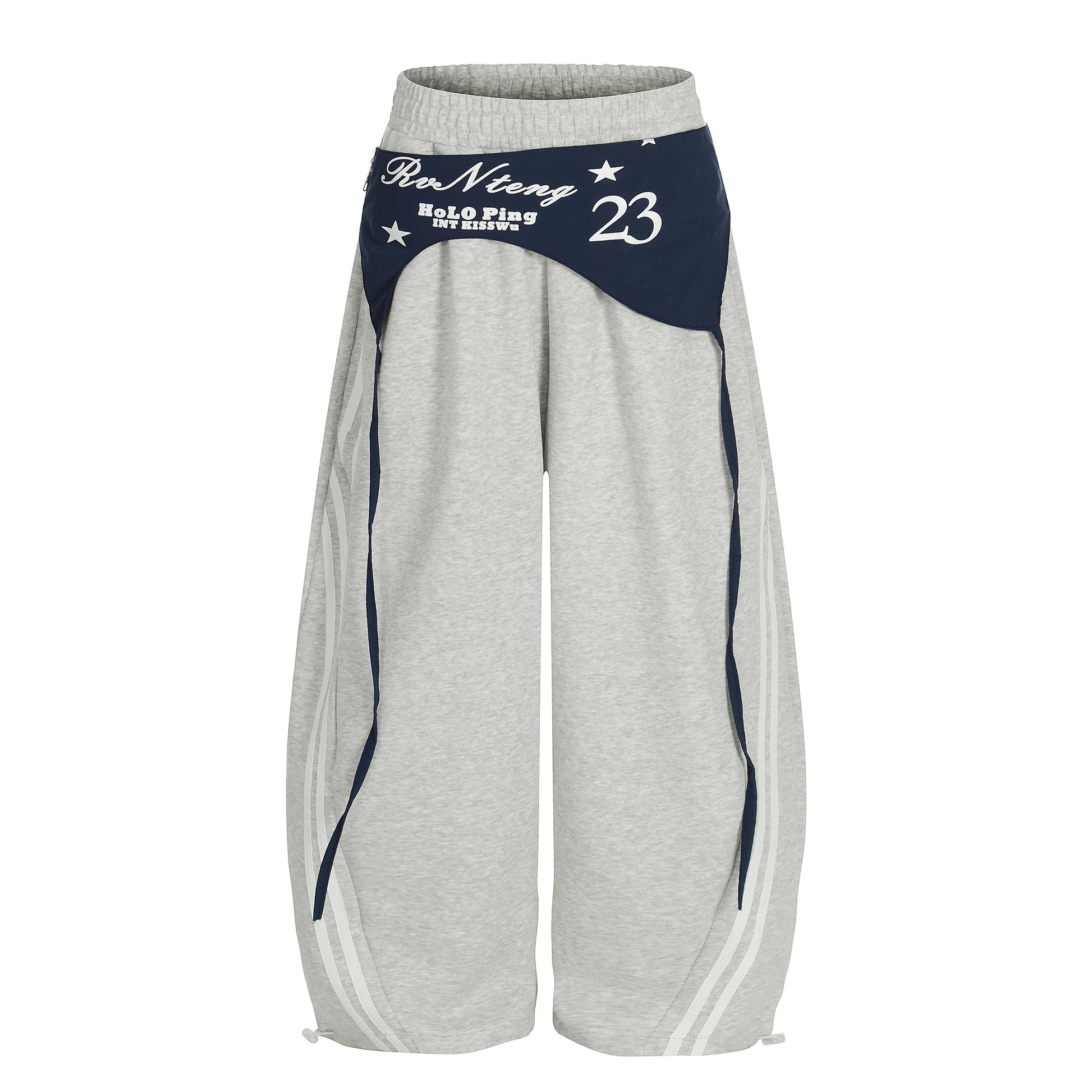 Clothing details: Double-waist design, varsity print graphics, curved wide-leg fit, contrast stripe panels, adjustable drawcord hems.