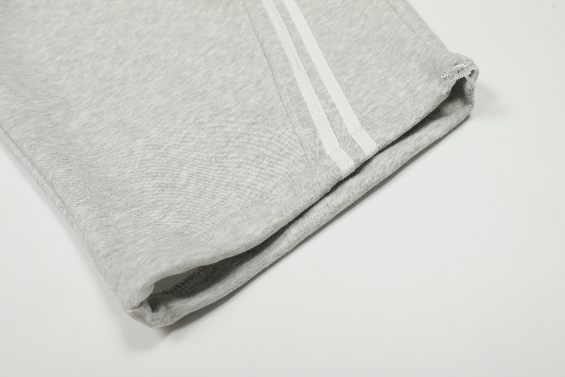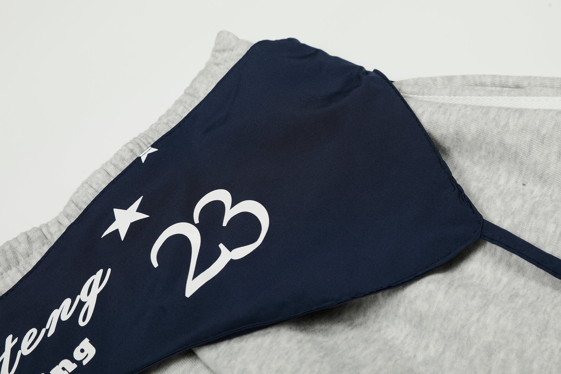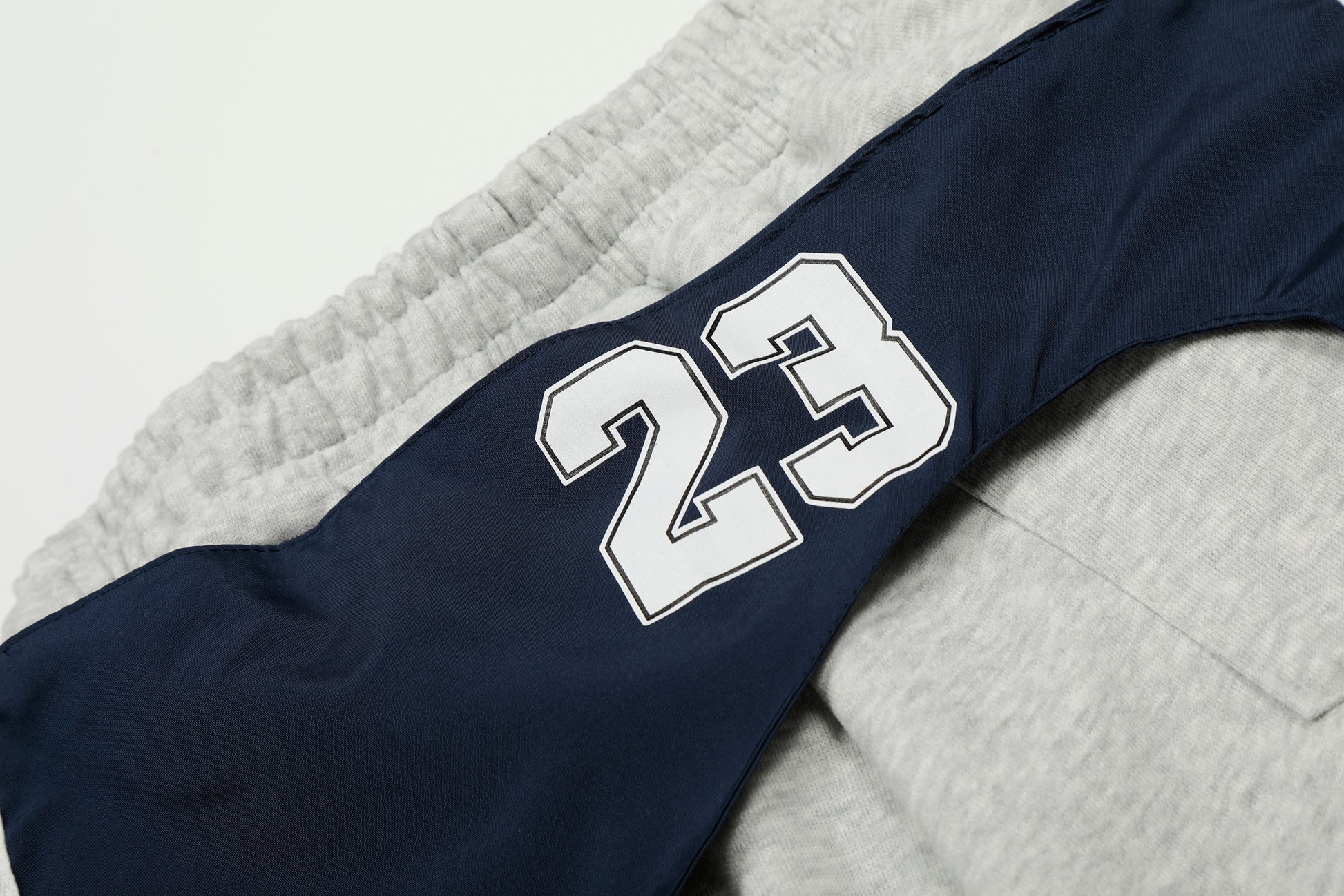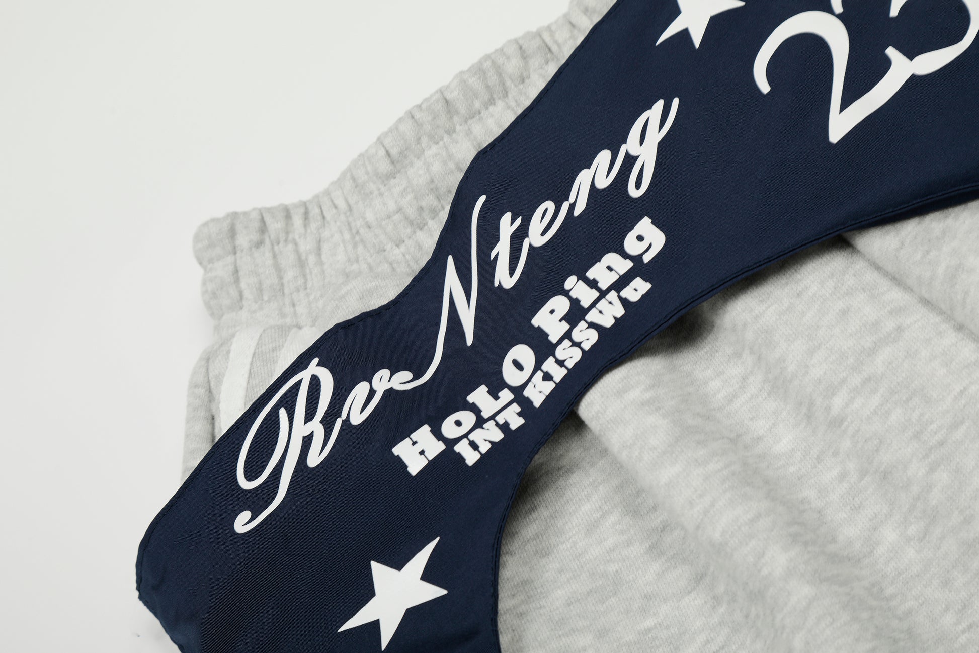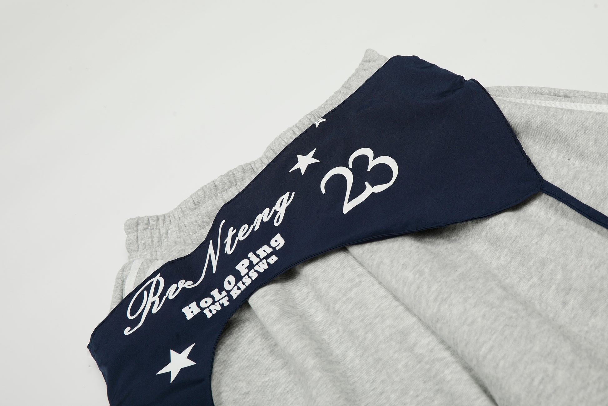 Clothing details: Double-waist design, varsity print graphics, curved wide-leg fit, contrast stripe panels, adjustable drawcord hems.
