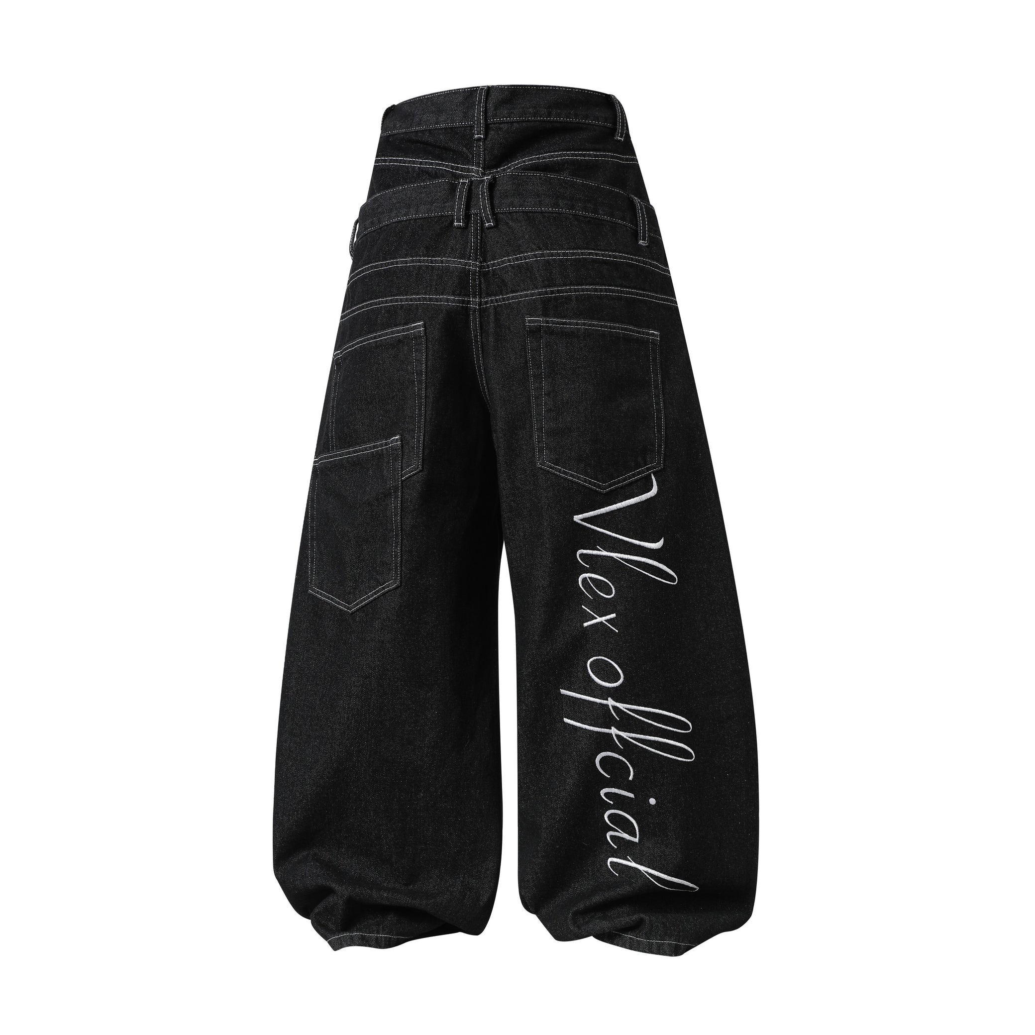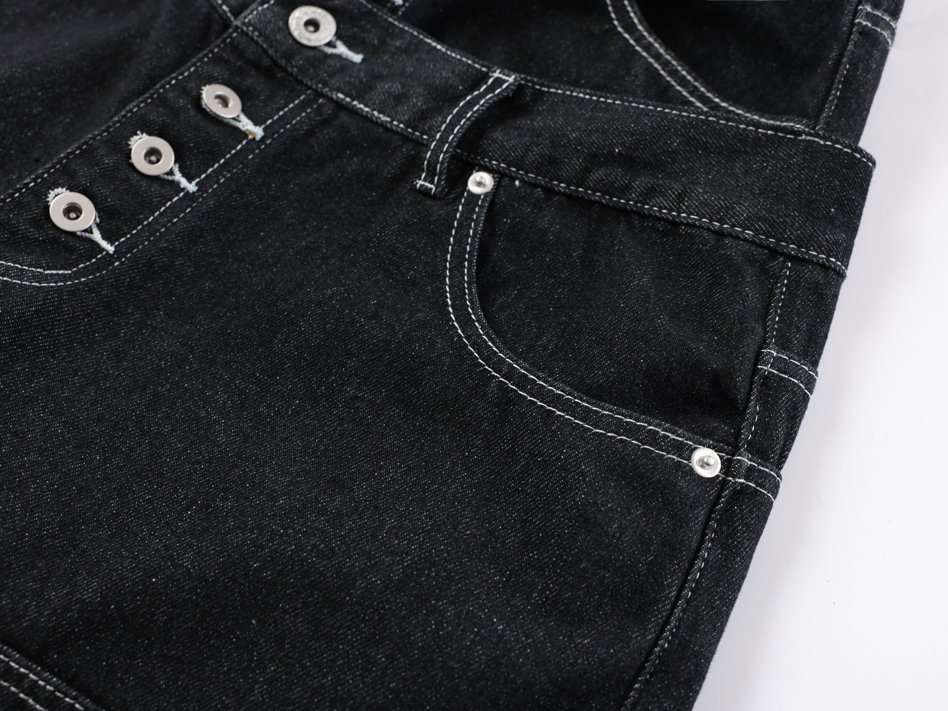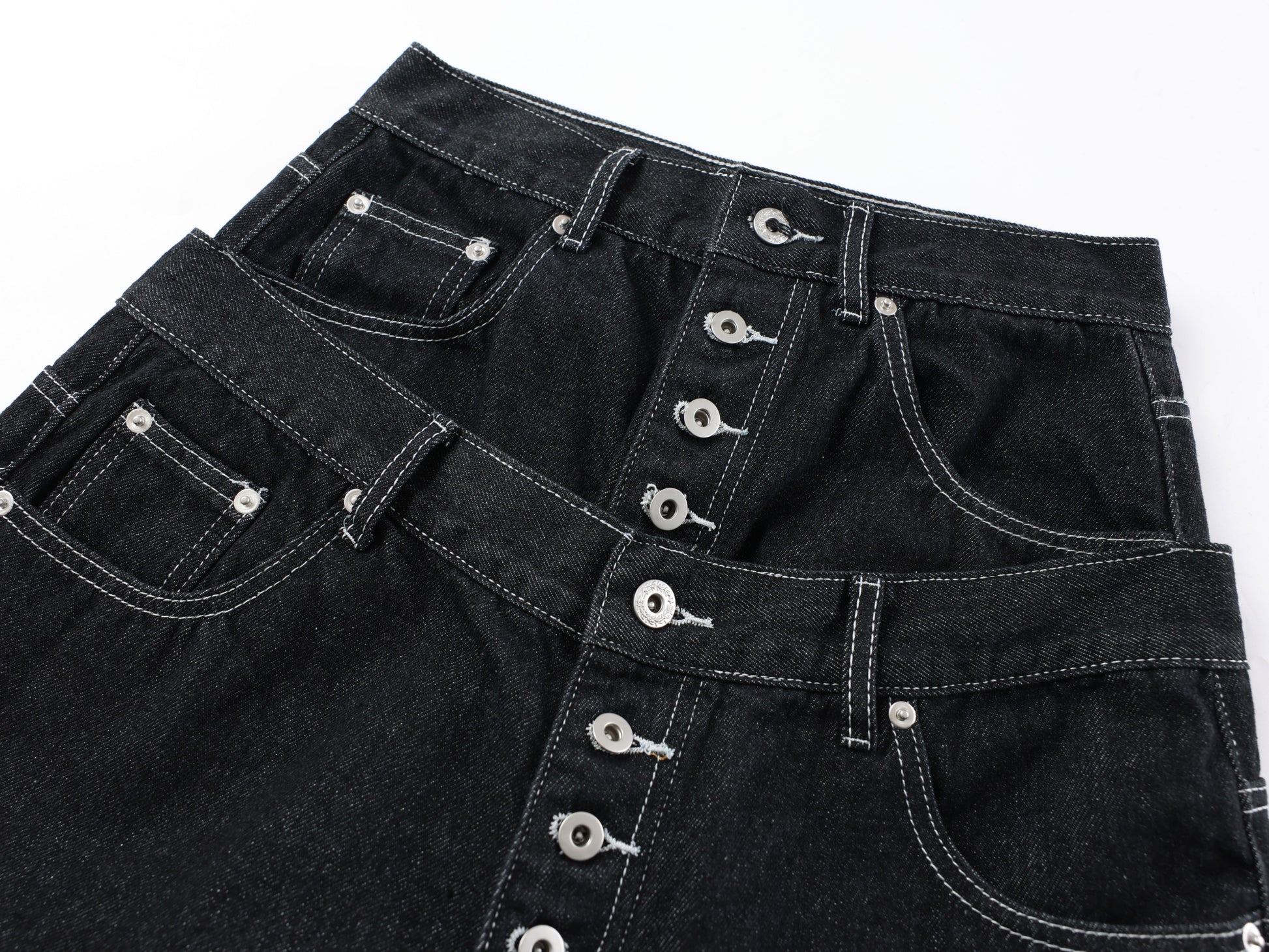 Clothing details: Double-waist layered design, exposed multi-button front closure, reinforced panel construction, contrast topstitching, oversized utility pockets, wide-leg relaxed fit, back script graphic detail.