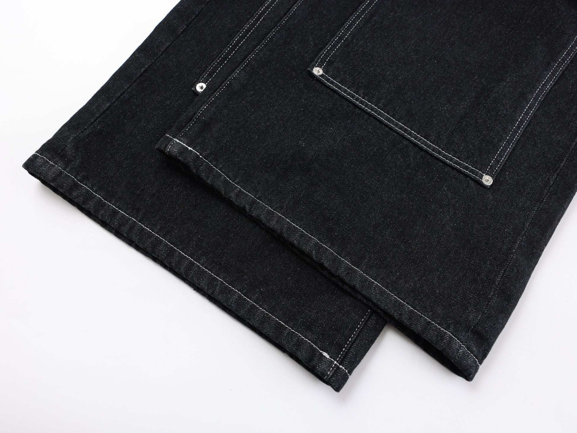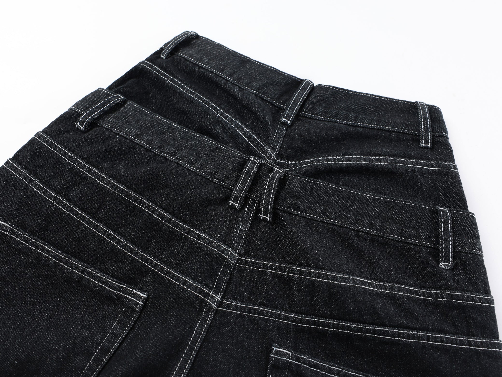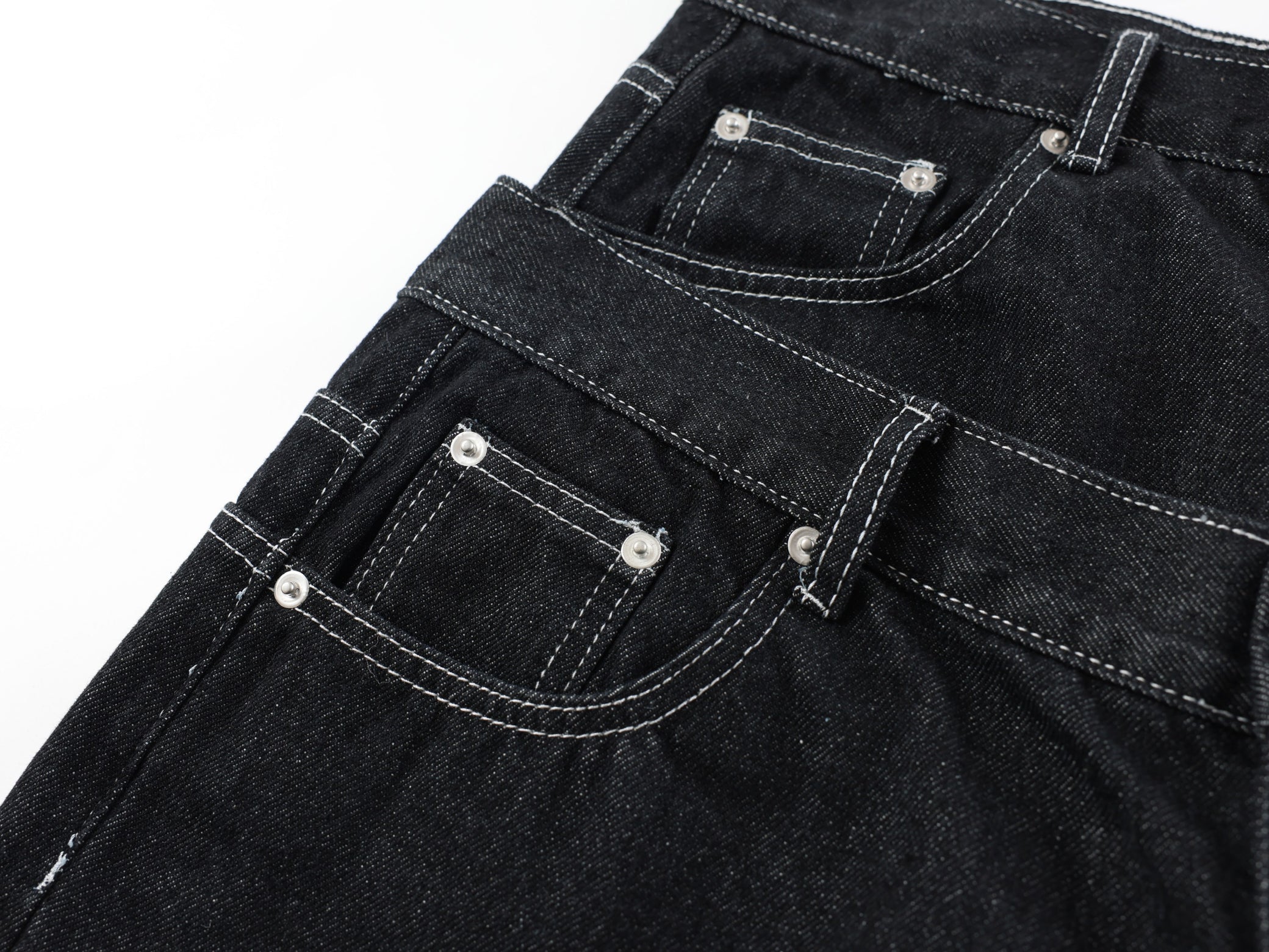 The Omirad Double-Waist Utility Denim Pants feature a layered waistband construction paired with exposed button detailing for a bold, architectural take on classic denim. Designed with contrast stitching, reinforced paneling, and oversized pockets, these pants deliver a rugged industrial aesthetic with modern streetwear attitude. Finished with a wide-leg silhouette and subtle script graphic at the back, they bring statement structure to everyday fits.