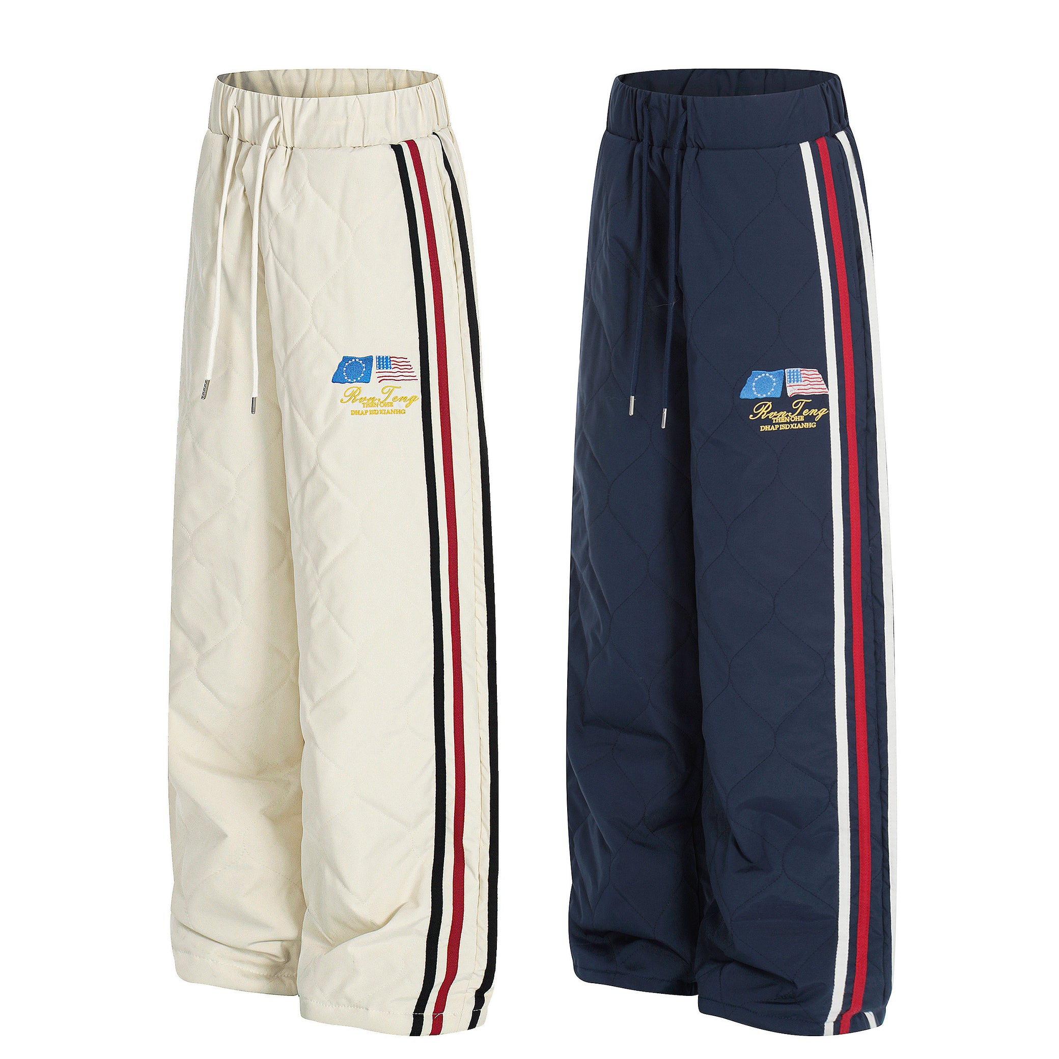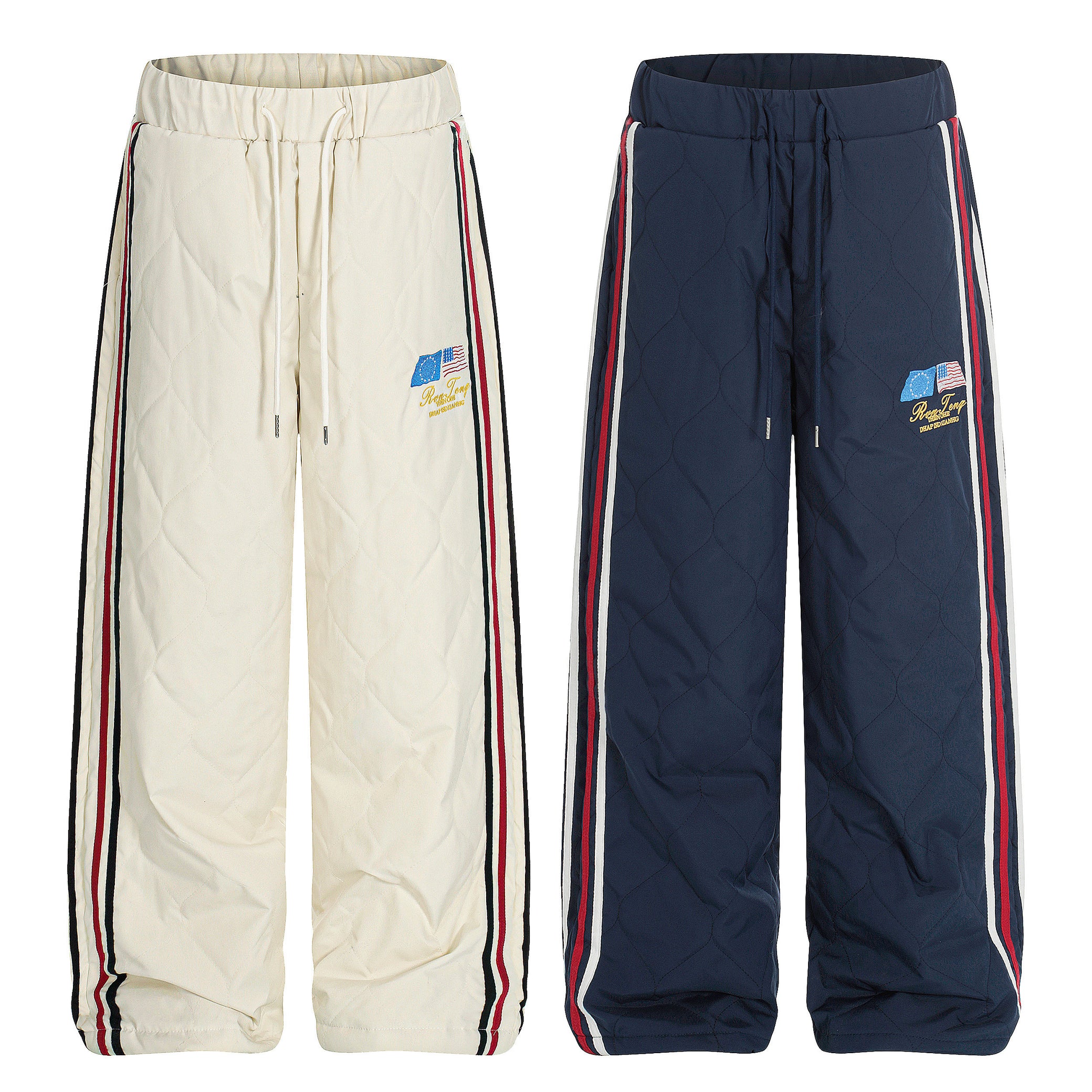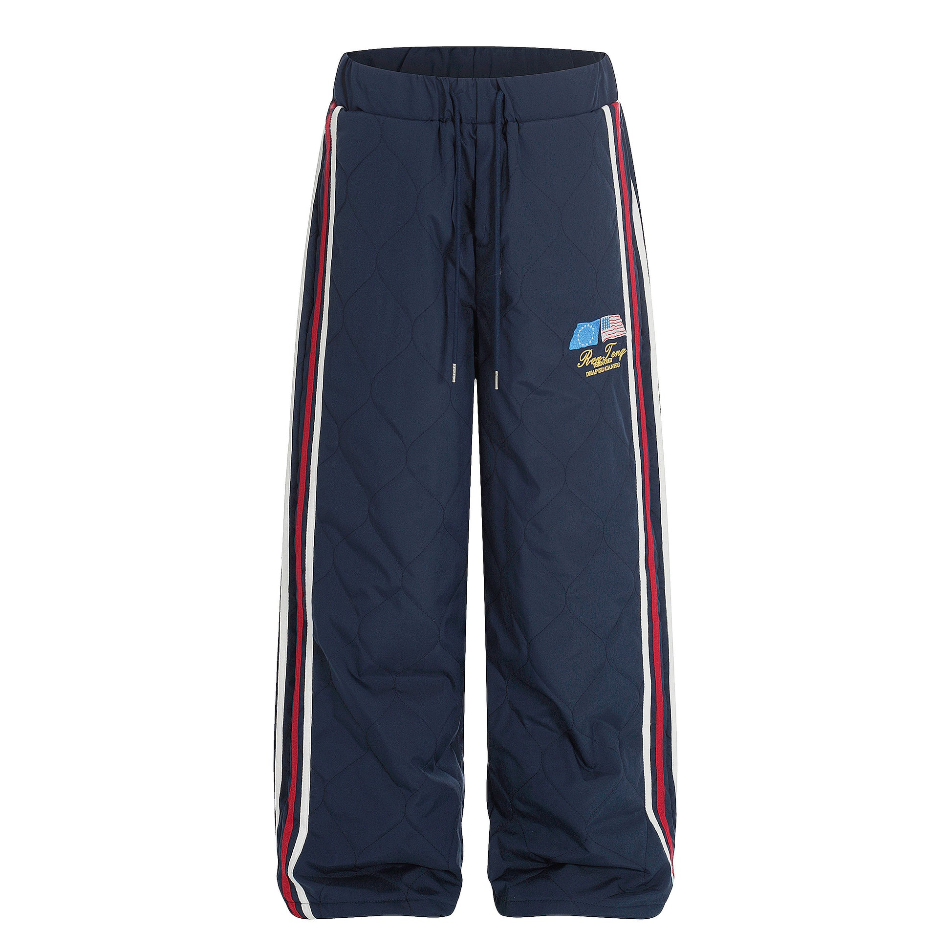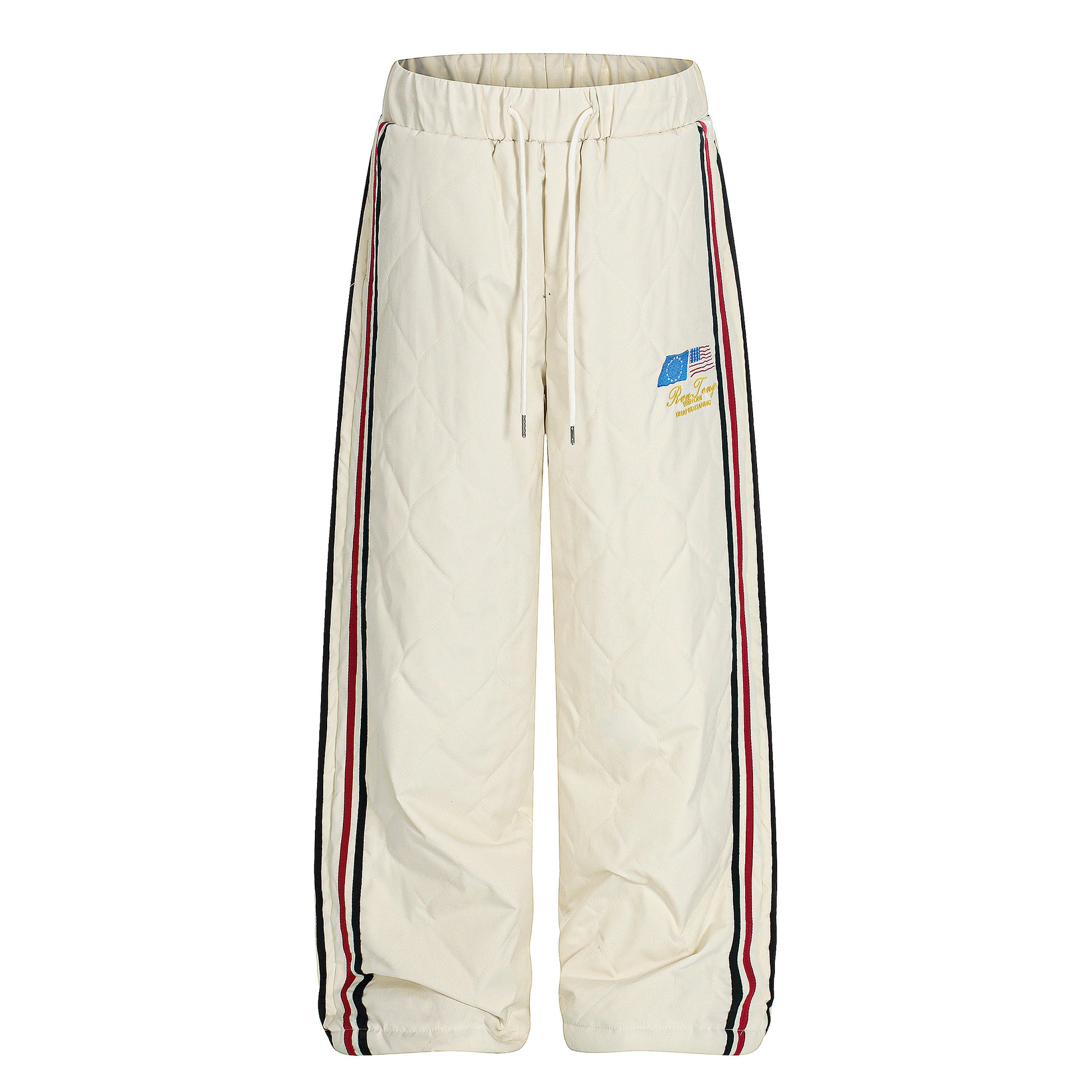 Clothing Details: Diamond quilting, wide-leg silhouette, racing side stripes, embroidered patch, insulated padded design