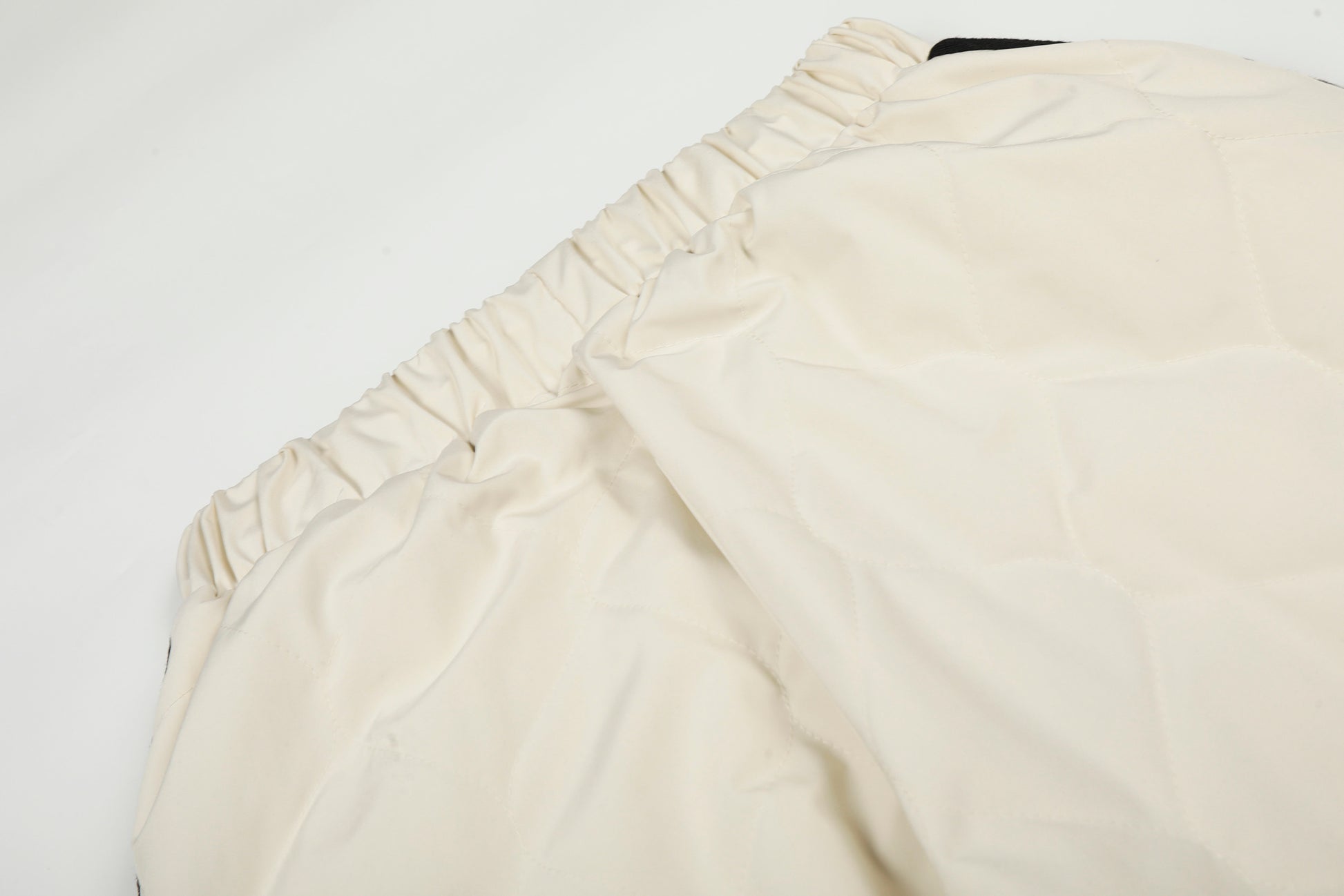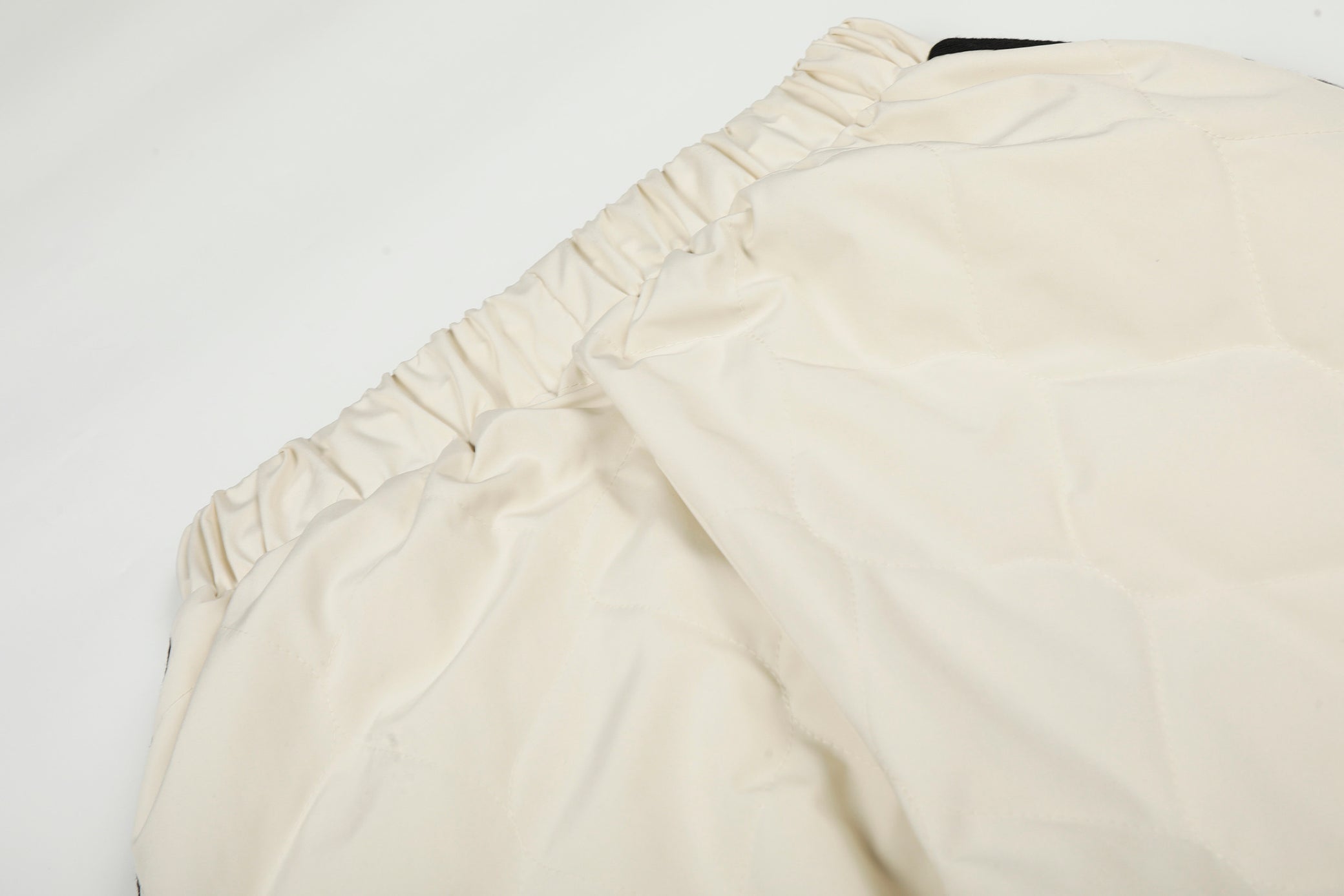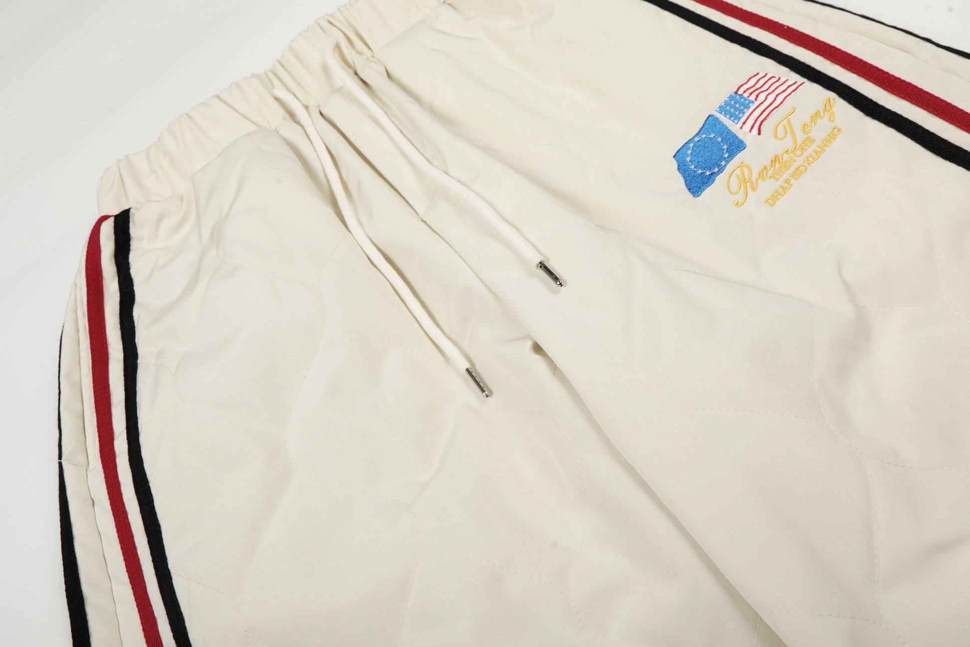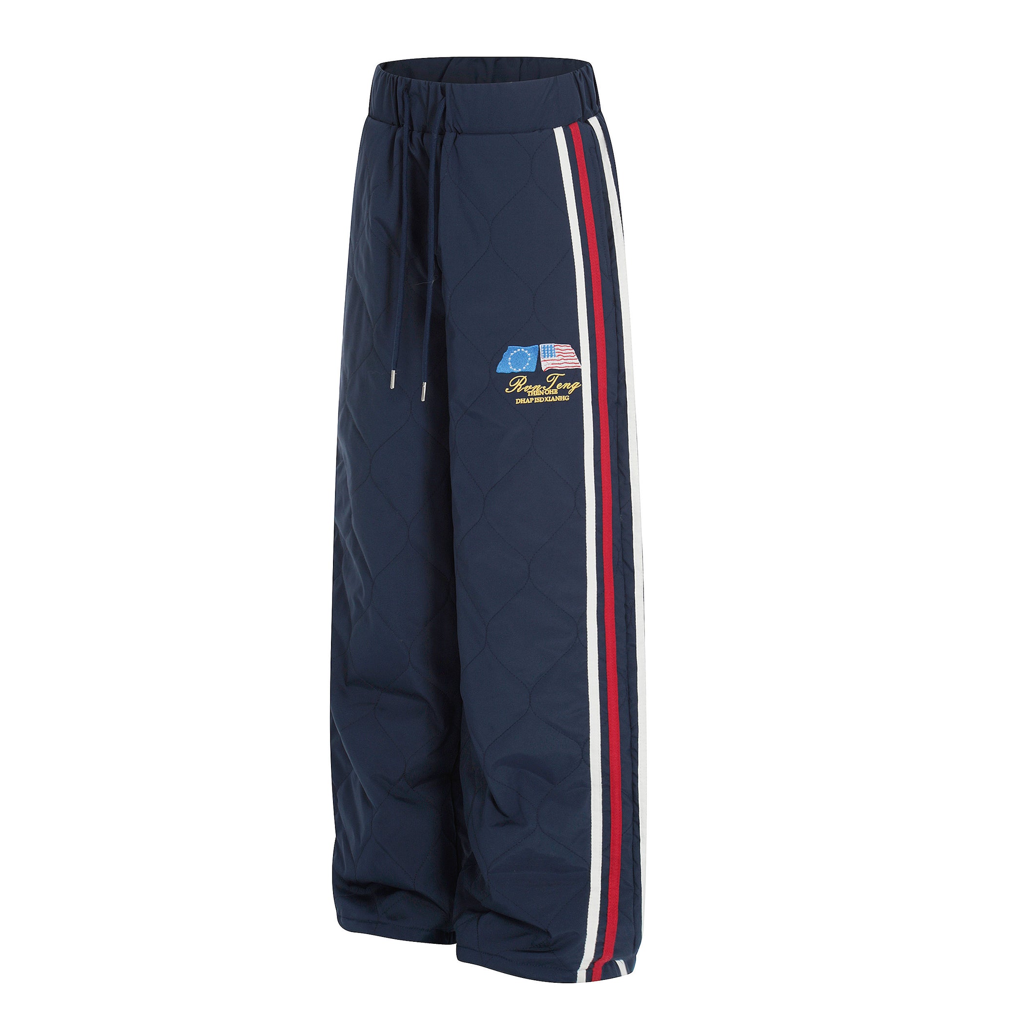 Clothing Details: Diamond quilting, wide-leg silhouette, racing side stripes, embroidered patch, insulated padded design