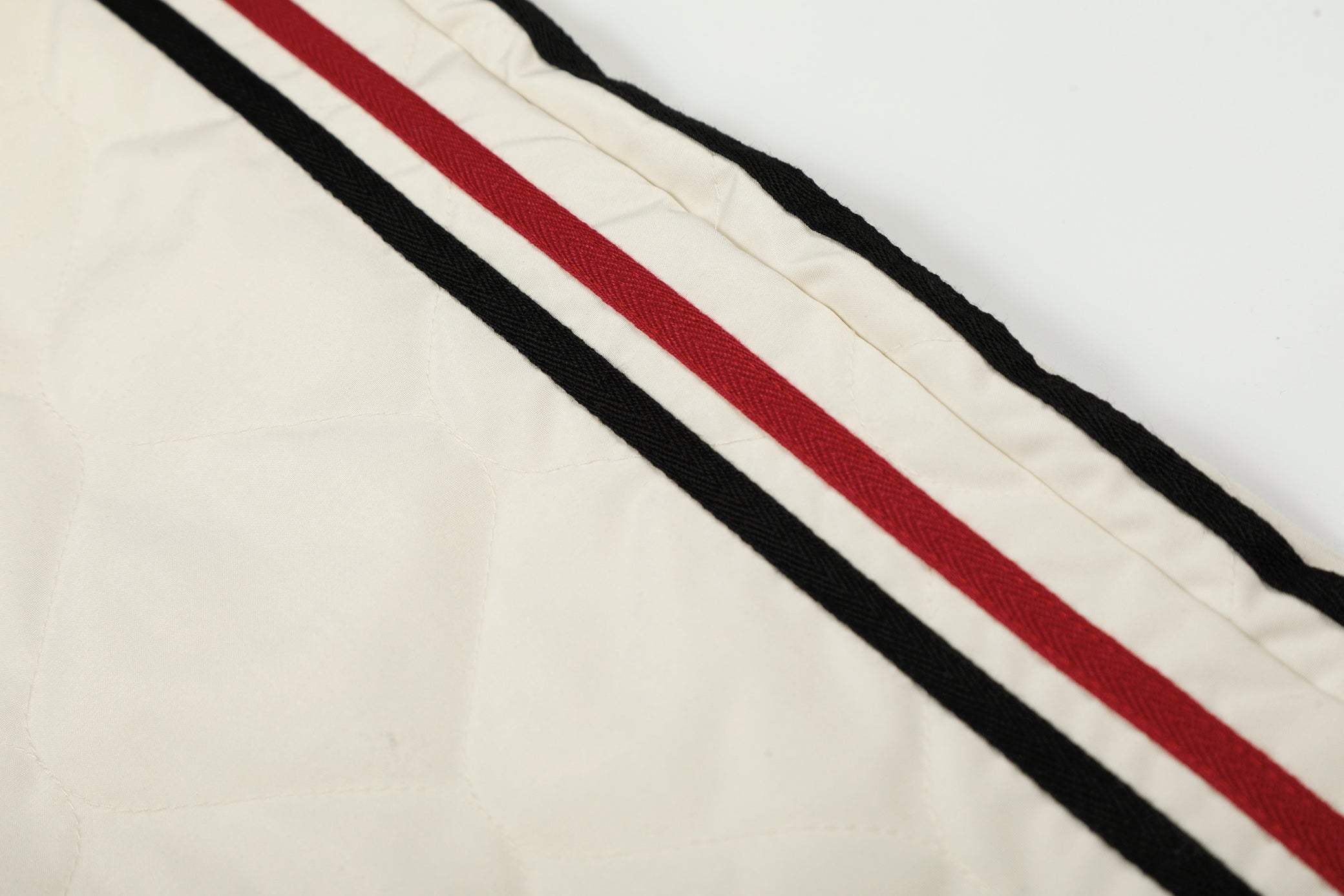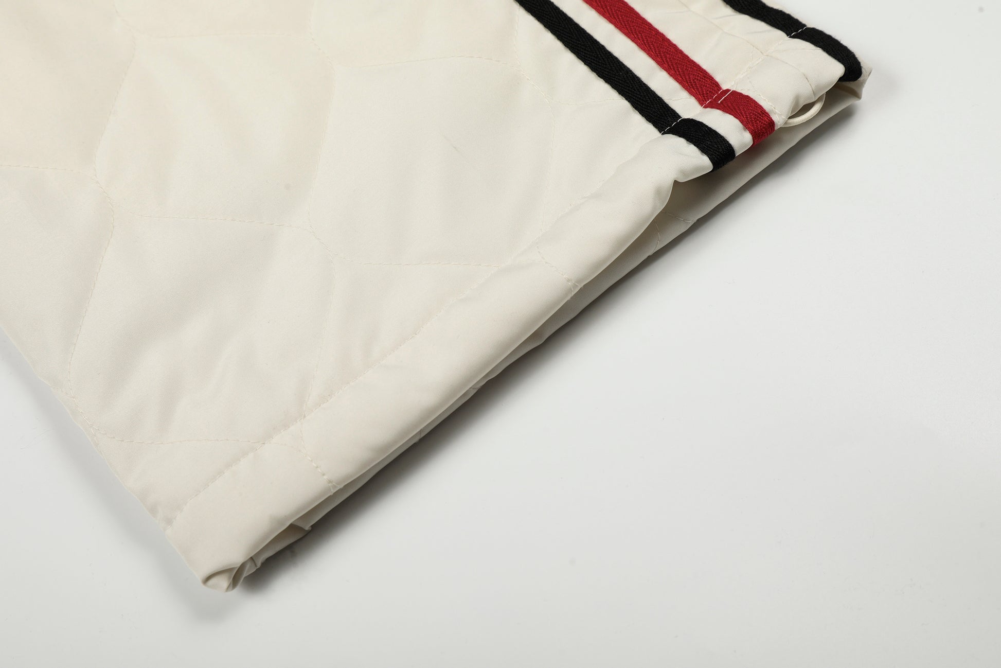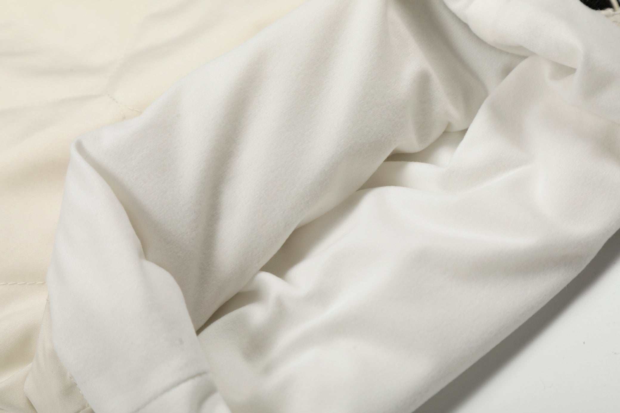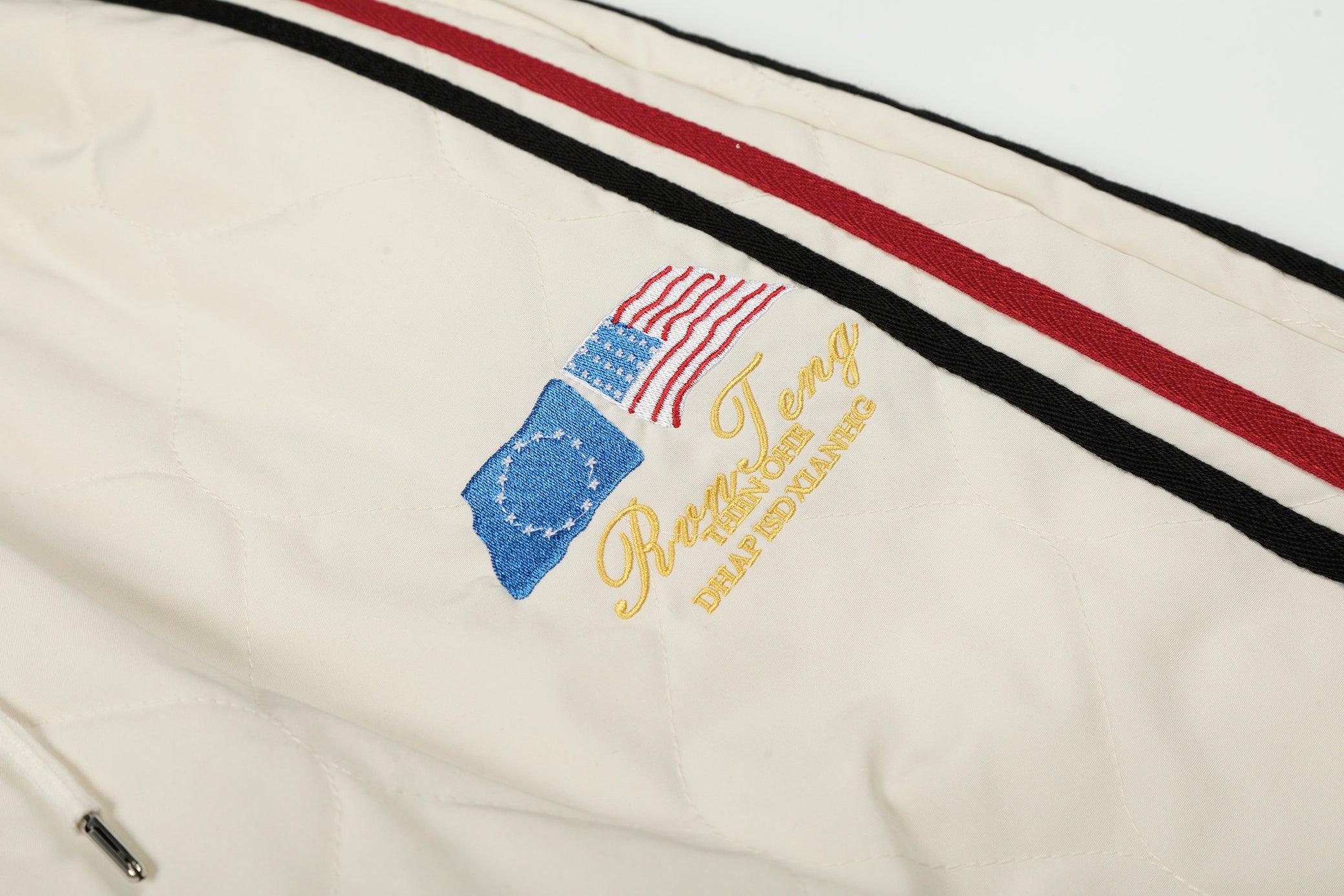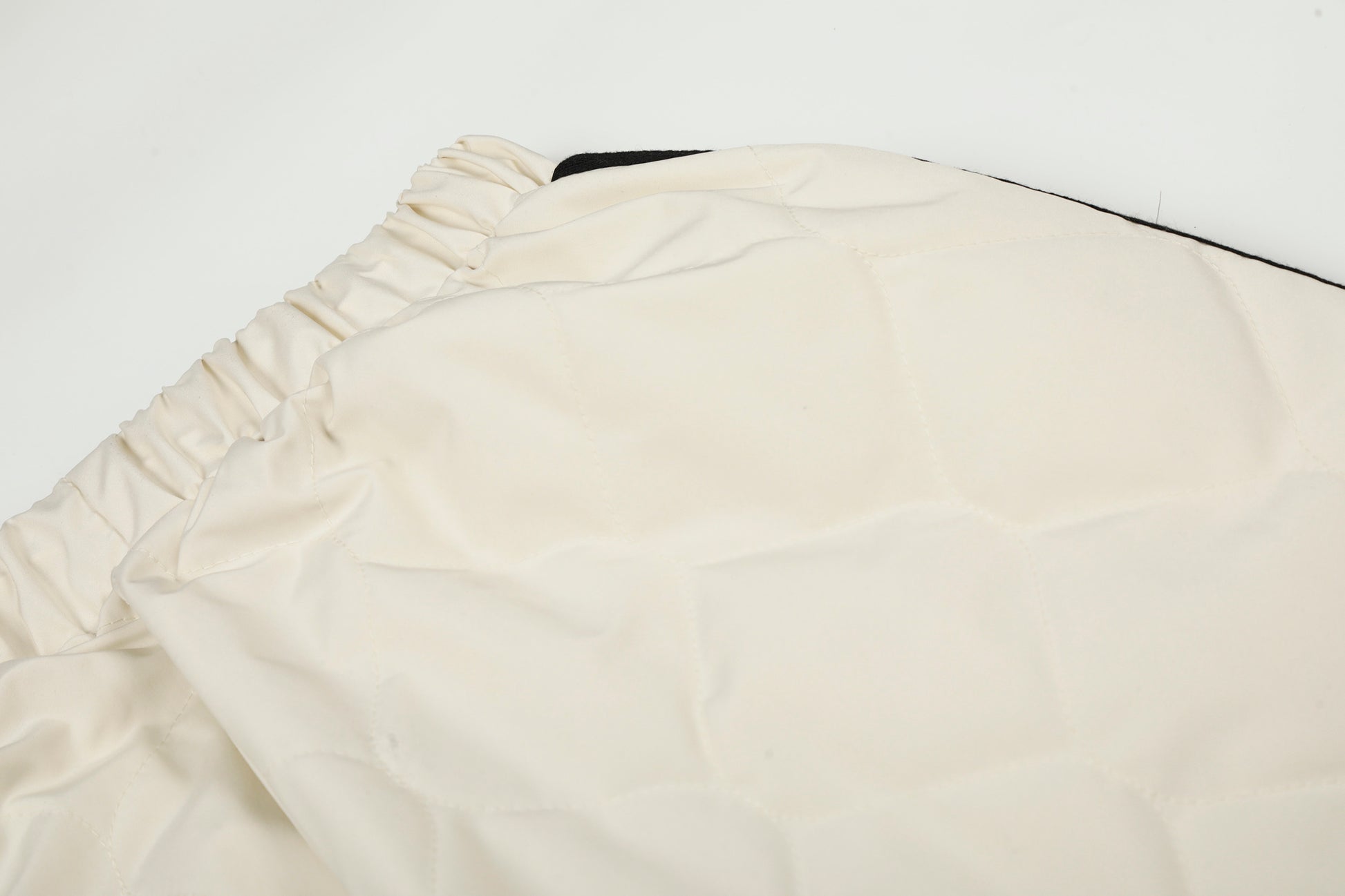 Clothing Details: Diamond quilting, wide-leg silhouette, racing side stripes, embroidered patch, insulated padded design