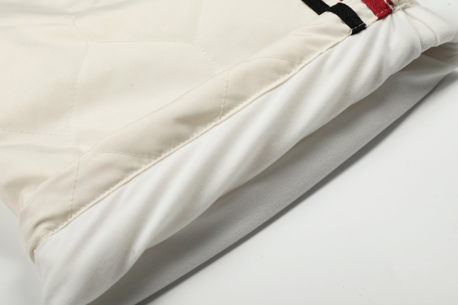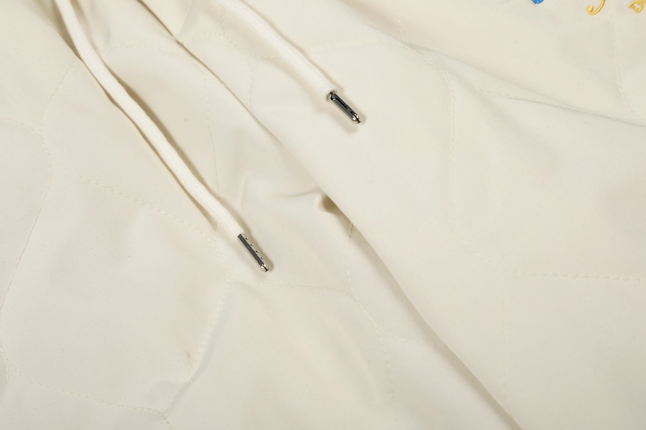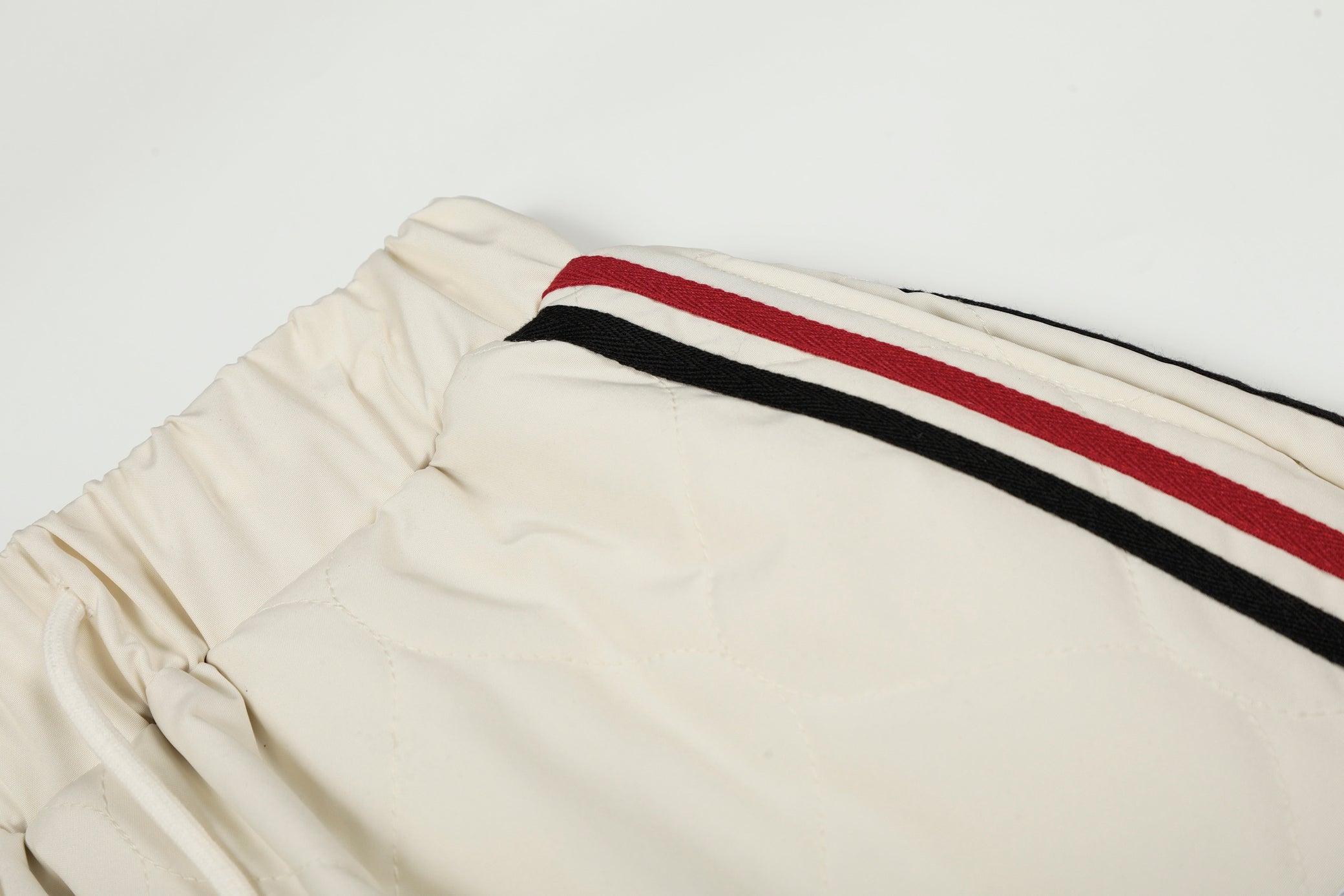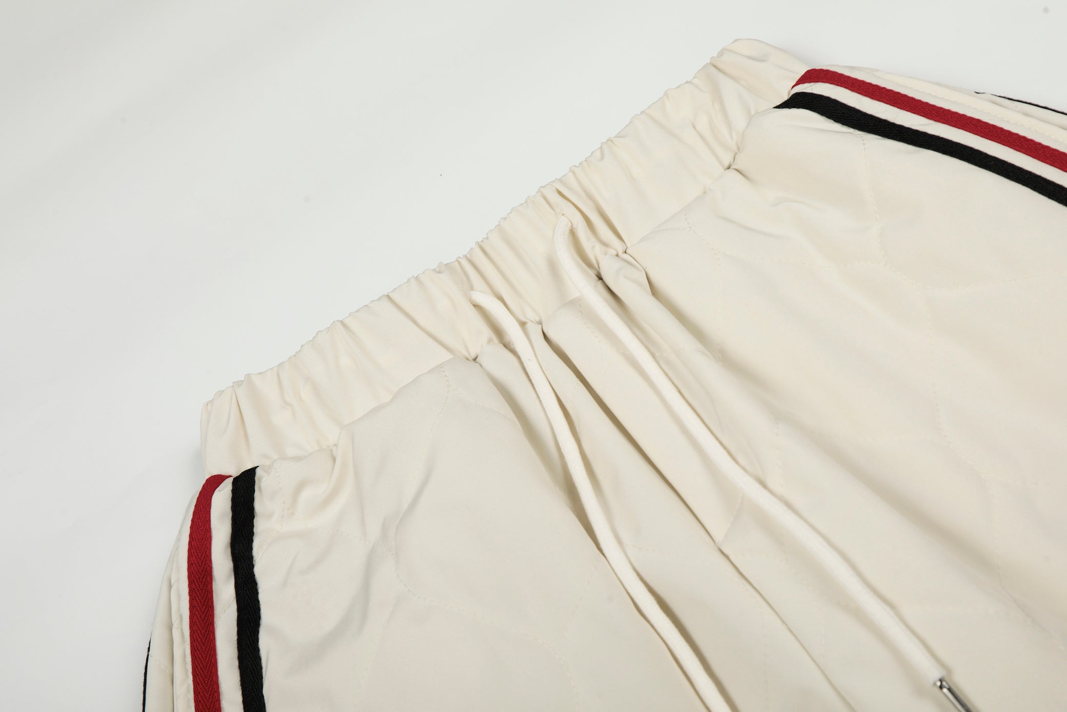 Clothing Details: Diamond quilting, wide-leg silhouette, racing side stripes, embroidered patch, insulated padded design