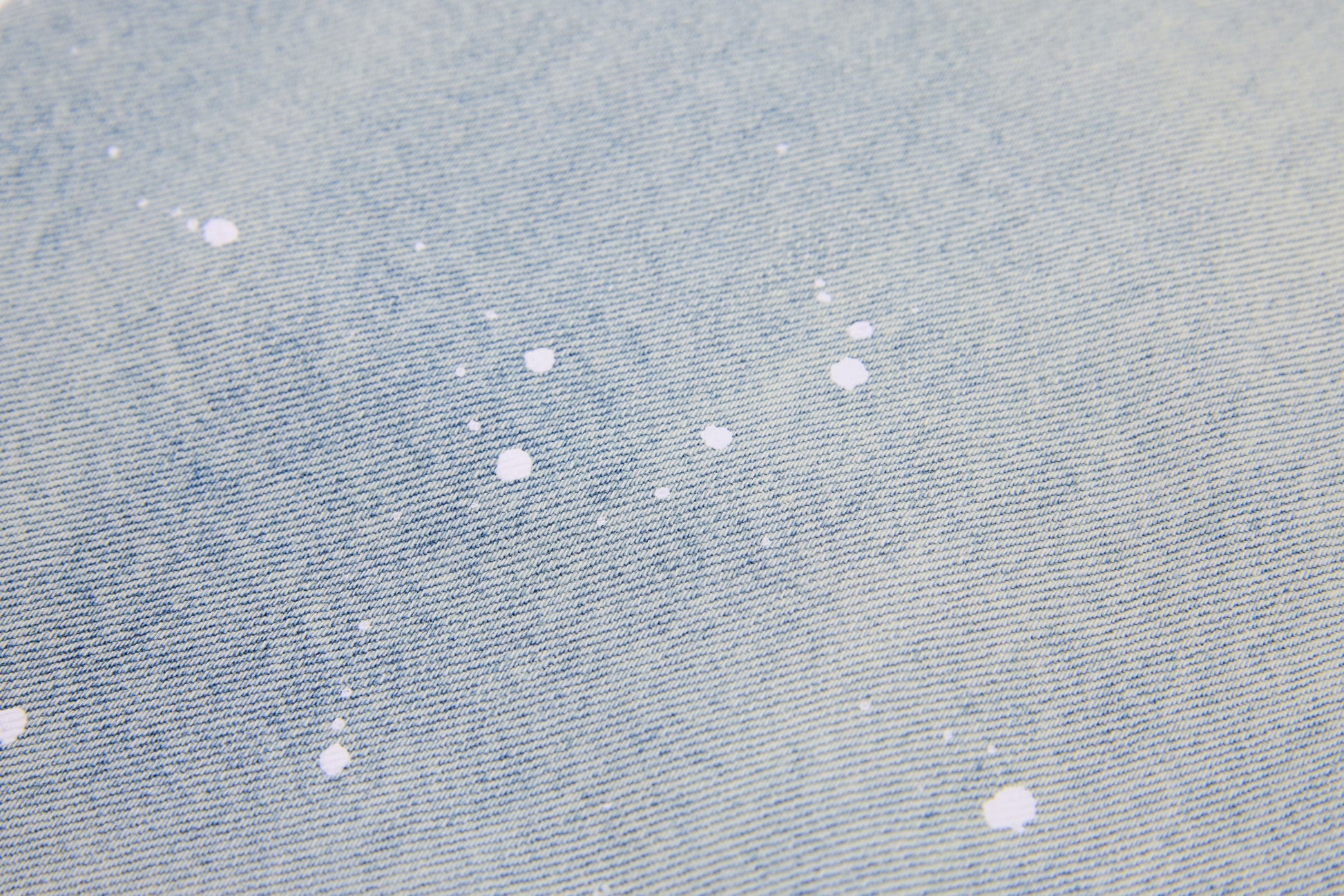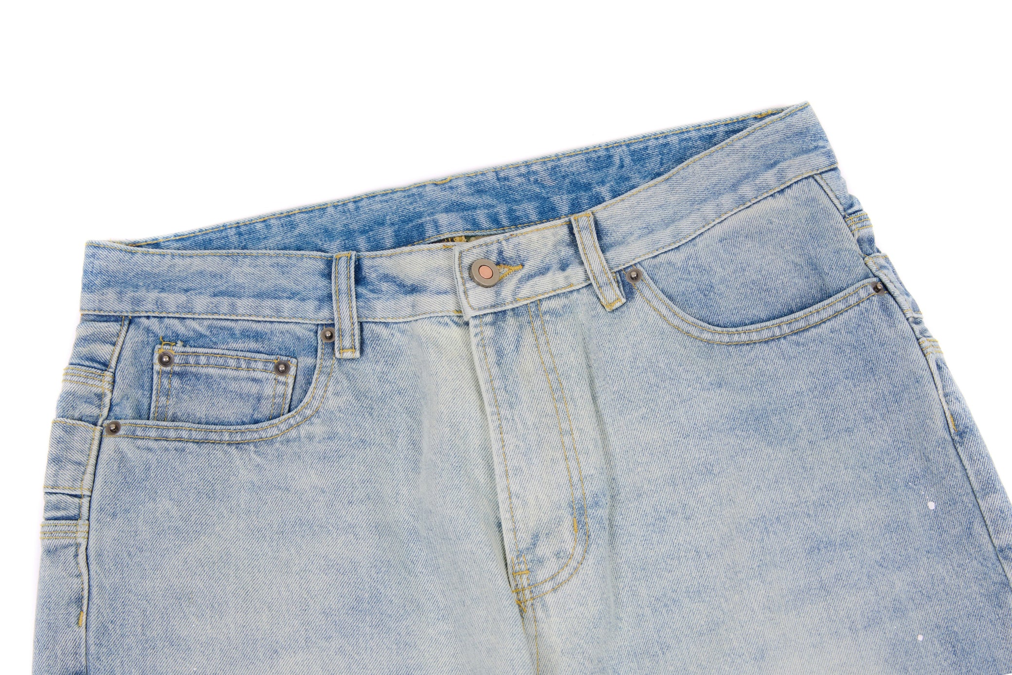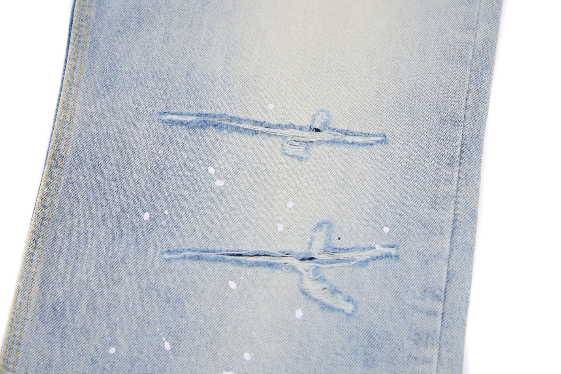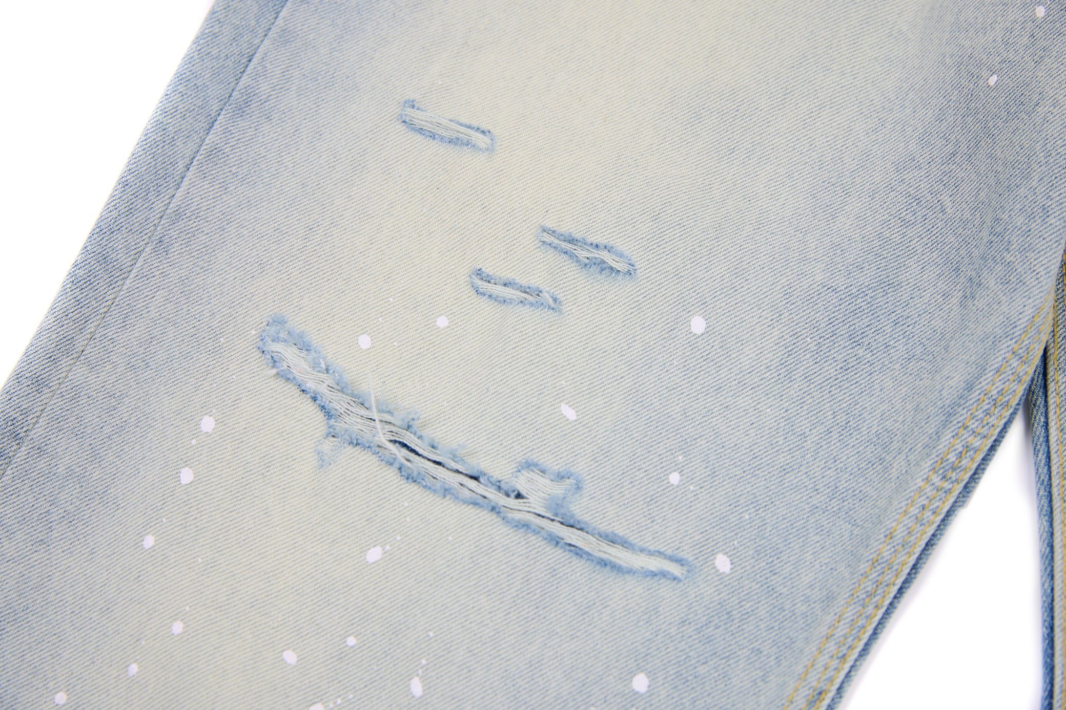 Details: Dual-tone pocket design, hand-applied paint splatter, faded light-wash finish, raw hem, classic 5-pocket construction