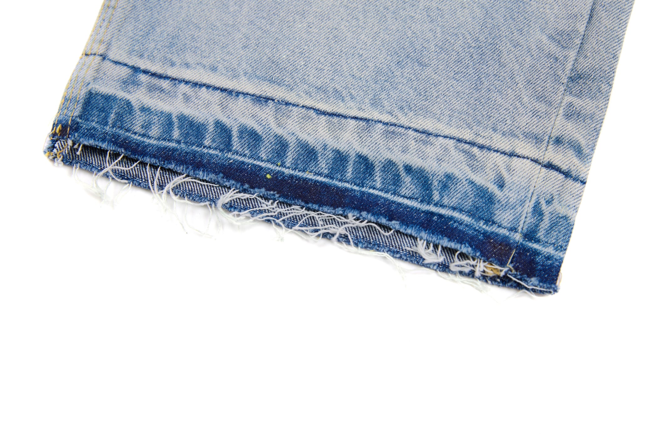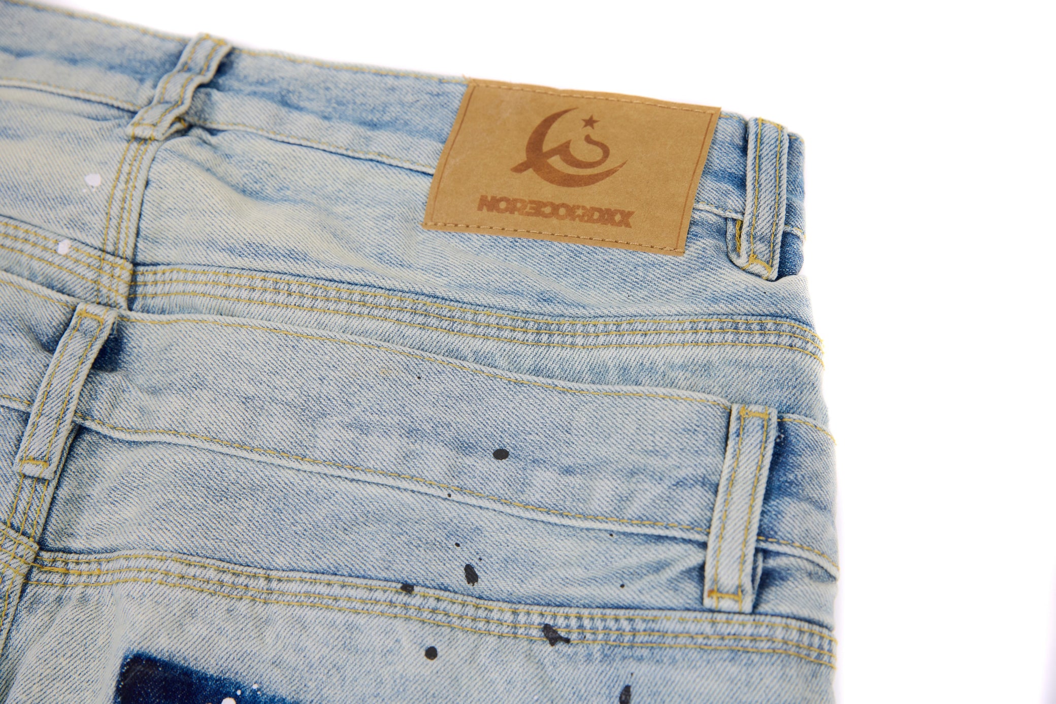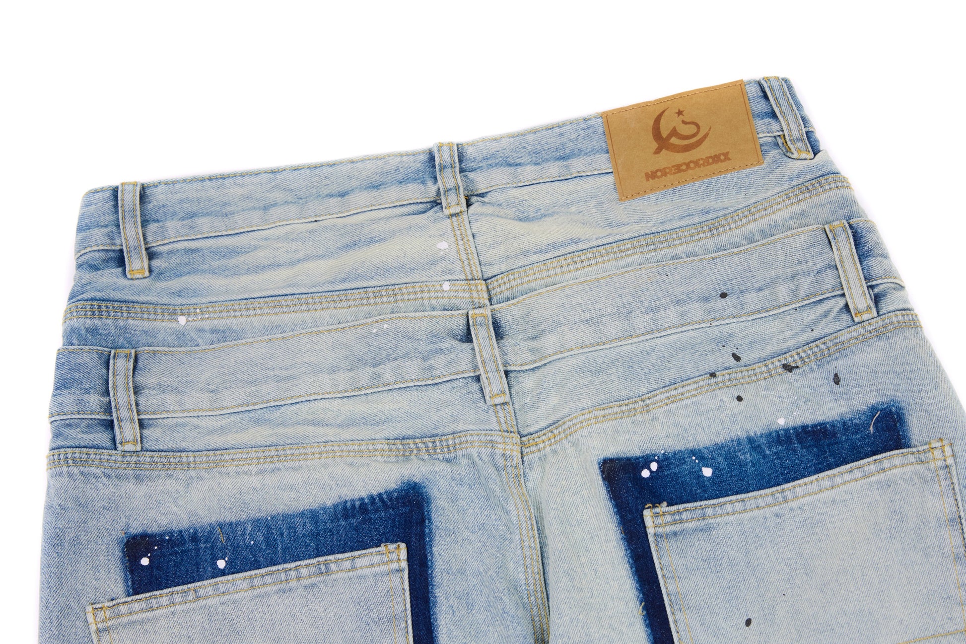 The Omirad Dual-Tone Paint-Splatter Denim takes classic light-wash jeans and flips them into a full street statement. The back hits different — bold dark-denim pocket panels, hand-done paint splatter, and a sun-faded wash that looks naturally worn-in, never artificial. Cut from 100% cotton denim, they keep that rigid, heavyweight street silhouette while still breaking in perfectly with every wear. A raw, distressed hem finishes the look with real edge.