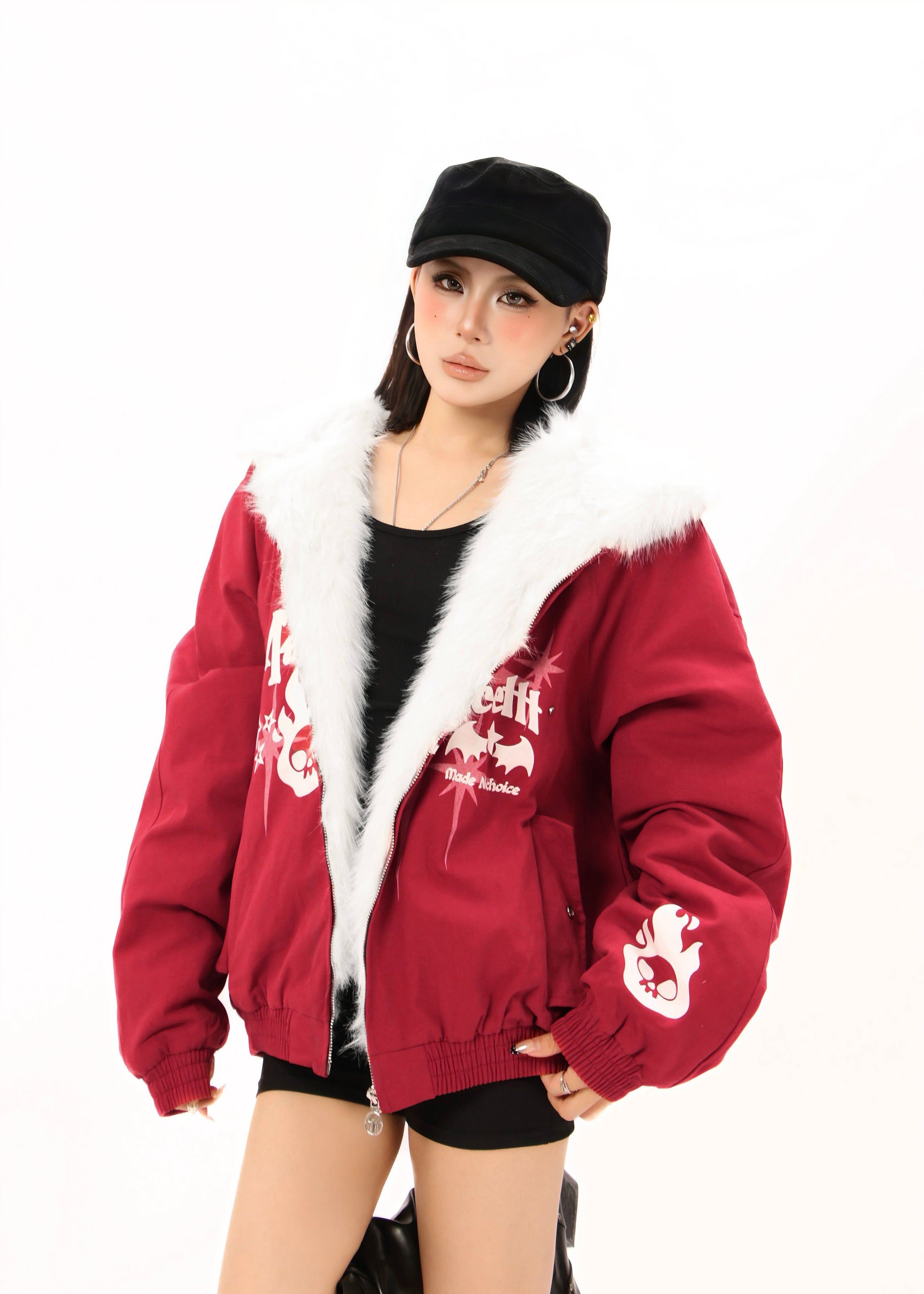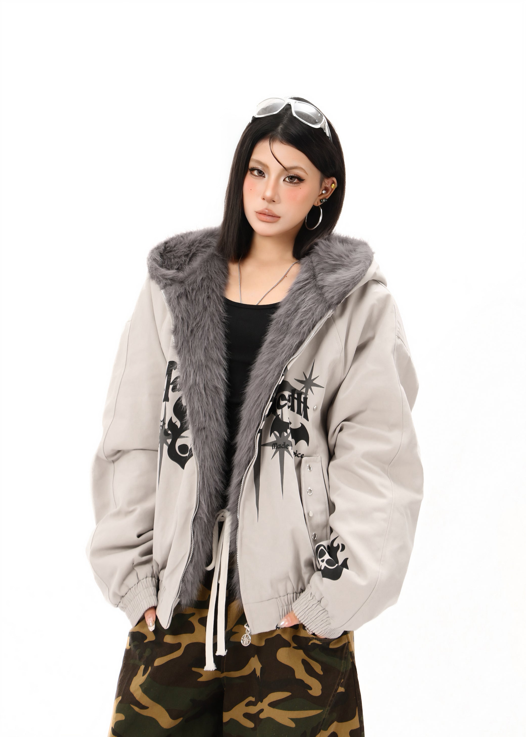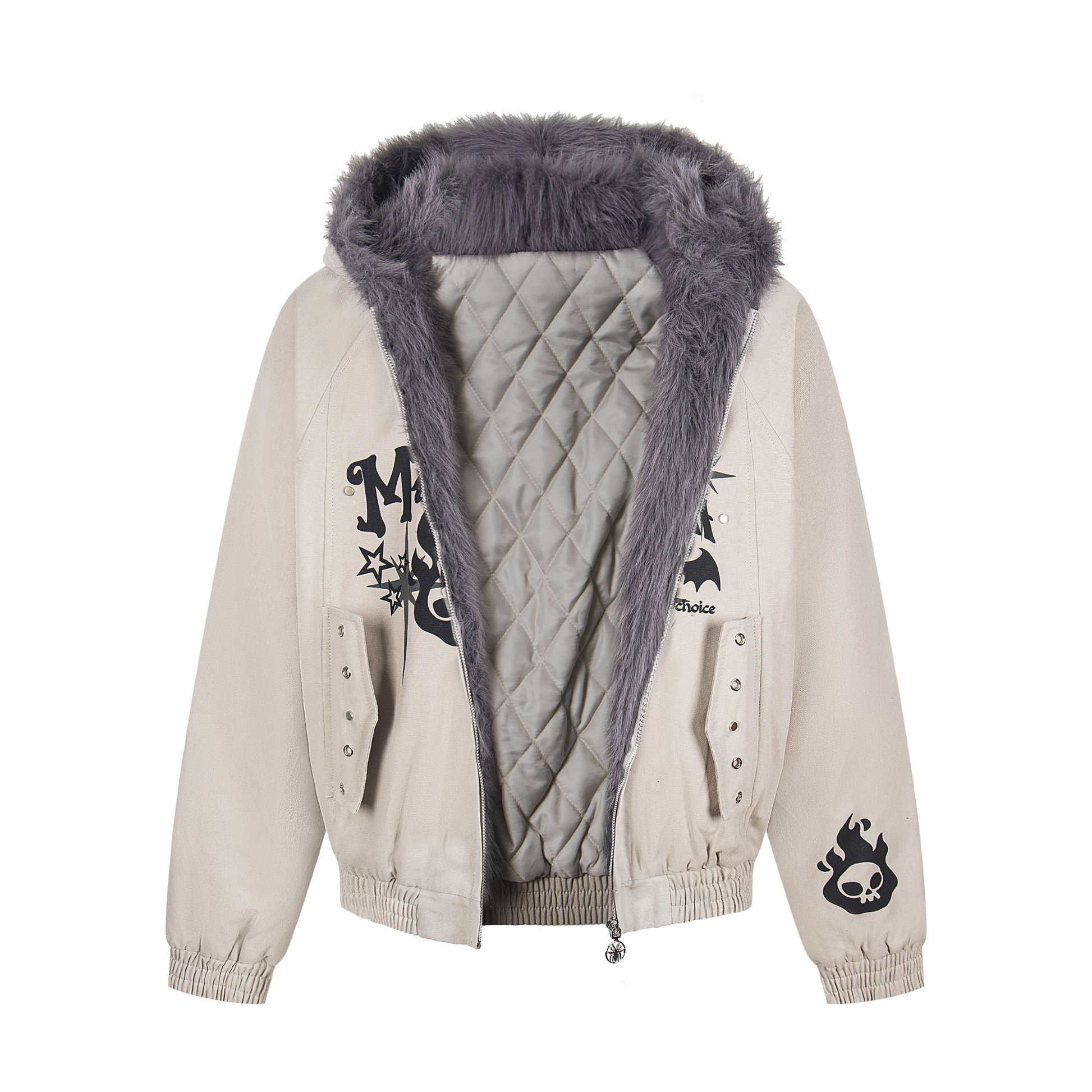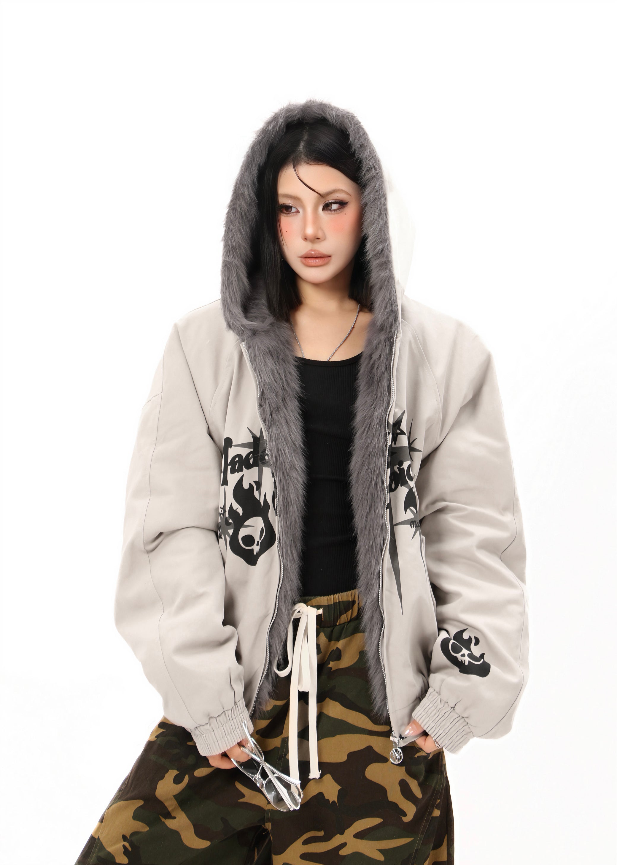 The Omirad Faux Fur Collar Quilted Jacket combines warmth and attitude in one standout streetwear piece. Crafted from 100% cotton with a thick quilted lining, it features a detachable faux fur collar and bold front graphics for a statement look. The cropped bomber silhouette and stud detailing on the pockets add a rebellious edge, while the dual color options let you switch up your winter aesthetic. Designed for those who bring street energy to cold-weather fits.