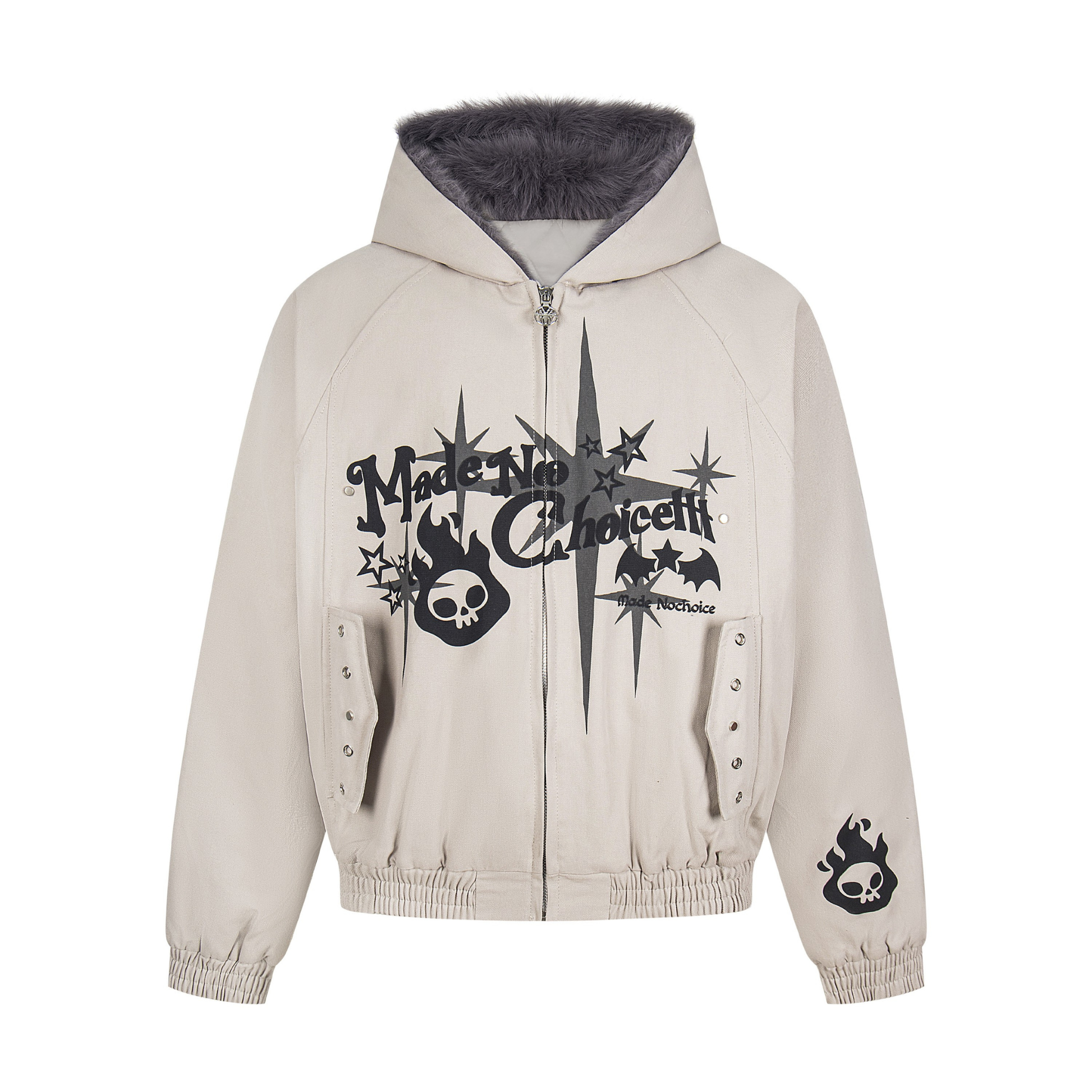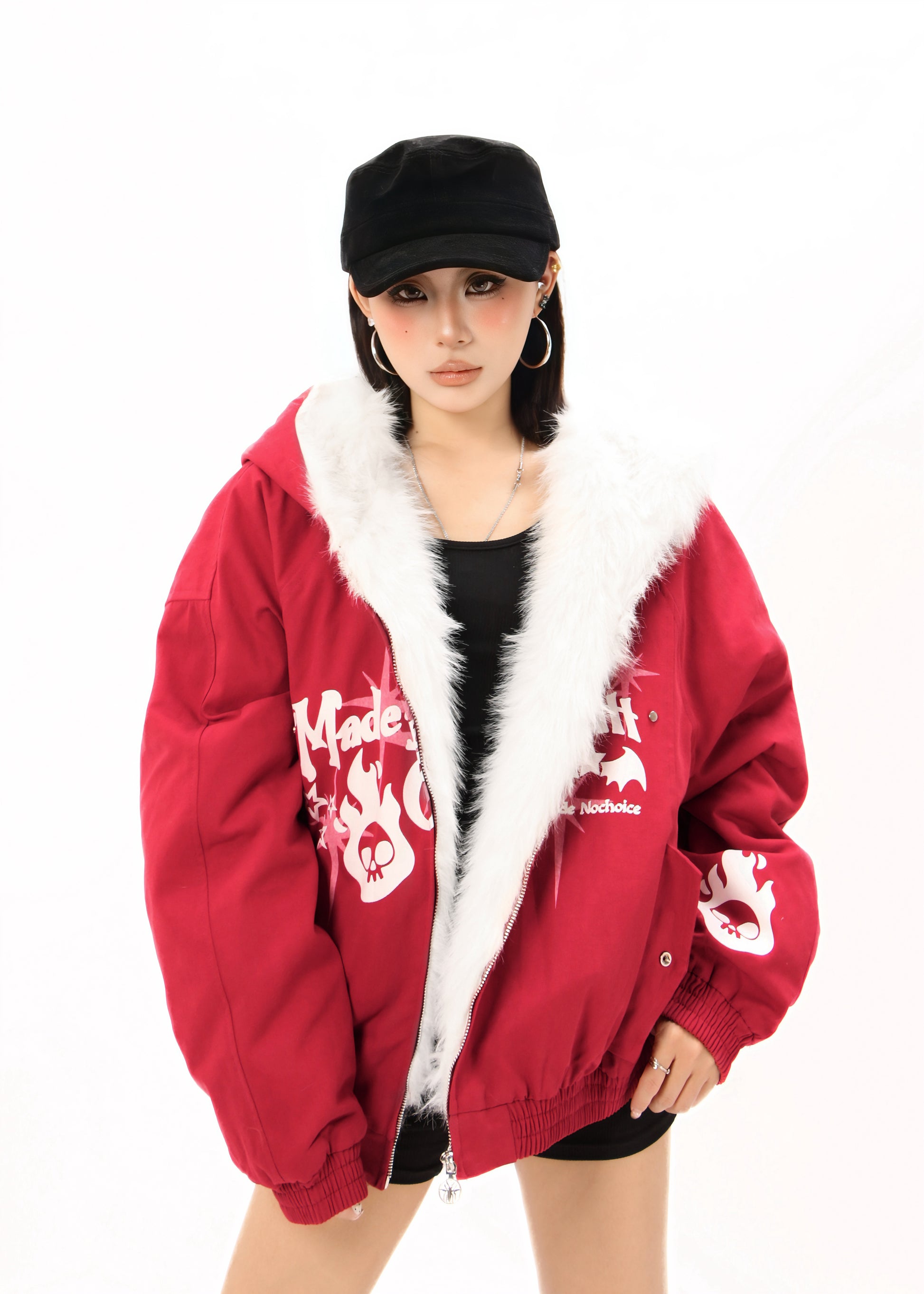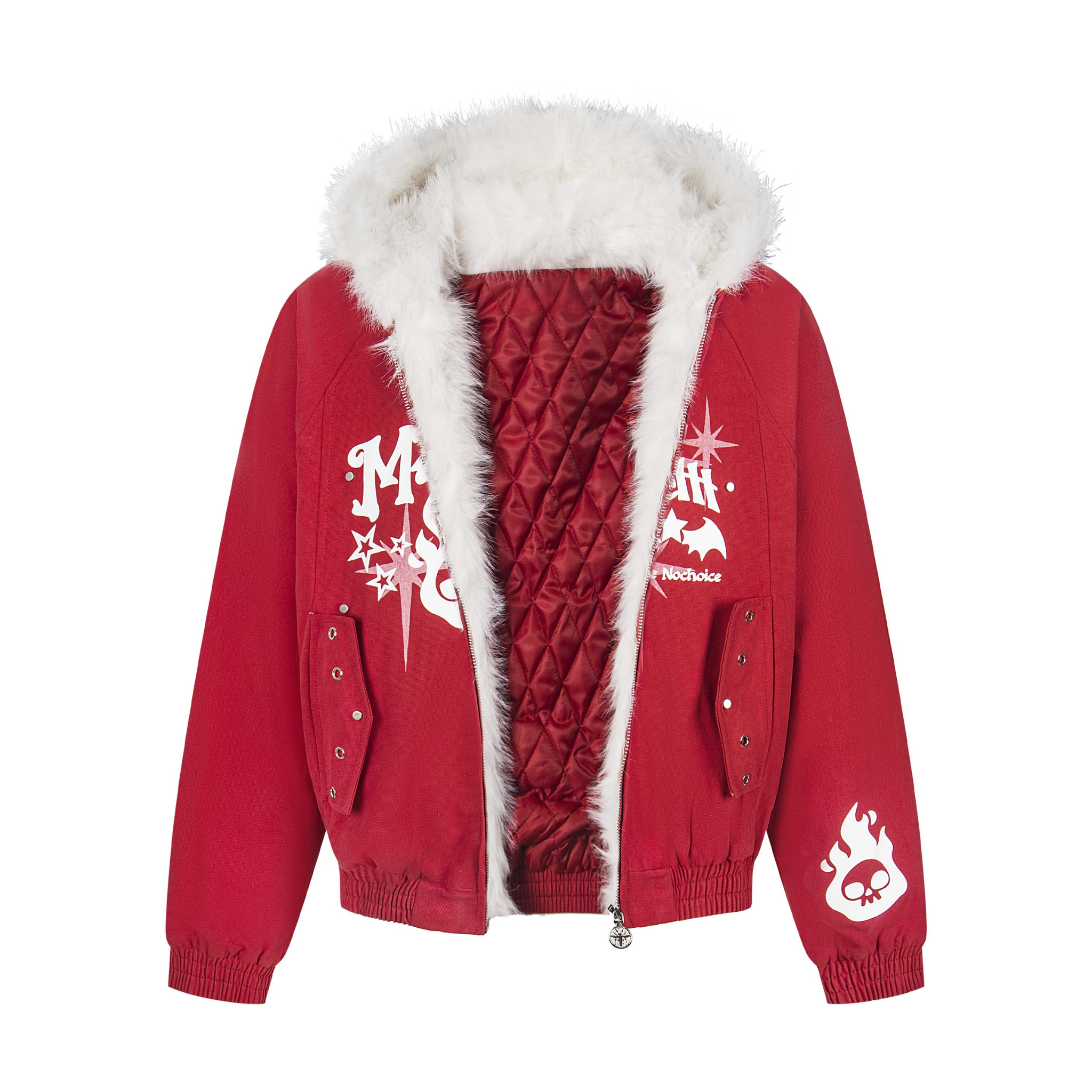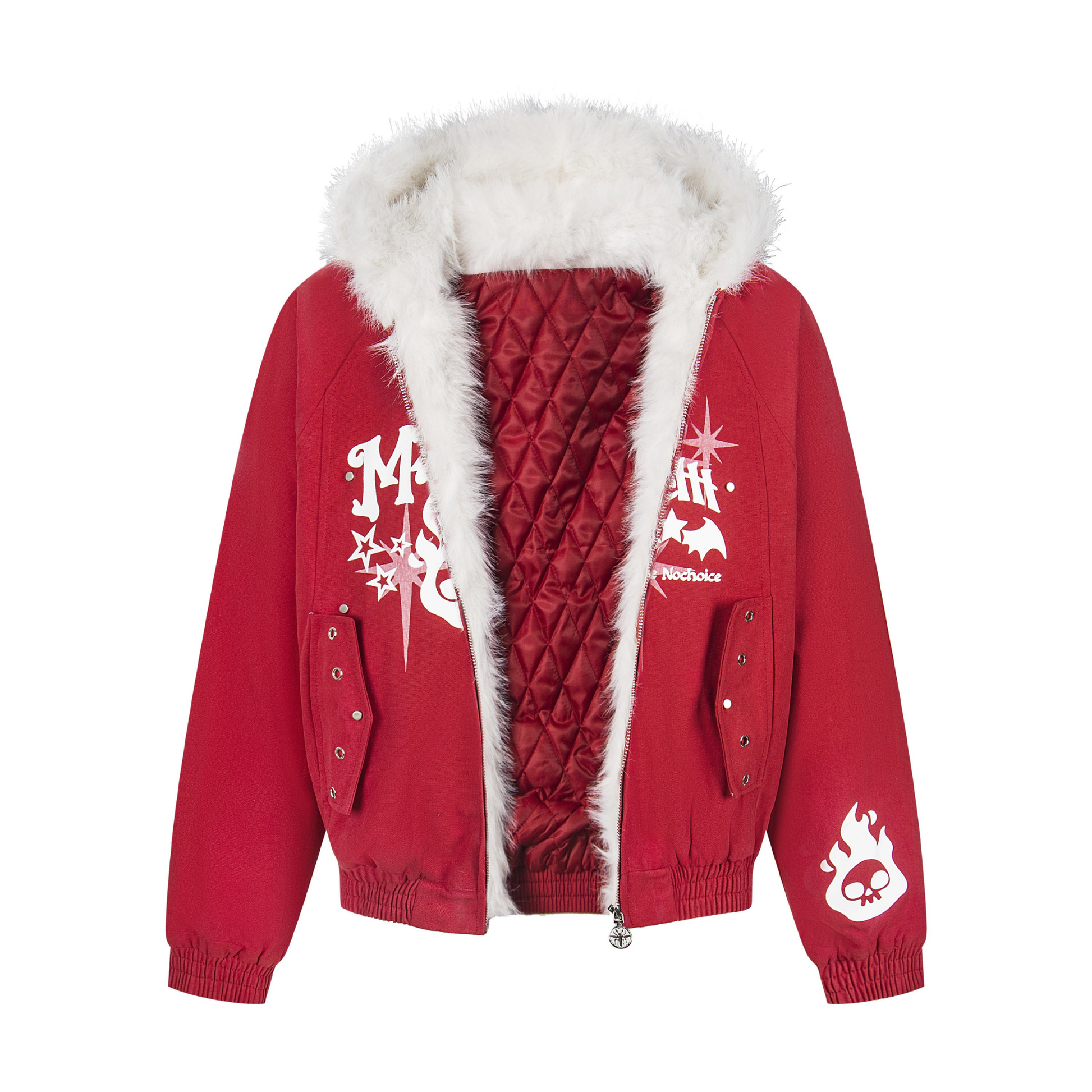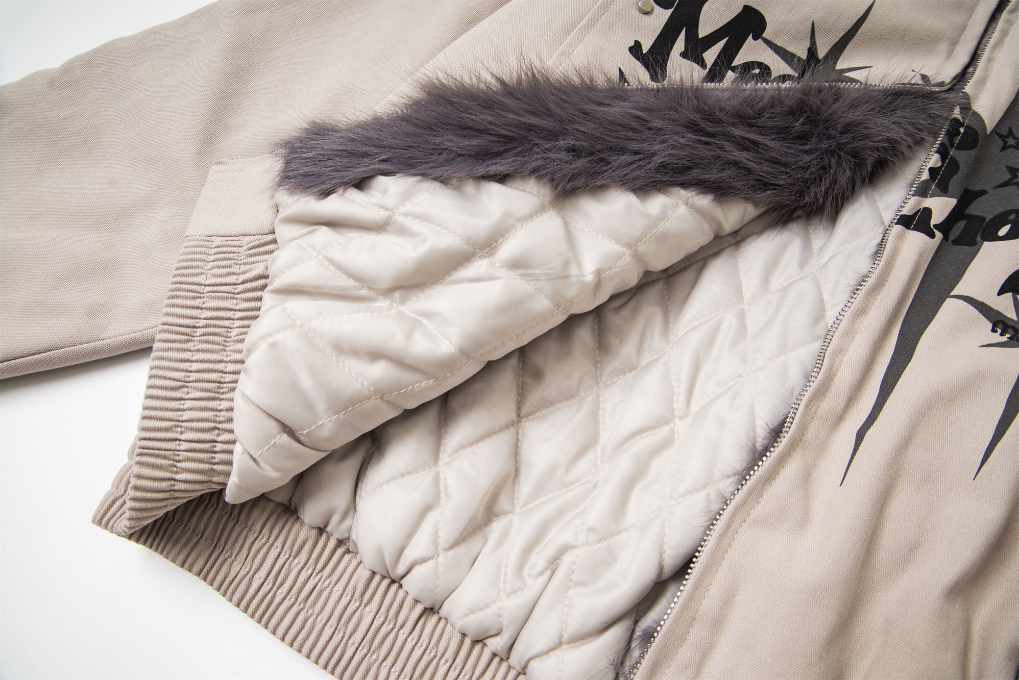 The Omirad Faux Fur Collar Quilted Jacket combines warmth and attitude in one standout streetwear piece. Crafted from 100% cotton with a thick quilted lining, it features a detachable faux fur collar and bold front graphics for a statement look. The cropped bomber silhouette and stud detailing on the pockets add a rebellious edge, while the dual color options let you switch up your winter aesthetic. Designed for those who bring street energy to cold-weather fits.