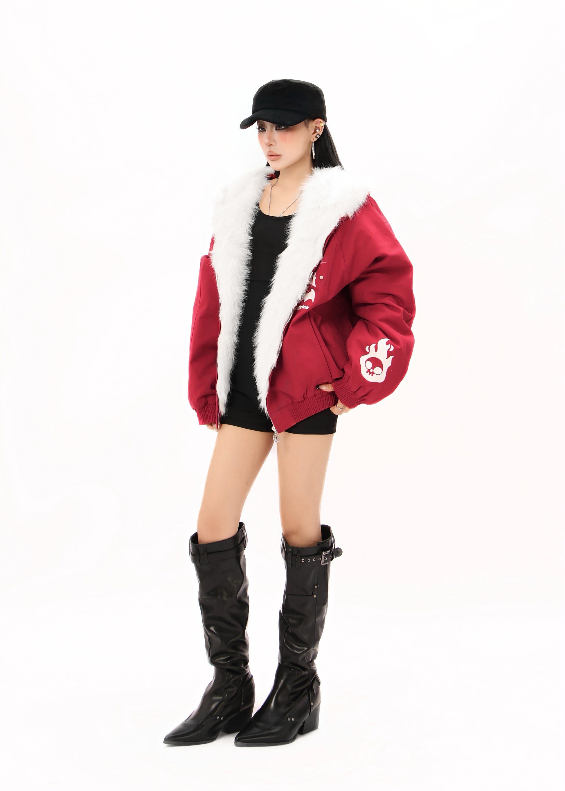 Clothing details: Faux fur collar, quilted lining, front graphic print, stud accents, cropped bomber fit