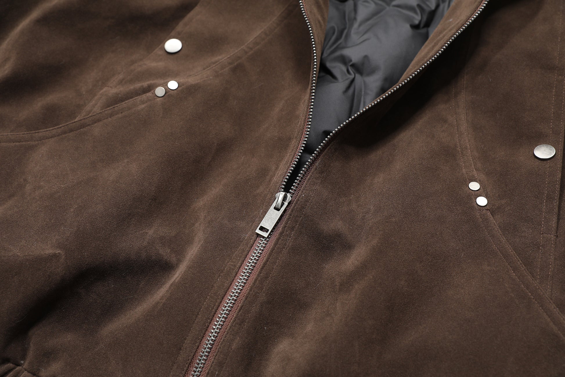 Clothing details: Soft faux-fur collar, full-zip front closure, clean panel construction, side welt pockets with metal snap accents, elasticated cuffs and hem, lightly padded build for warmth, relaxed bomber fit, available in multiple colorways.