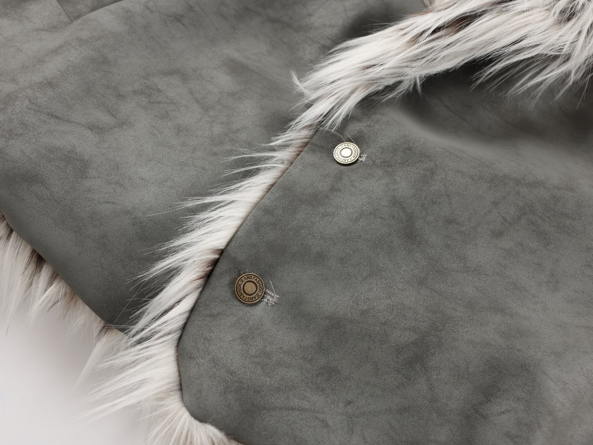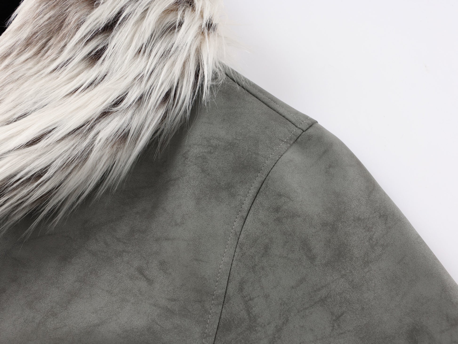 Clothing Details: Oversized faux-fur collar, suede-texture shell, insulated interior, drop-shoulder cut, metal button closure