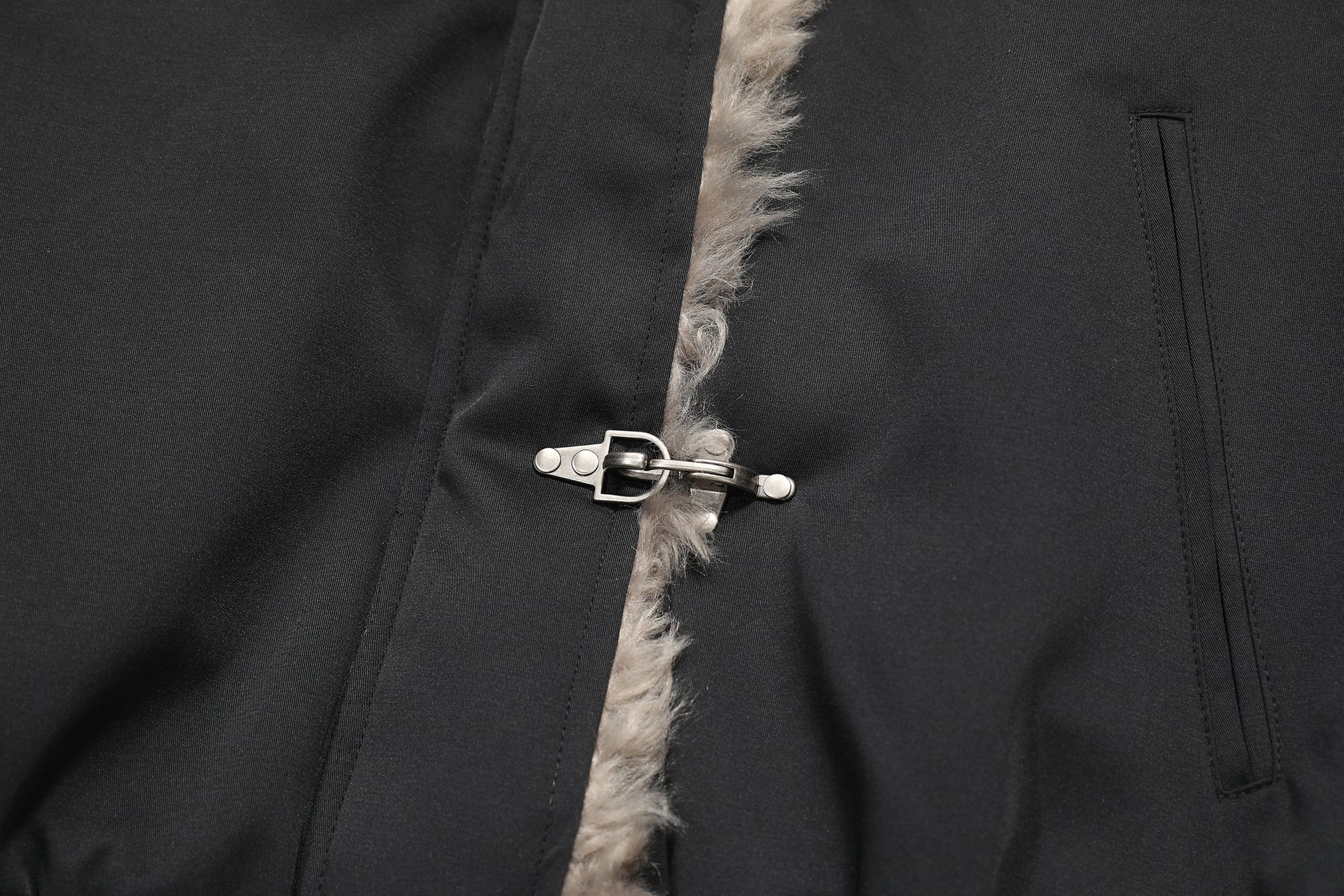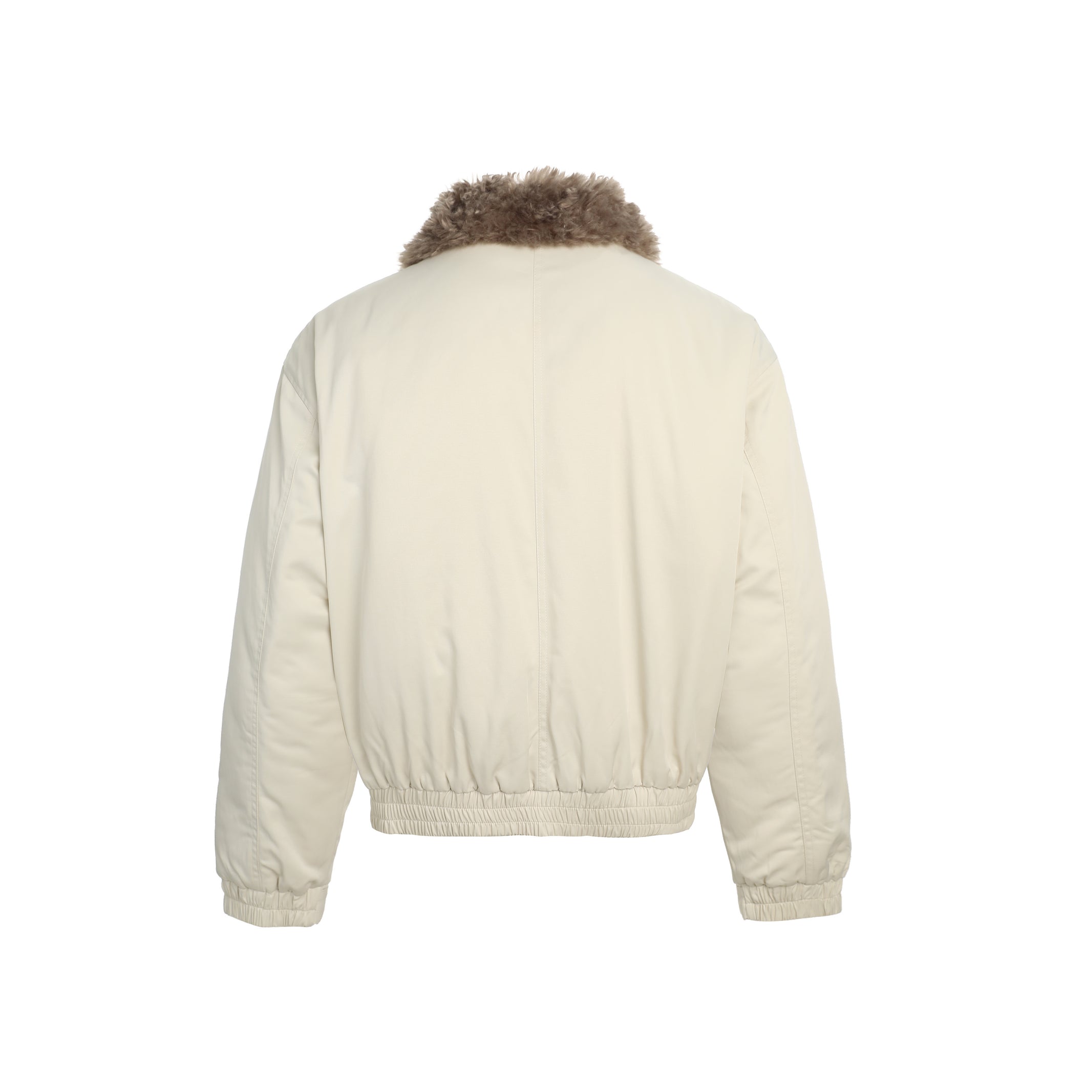 Clothing details: Faux-fur trimmed stand collar and front closure, metal hook front fastenings, padded insulated body, elastic ribbed hem and cuffs, side slip pockets, cropped bomber silhouette, heavy winter-ready construction.