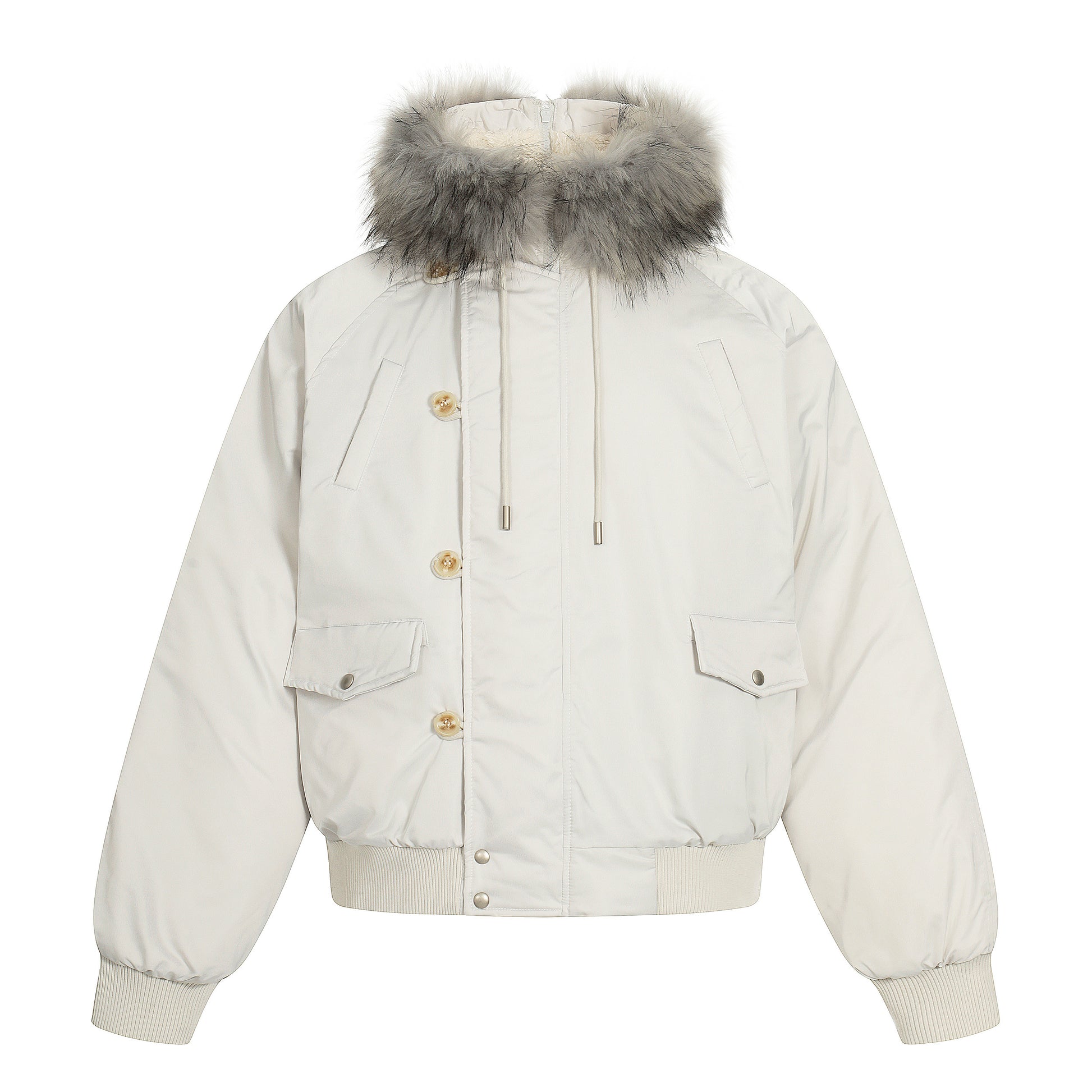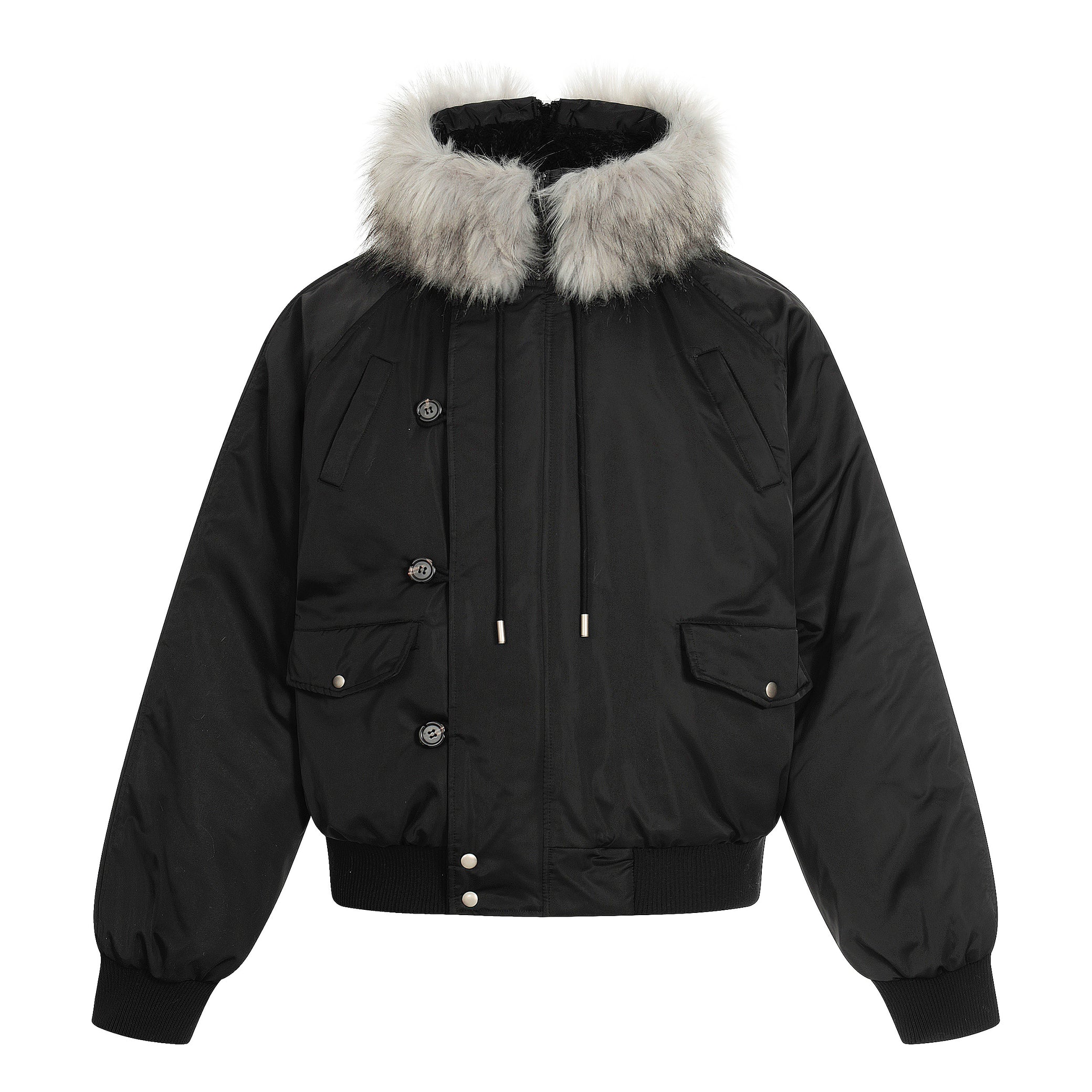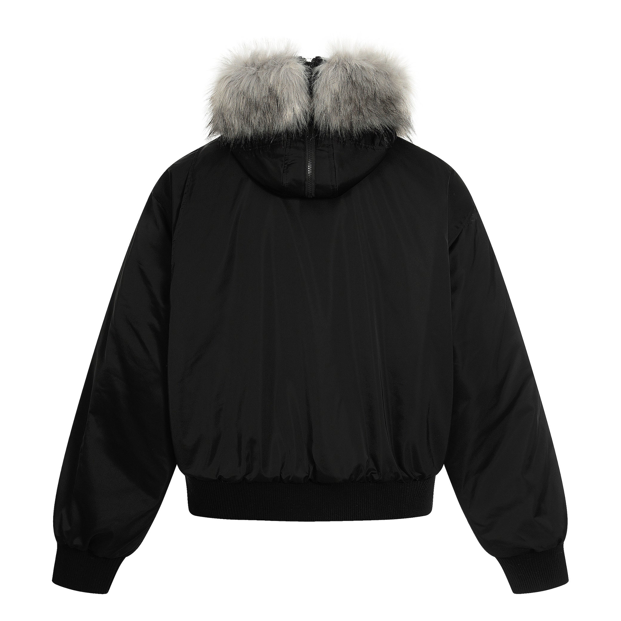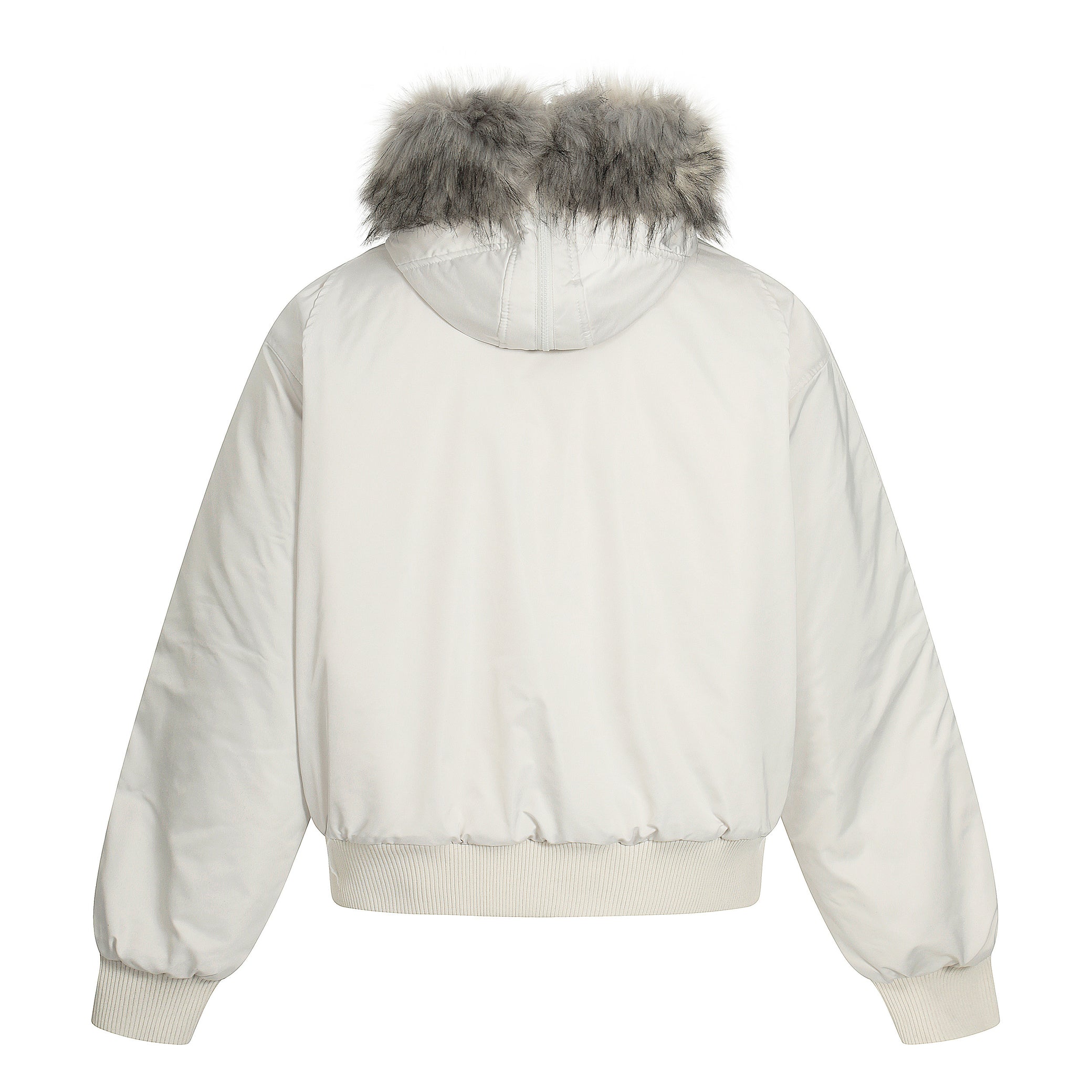 Clothing details: Detachable faux fur hood trim, padded bomber design, button and zipper front closure, ribbed cuffs and hem, cropped silhouette