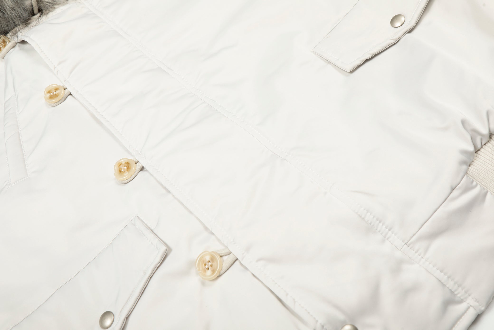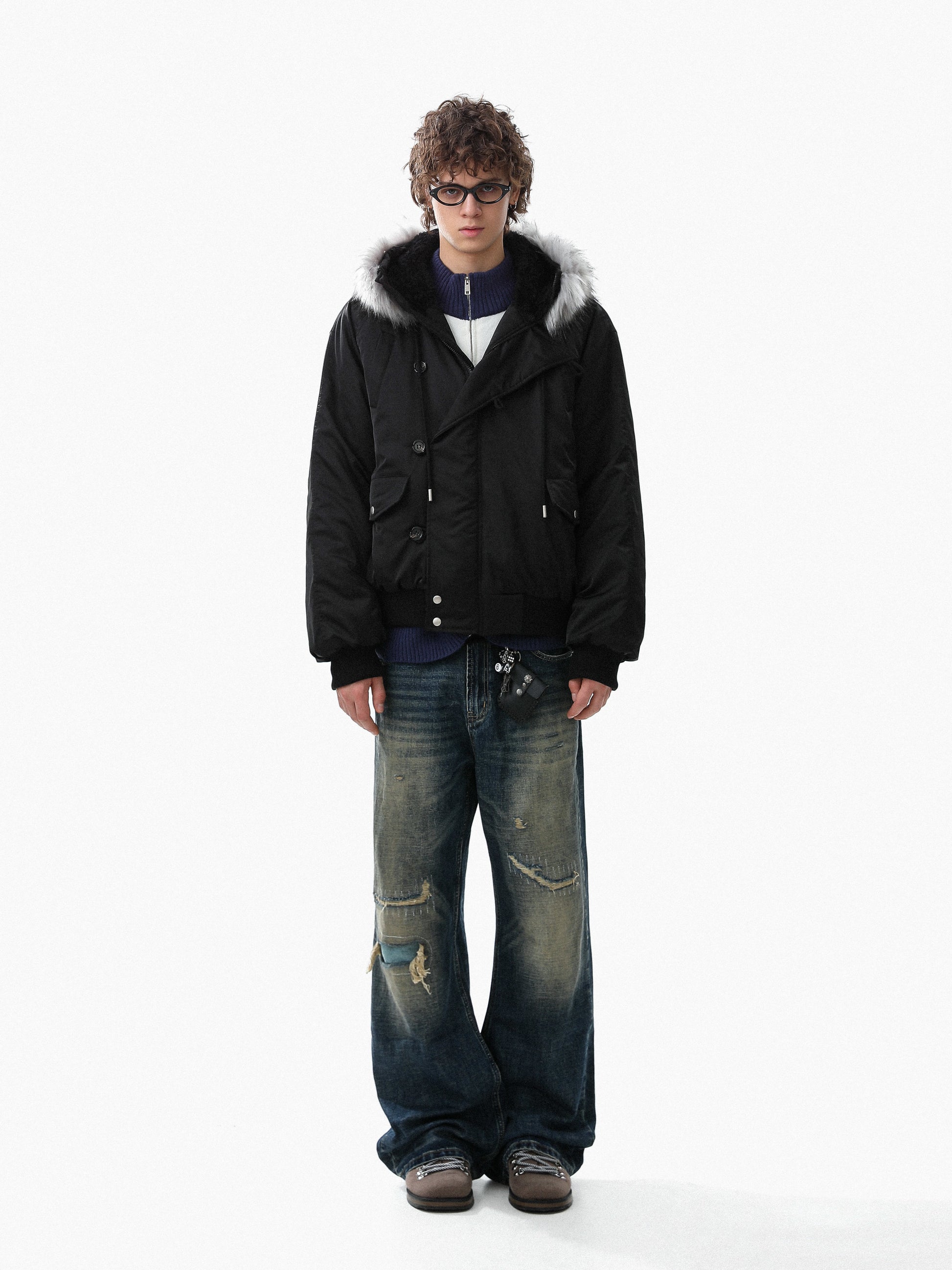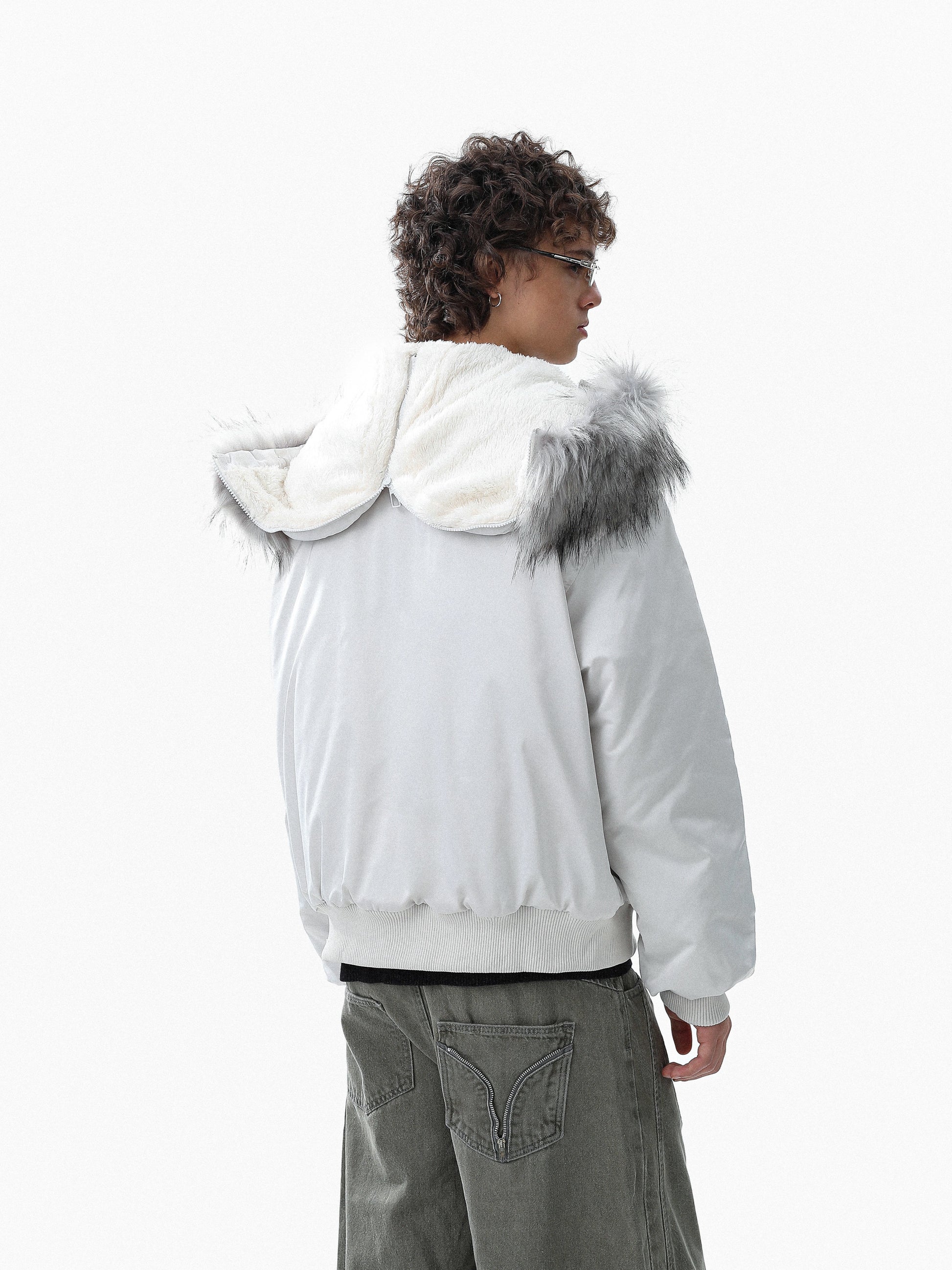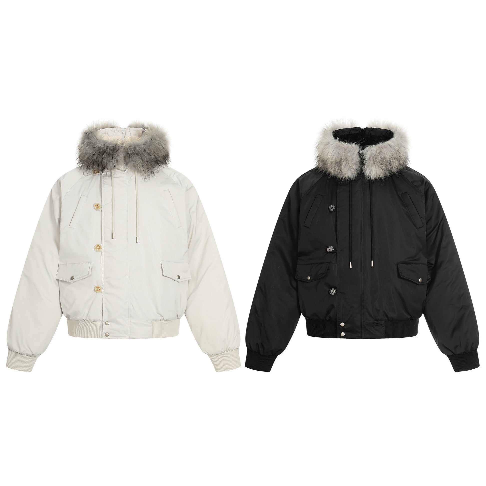 Clothing details: Detachable faux fur hood trim, padded bomber design, button and zipper front closure, ribbed cuffs and hem, cropped silhouette