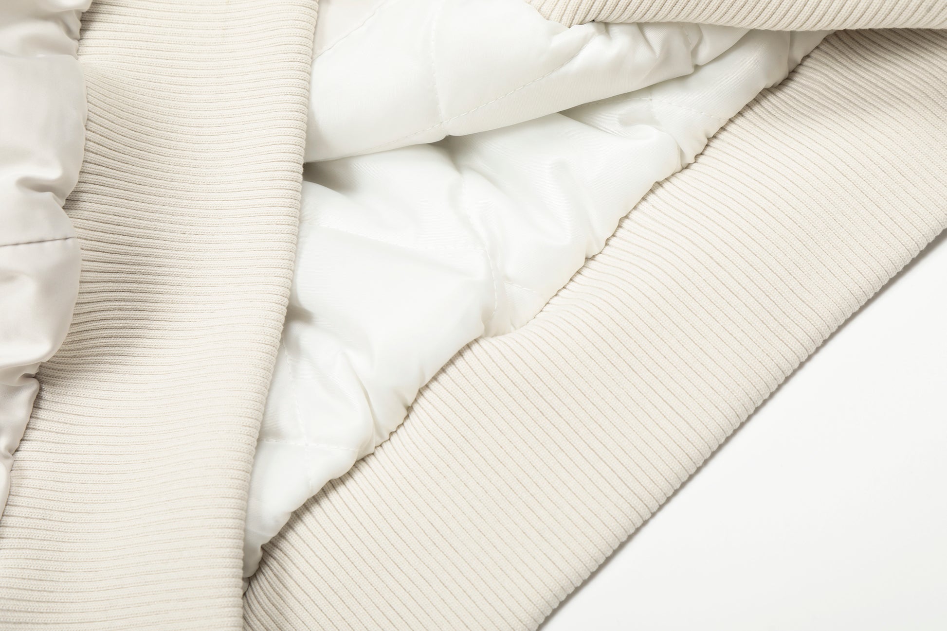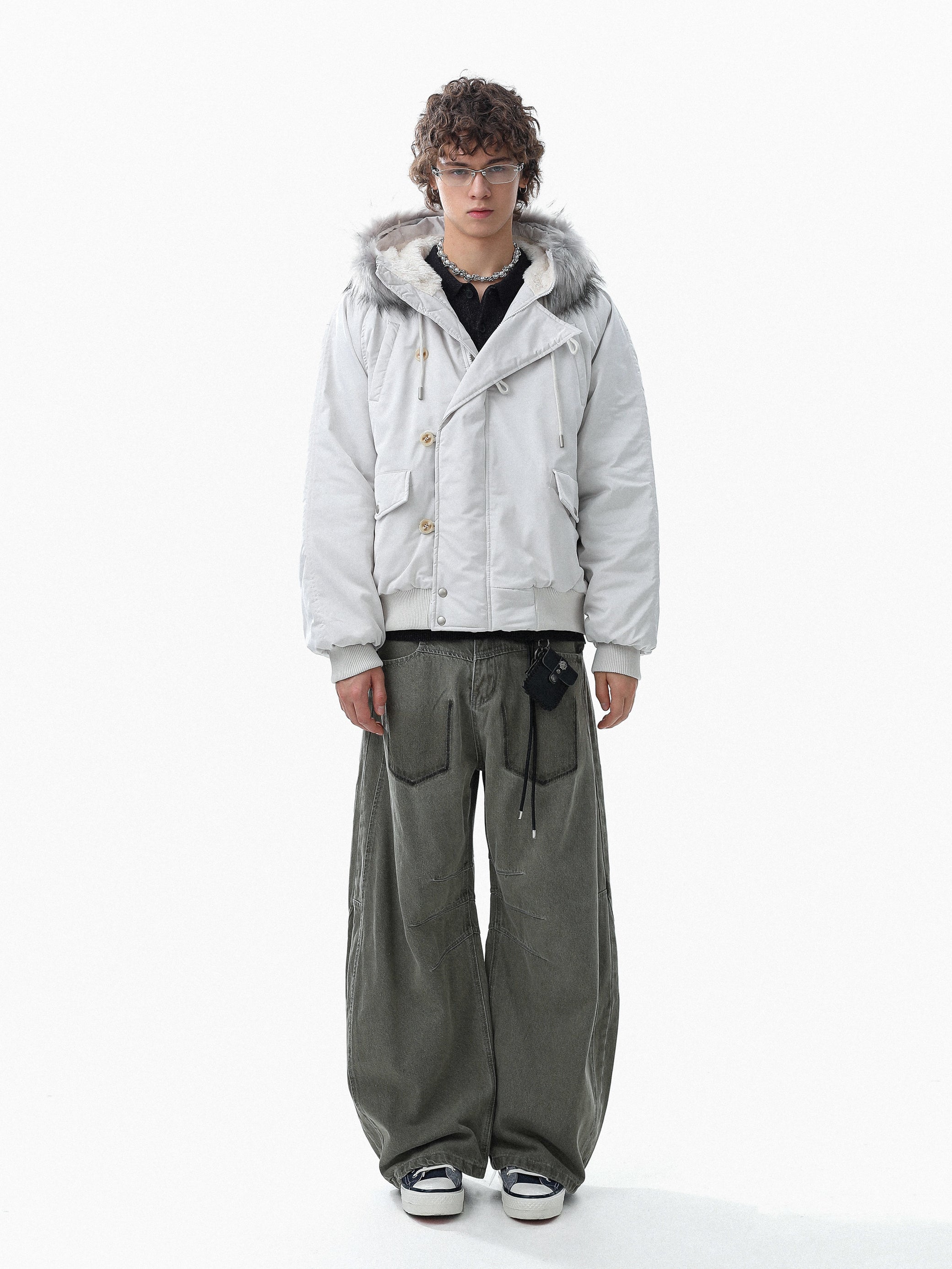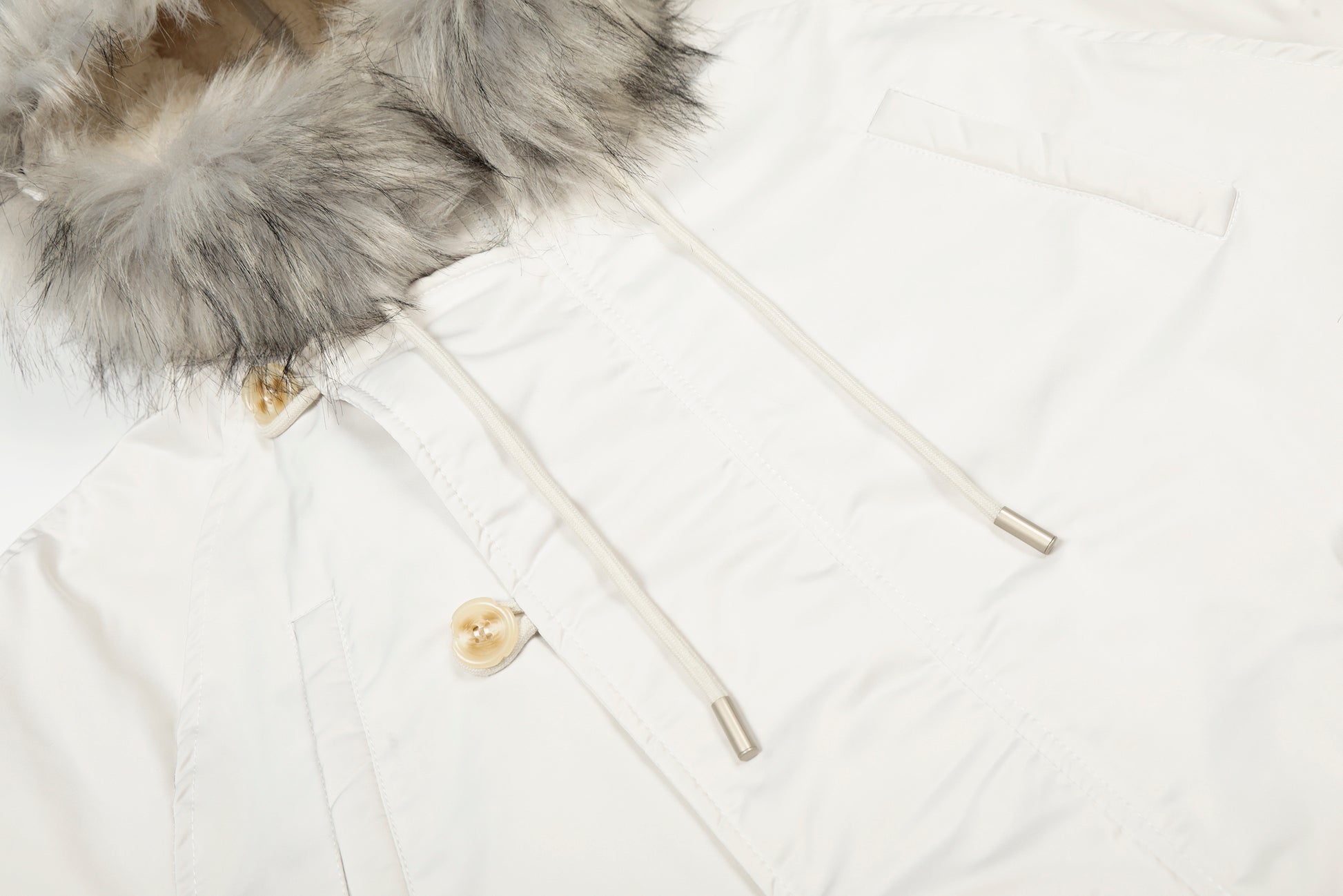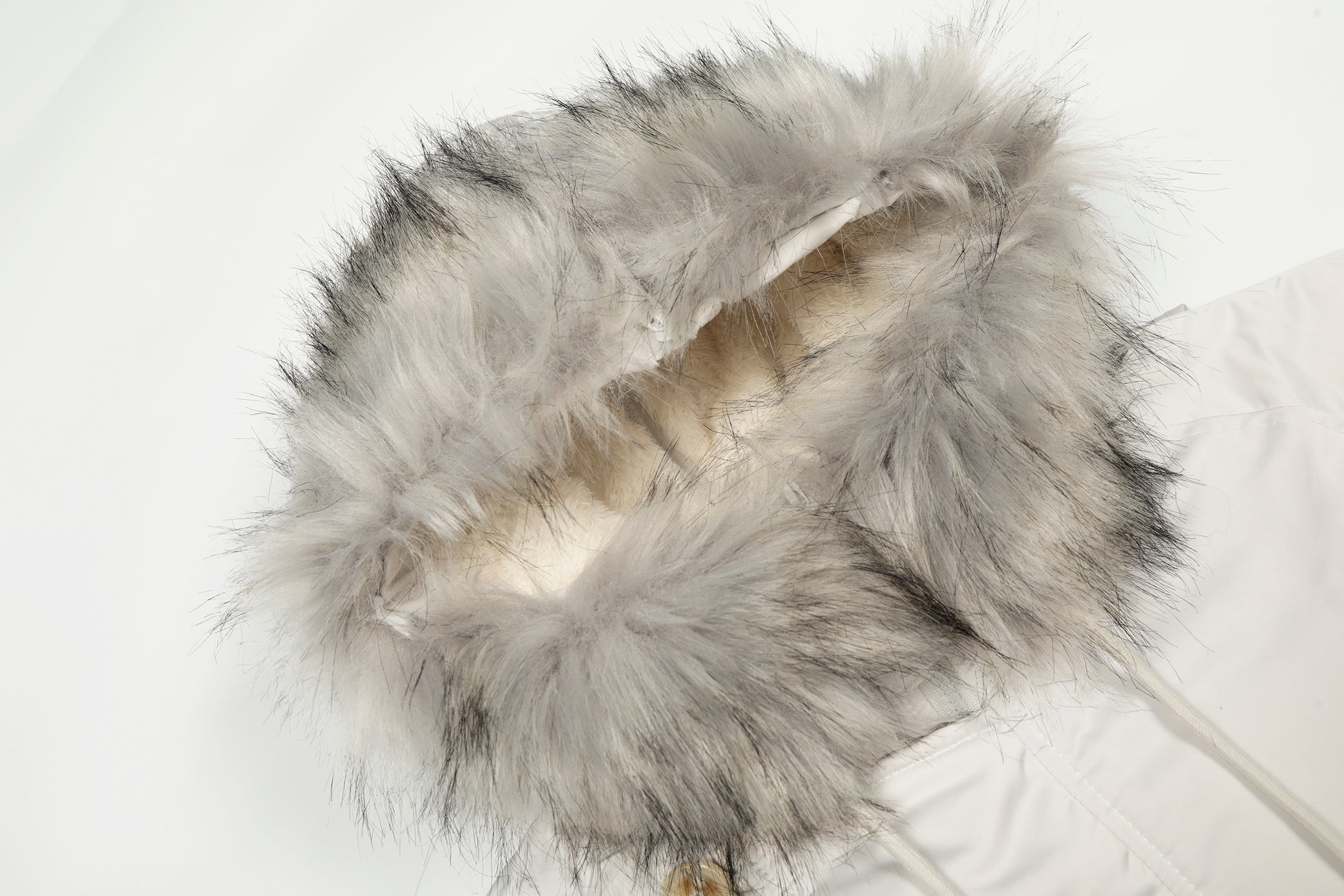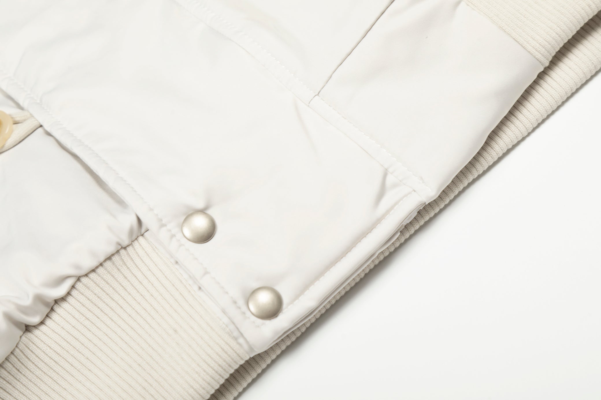 Clothing details: Detachable faux fur hood trim, padded bomber design, button and zipper front closure, ribbed cuffs and hem, cropped silhouette