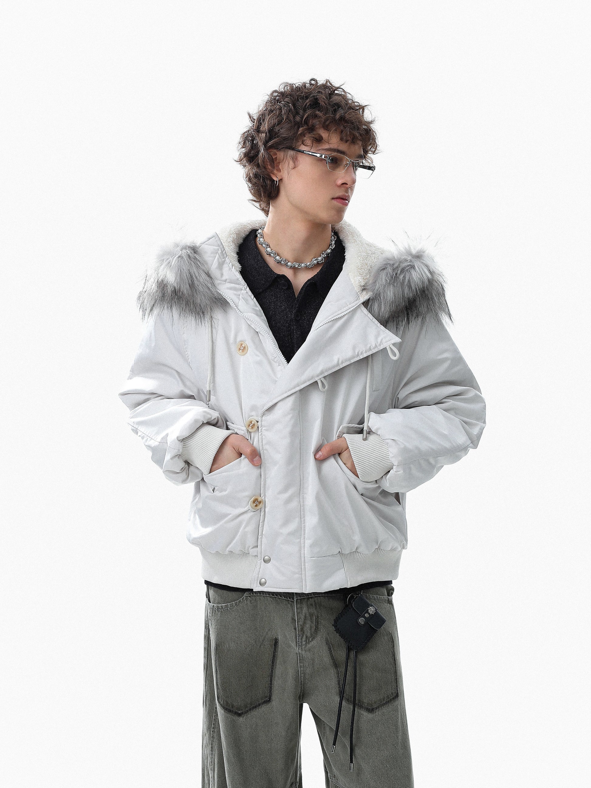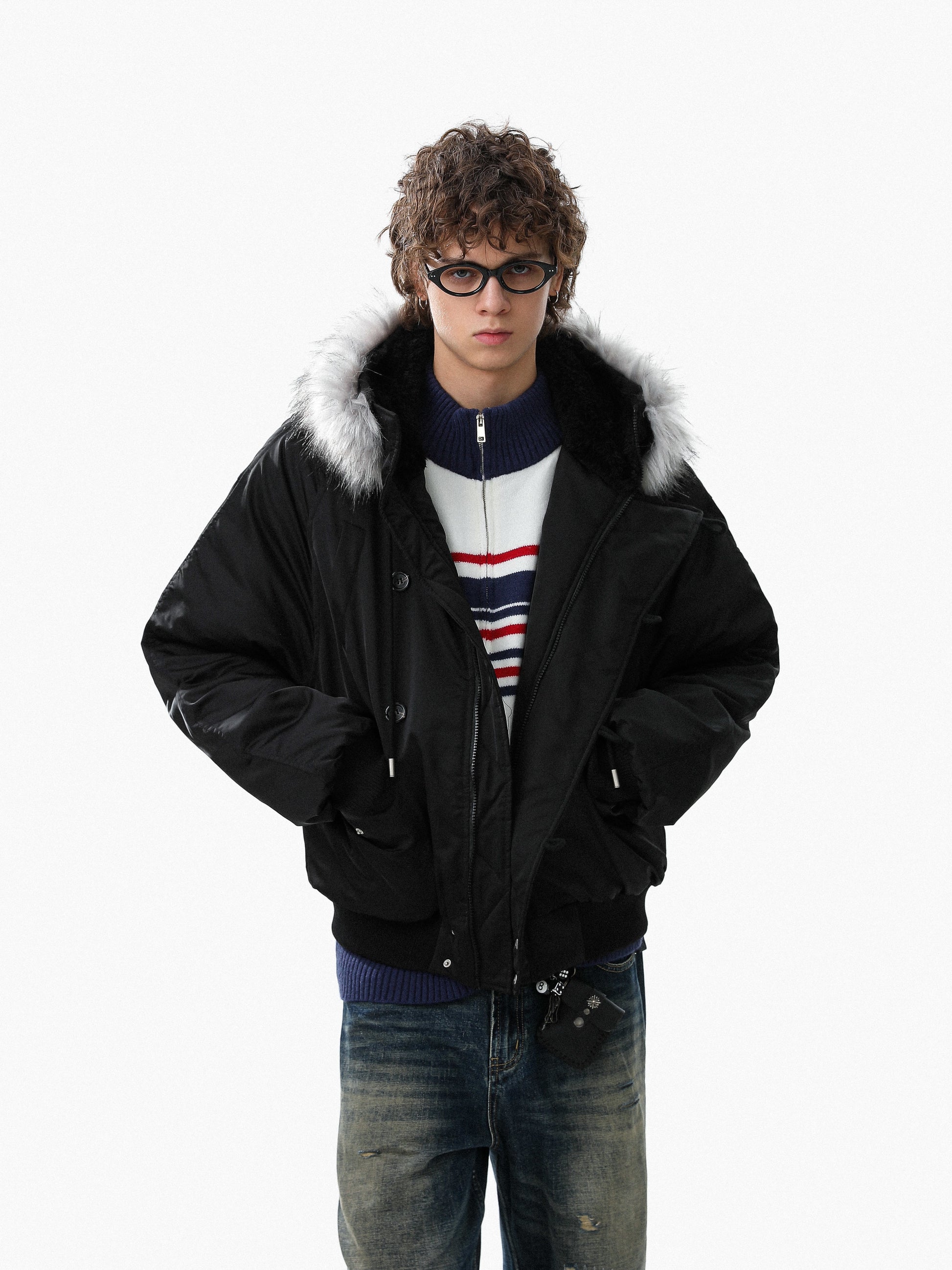 The Omirad Faux Fur Trim Padded Bomber Jacket blends street-ready functionality with elevated winter style. Crafted from 100% polyester with a sleek matte finish, it features a detachable faux fur hood trim for customizable warmth. The cropped silhouette, ribbed cuffs, and structured pockets add both comfort and attitude—perfect for layering through cold urban days.