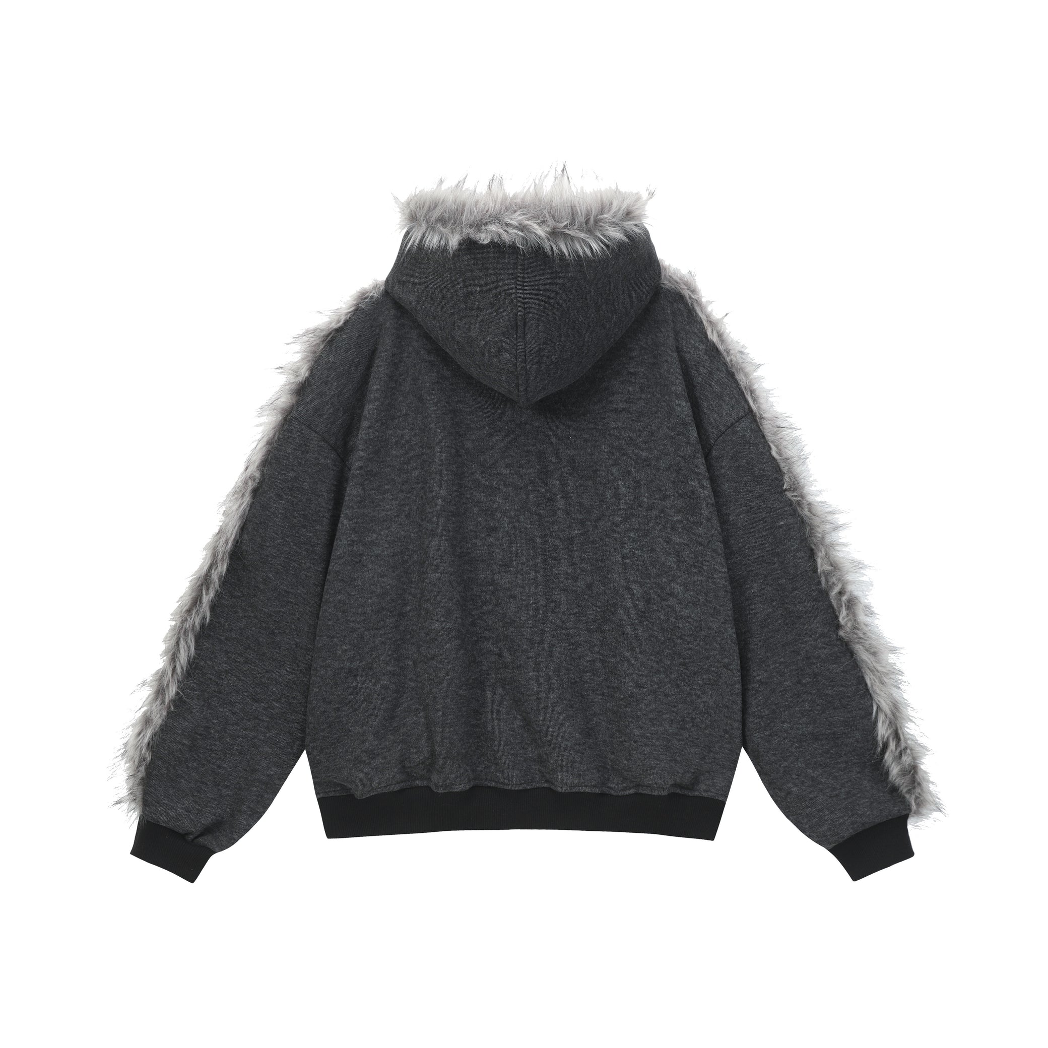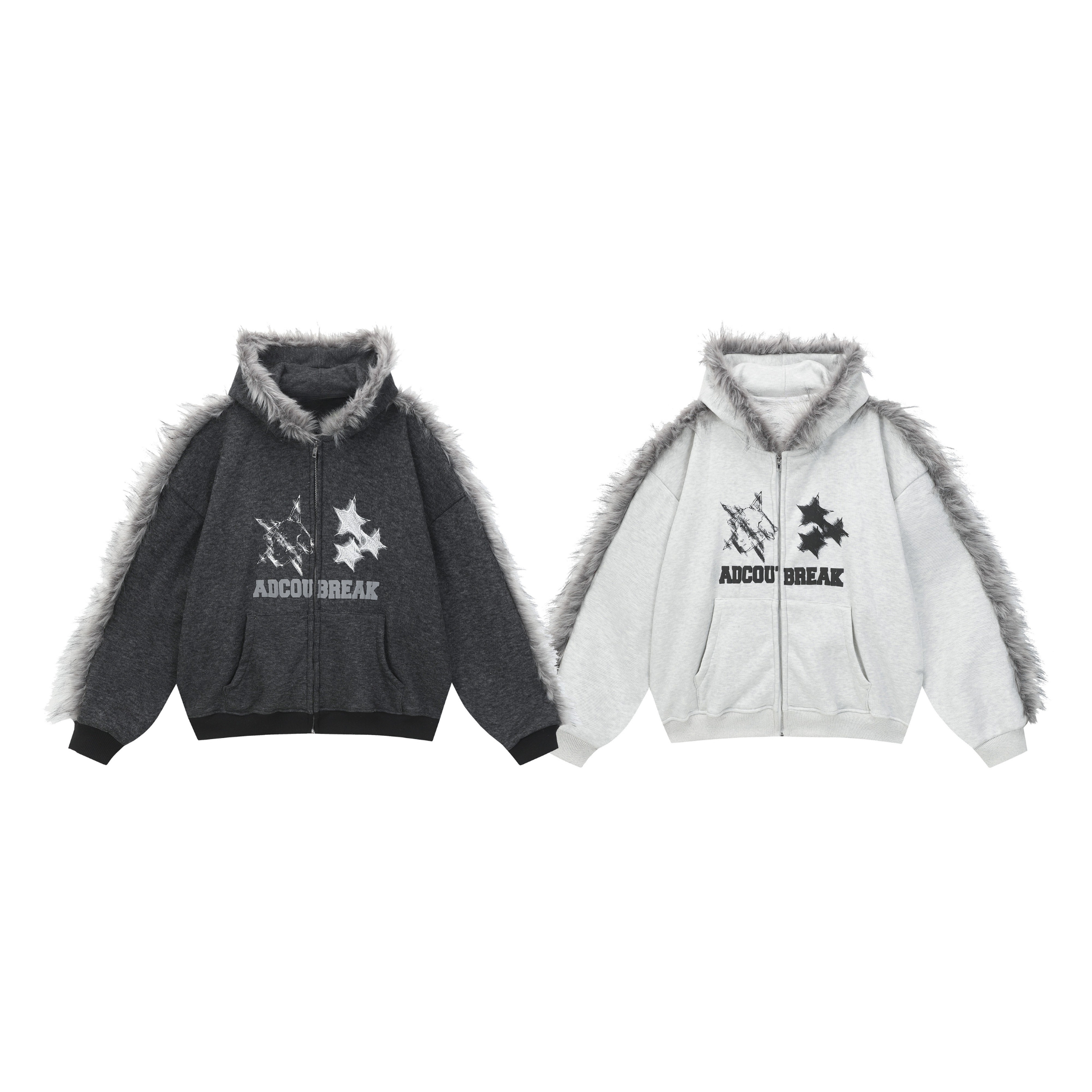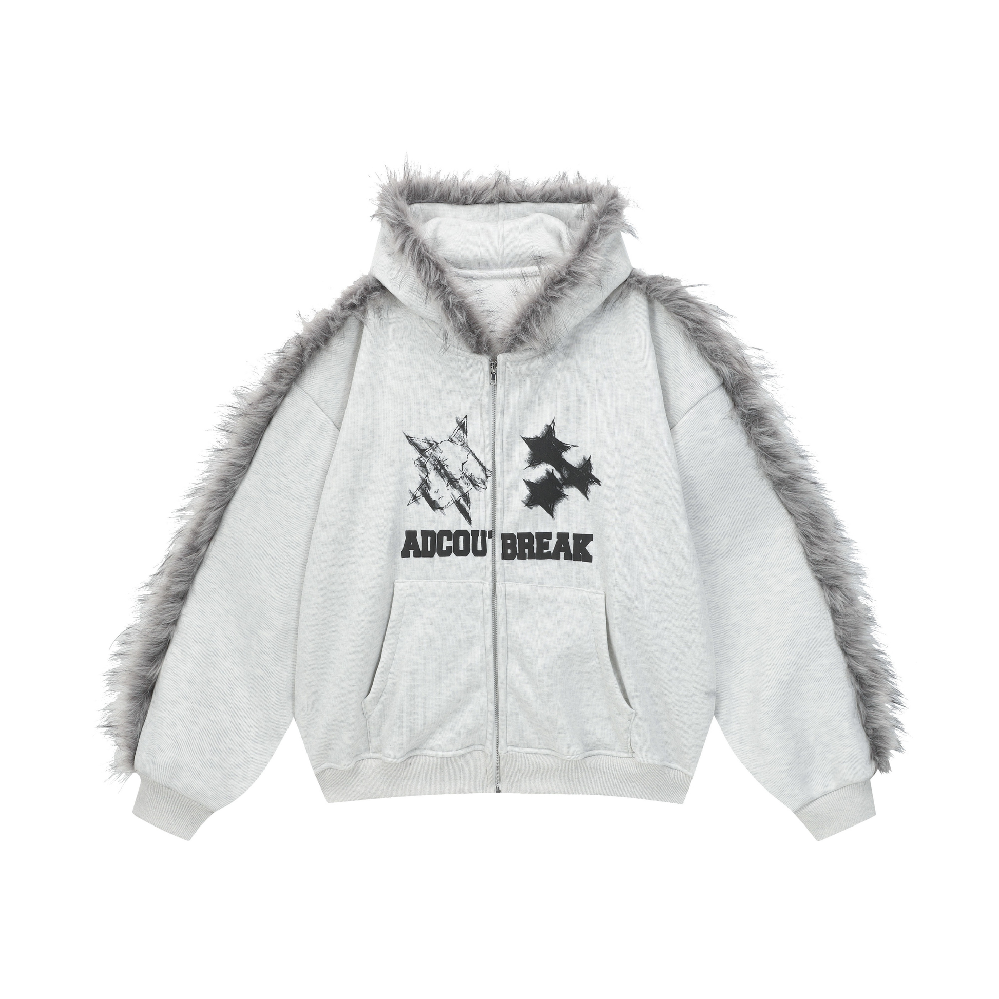 The Omirad Faux Fur-Trimmed Graphic Zip Hoodie blends street-style energy with cozy winter functionality. Made from 100% polyester, it features a soft brushed fleece texture for warmth and structure. The standout design includes a faux-fur trim along the hood and shoulder lines, giving the piece a bold, avant-garde silhouette. The front showcases distressed star graphics and the “ADCOUR BREAK” print for a rebellious streetwear edge.