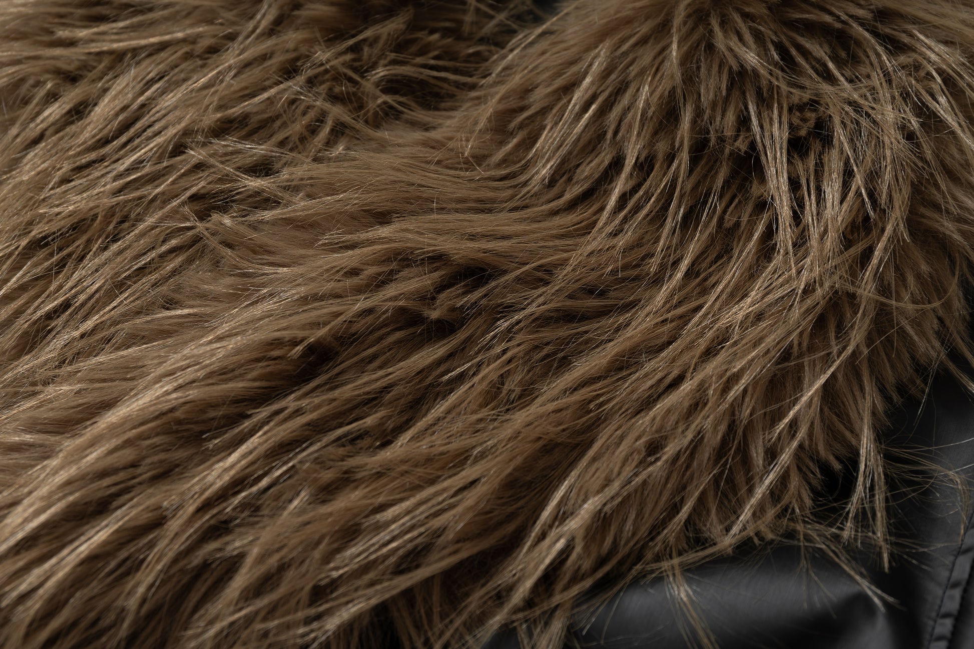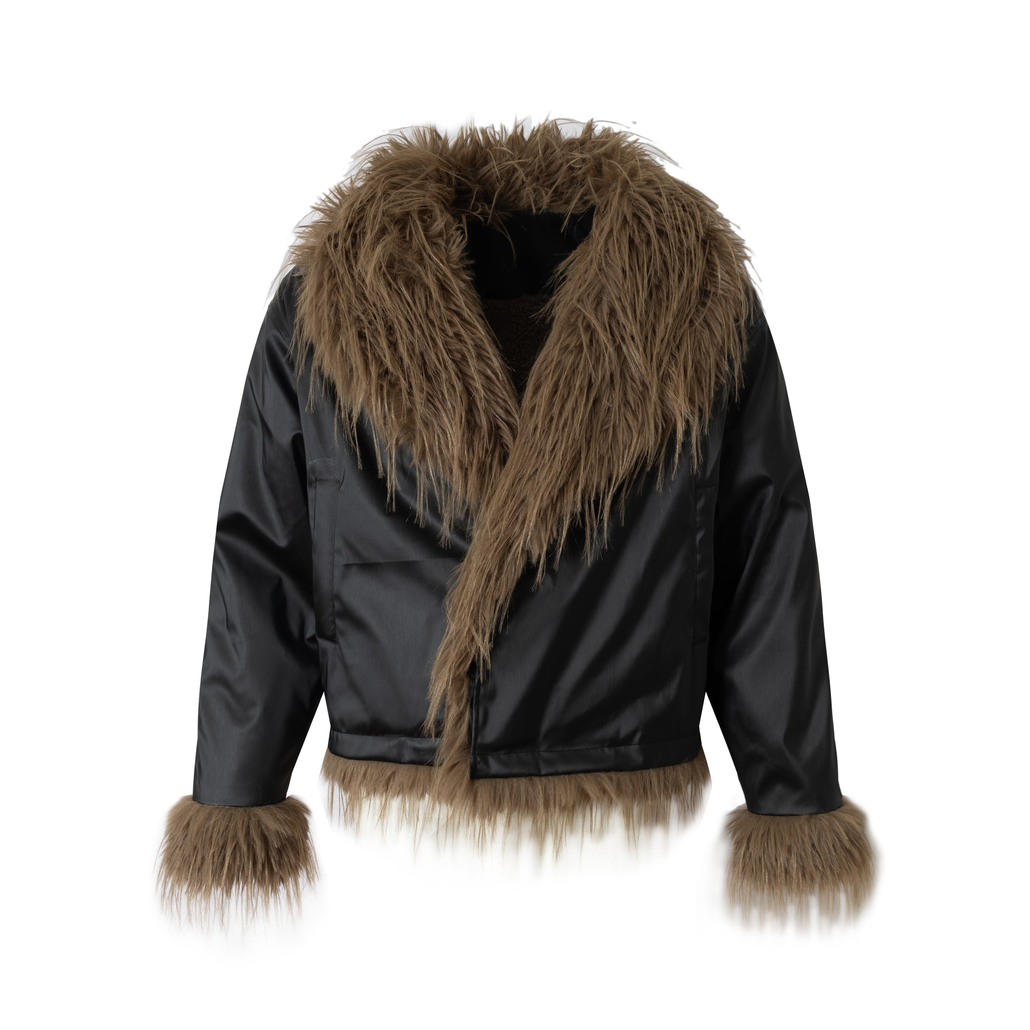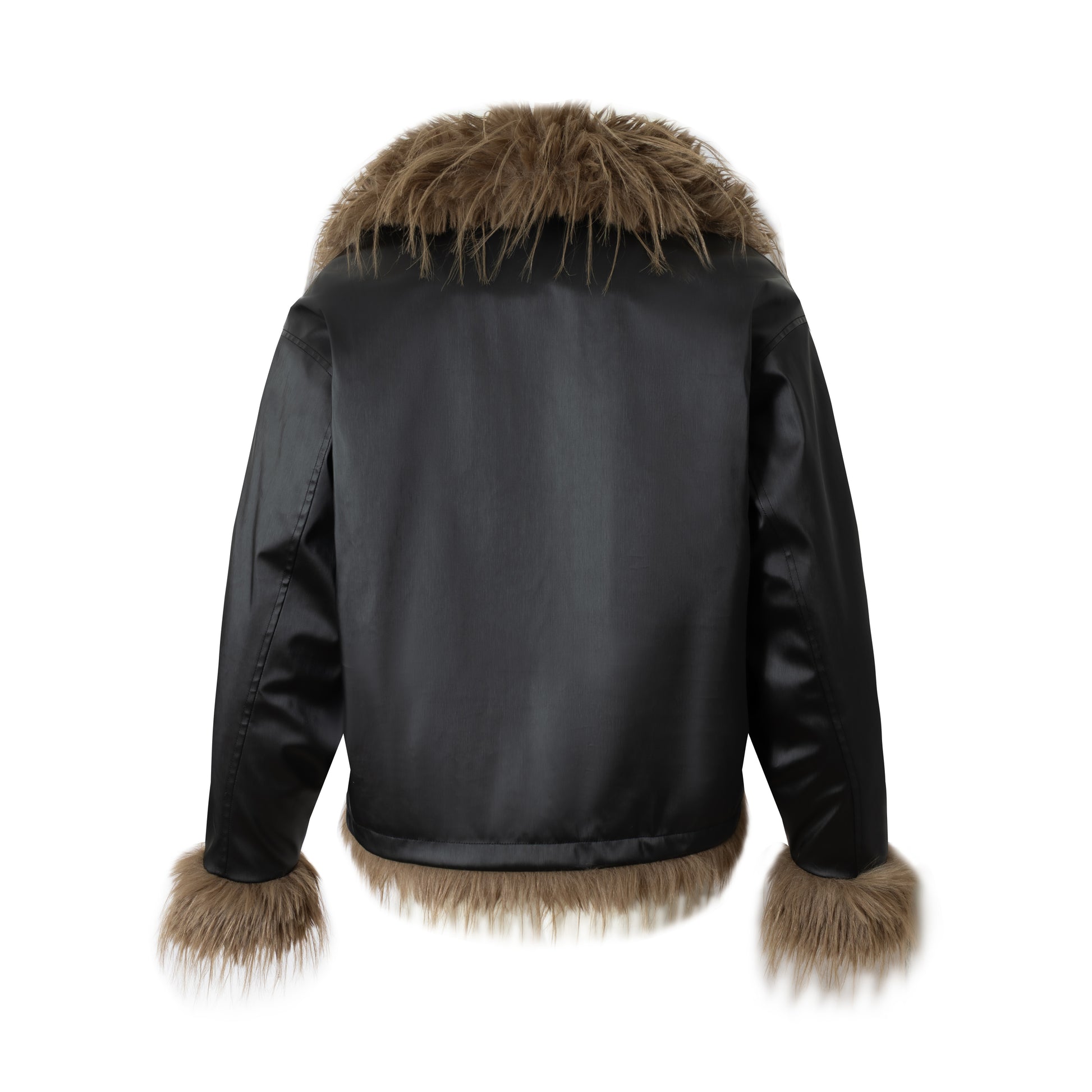 Clothing details: Faux-fur collar and cuffs, PU leather finish, cropped bomber cut, zip-up front, structured silhouette.