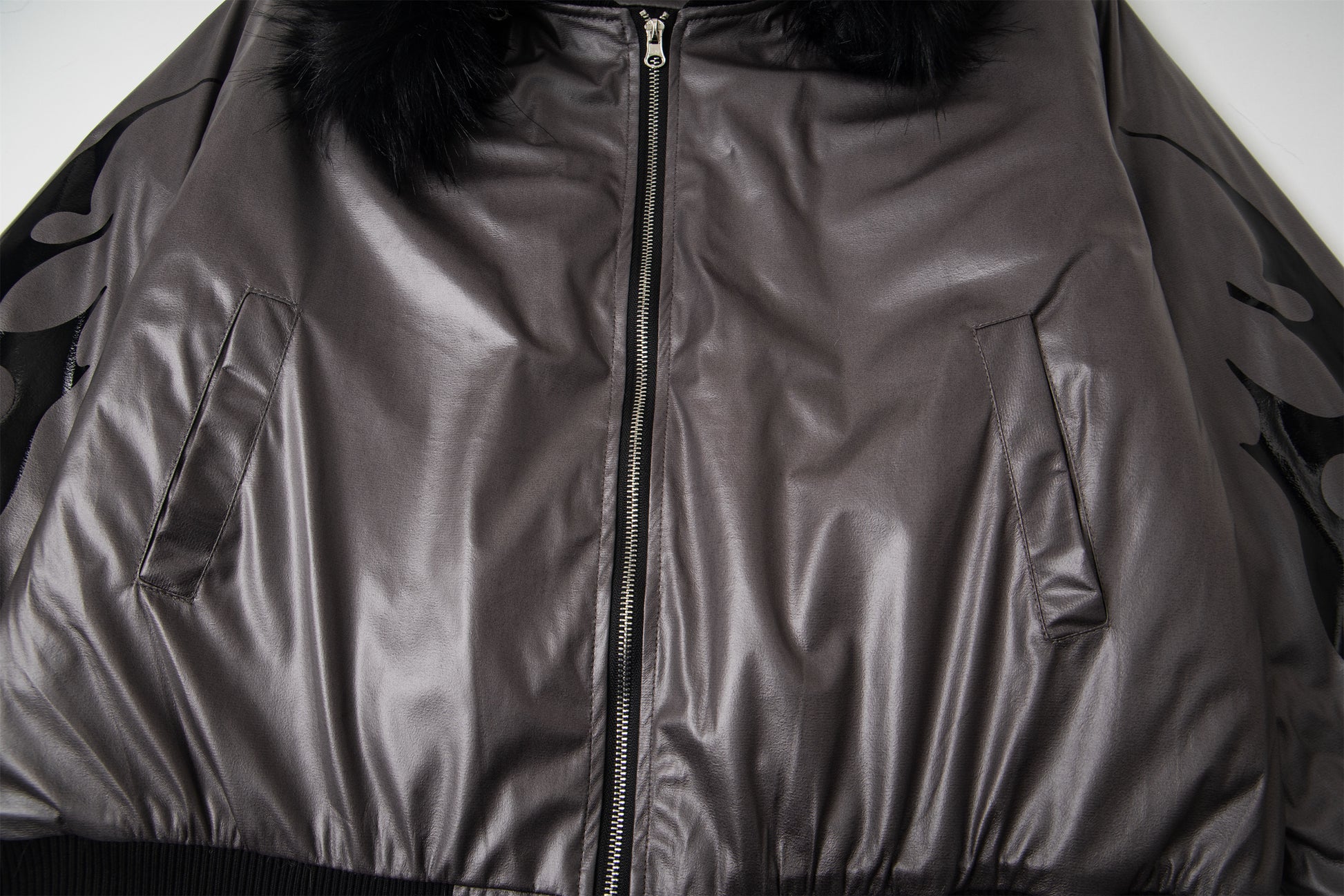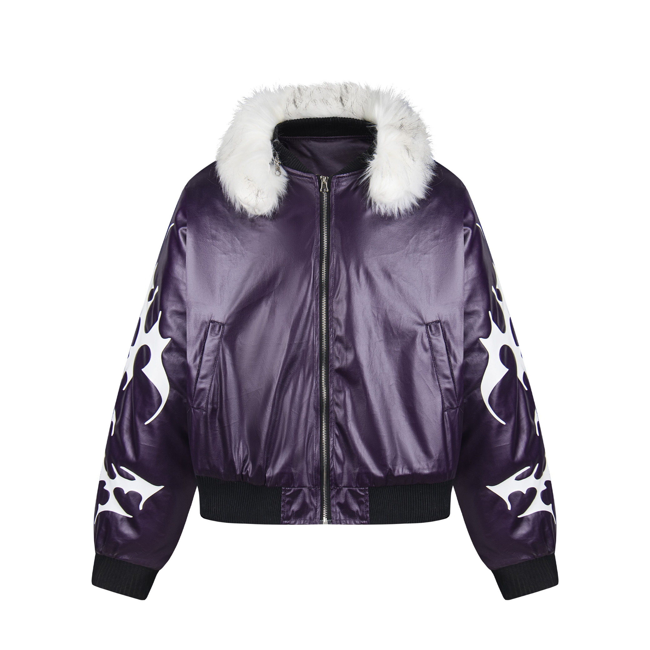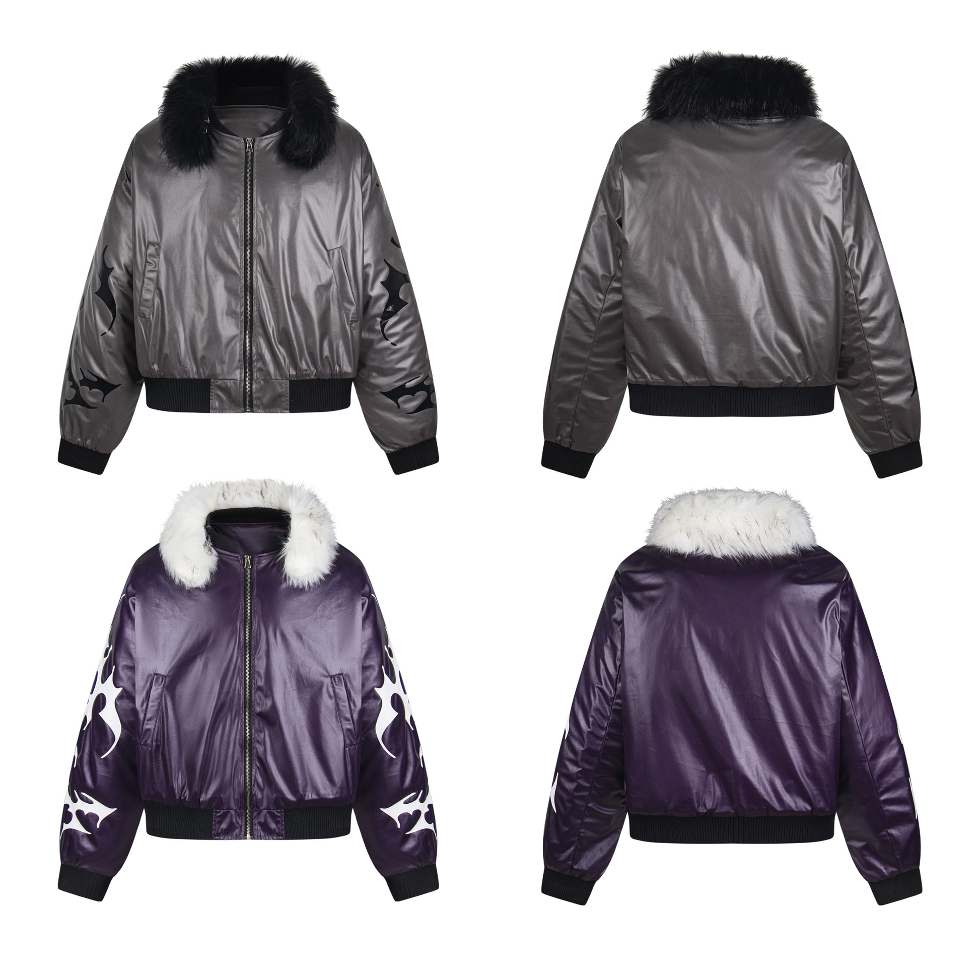 Clothing details: High-shine exterior finish, contrast faux fur collar, flame graphic sleeve detailing, full-zip front closure, ribbed cuffs and hem, functional side pockets, cropped bomber fit, multiple color options.