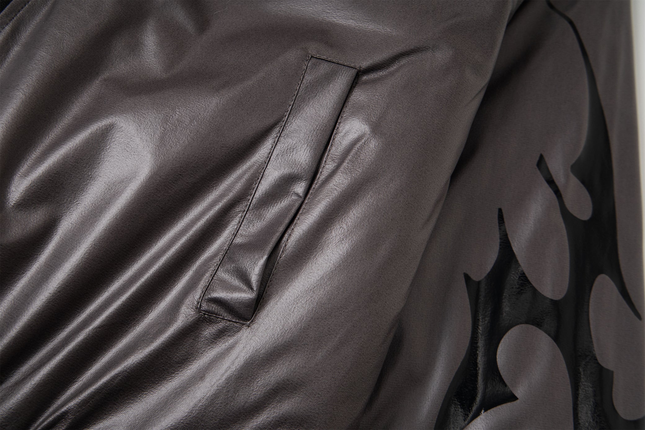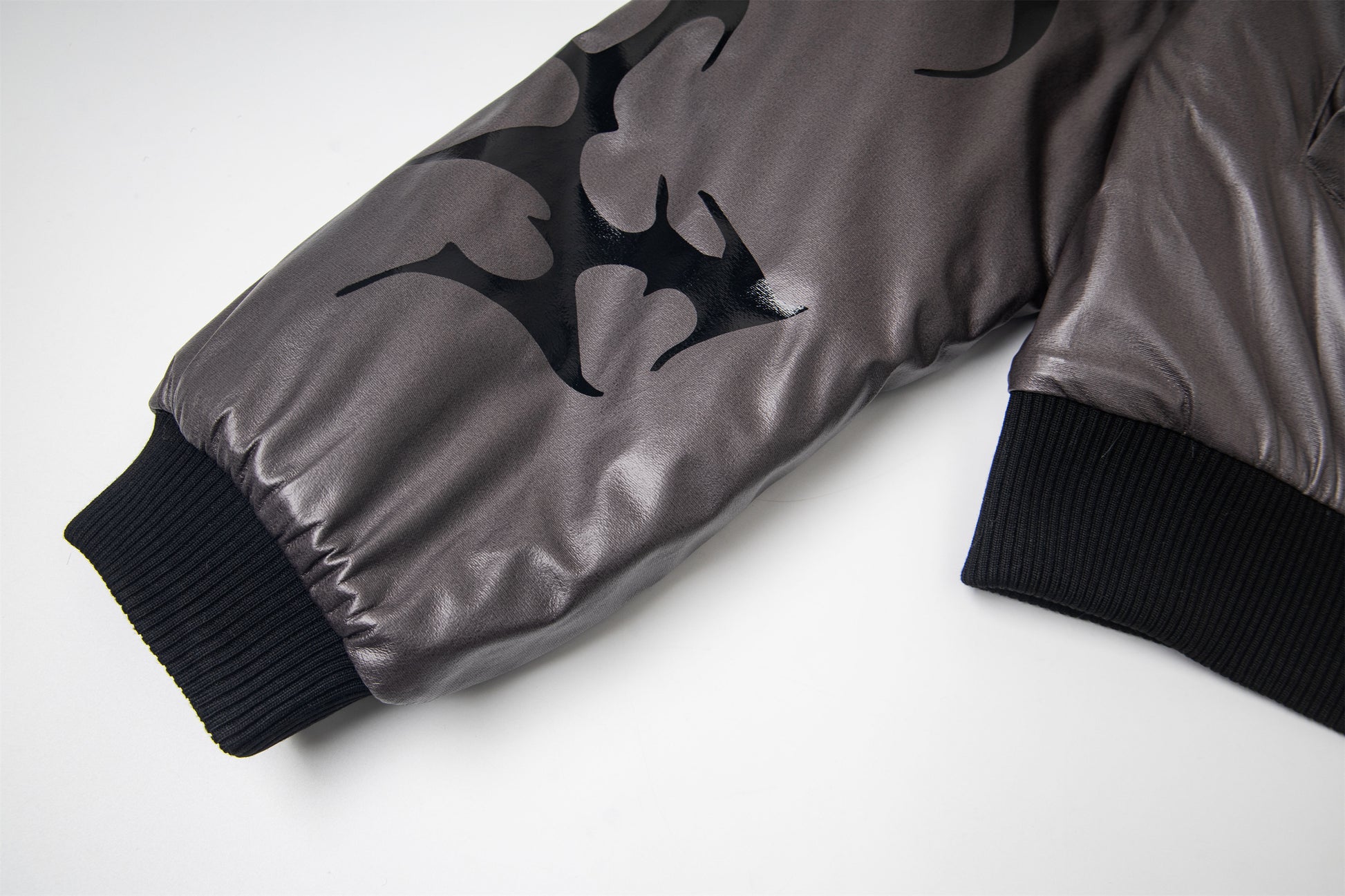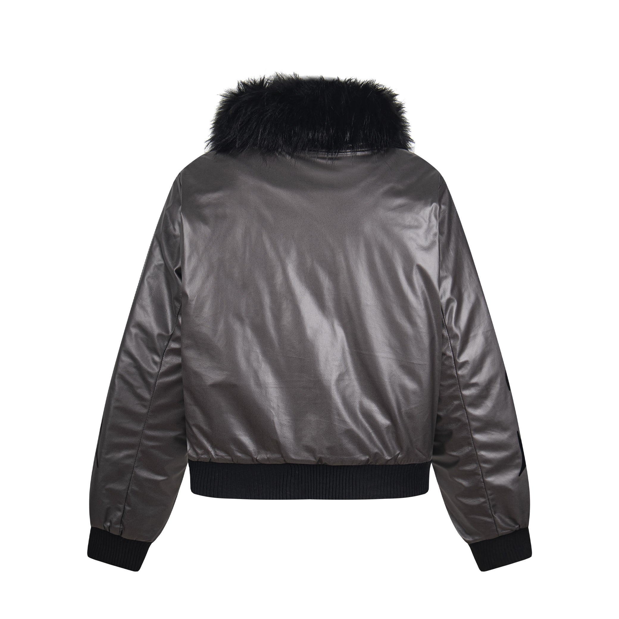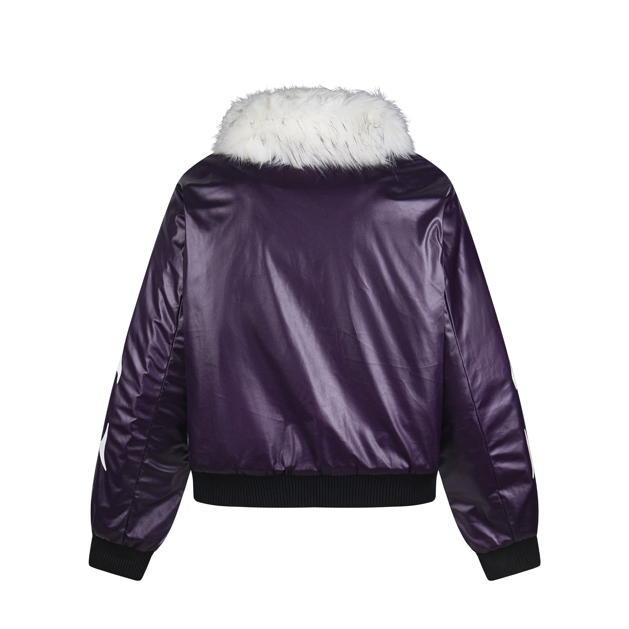 Clothing details: High-shine exterior finish, contrast faux fur collar, flame graphic sleeve detailing, full-zip front closure, ribbed cuffs and hem, functional side pockets, cropped bomber fit, multiple color options.