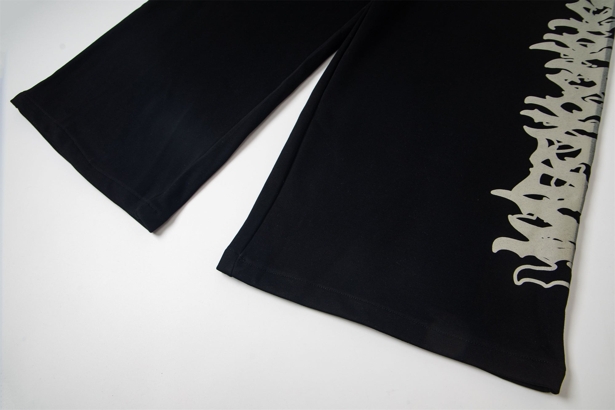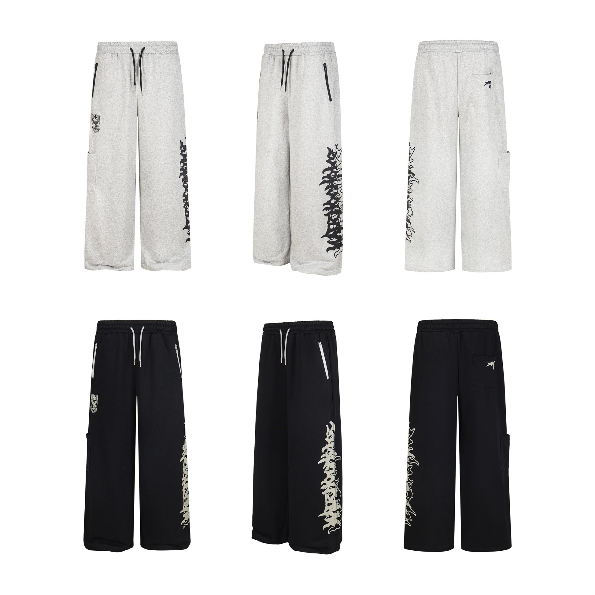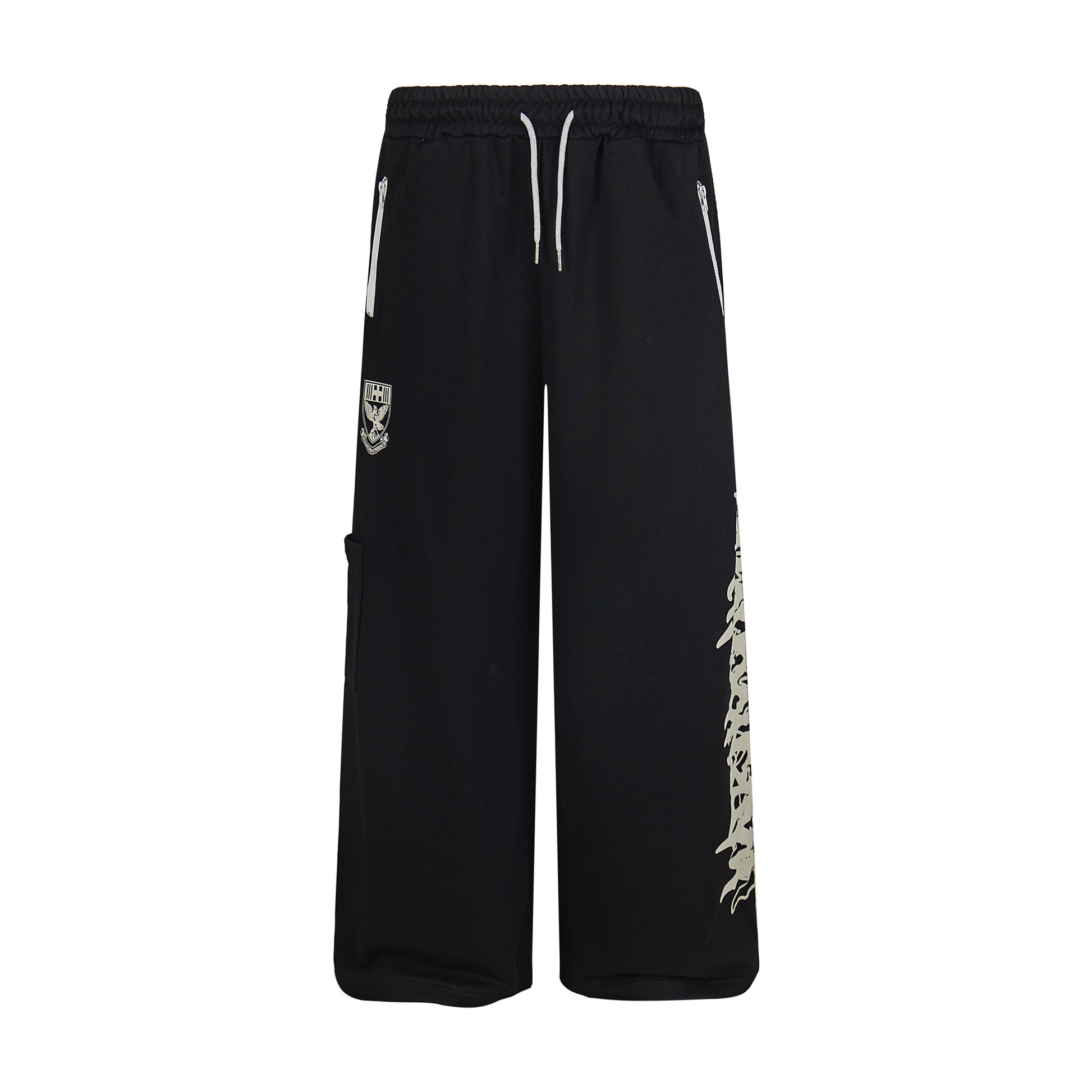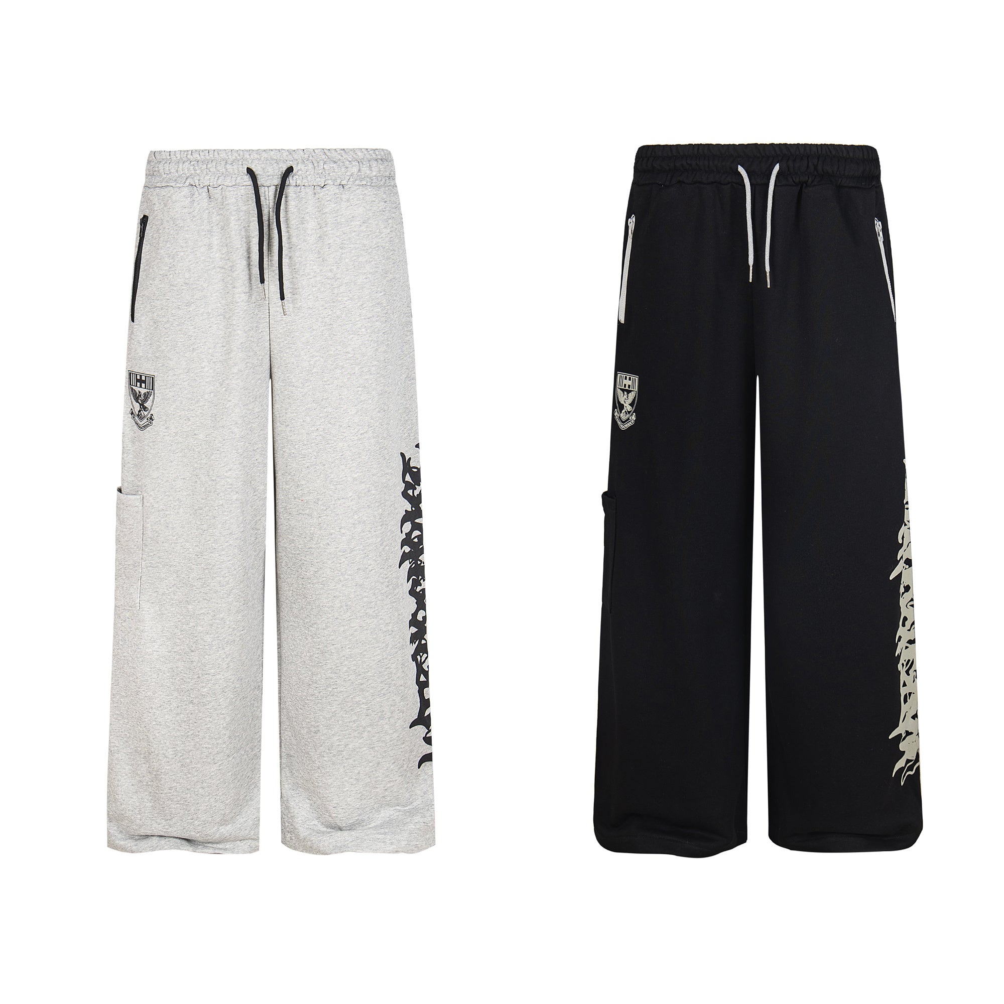 Clothing Details: Wide-leg silhouette, elastic waistband with drawstring, side flame script print, back embroidered logo, cargo side pocket, soft and breathable blended fabric