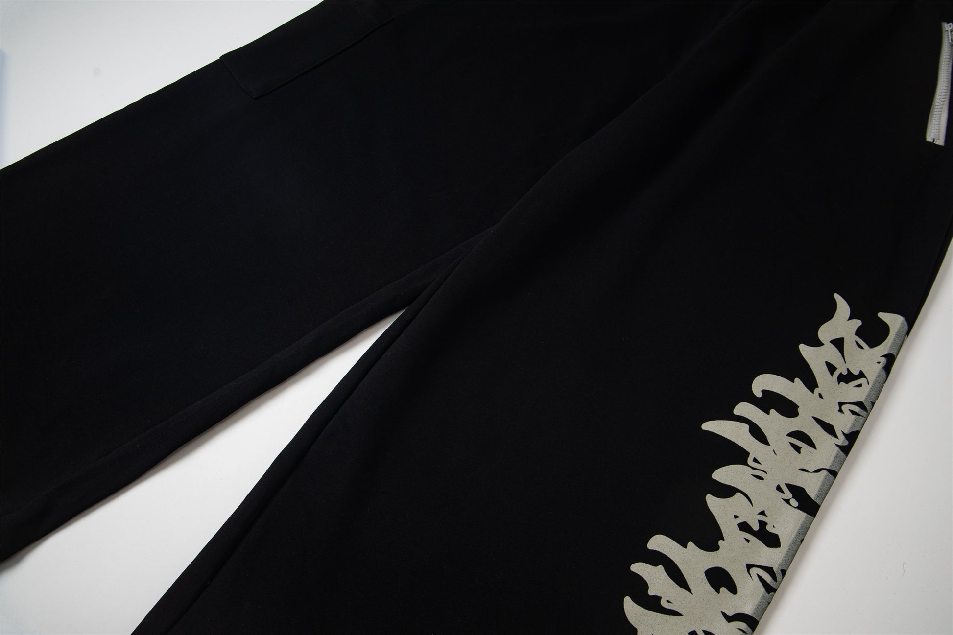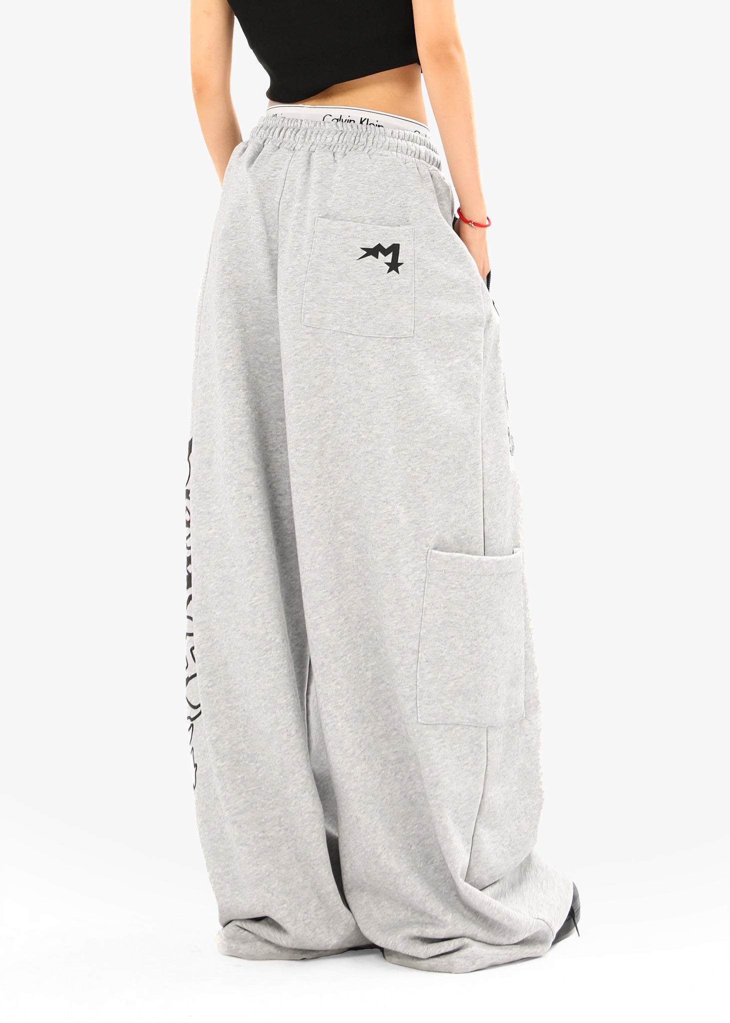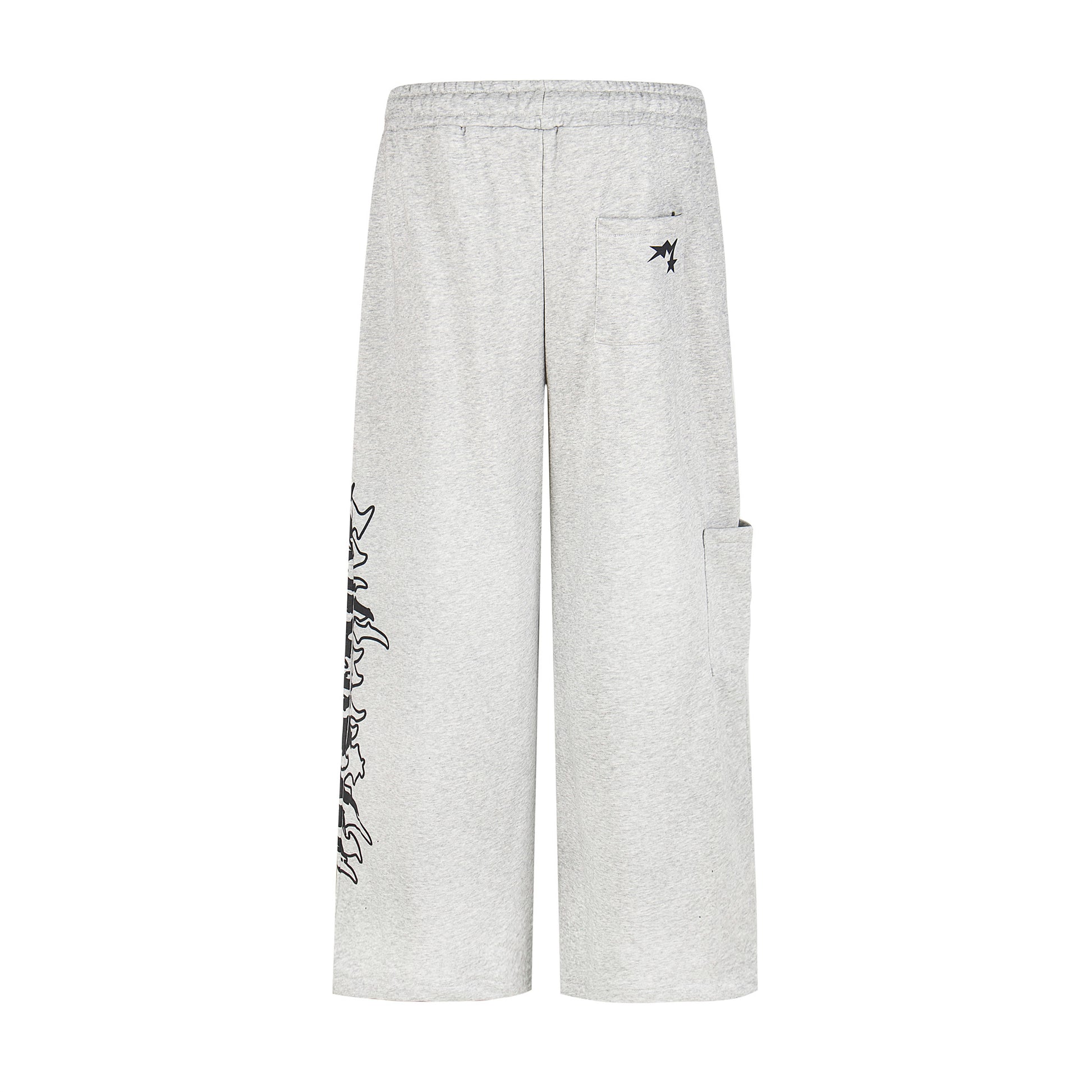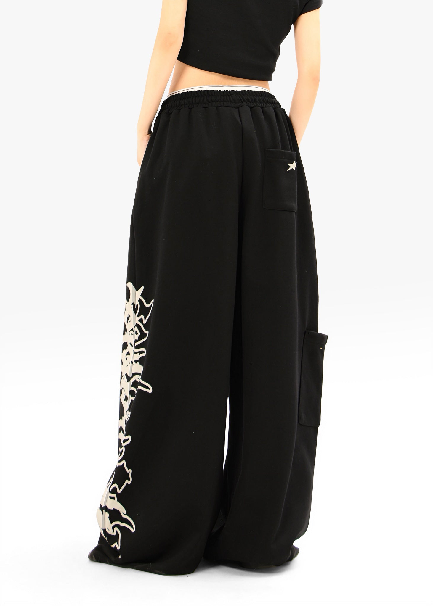 Clothing Details: Wide-leg silhouette, elastic waistband with drawstring, side flame script print, back embroidered logo, cargo side pocket, soft and breathable blended fabric