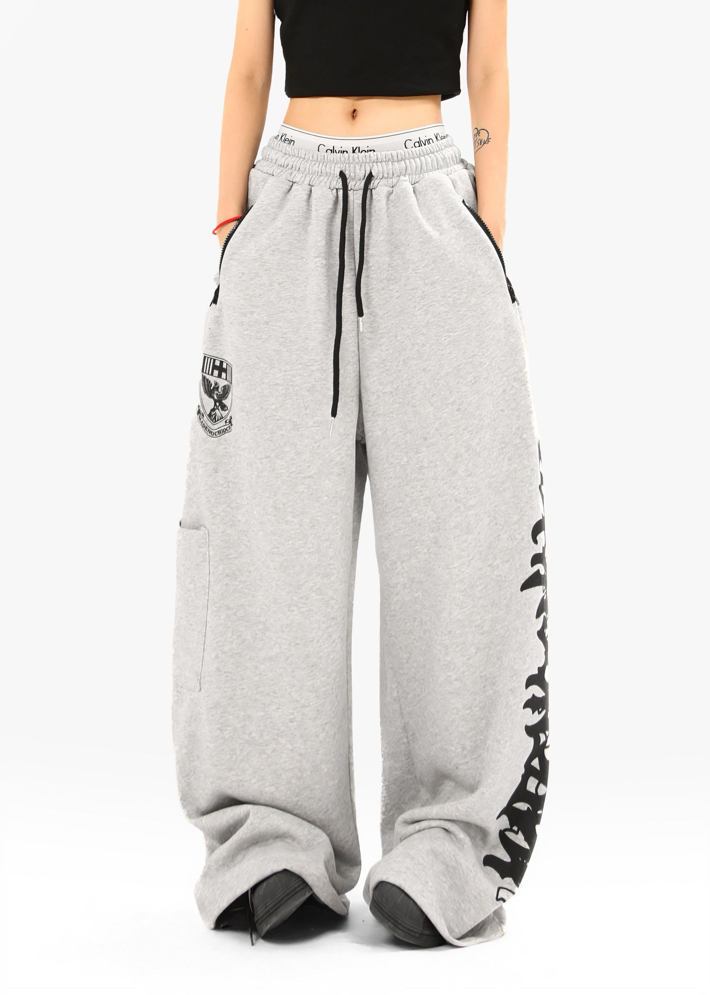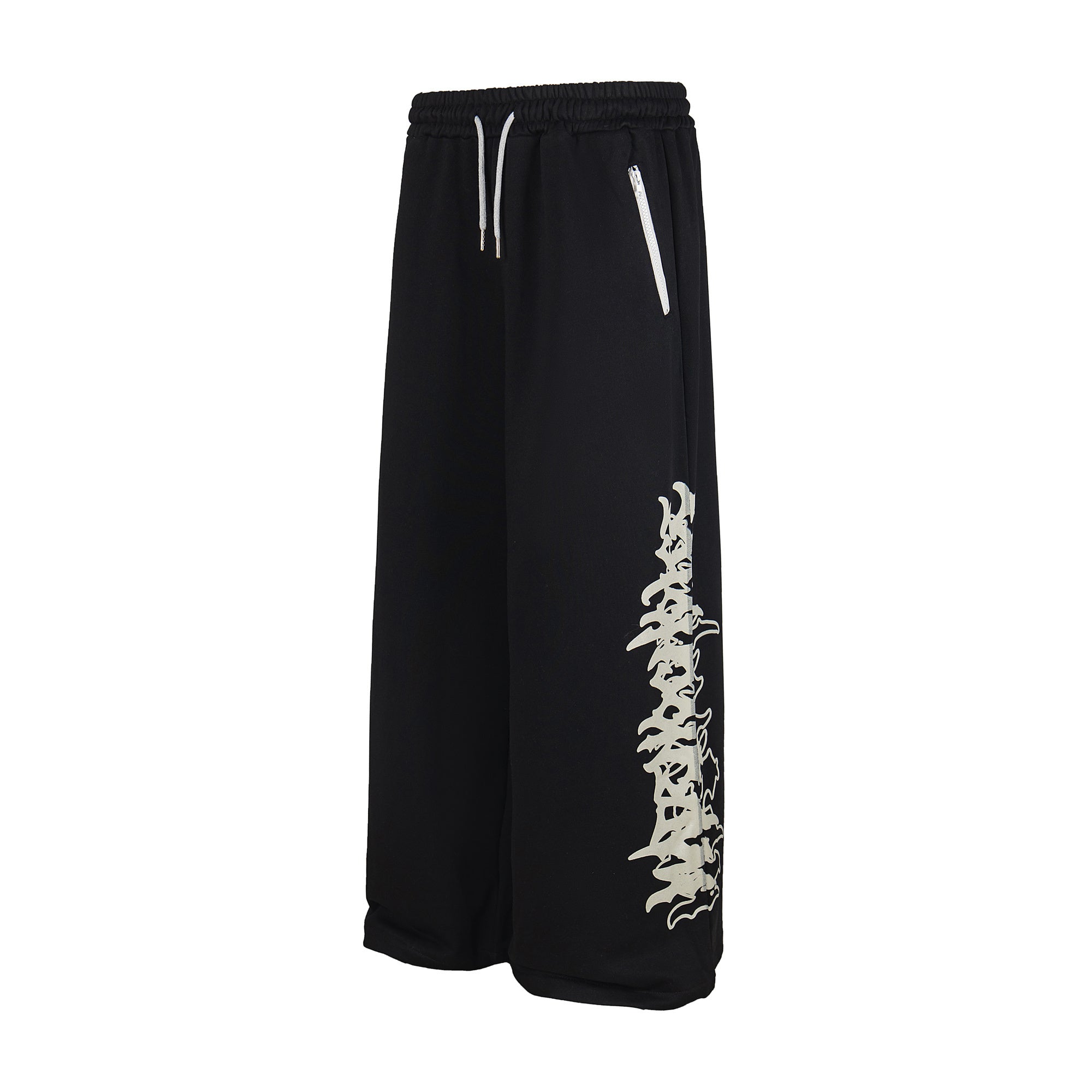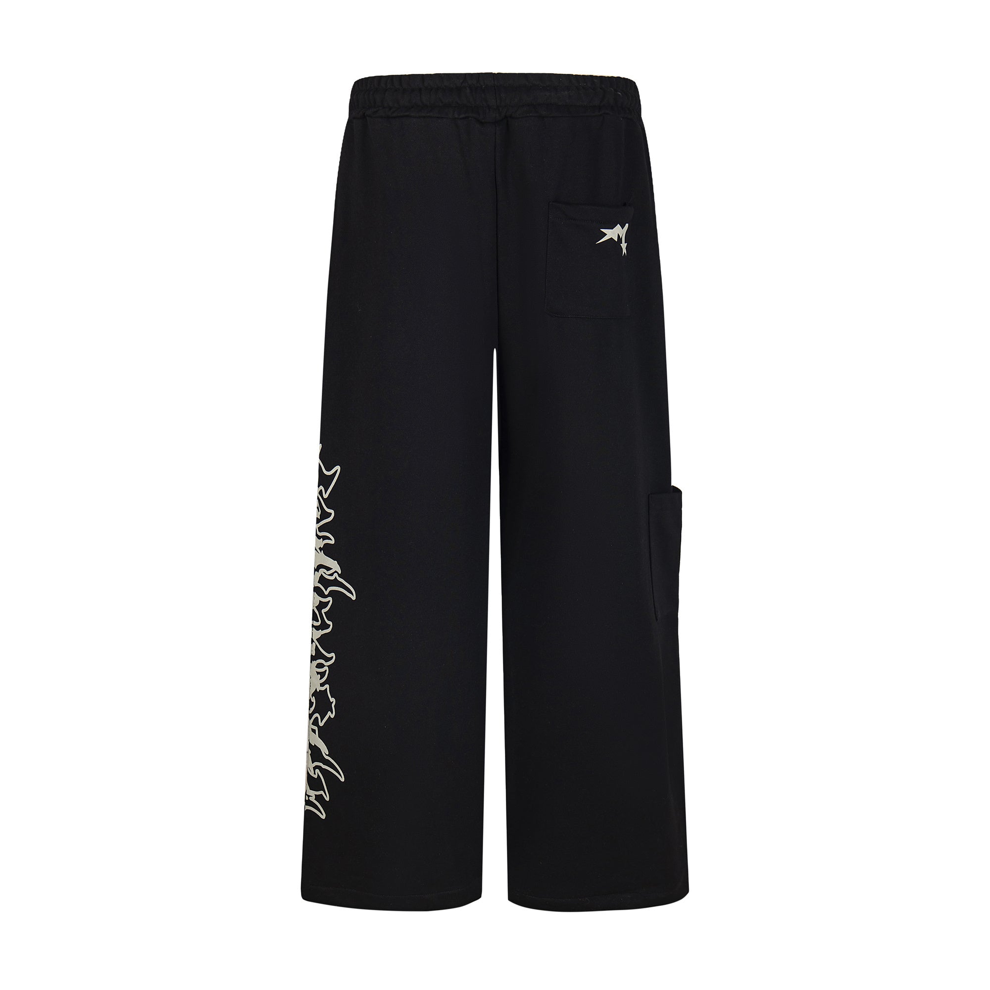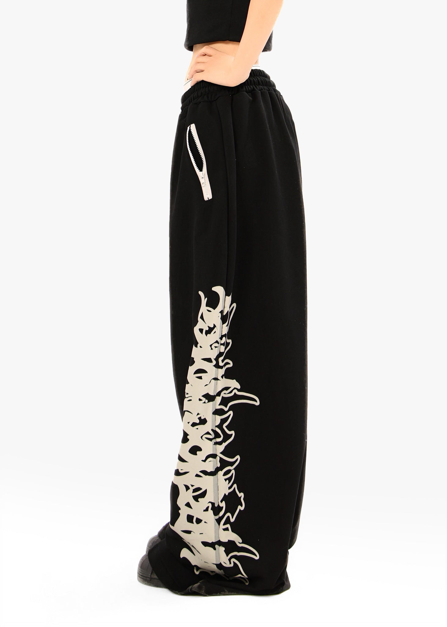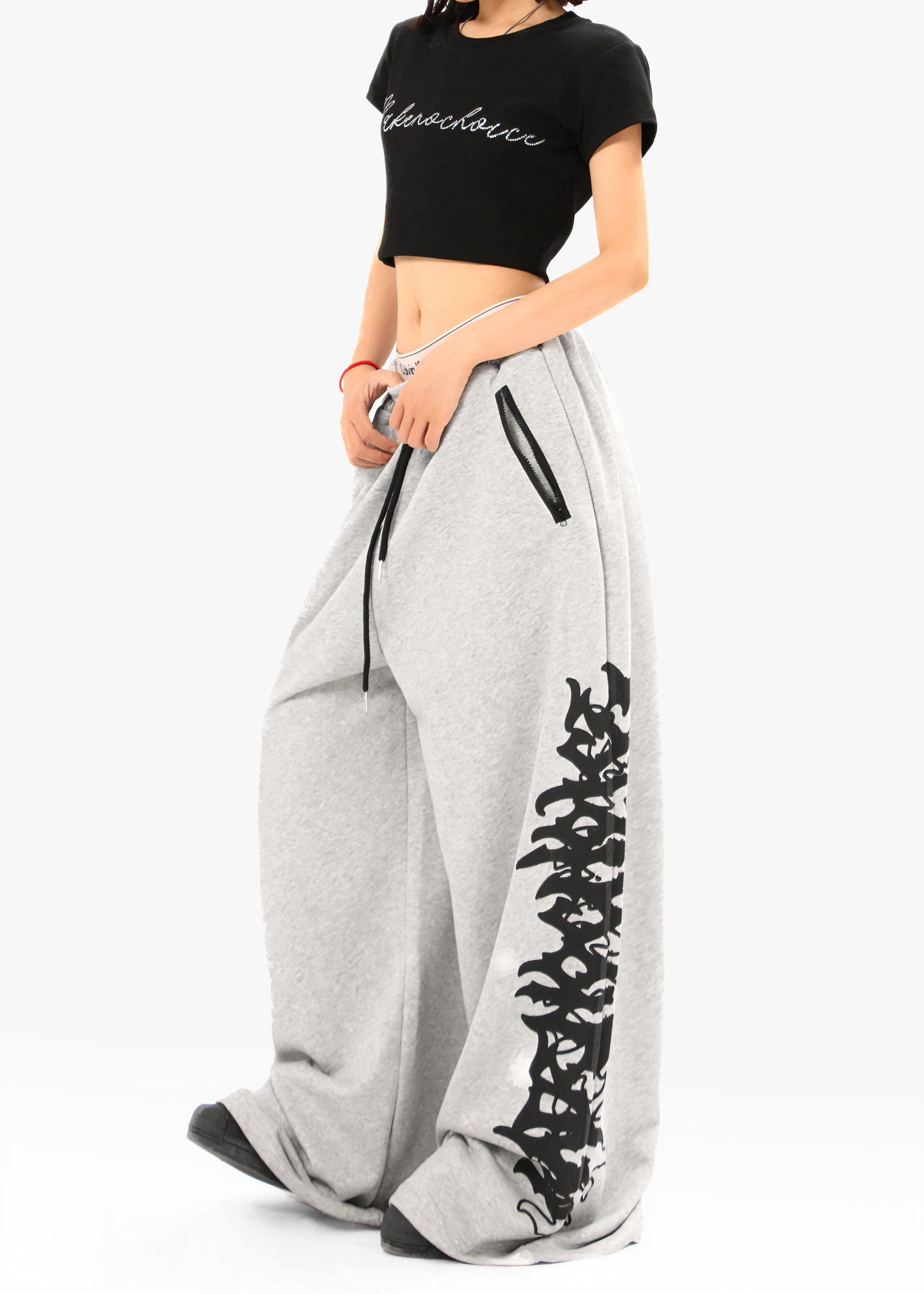 Clothing Details: Wide-leg silhouette, elastic waistband with drawstring, side flame script print, back embroidered logo, cargo side pocket, soft and breathable blended fabric