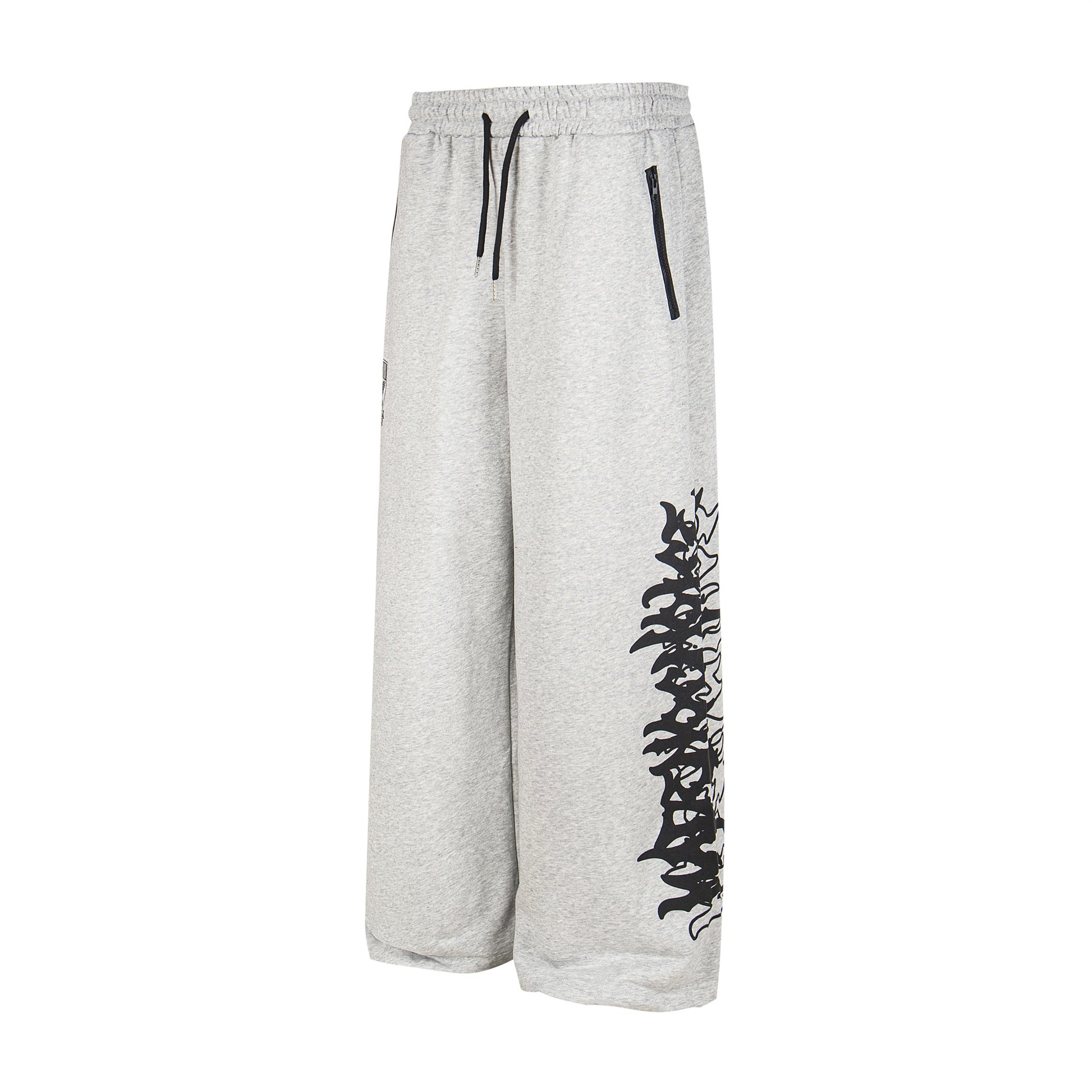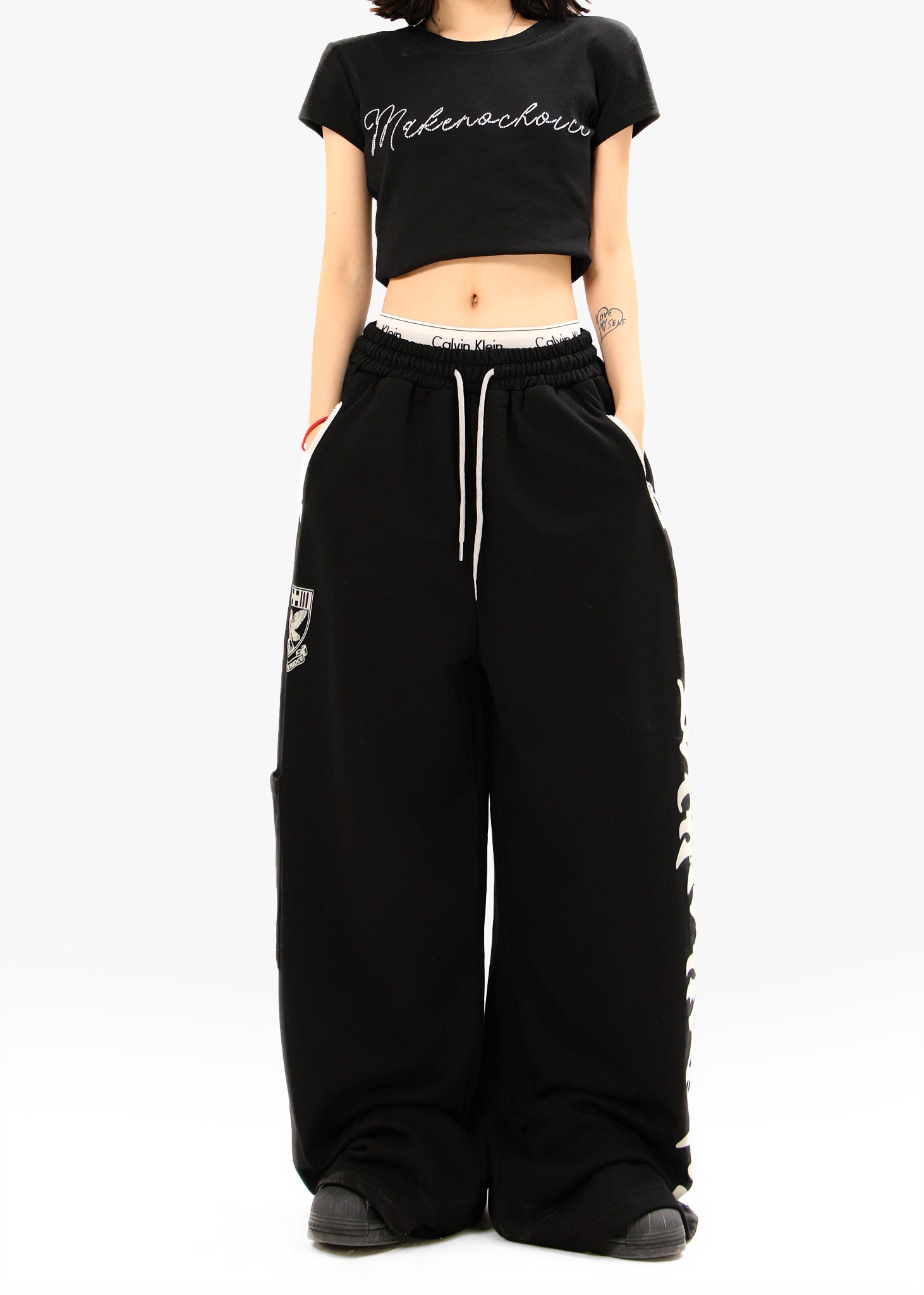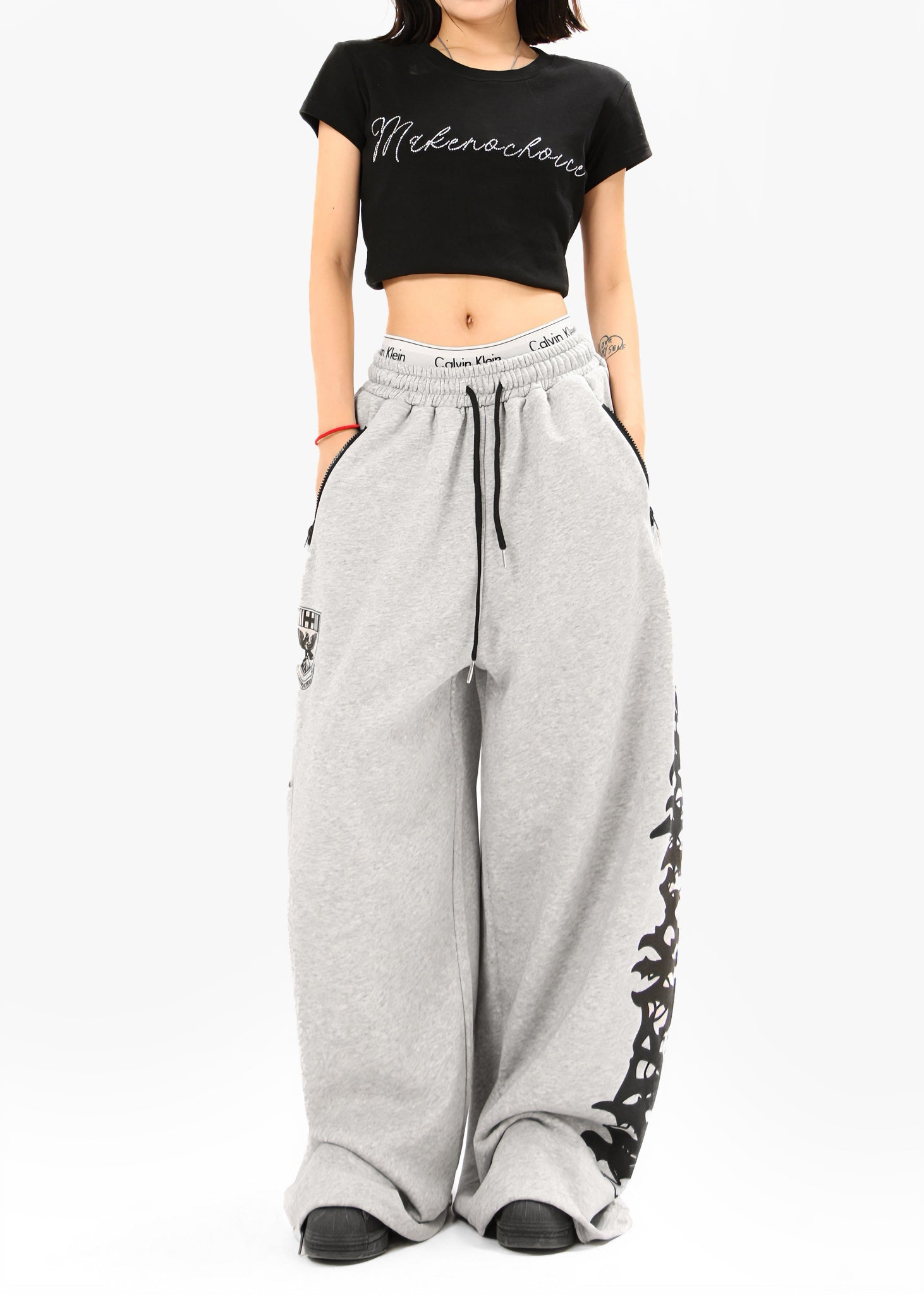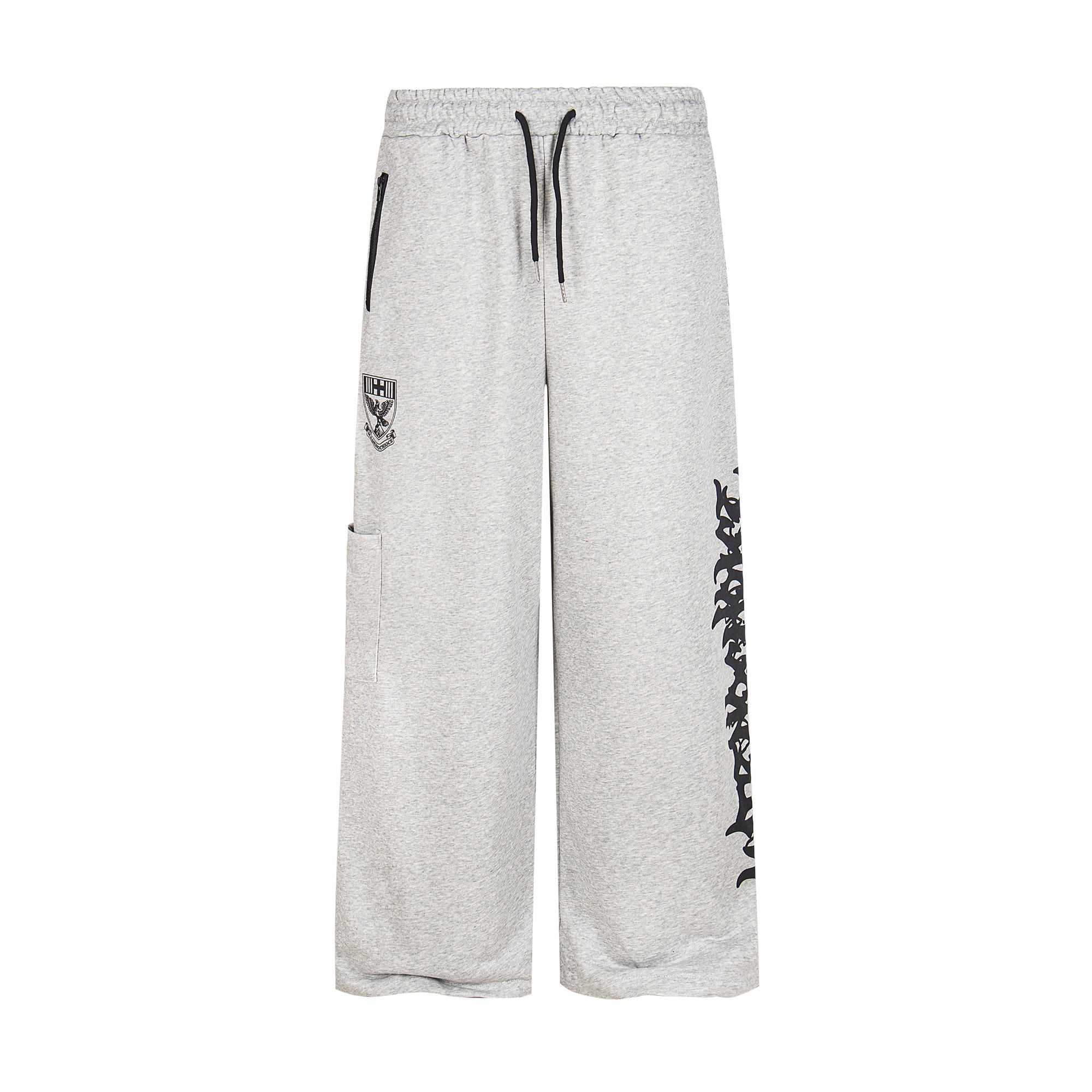 Clothing Details: Wide-leg silhouette, elastic waistband with drawstring, side flame script print, back embroidered logo, cargo side pocket, soft and breathable blended fabric