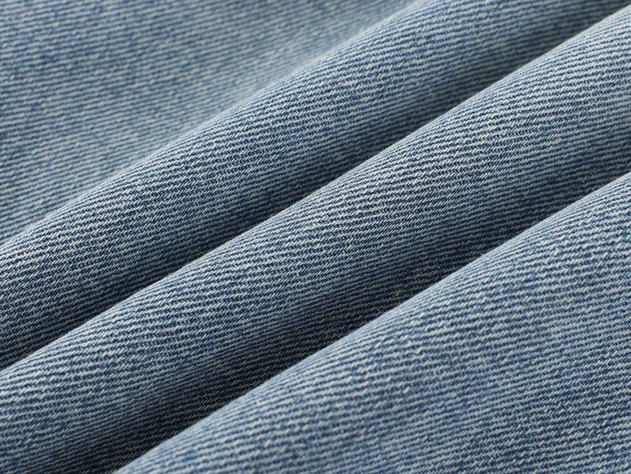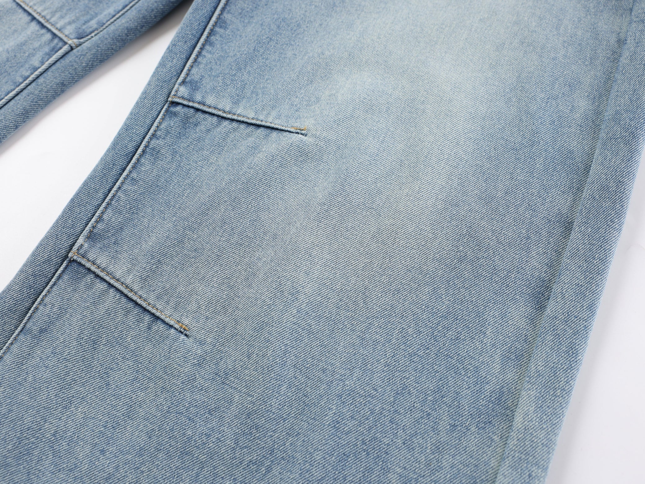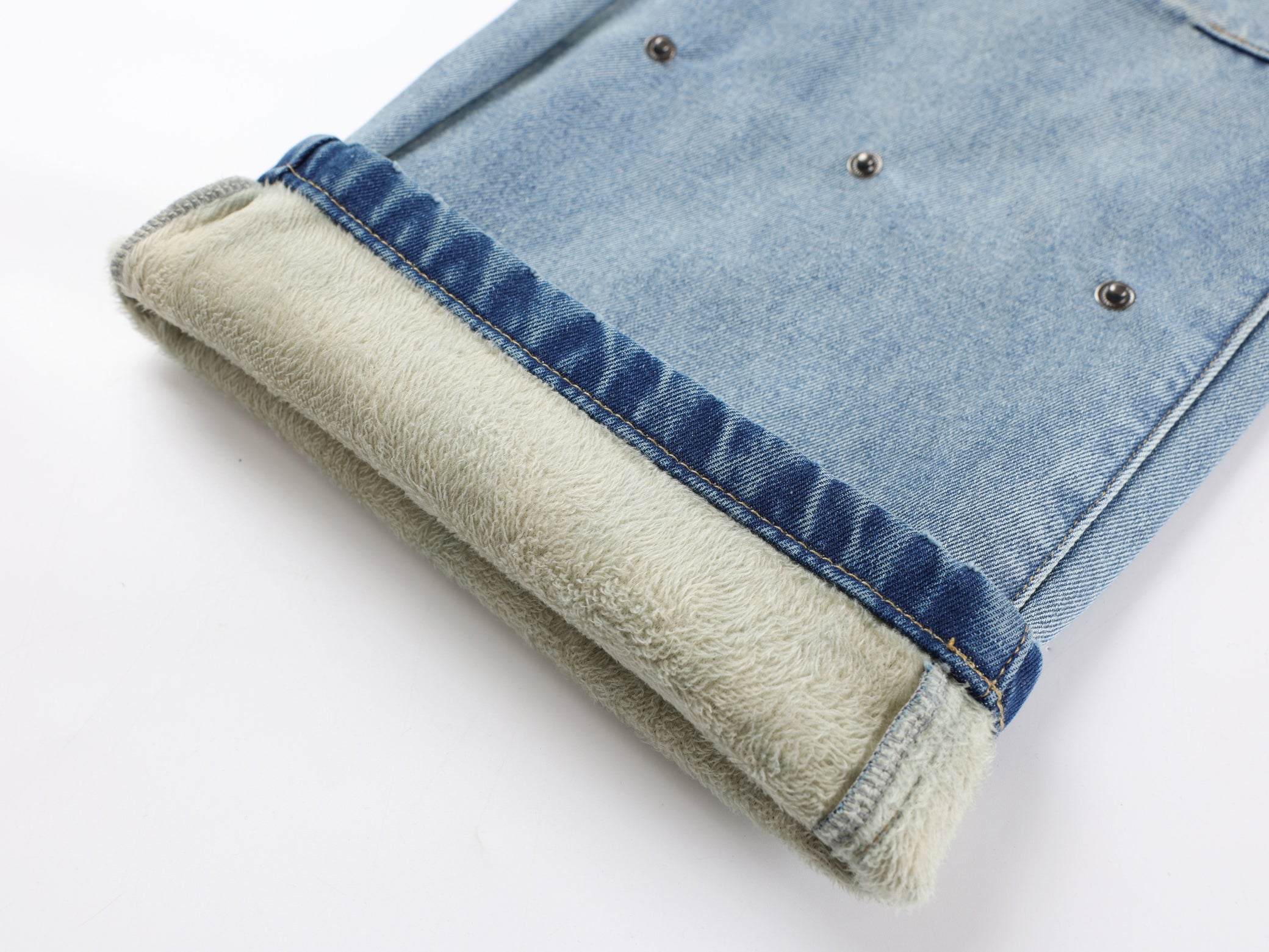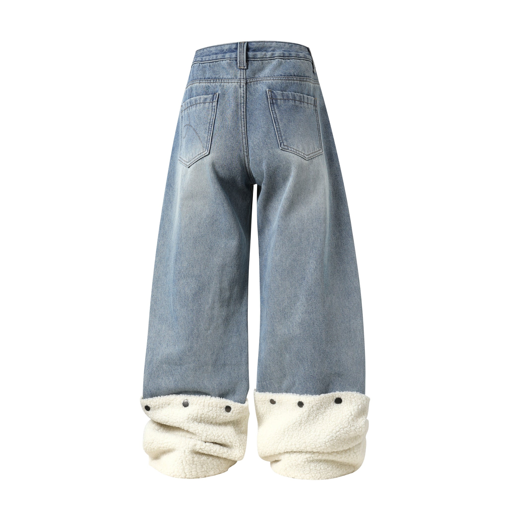 Clothing details: Washed denim finish, fleece-lined fold-over hem, snap-button adjustable cuffs, wide-leg stacked fit, classic five-pocket construction, structured waistband with belt loops.