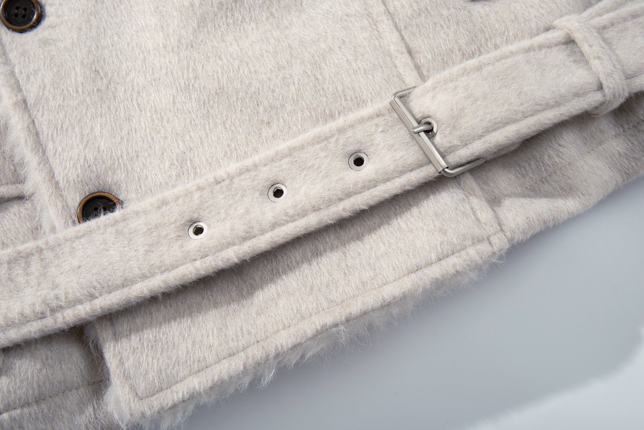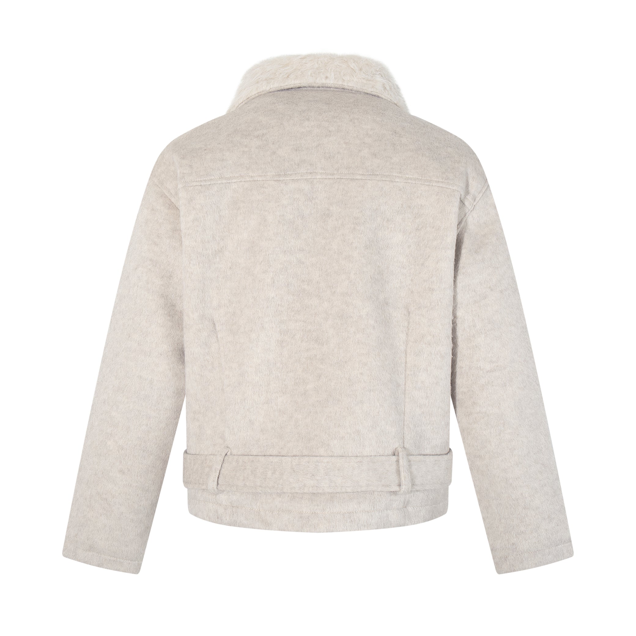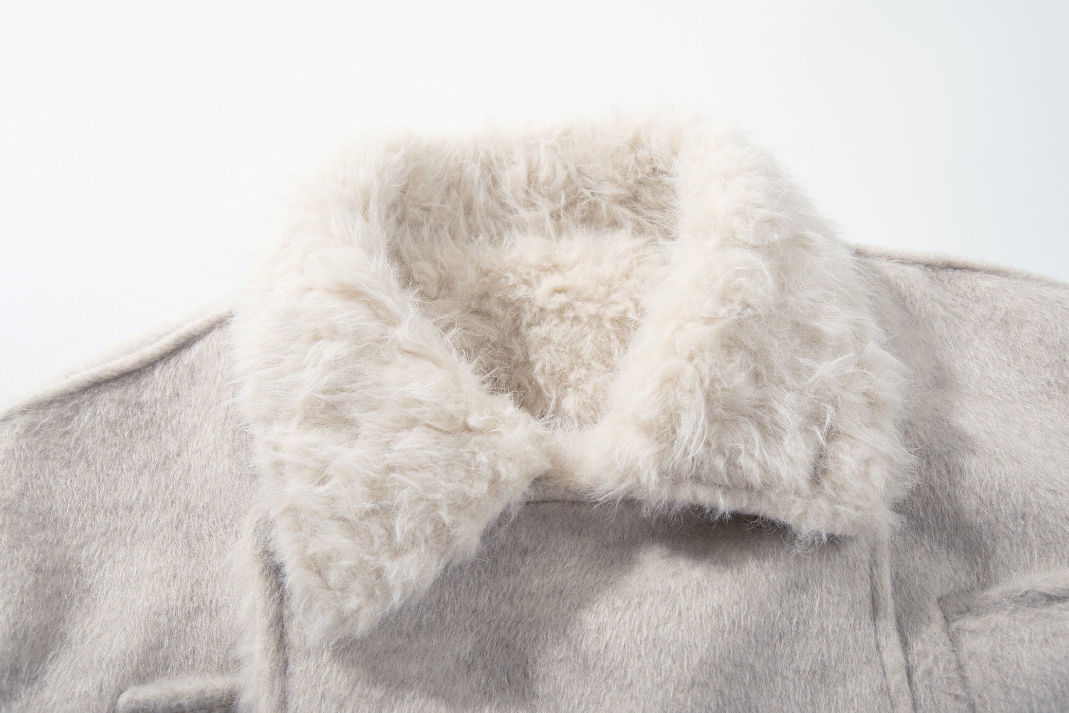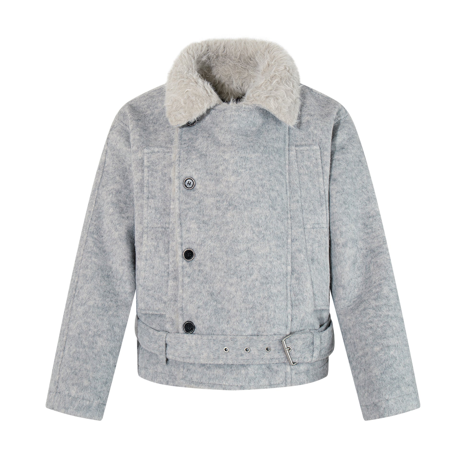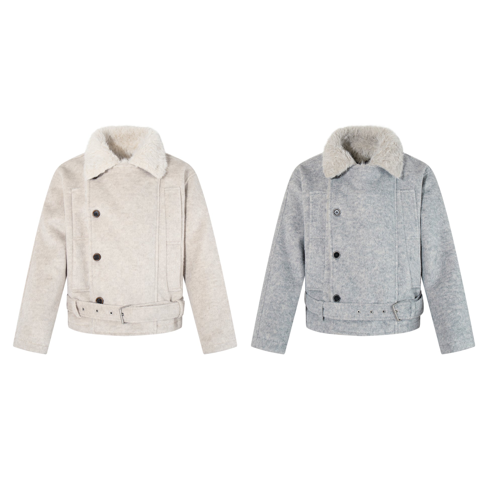 Clothing details: Faux-fur collar, structured cropped fit, front button closure, adjustable waist belt, clean panel construction, smooth inner lining, minimalist finish with premium texture.