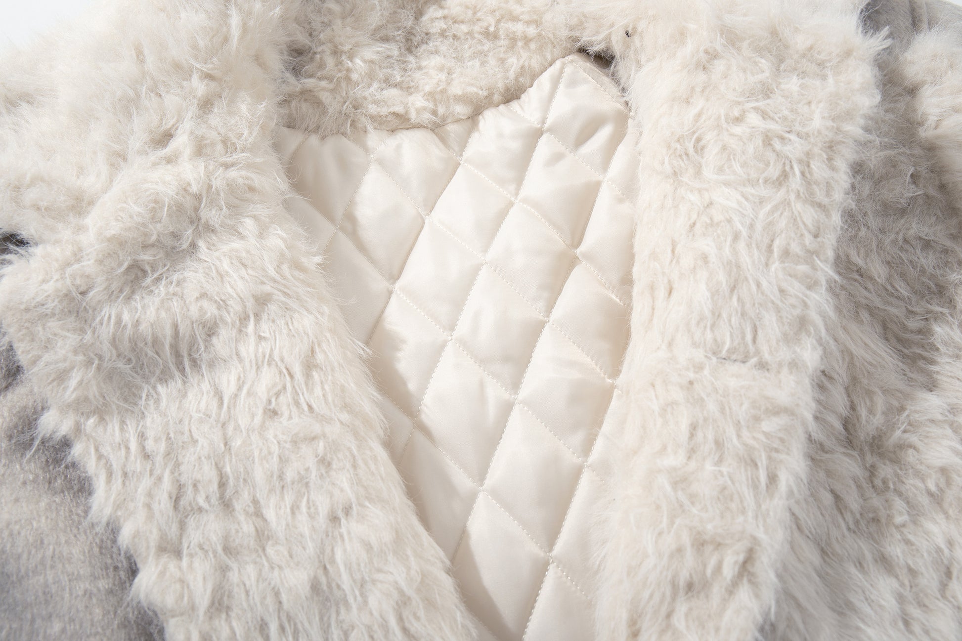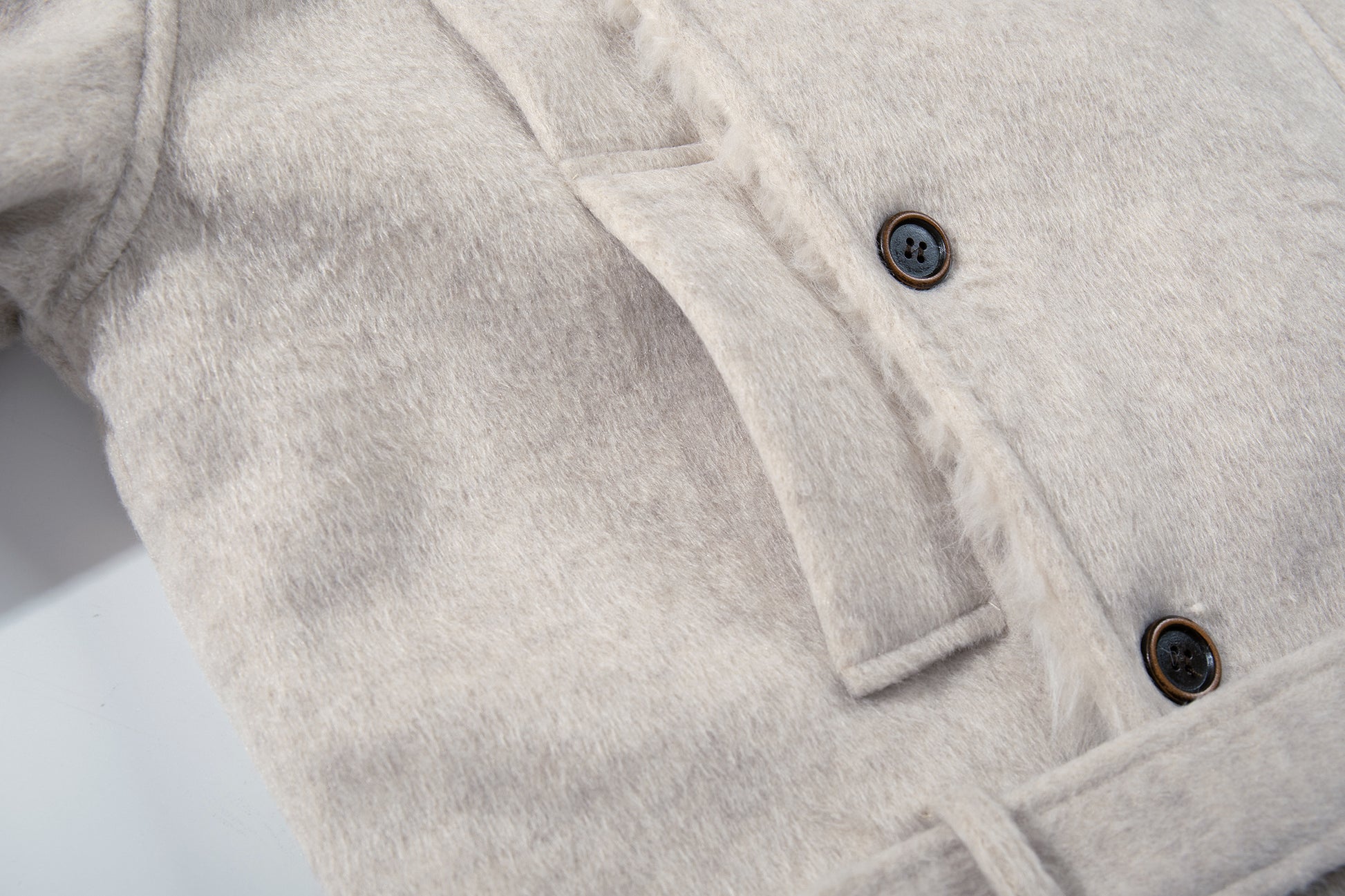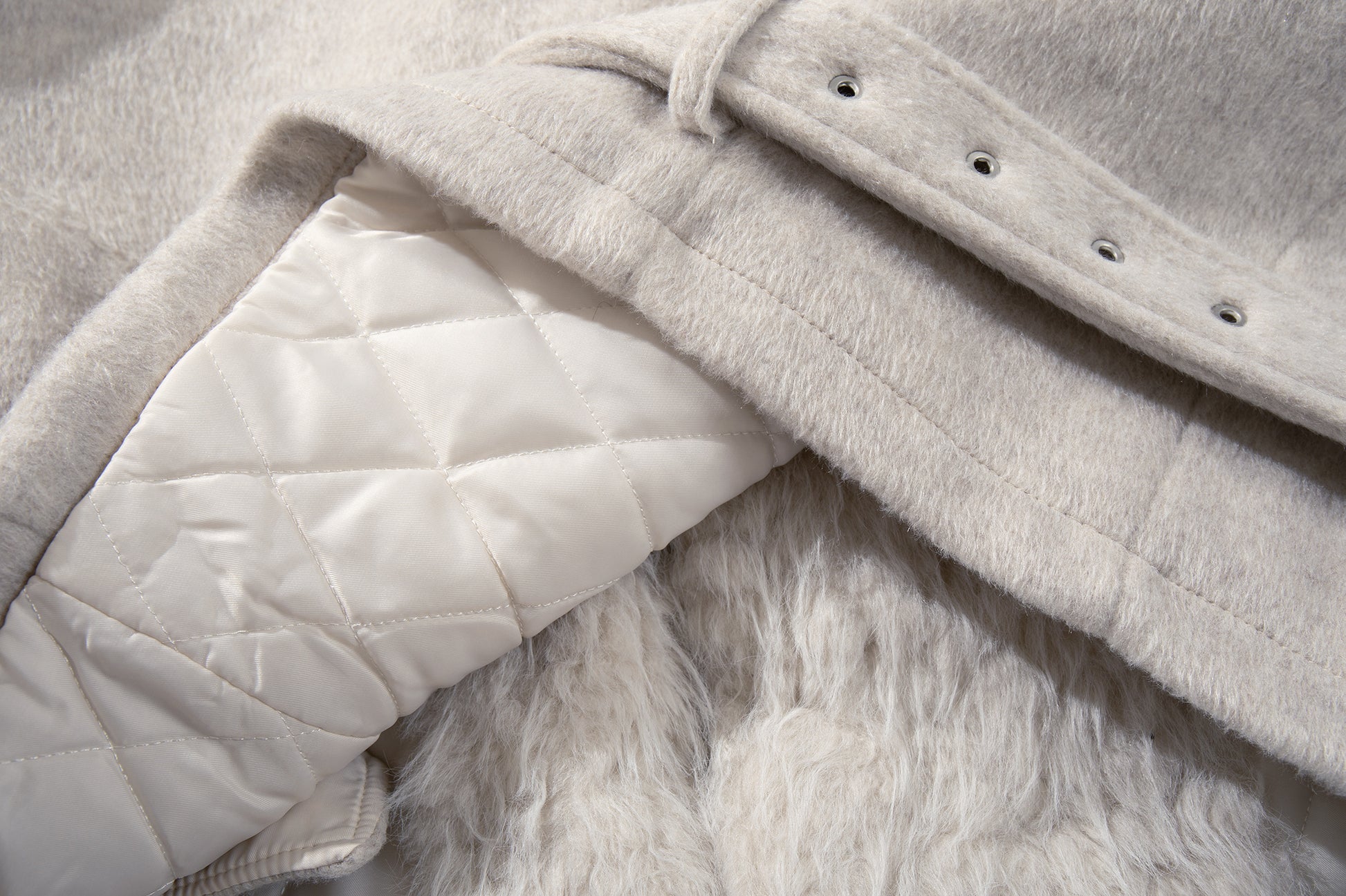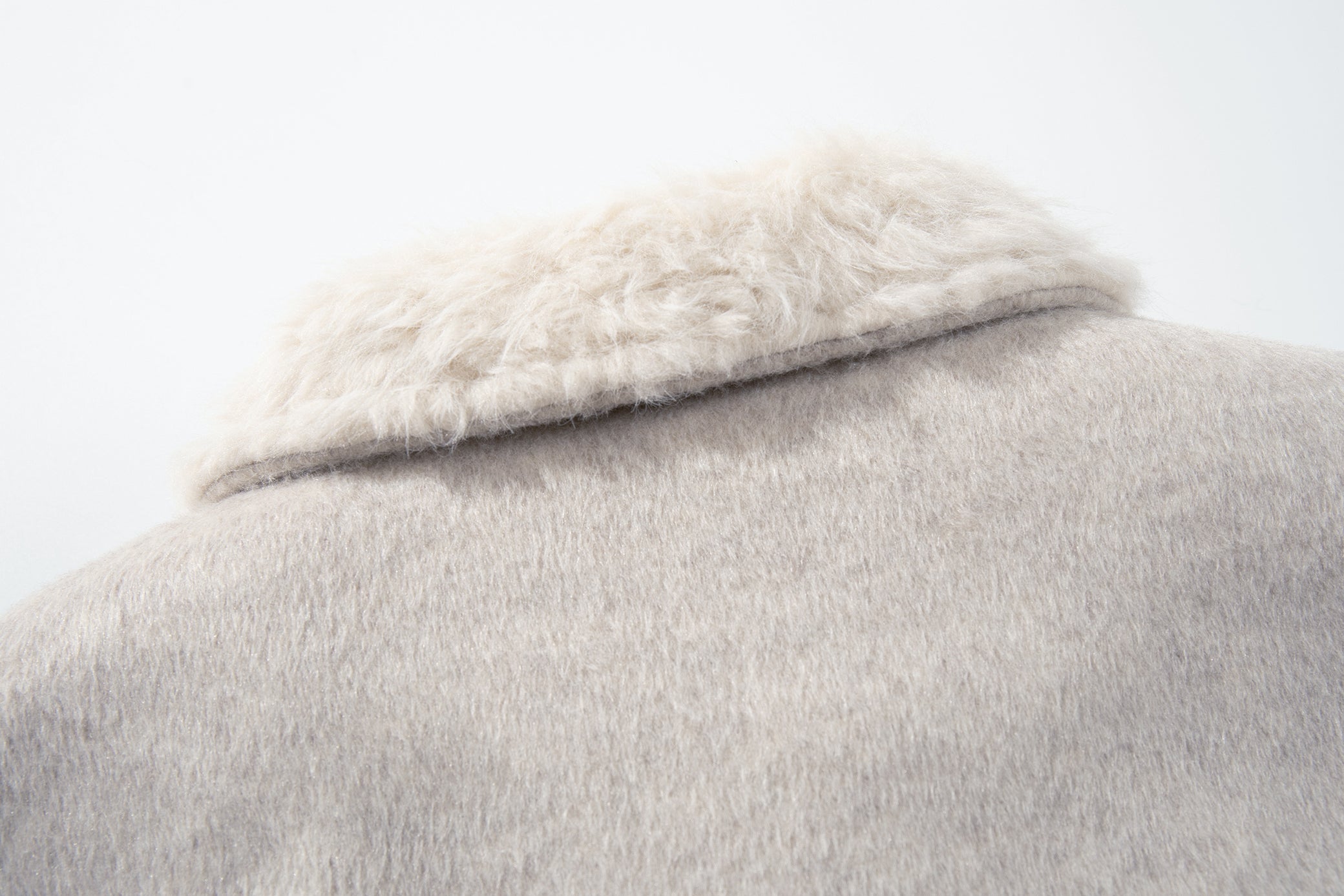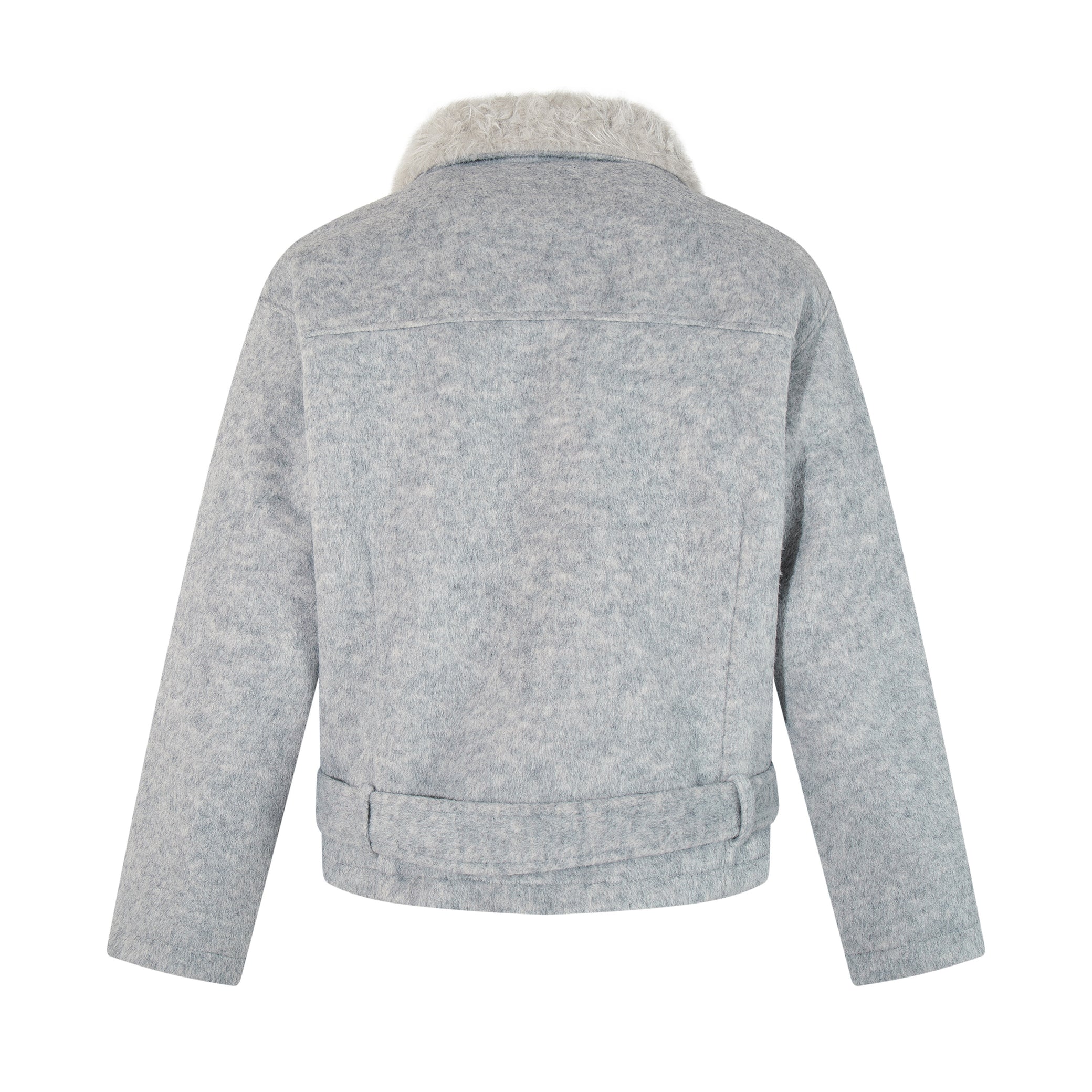 Clothing details: Faux-fur collar, structured cropped fit, front button closure, adjustable waist belt, clean panel construction, smooth inner lining, minimalist finish with premium texture.