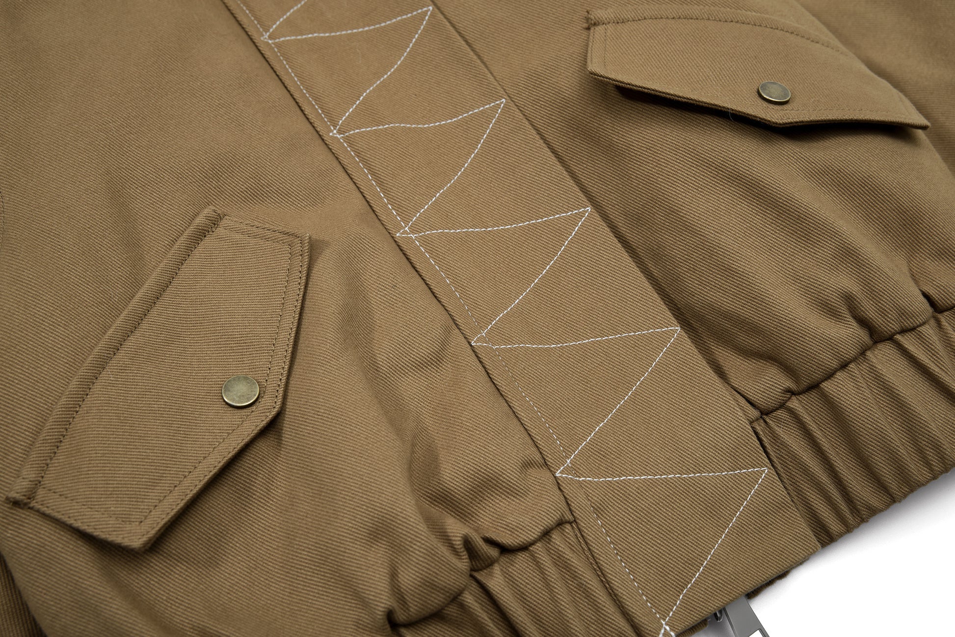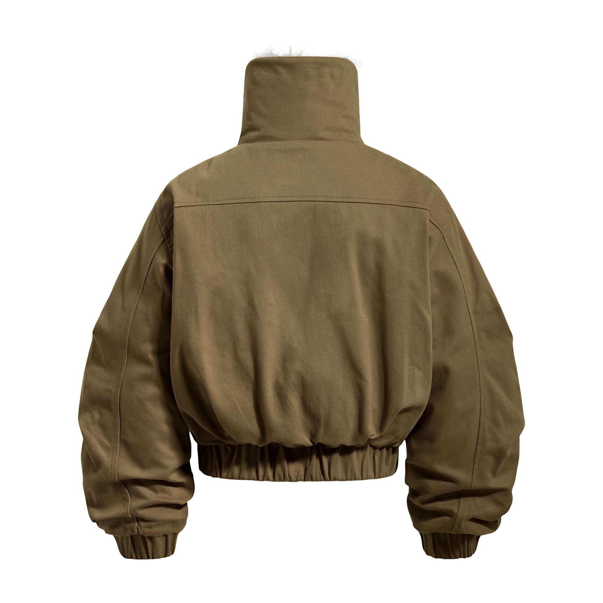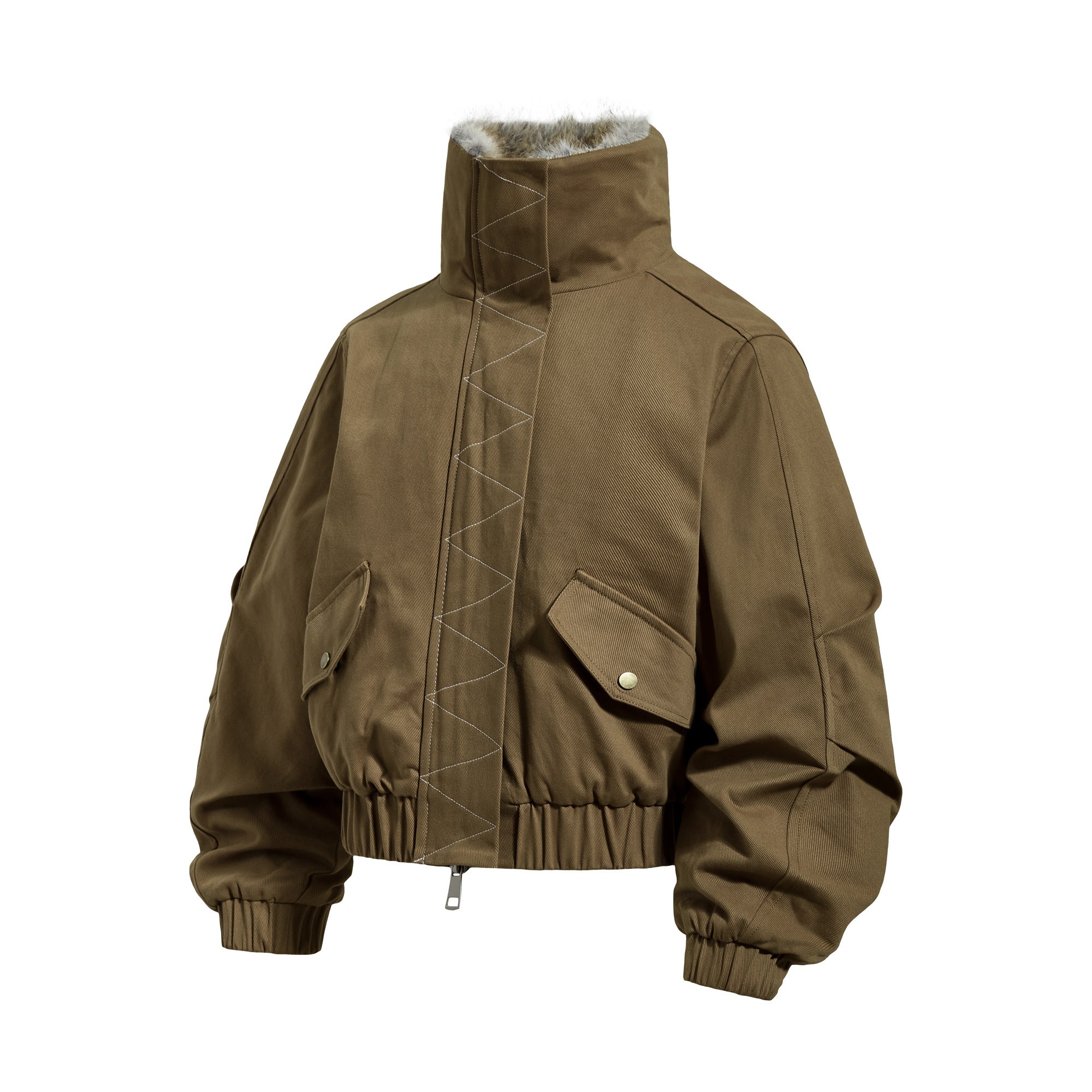 Clothing details: High-neck stand collar with inner faux-fur lining, front zipper with zigzag stitched placket, oversized flap utility pockets, elasticated hem and cuffs, cropped relaxed fit, reinforced panel construction for durability.