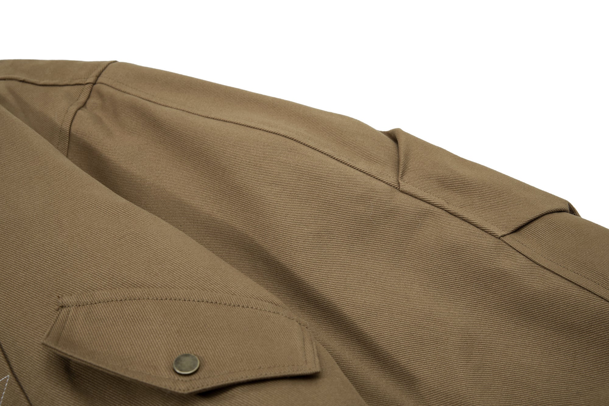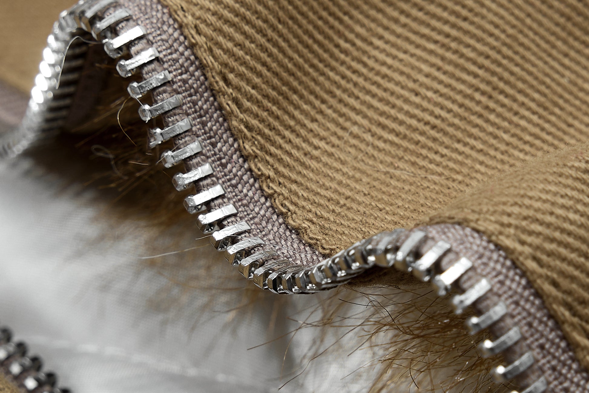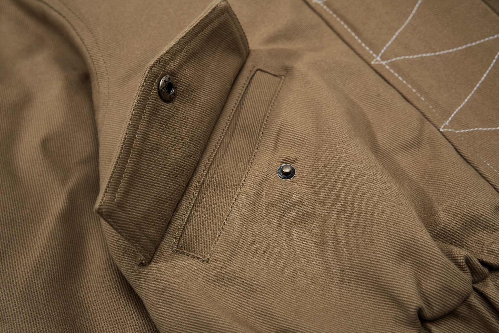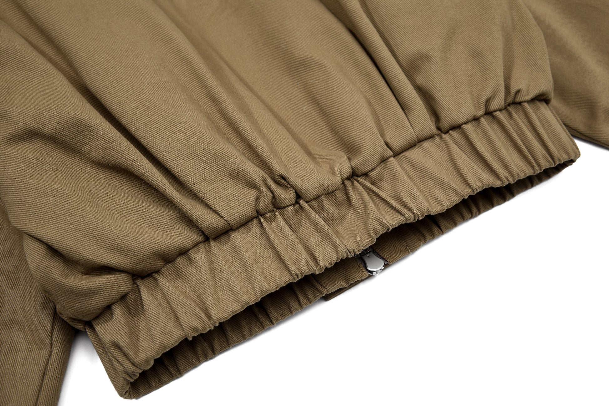 Clothing details: High-neck stand collar with inner faux-fur lining, front zipper with zigzag stitched placket, oversized flap utility pockets, elasticated hem and cuffs, cropped relaxed fit, reinforced panel construction for durability.