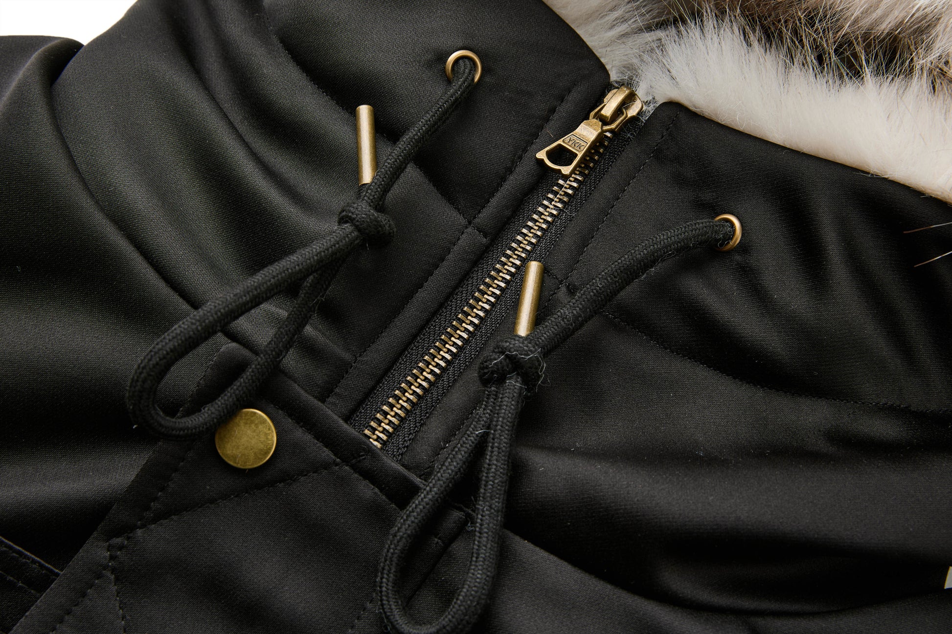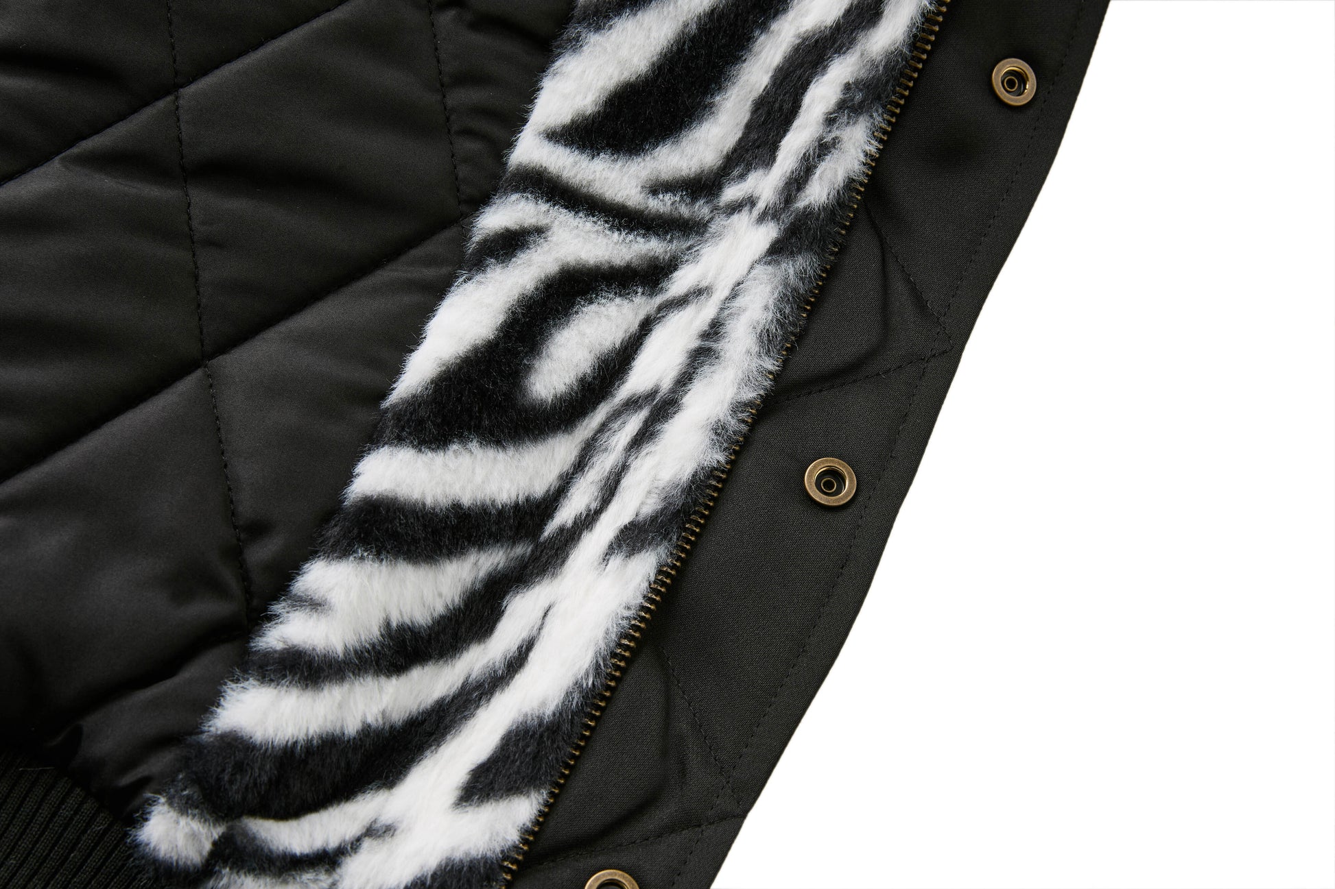 Clothing details: Faux-fur lined hood with contrast patterned interior, adjustable strap detailing across the chest, snap-button and zip front closure, utility-style flap pockets, ribbed cuffs and hem, padded construction for warmth, relaxed bomber fit.