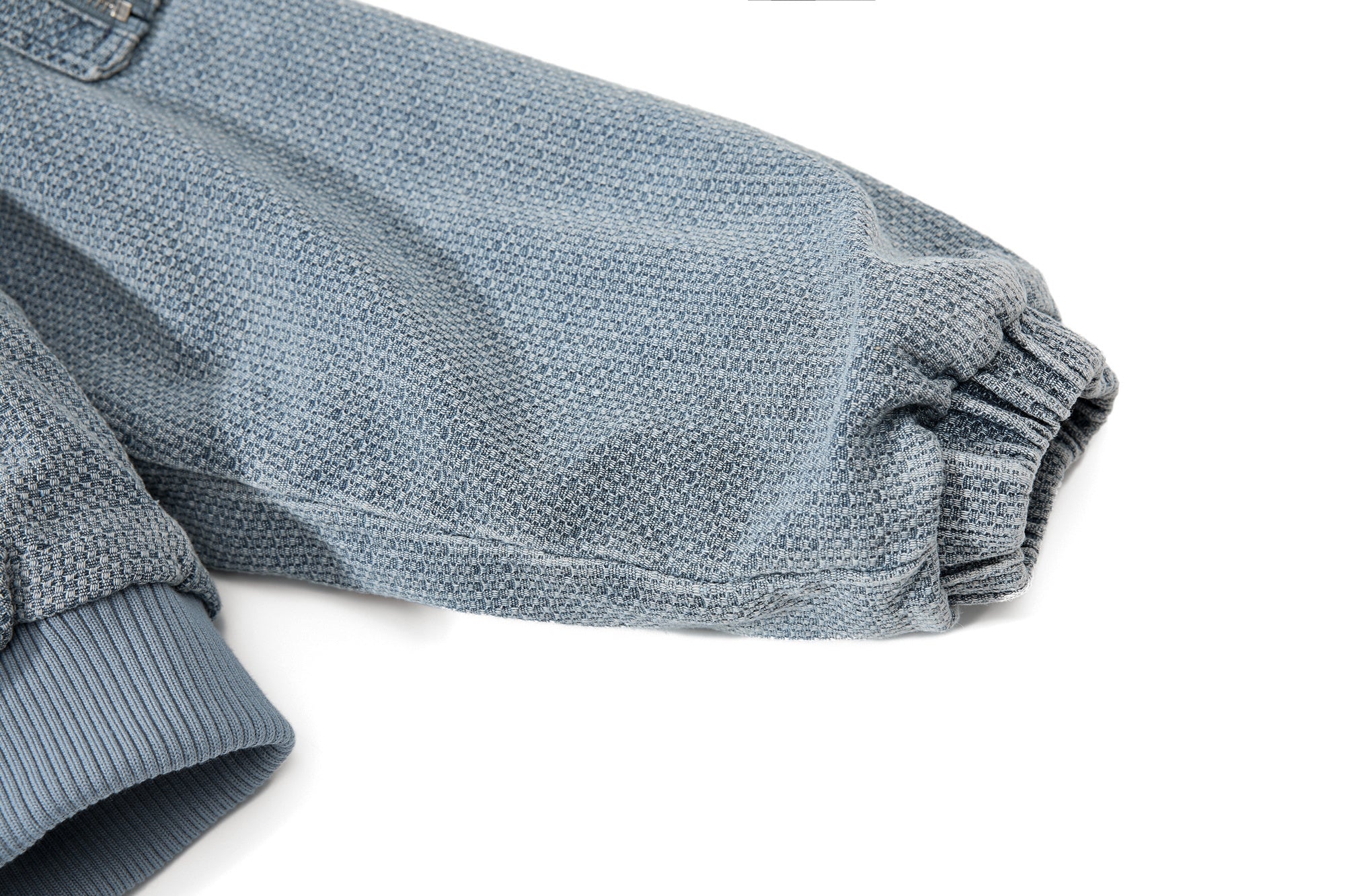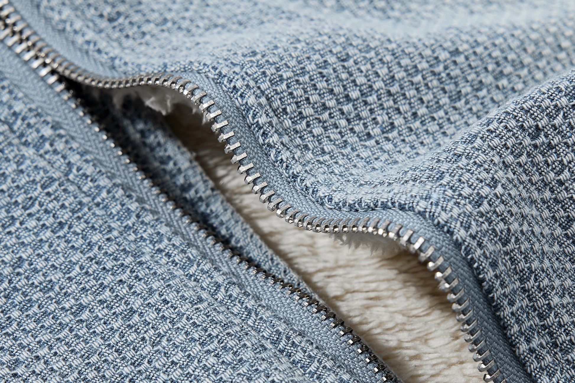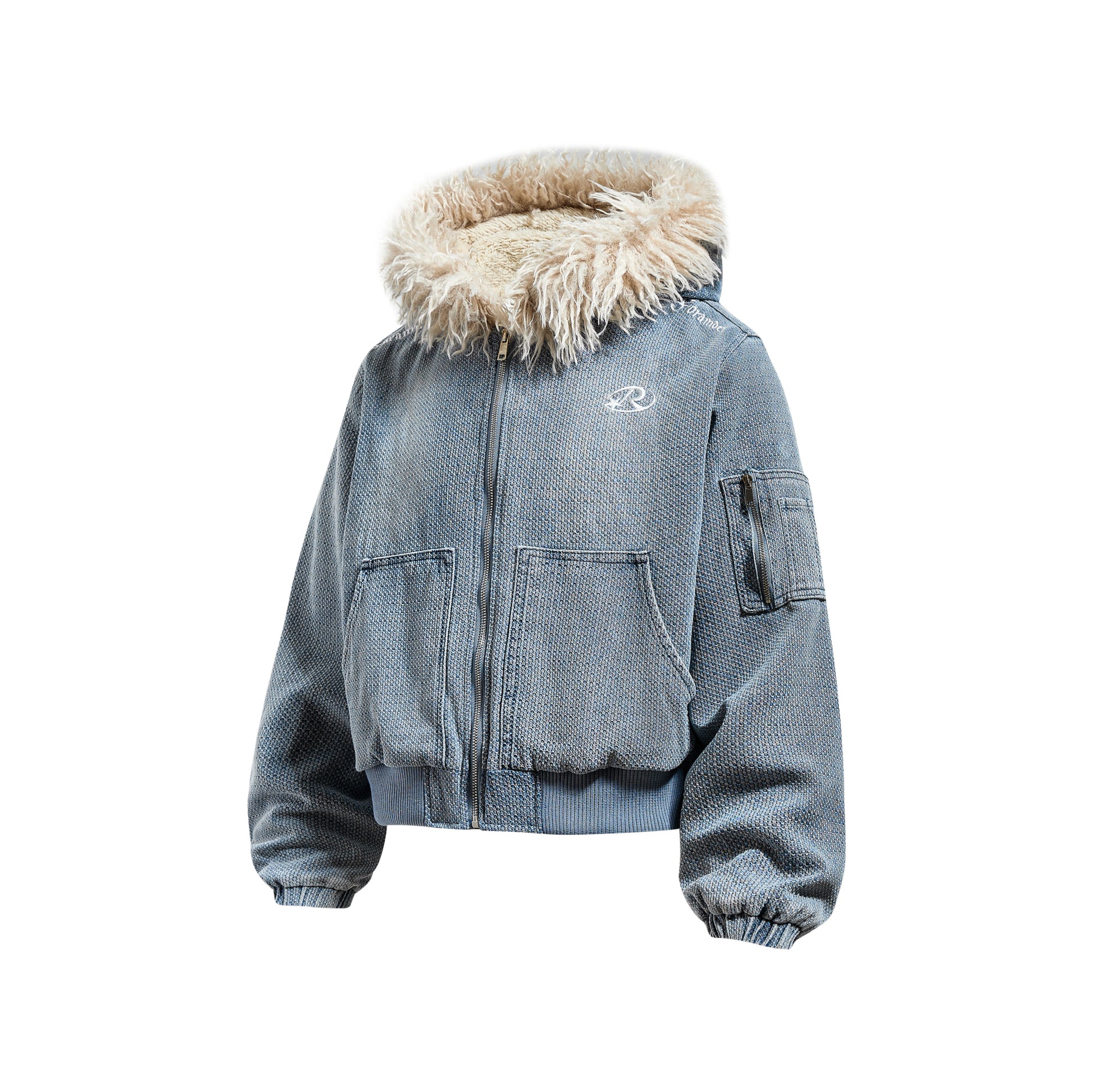 Clothing details: Textured washed exterior, faux-fur hood trim, soft sherpa lining, front full-zip closure, dual front patch pockets, utility sleeve pocket with zipper, ribbed cuffs and hem, relaxed cropped silhouette.