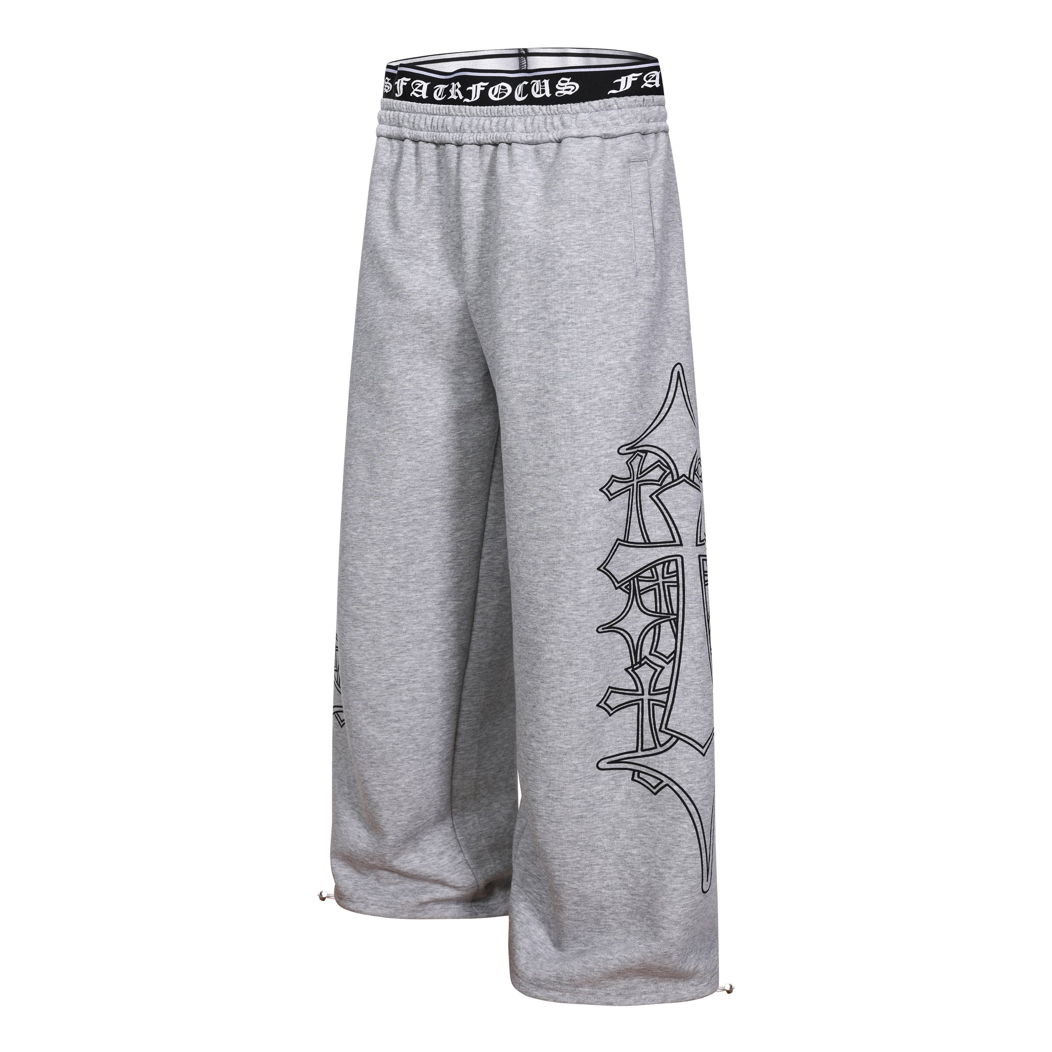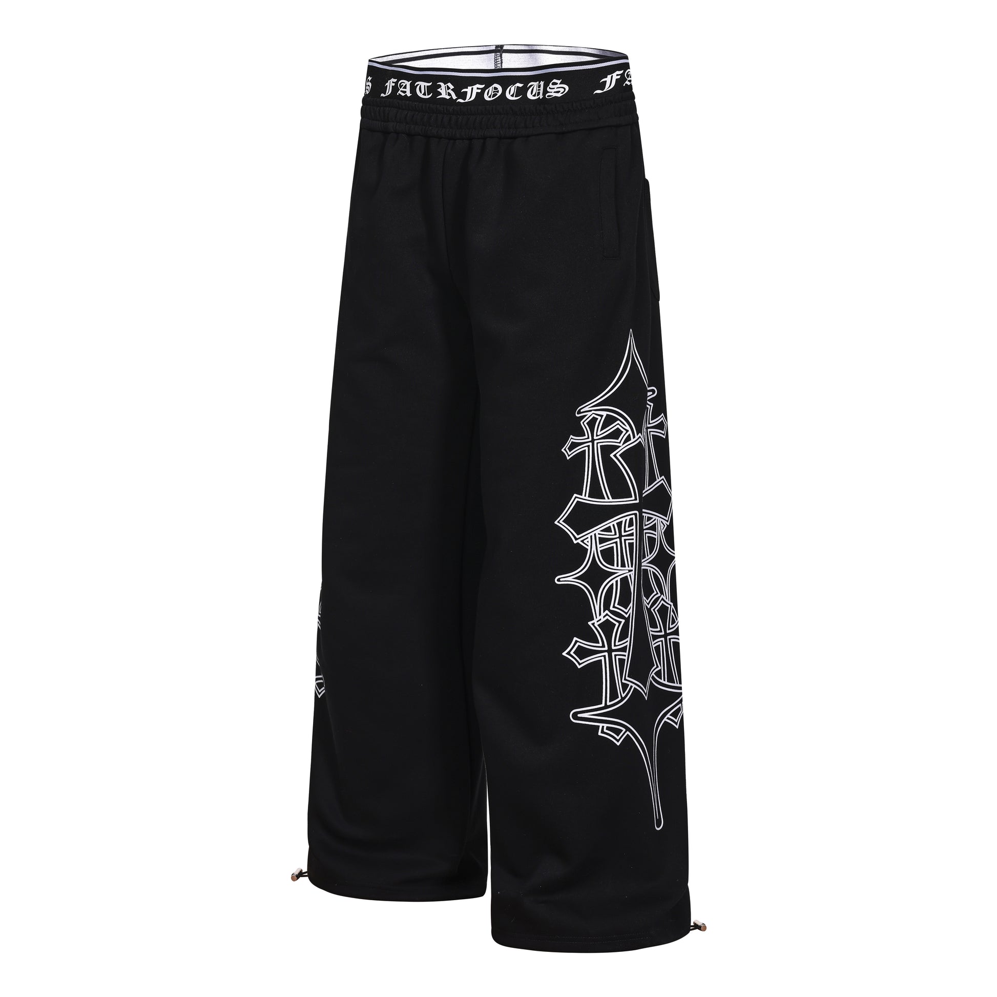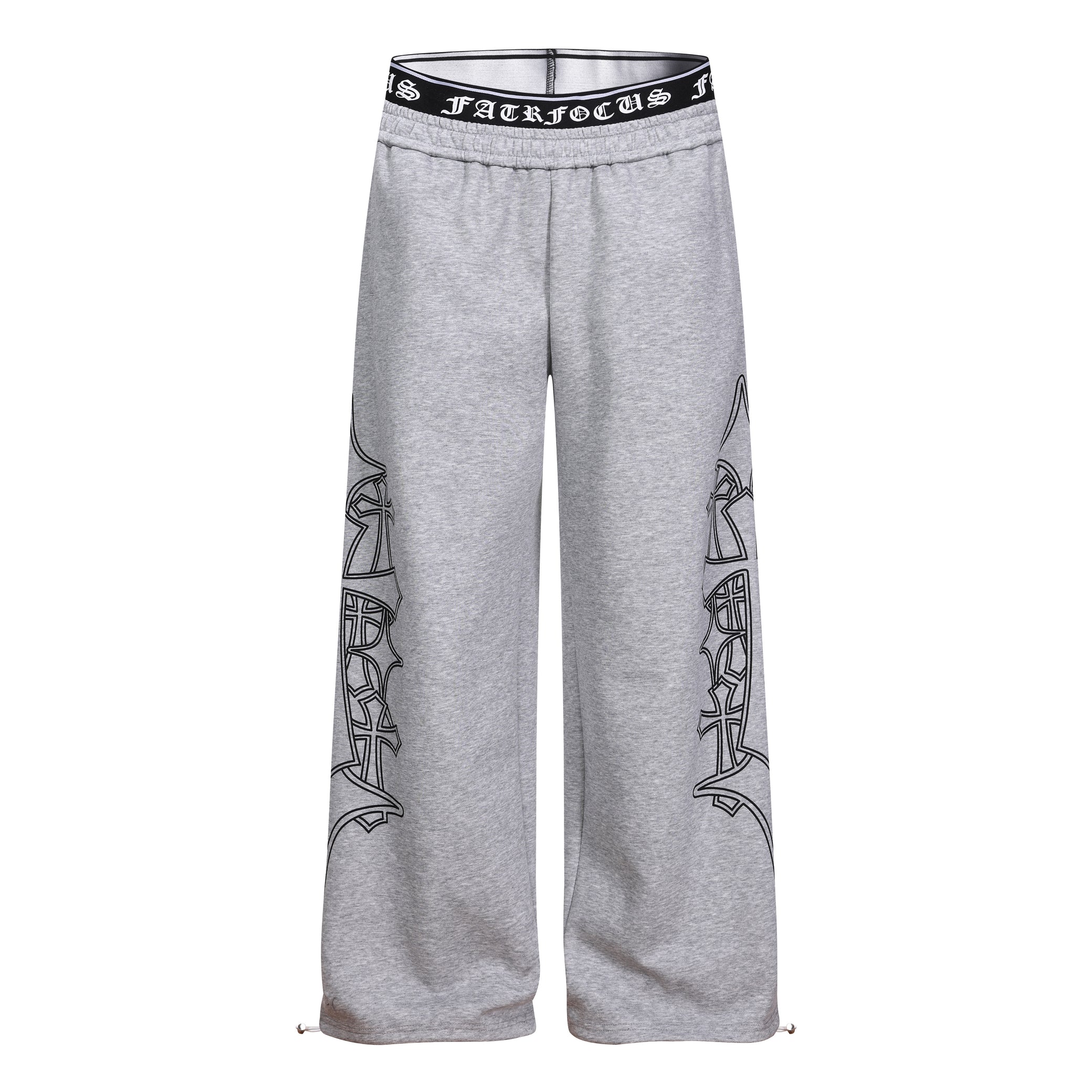 Clothing details: Gothic outline graphic, elastic waistband with logo detail, wide-leg fit, adjustable hem drawcords