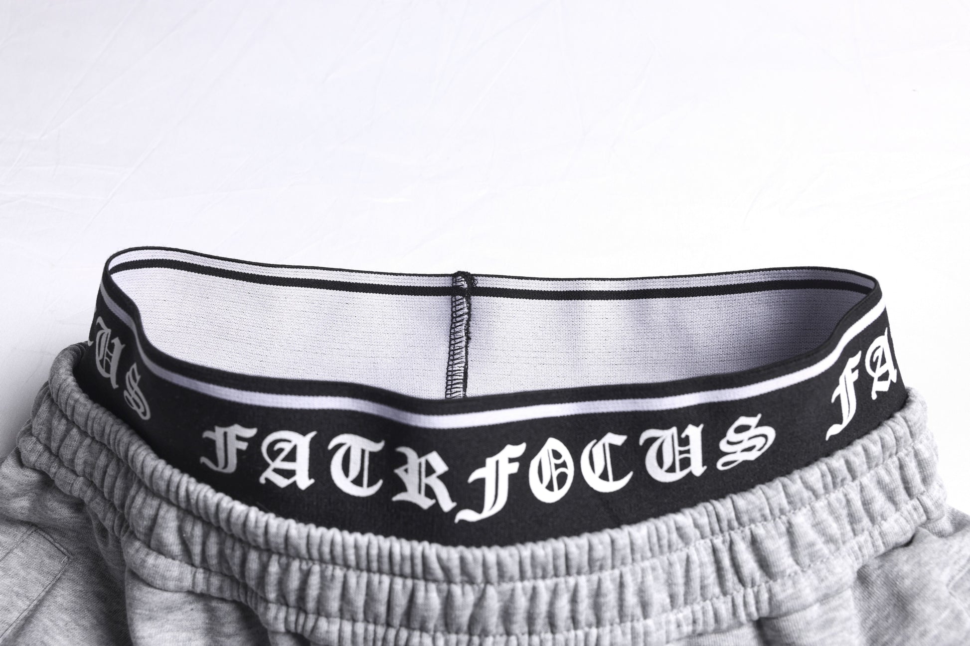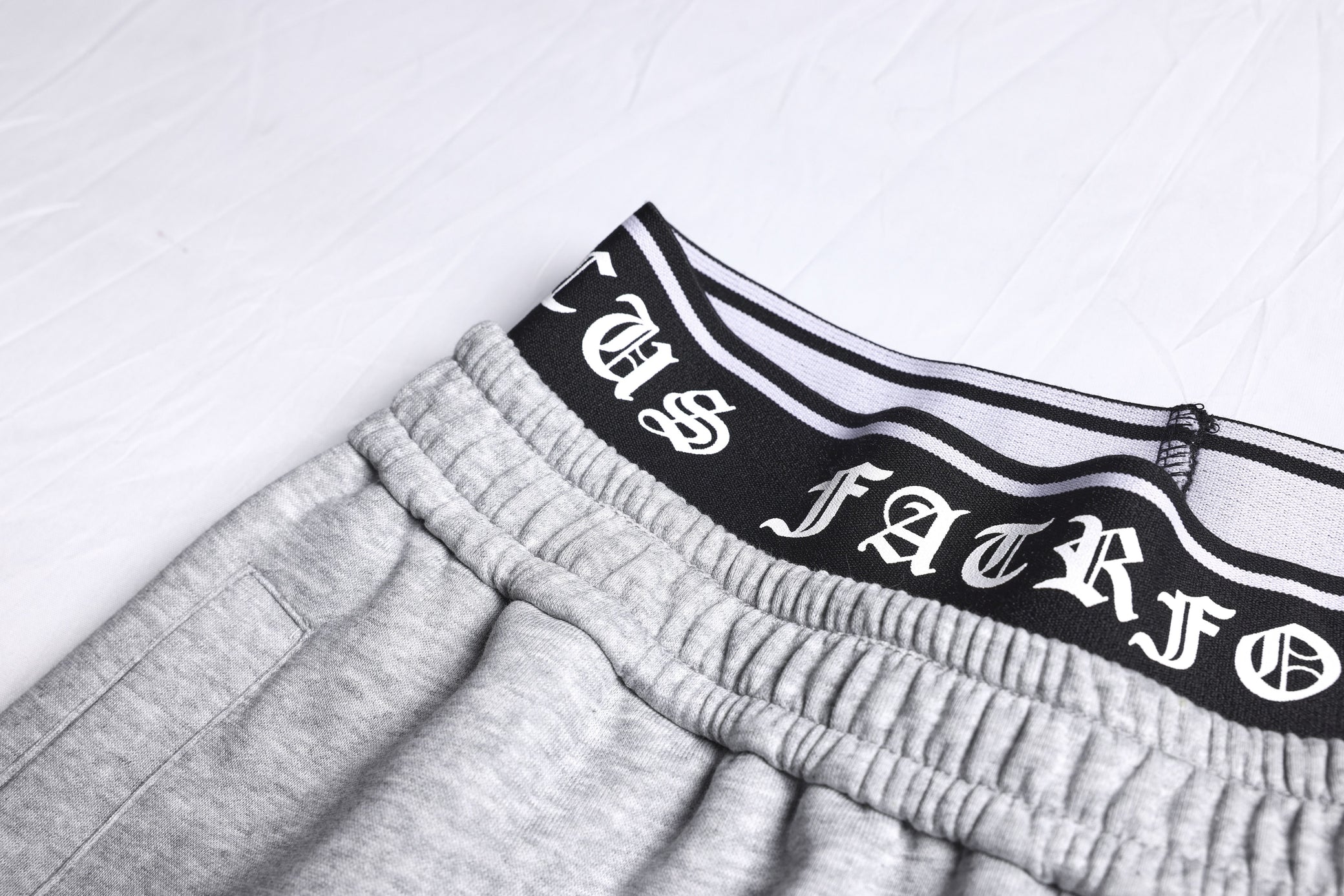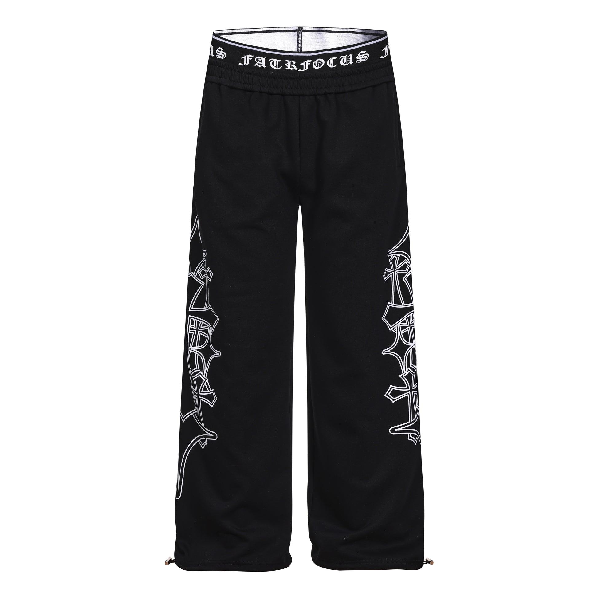 Clothing details: Gothic outline graphic, elastic waistband with logo detail, wide-leg fit, adjustable hem drawcords