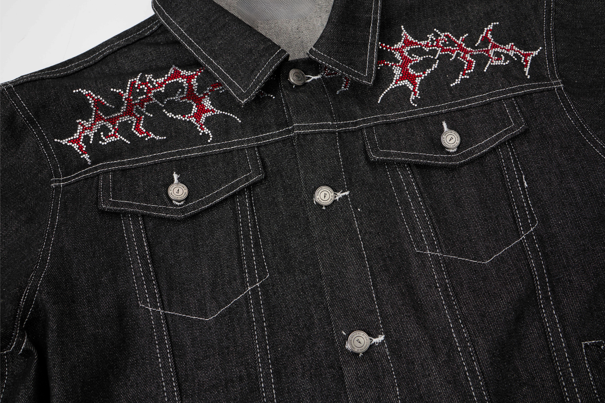 Clothing details: Embroidered graphics, button-front closure, chest flap pockets, classic denim construction.