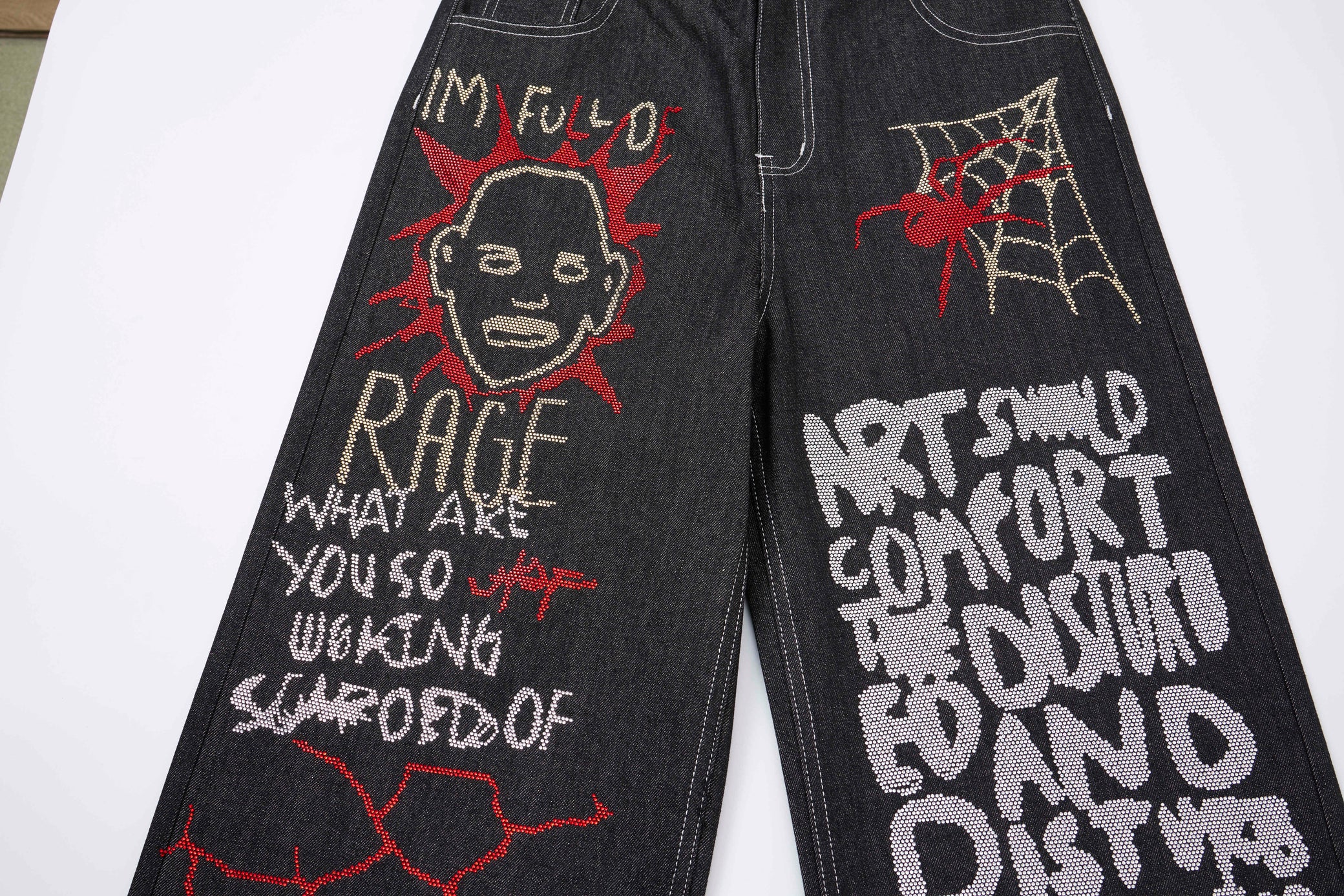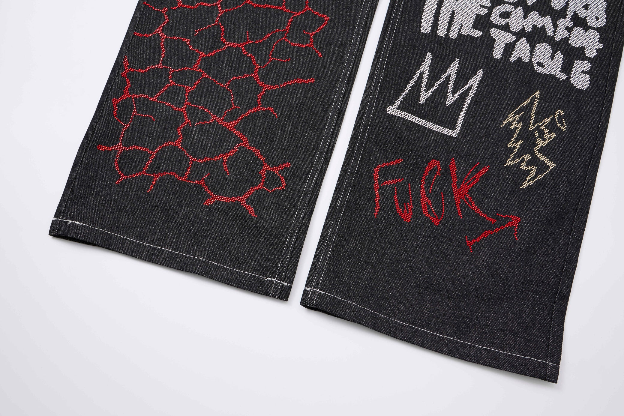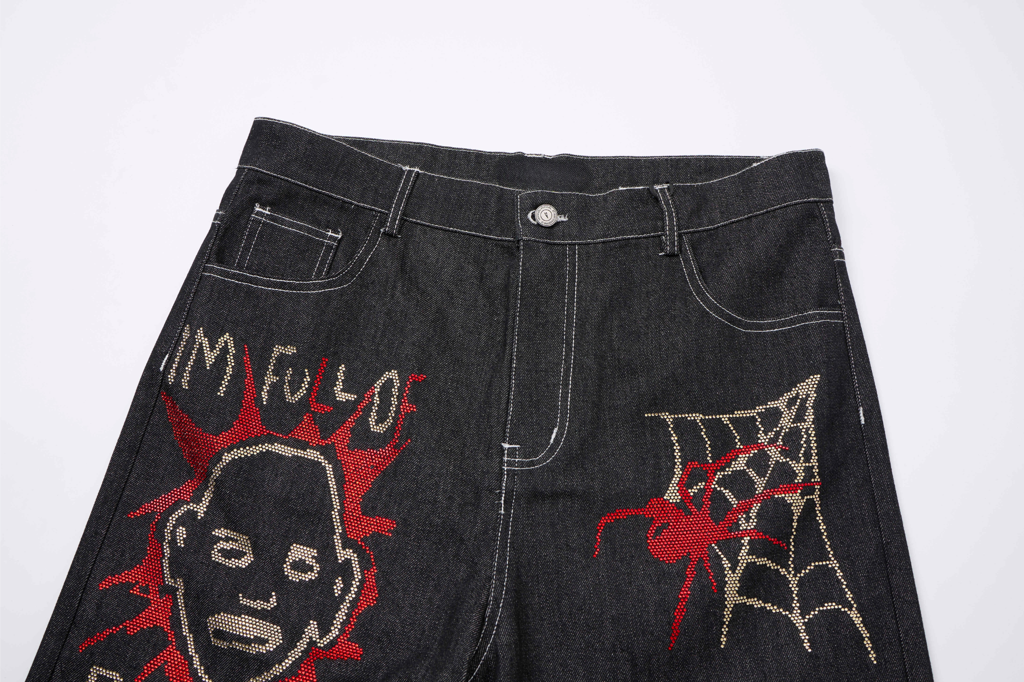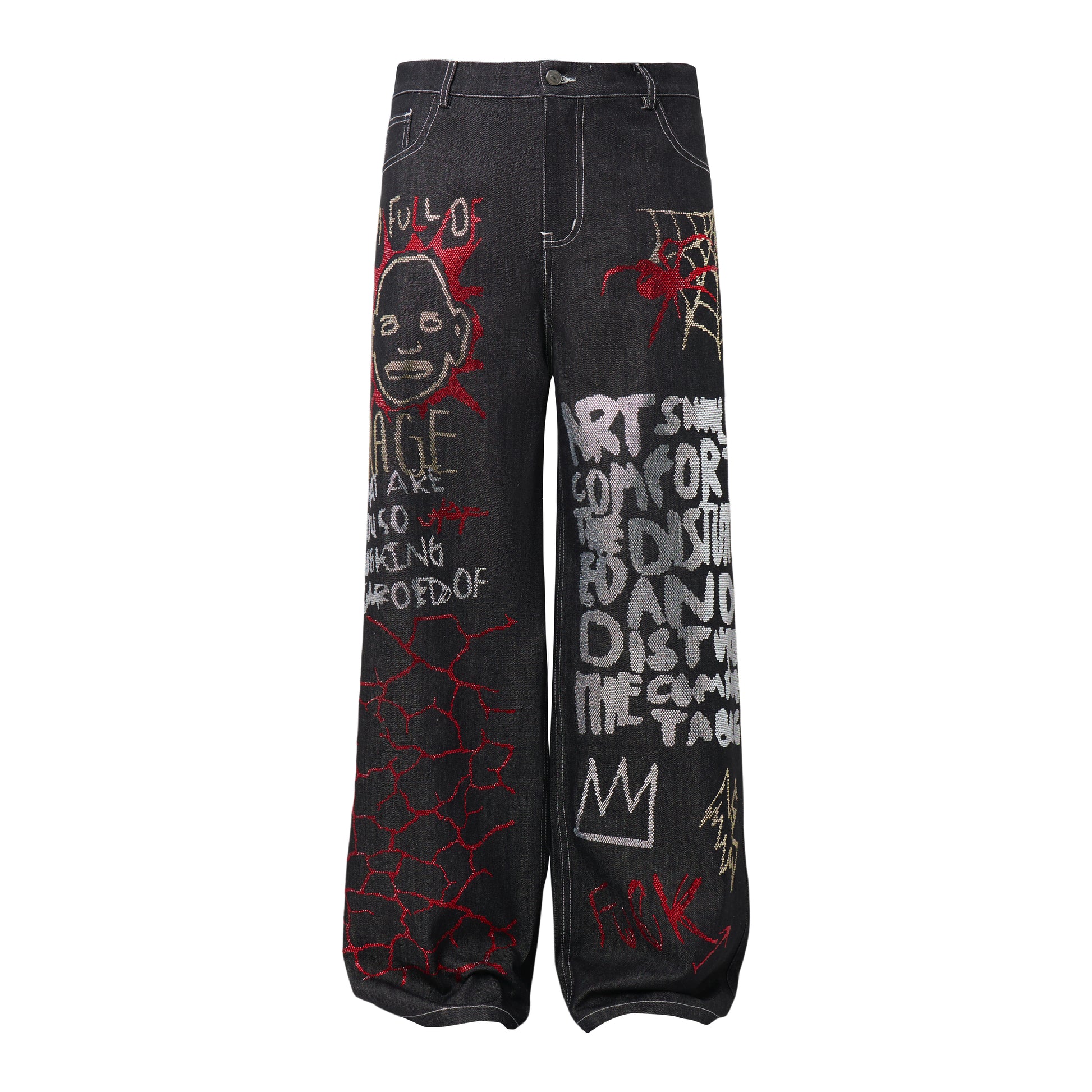The Omirad Graphic Denim Pants feature bold graffiti-style graphics and contrast artwork that add a raw, rebellious edge to a classic denim silhouette. Perfect for elevating streetwear looks, these pants combine everyday comfort with expressive visual detail.
