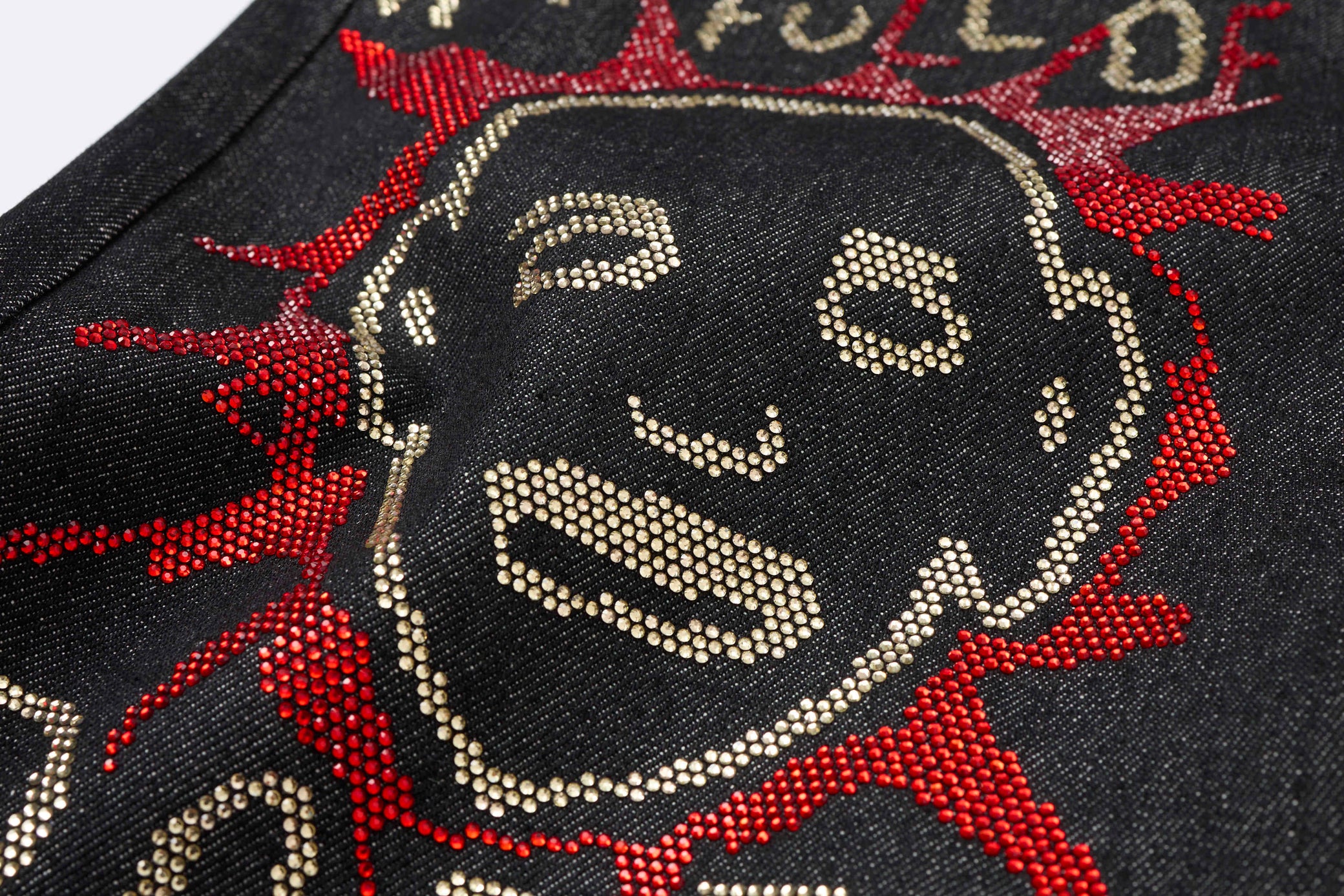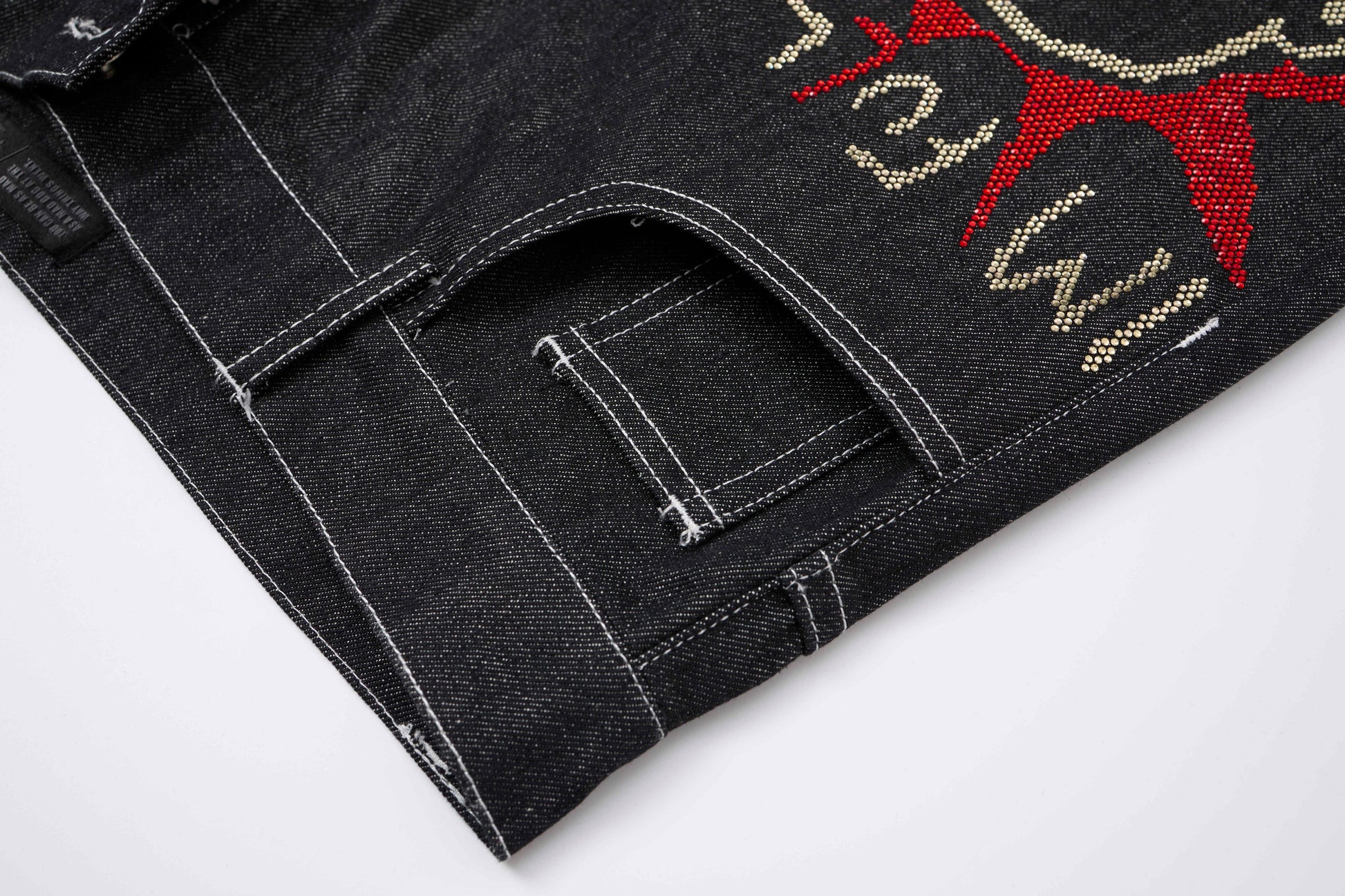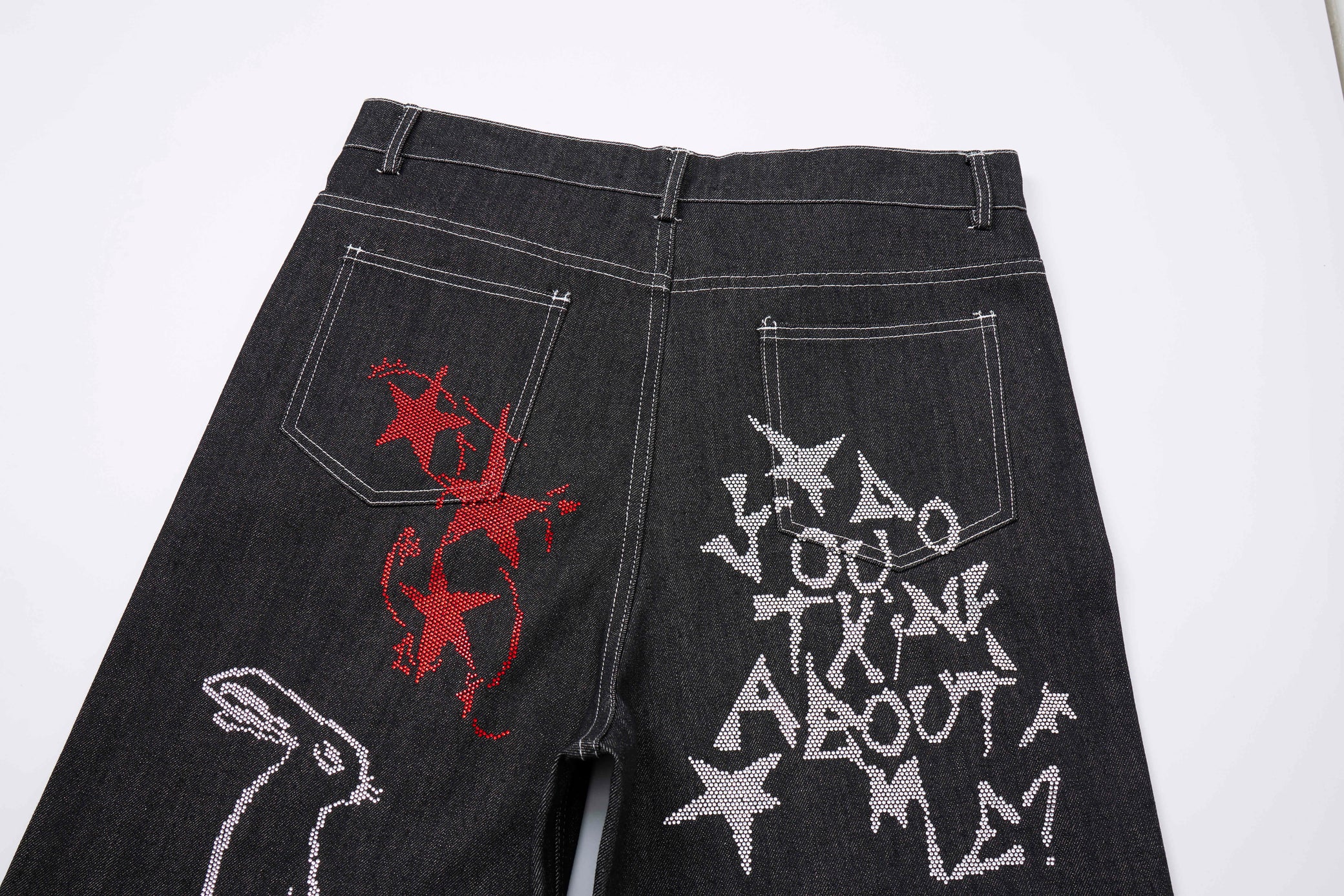 Clothing details: Graphic embroidery/print, classic five-pocket design.
