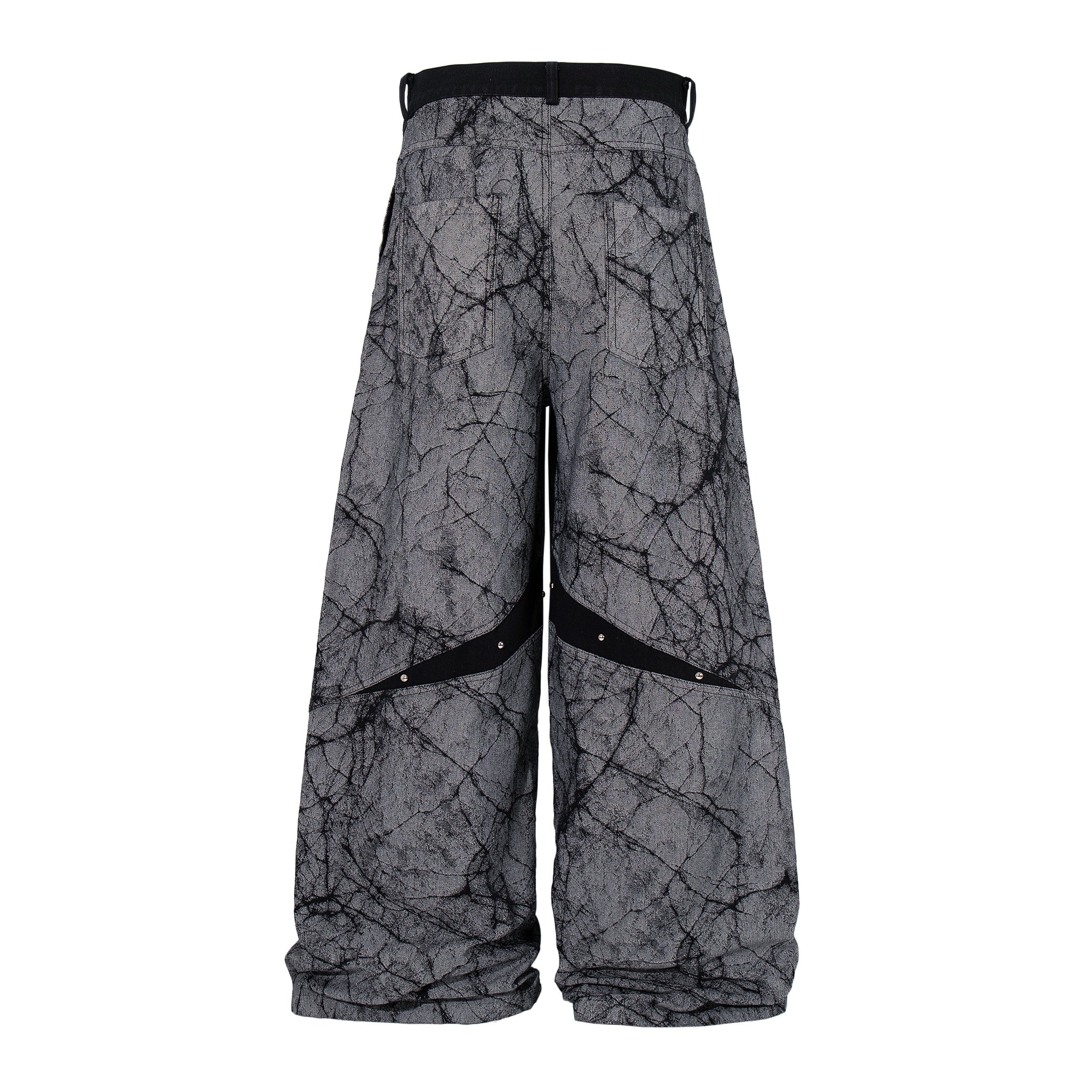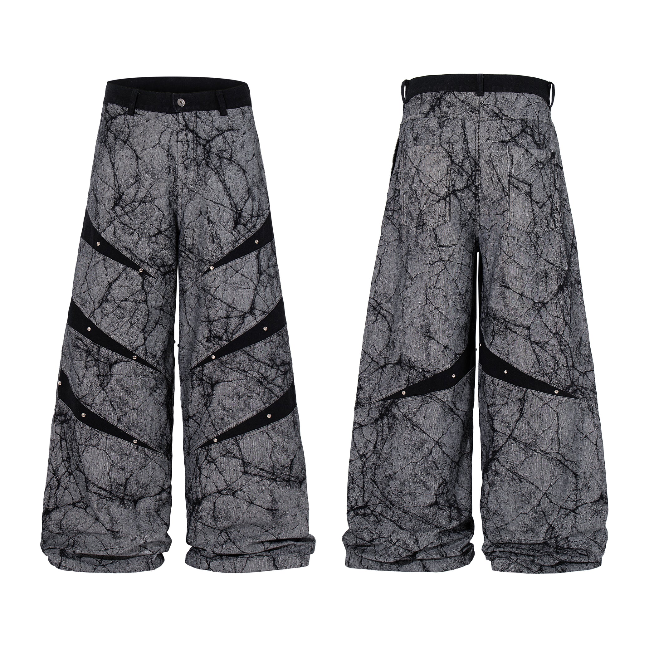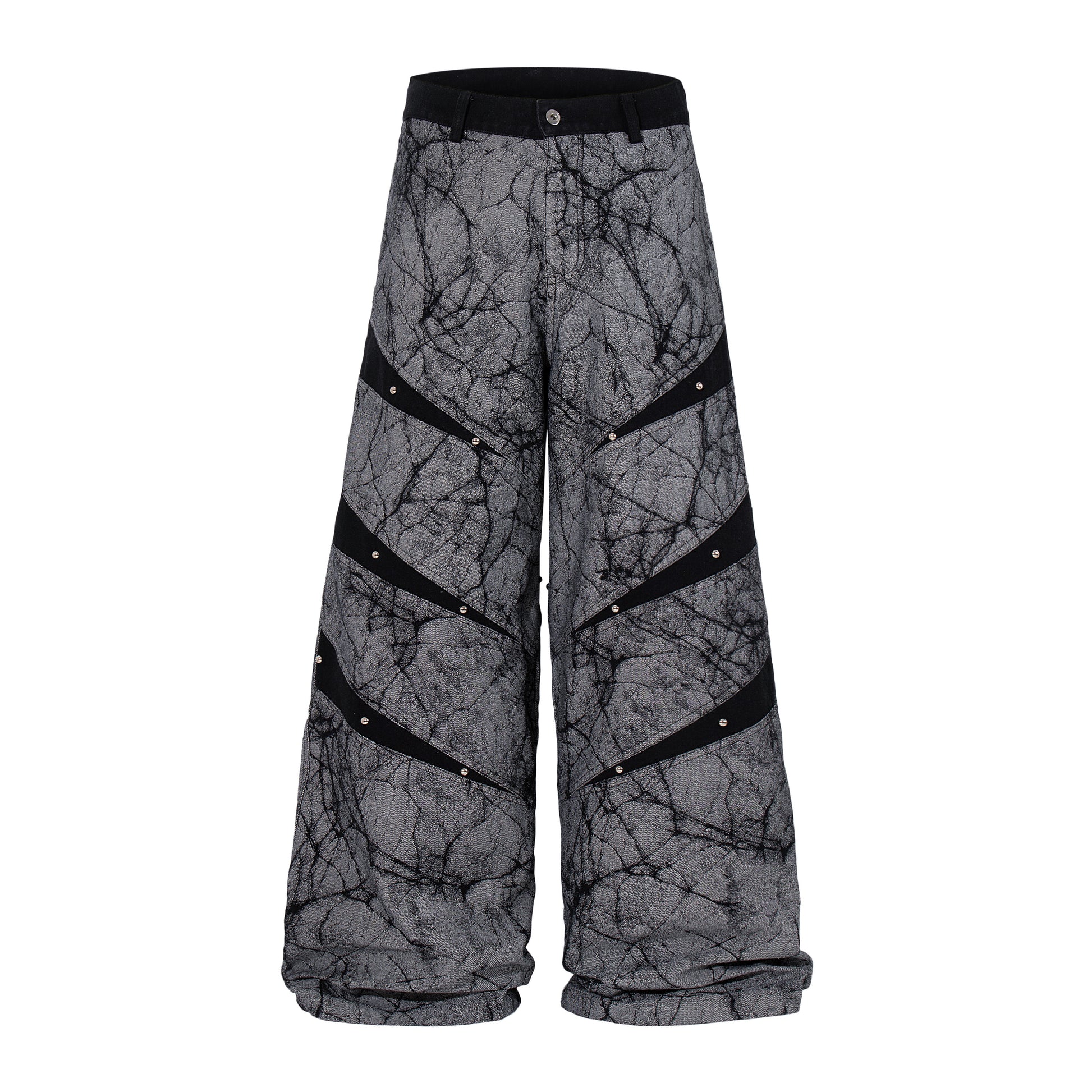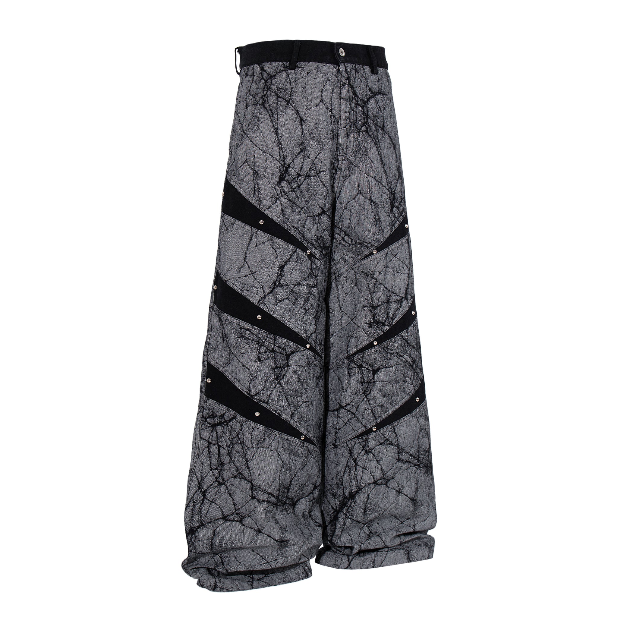 The Omirad Graphic Panel Wide Leg Denim Pants feature a bold wide-leg silhouette combined with an all-over textured graphic print. Designed with angled panel strap detailing secured by metal rivets, these pants create a strong visual structure while maintaining a clean overall profile. The high-rise waist and relaxed cut make them suitable for statement streetwear styling.