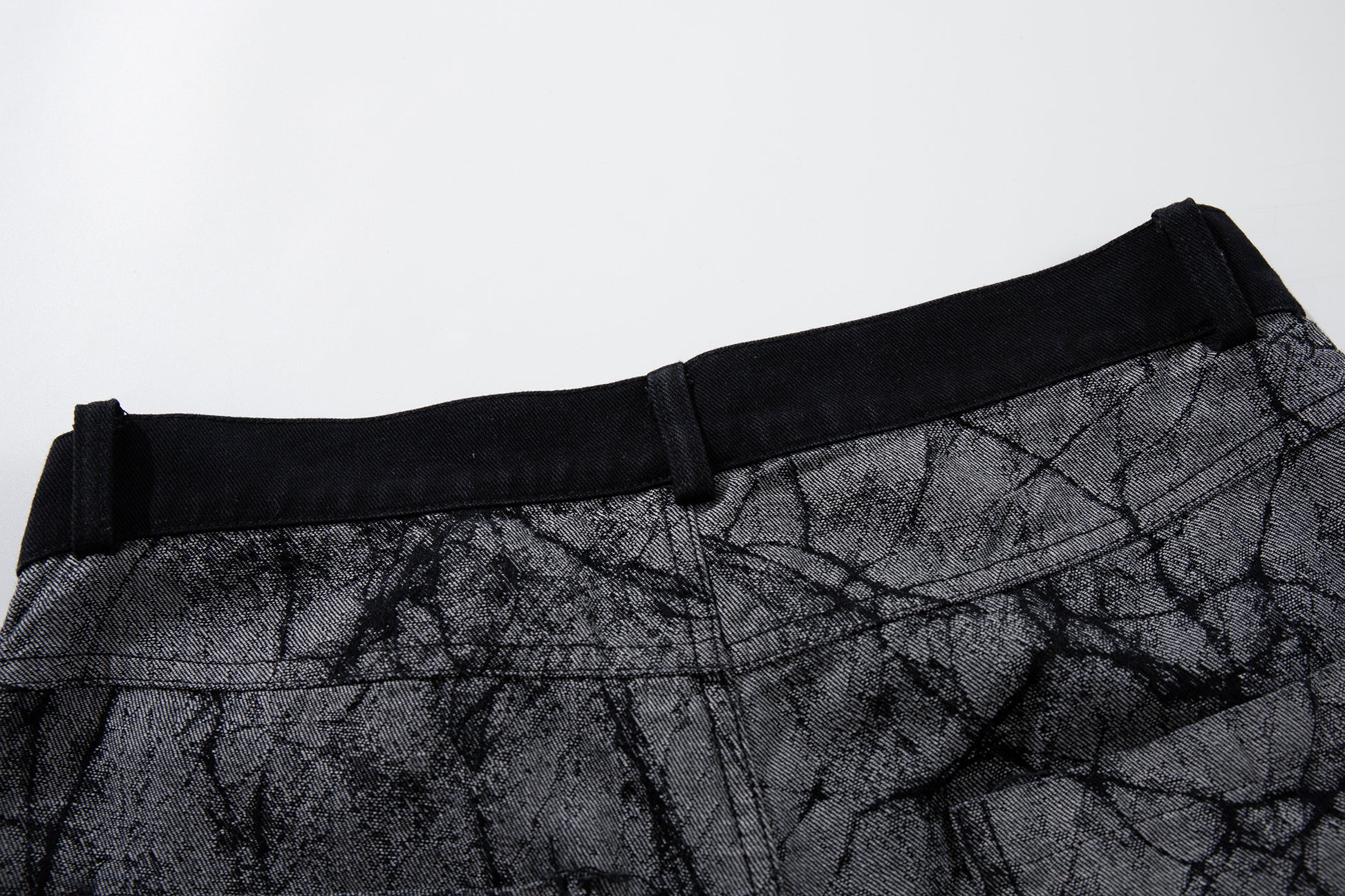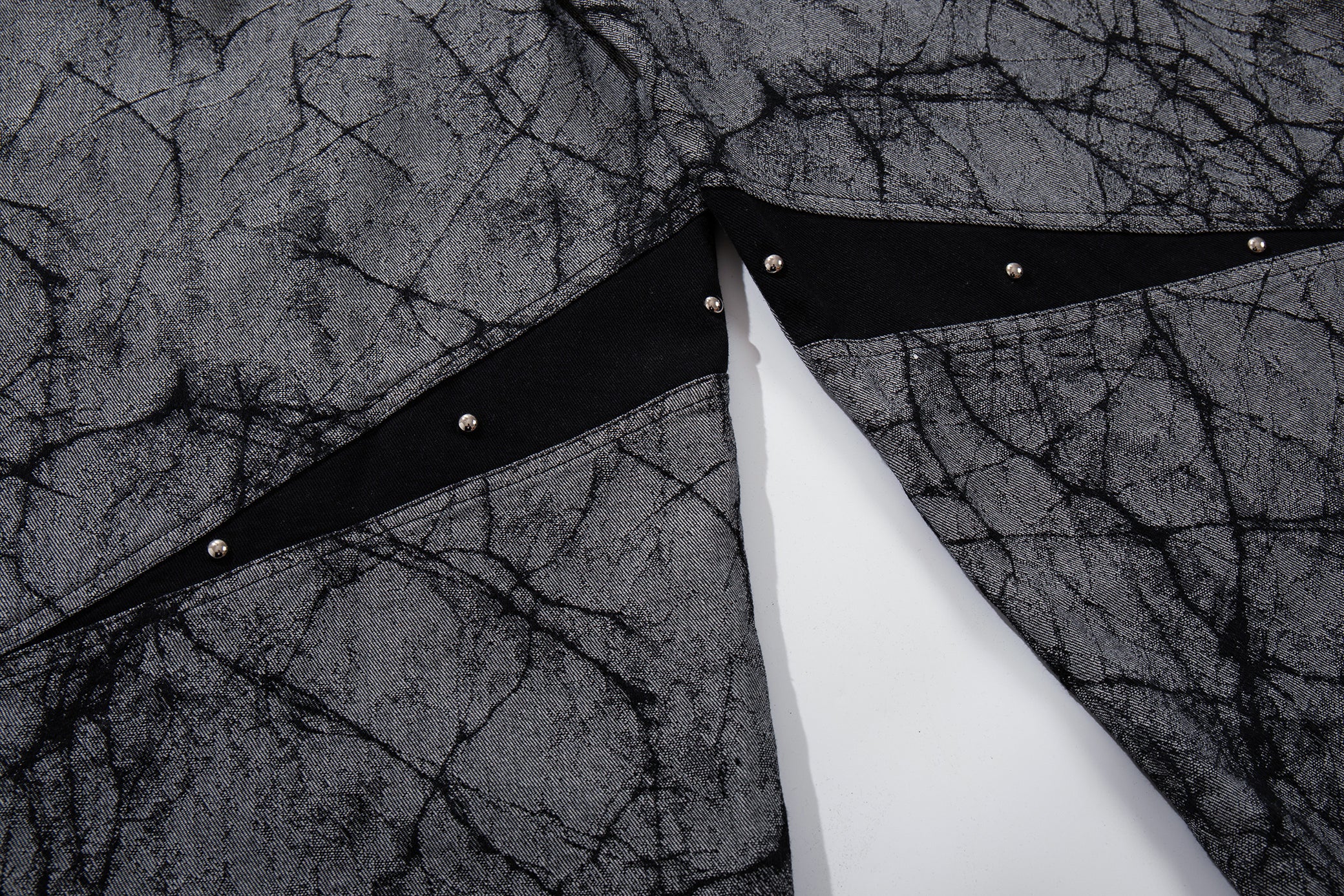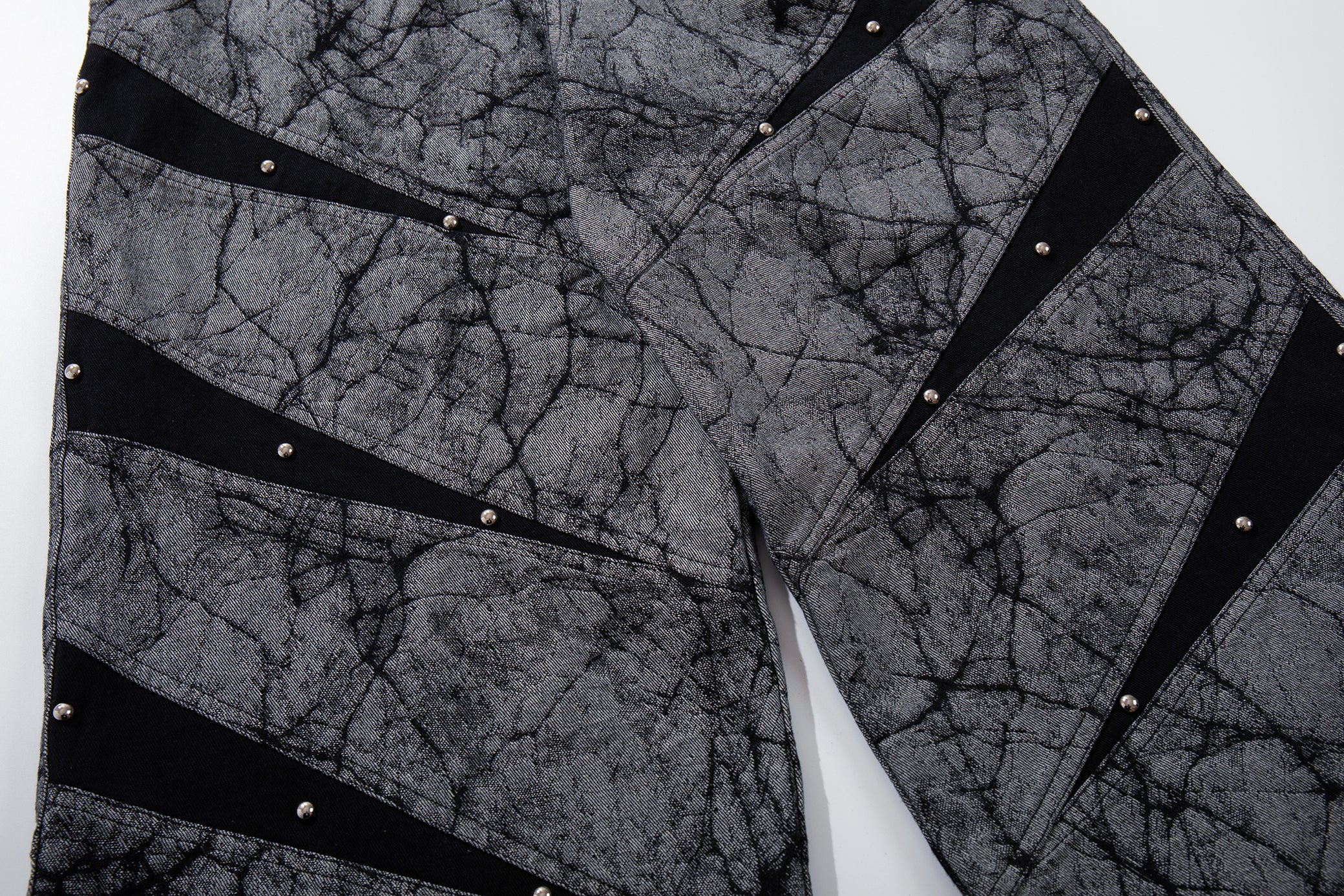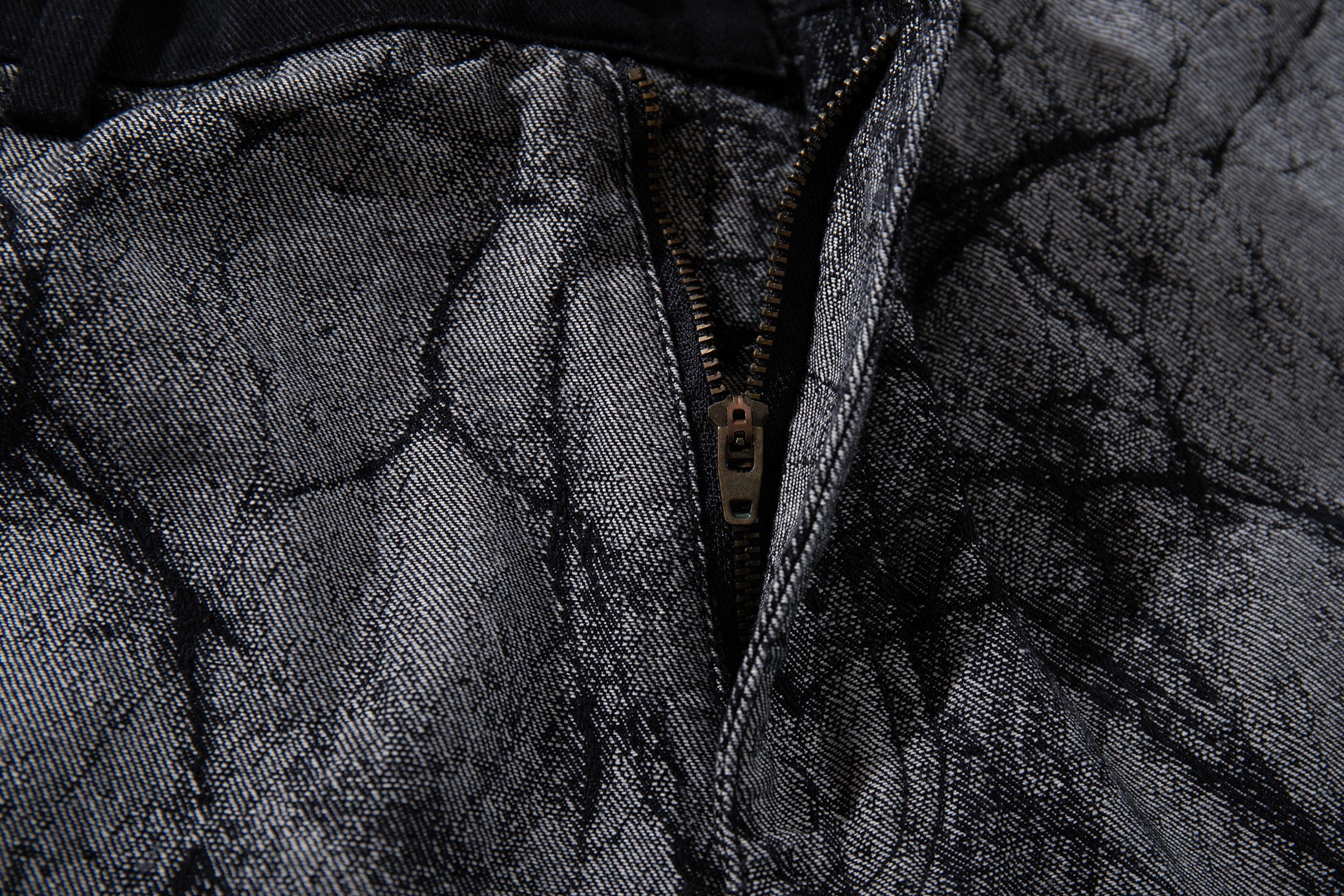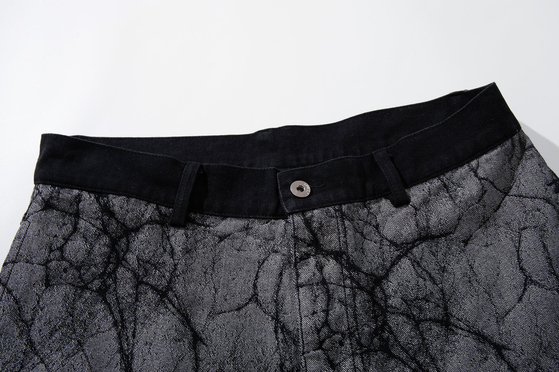 The Omirad Graphic Panel Wide Leg Denim Pants feature a bold wide-leg silhouette combined with an all-over textured graphic print. Designed with angled panel strap detailing secured by metal rivets, these pants create a strong visual structure while maintaining a clean overall profile. The high-rise waist and relaxed cut make them suitable for statement streetwear styling.