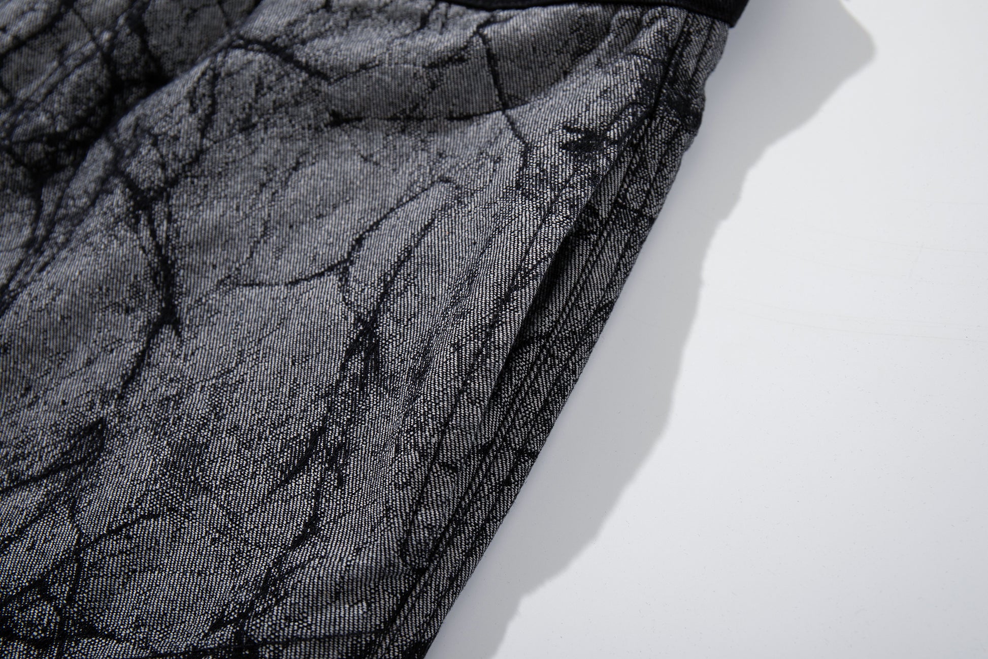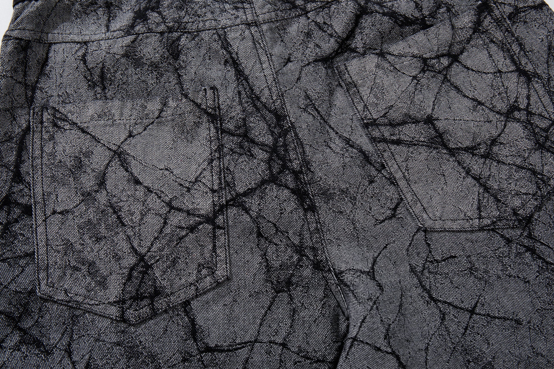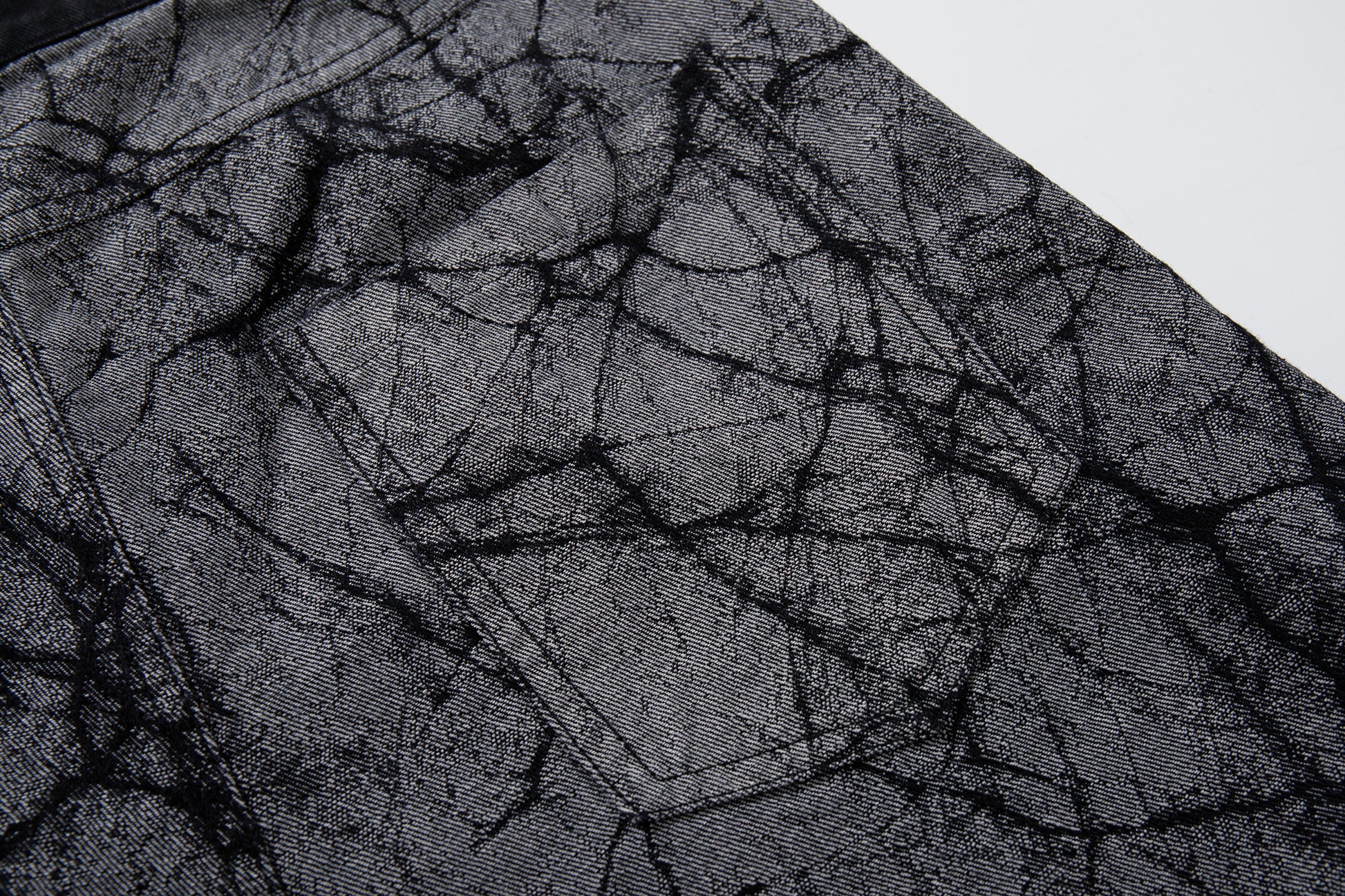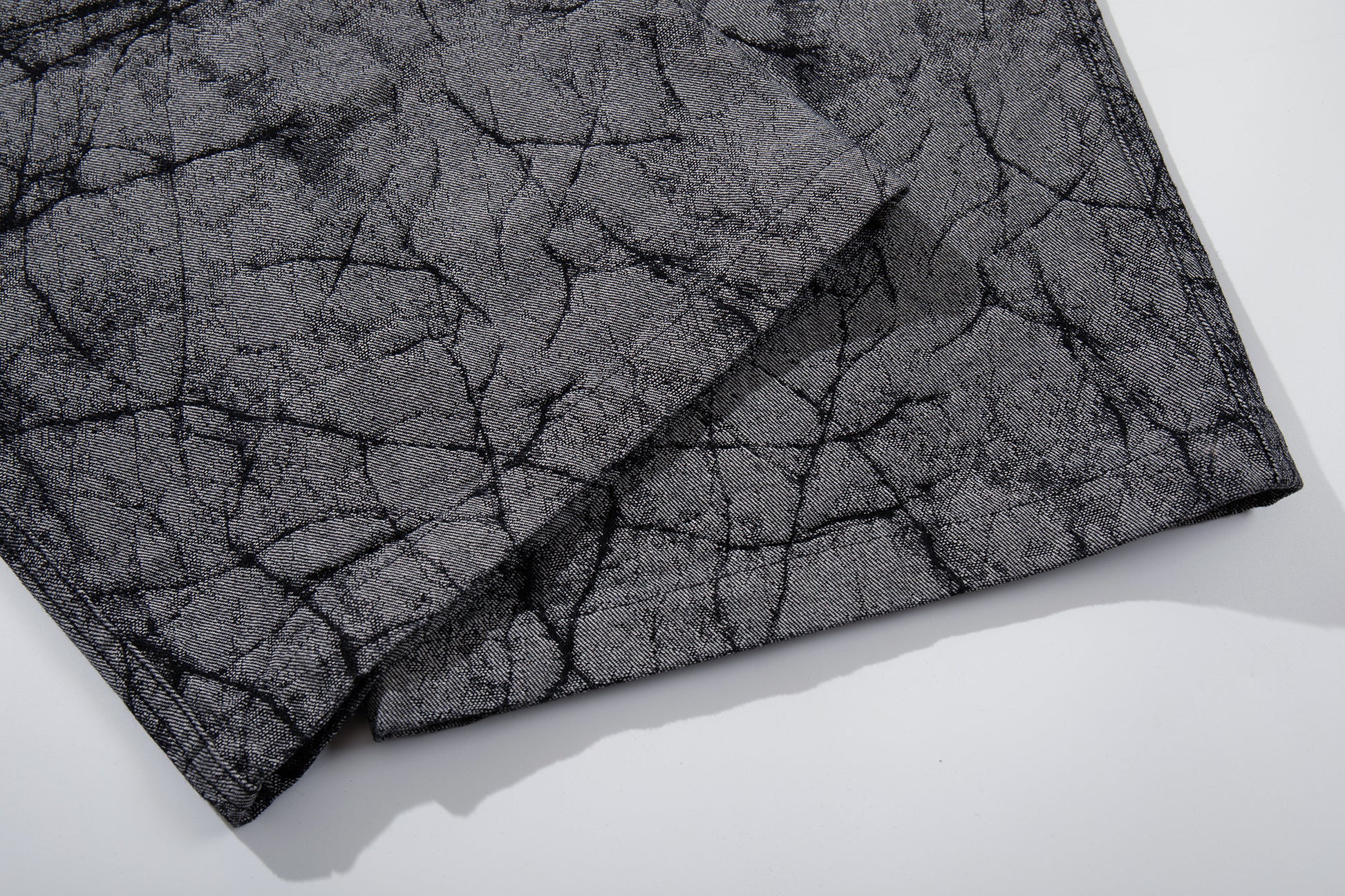 The Omirad Graphic Panel Wide Leg Denim Pants feature a bold wide-leg silhouette combined with an all-over textured graphic print. Designed with angled panel strap detailing secured by metal rivets, these pants create a strong visual structure while maintaining a clean overall profile. The high-rise waist and relaxed cut make them suitable for statement streetwear styling.