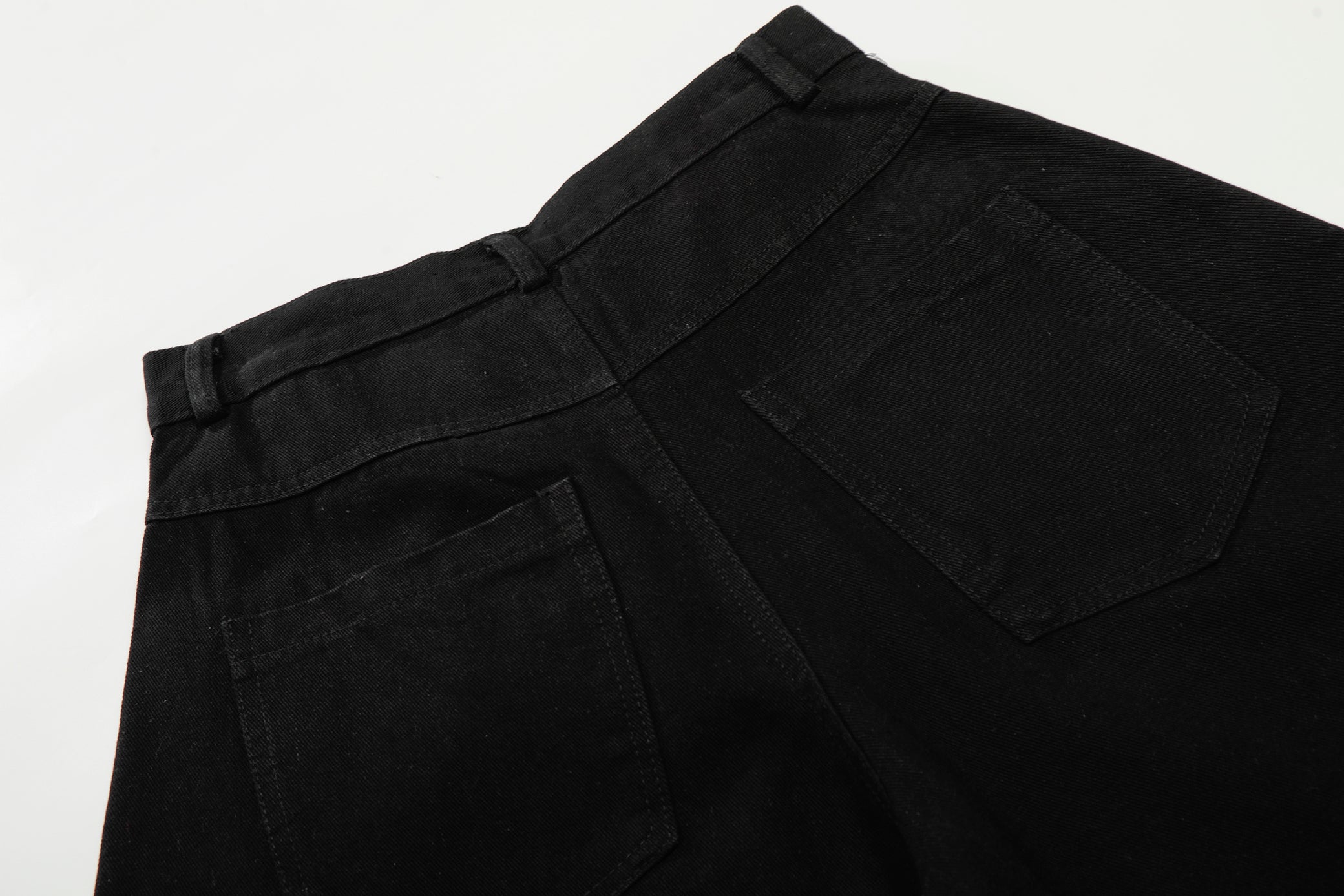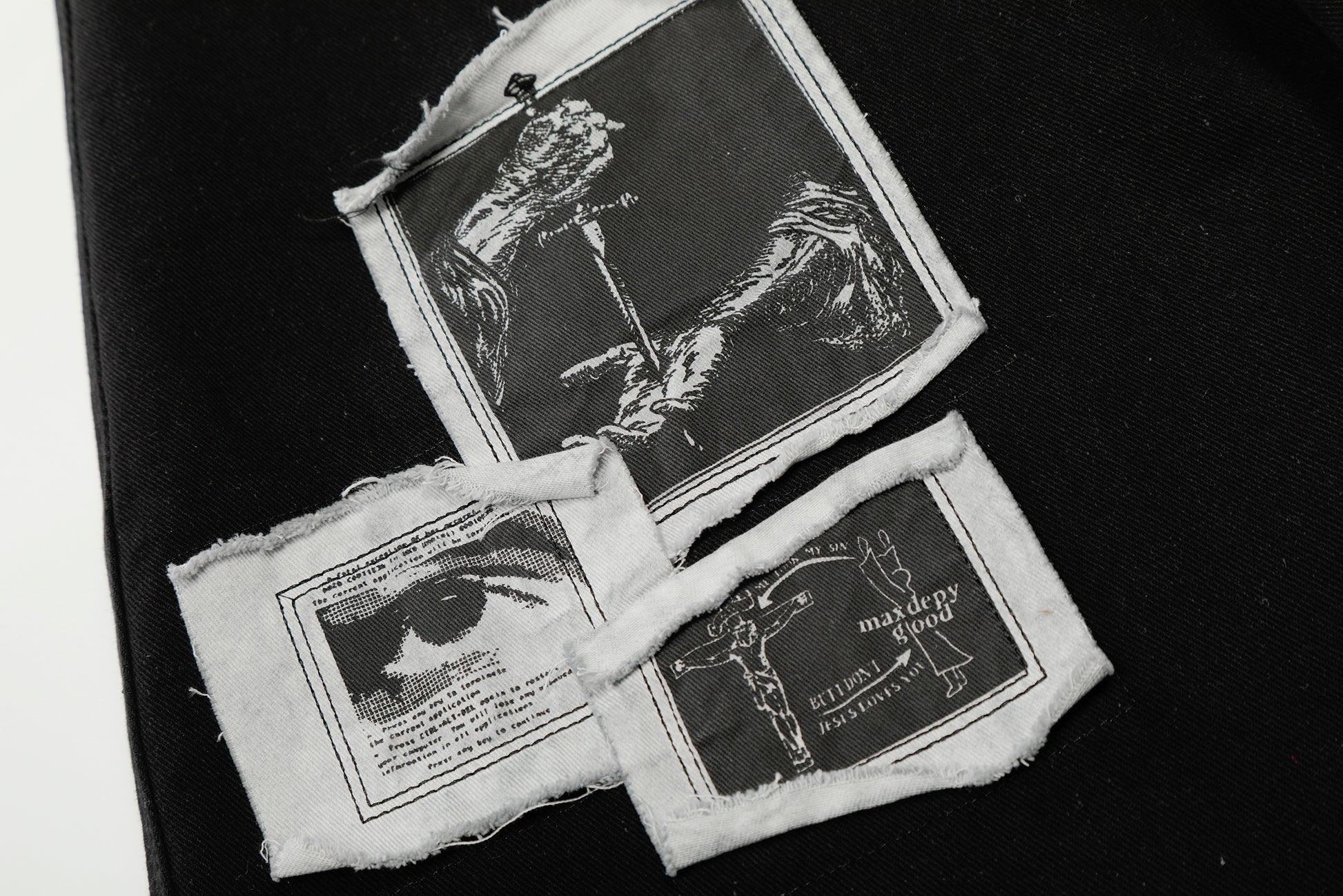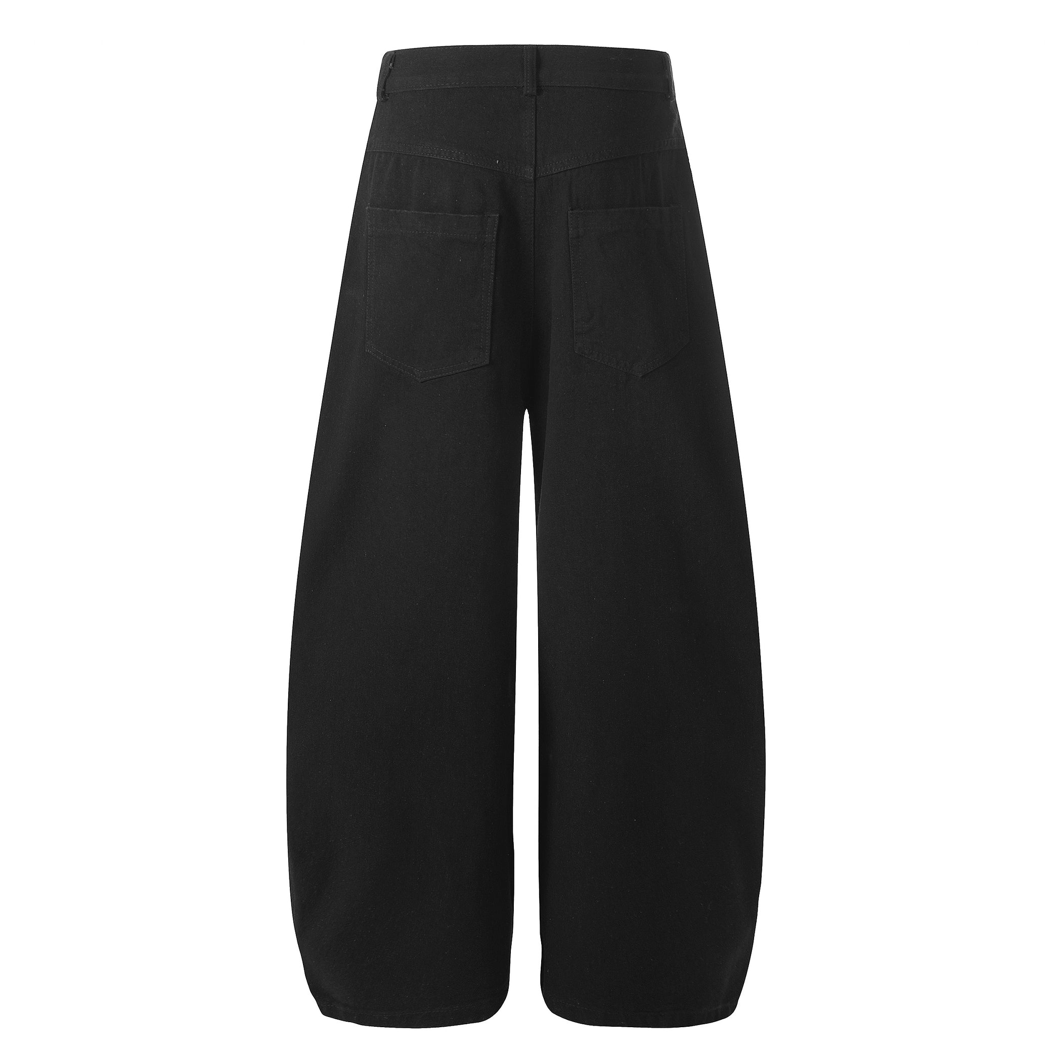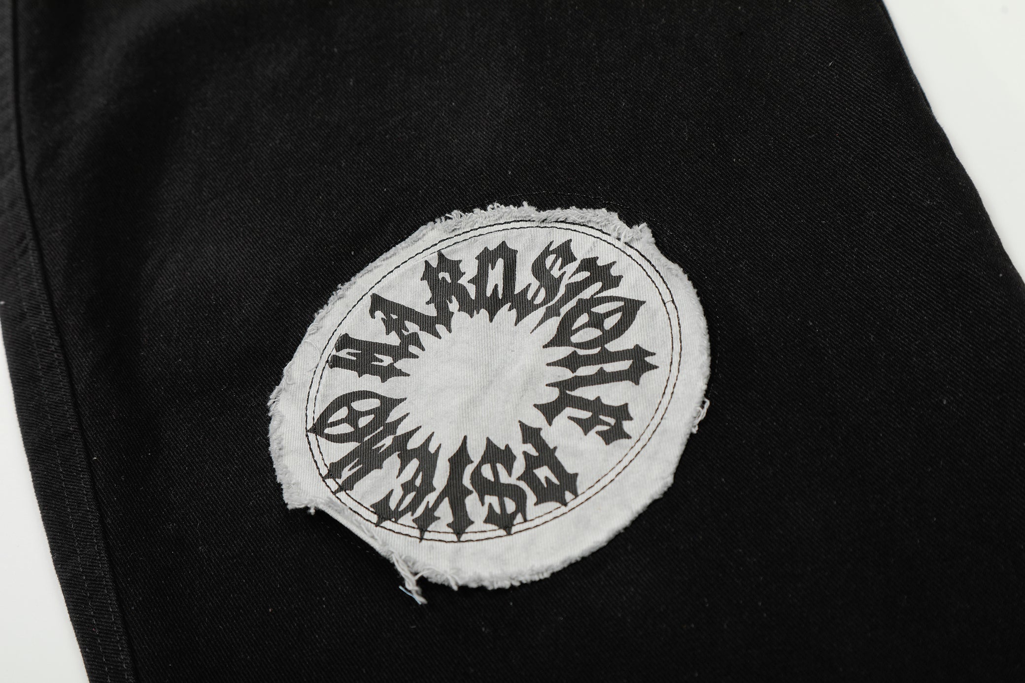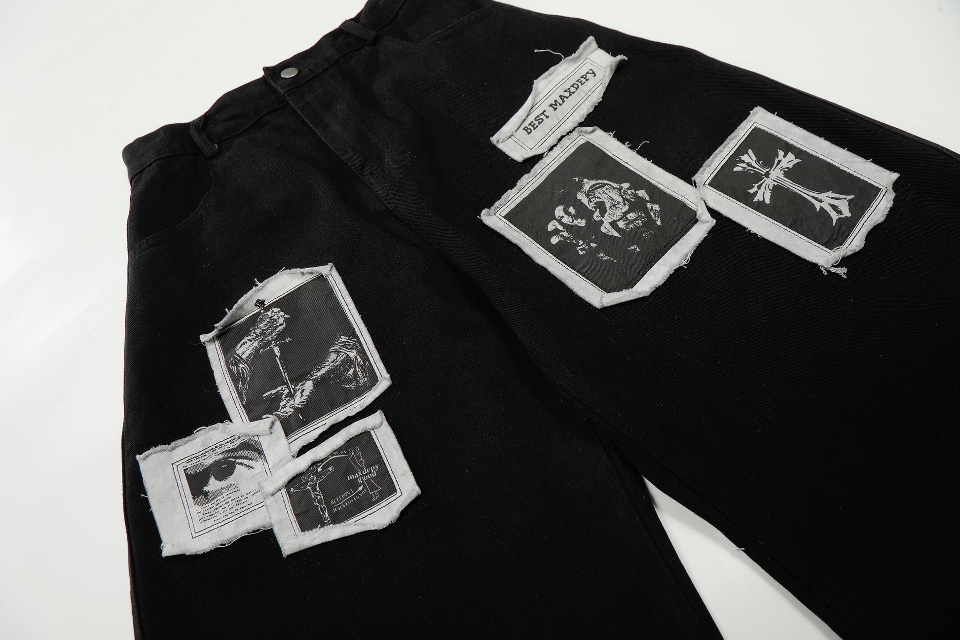 Clothing details: Graphic patchwork detailing, wide-leg fit, reinforced stitching, classic button closure, structured waistband, soft yet durable fabric