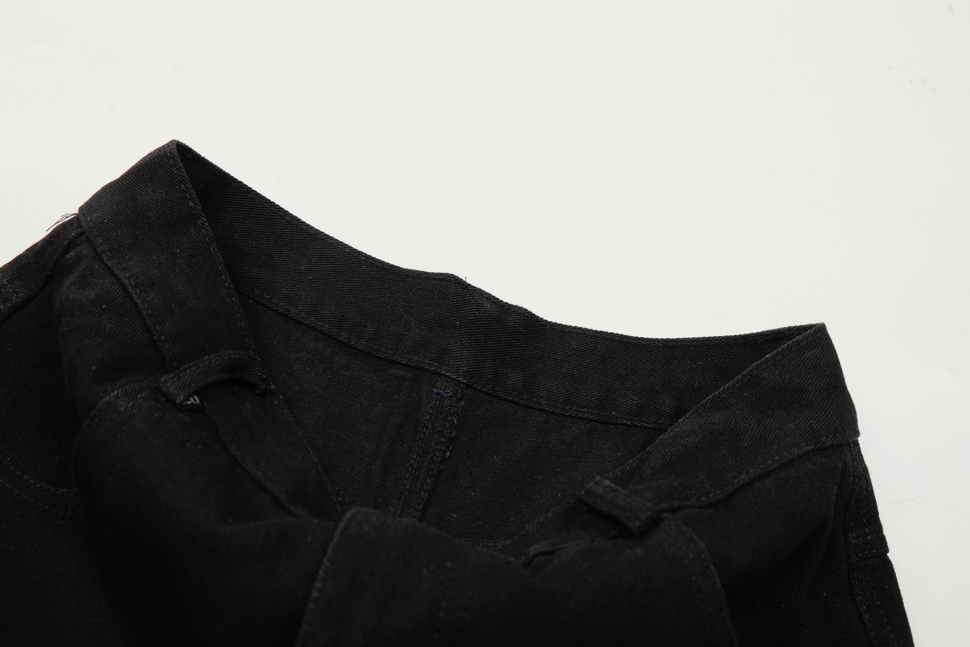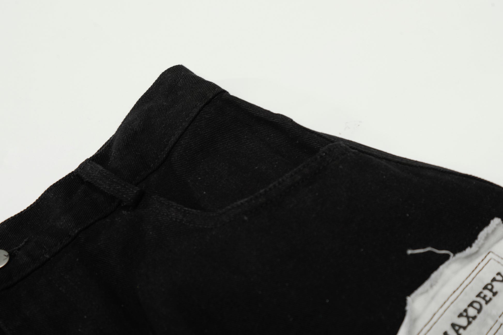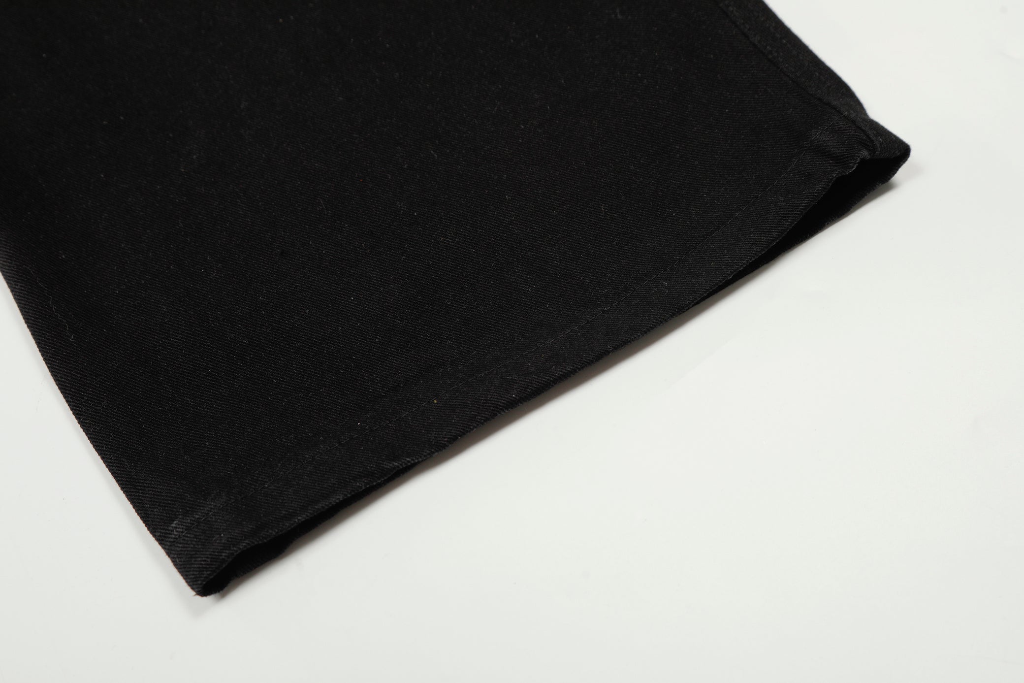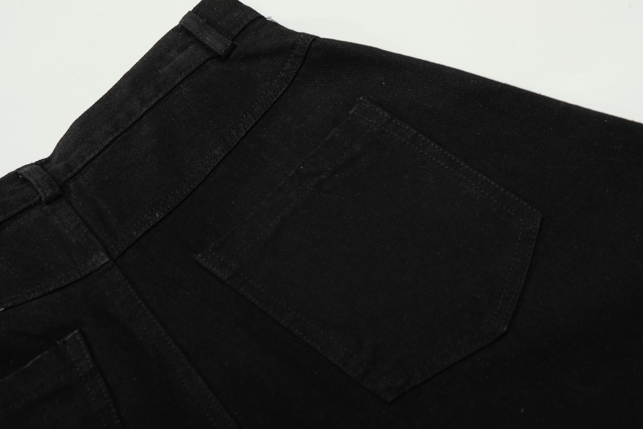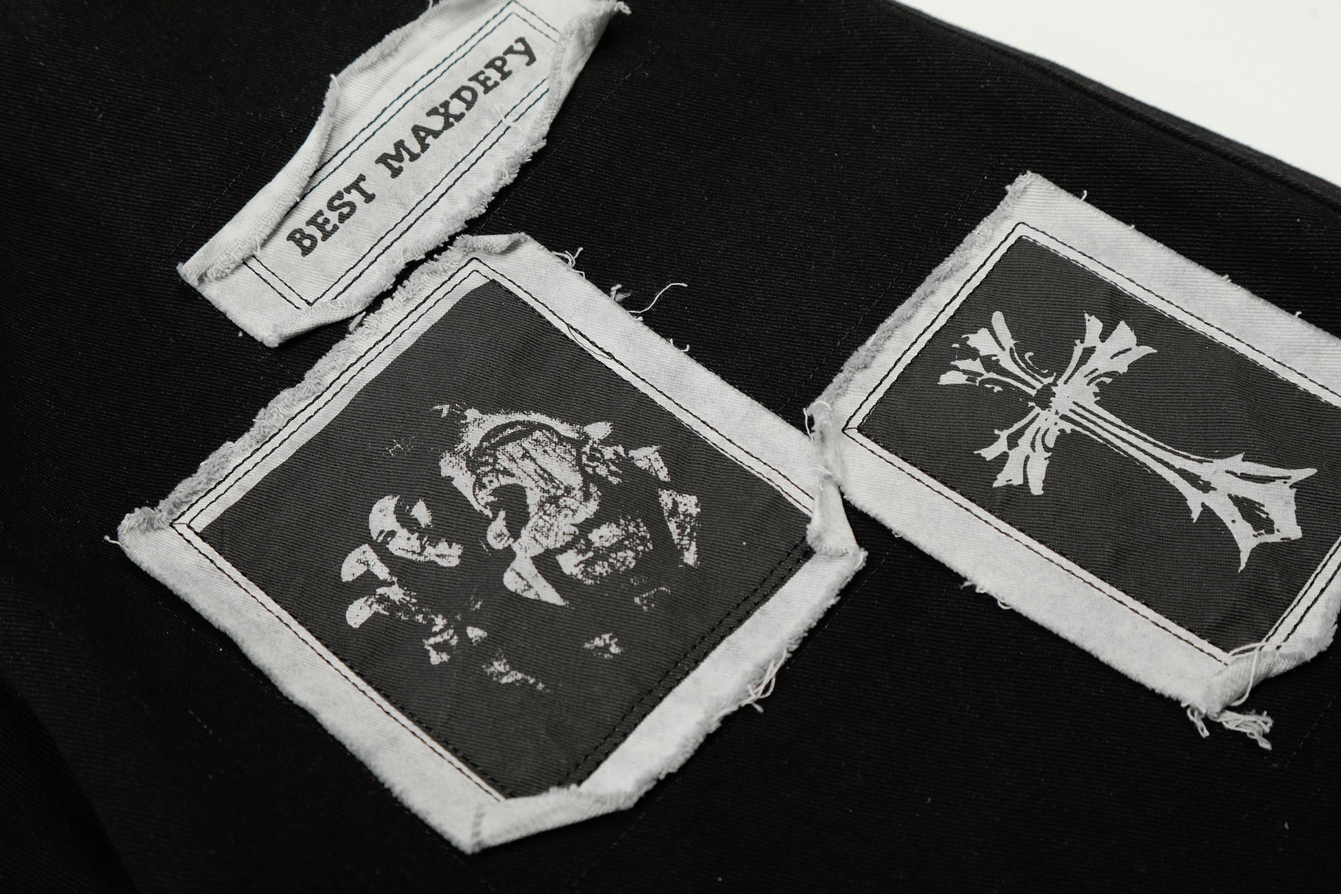 Clothing details: Graphic patchwork detailing, wide-leg fit, reinforced stitching, classic button closure, structured waistband, soft yet durable fabric